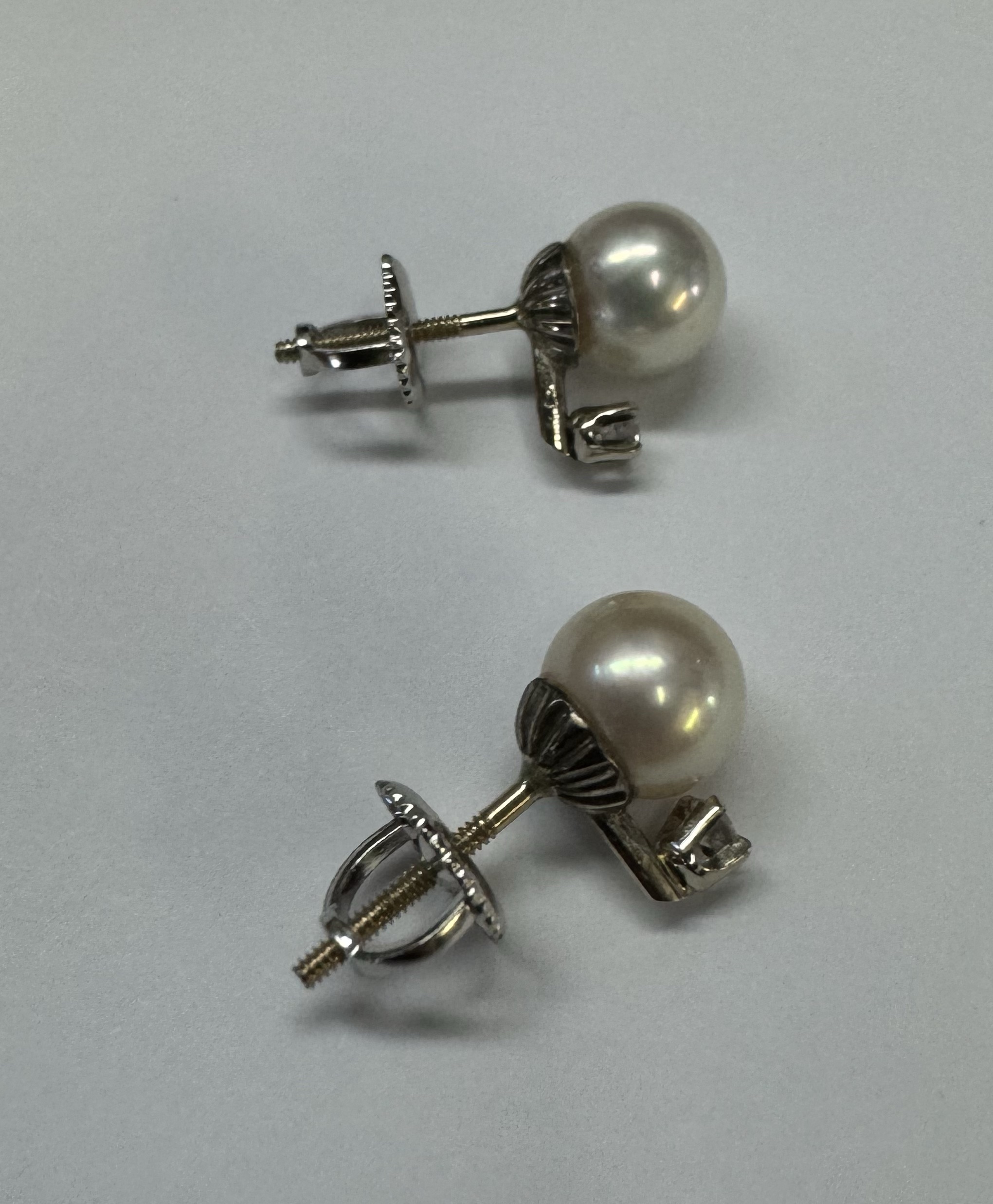 Vintage 14k White Gold 7 MM Cultured Pearl & Diamond Screwback Stud Earrings