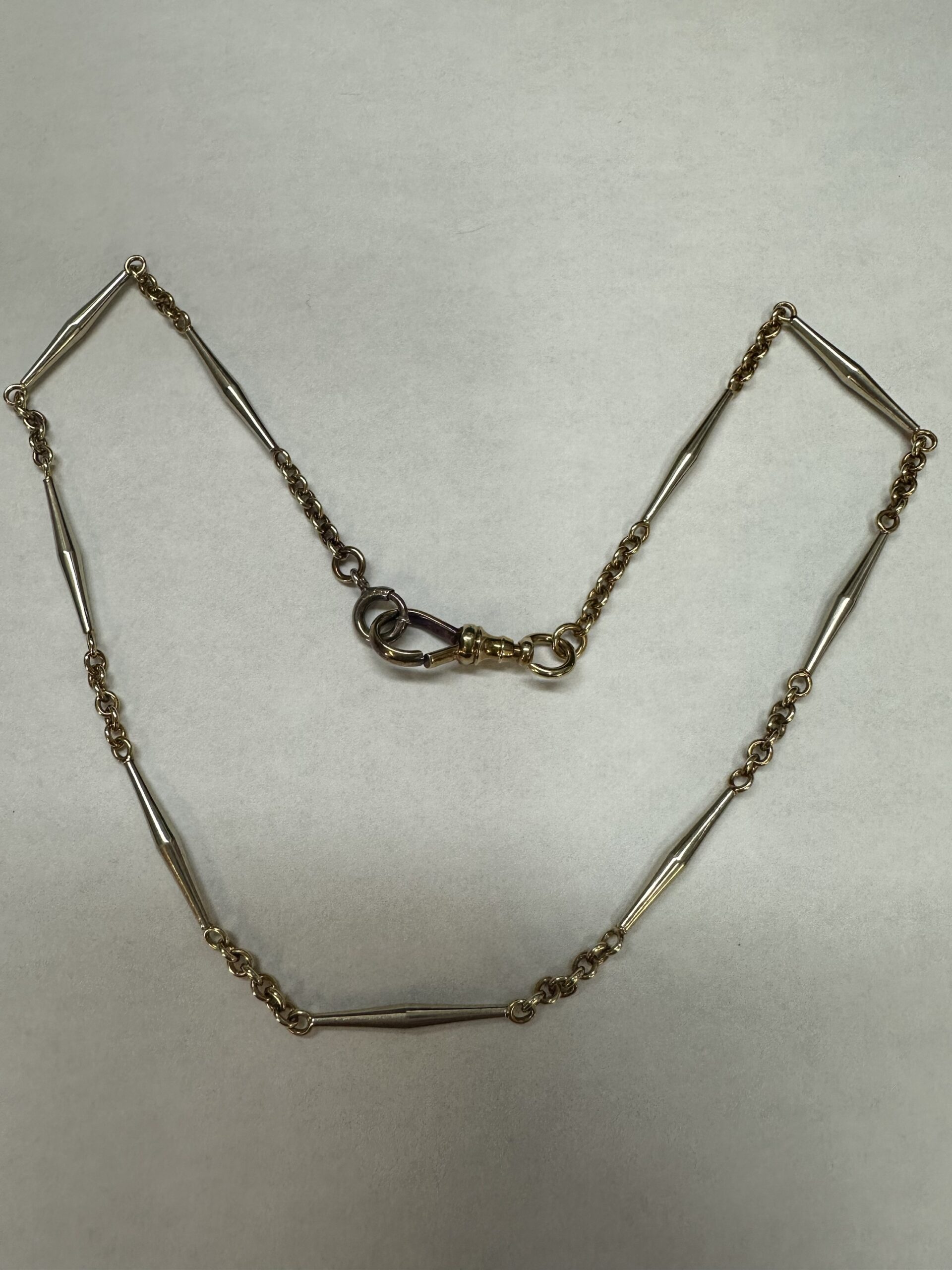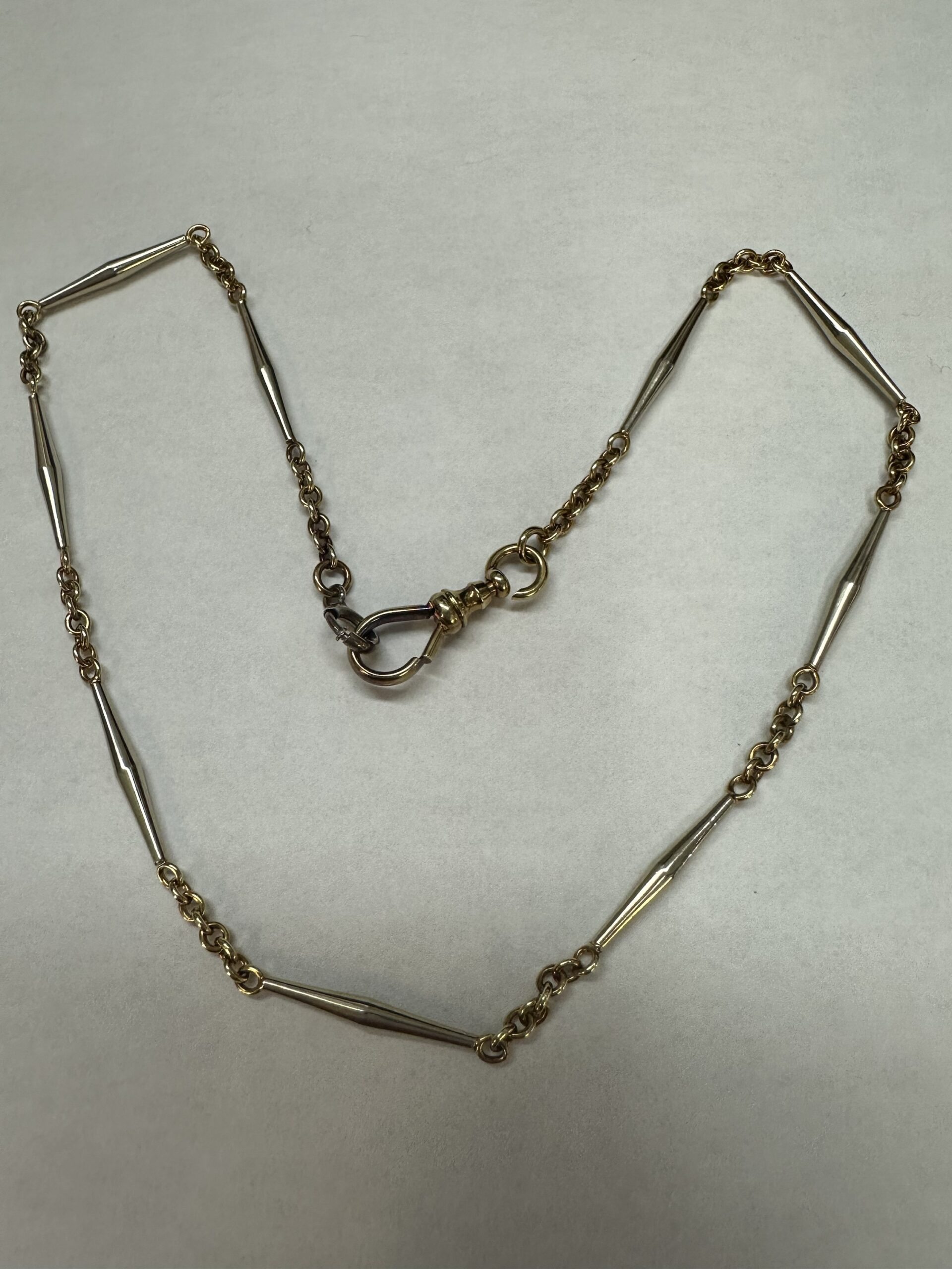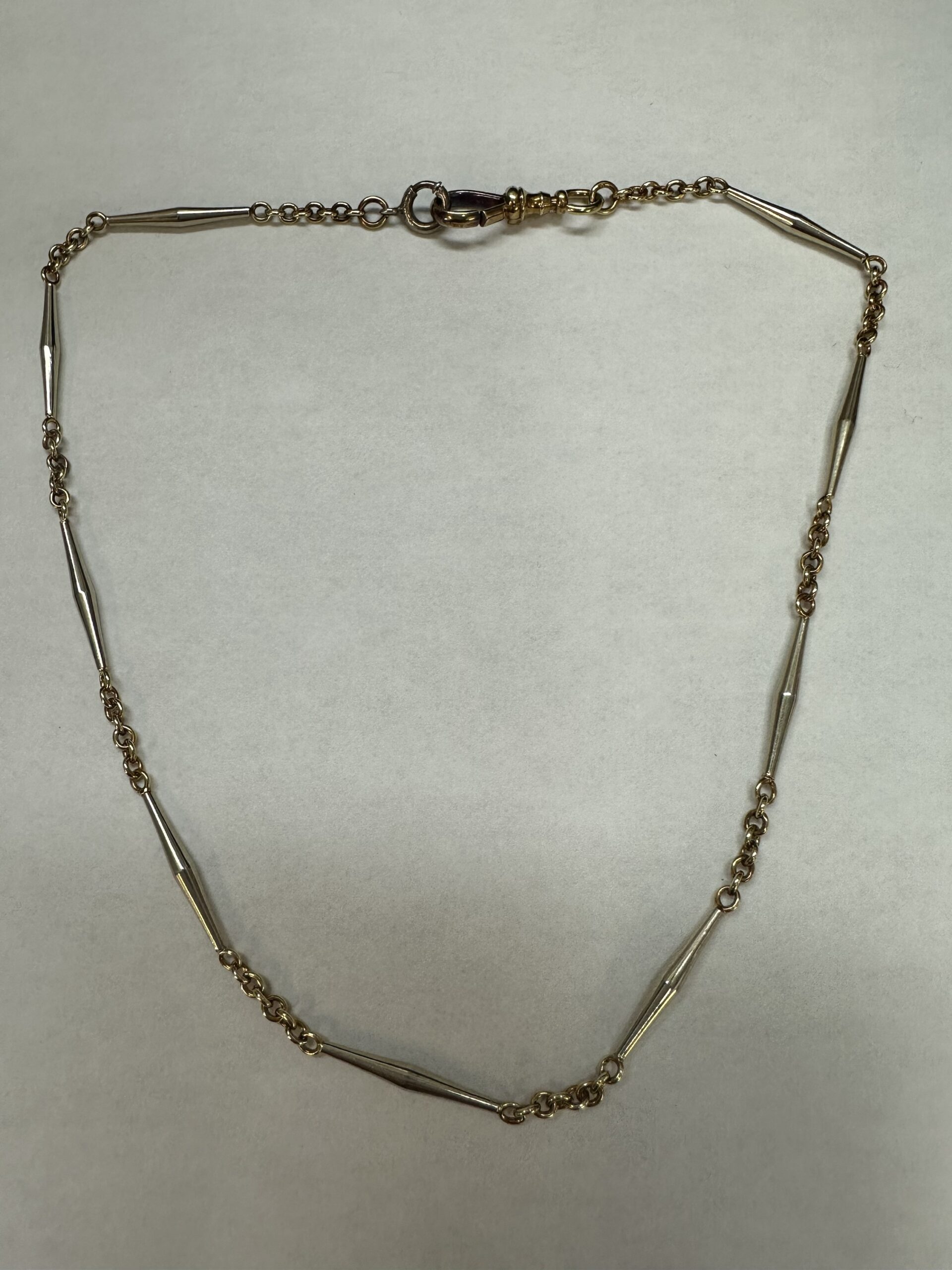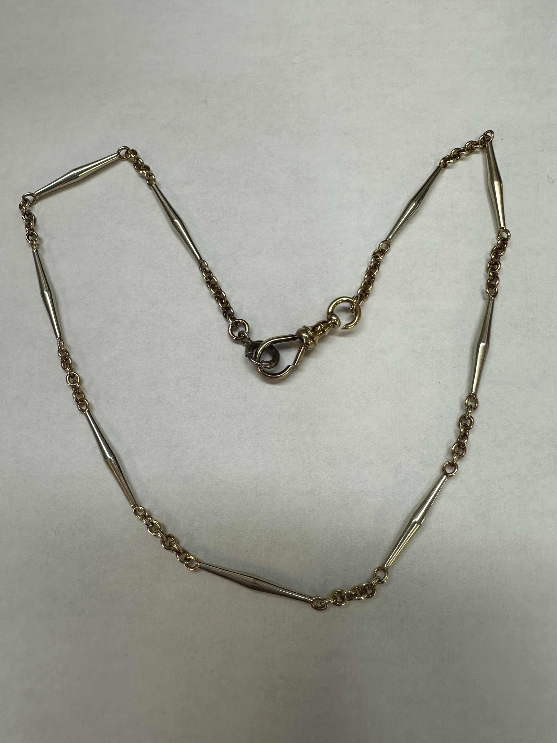 Vintage 14k yellow gold 13.5″ bar and round link pocket watch chain/choker necklace, 9.6 grams.