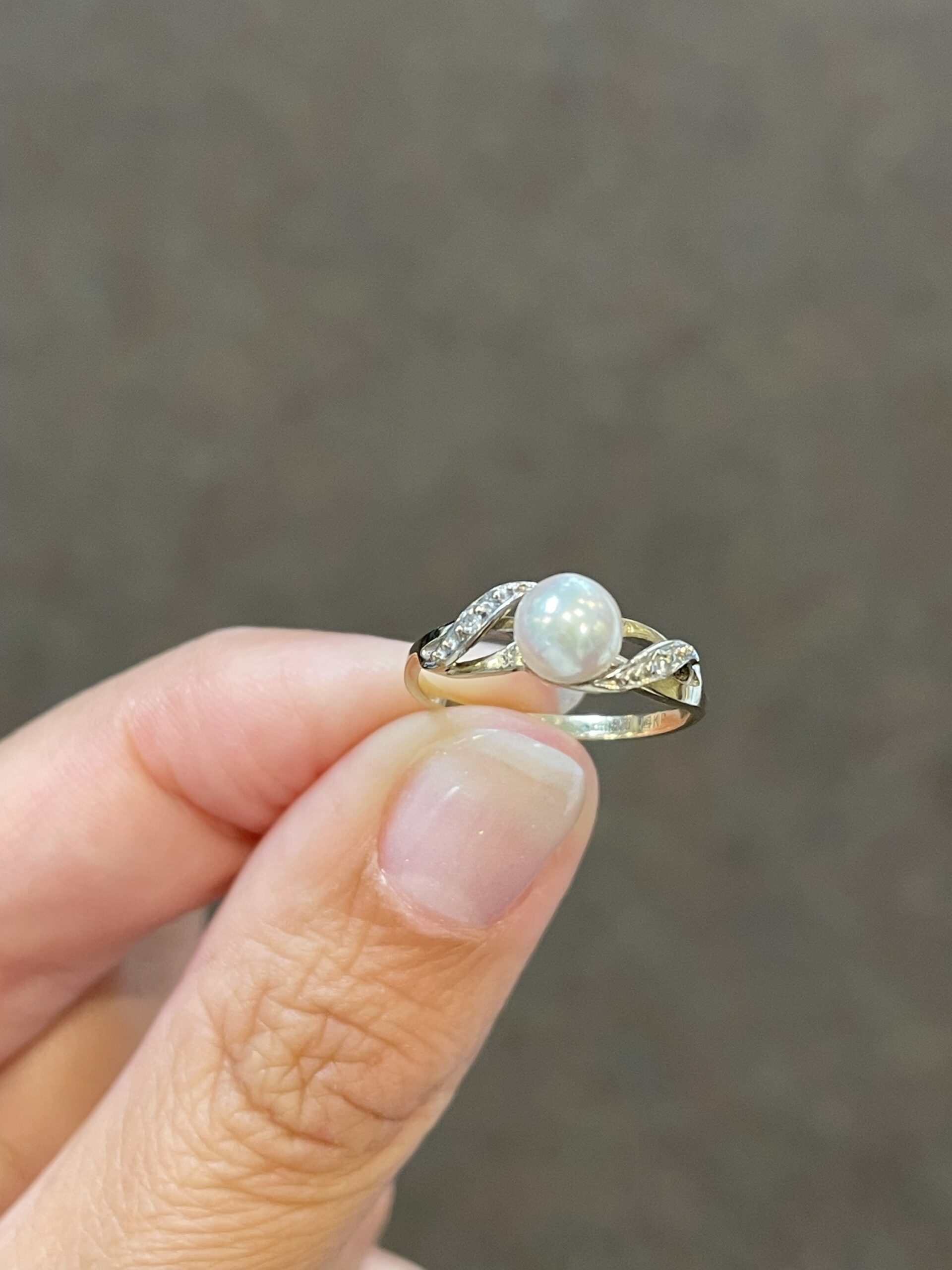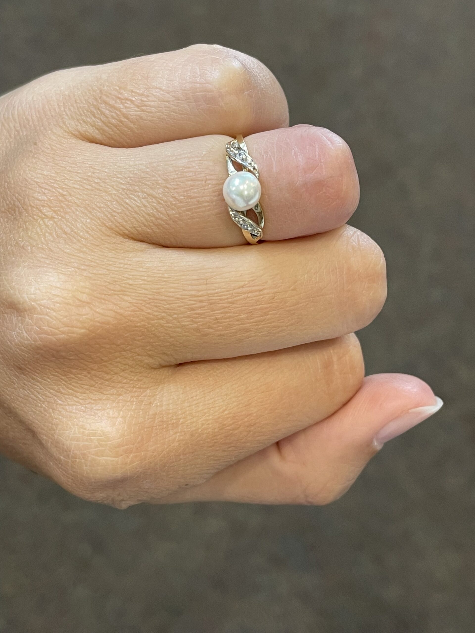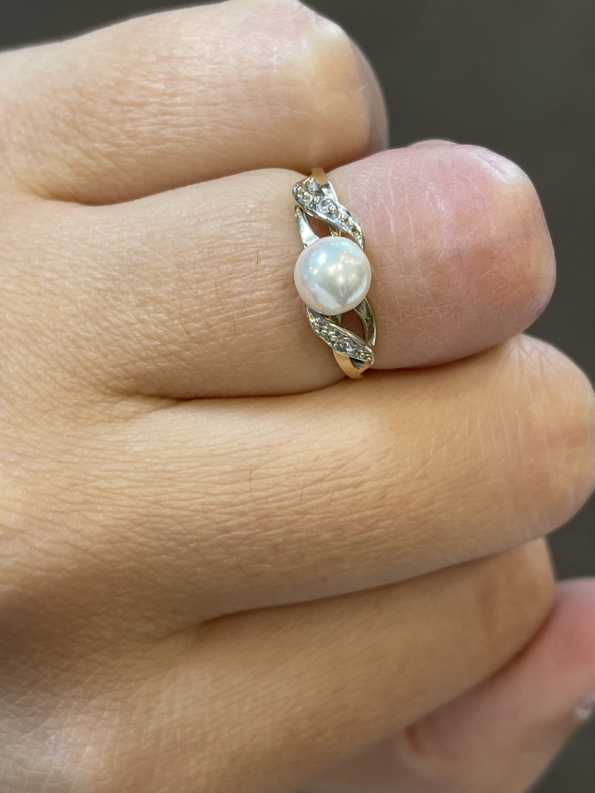 Vintage 14k yellow gold 6 mm cultured Pearl ring of a woven motif, with 2 genuine diamond accents. This ring is a size 4, but it can be slightly sized. This ring has an entire weight of 1.5 grams.