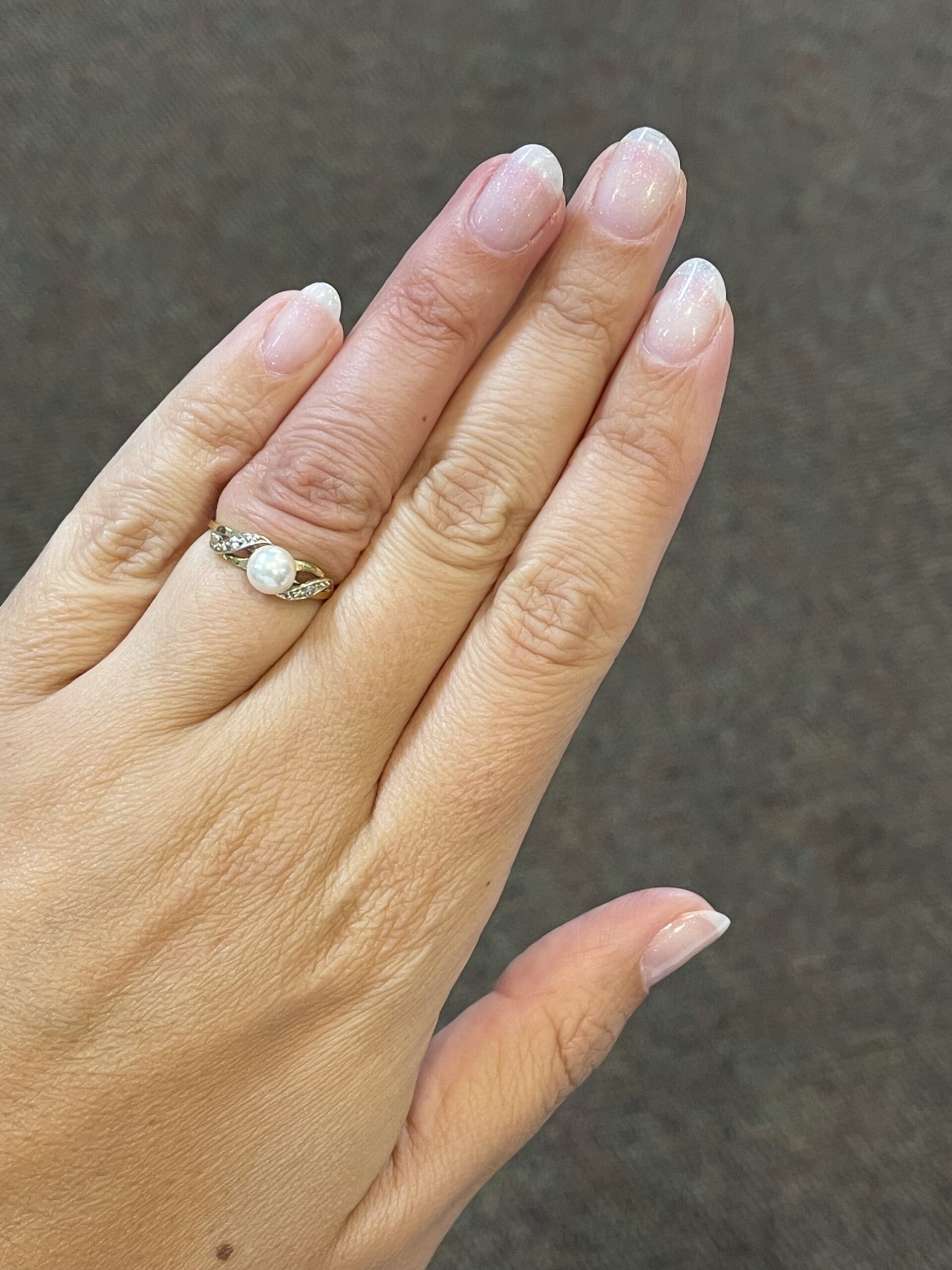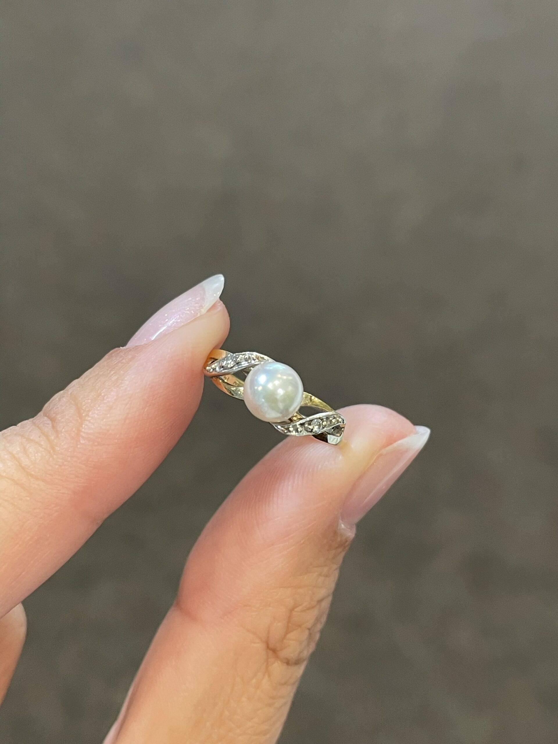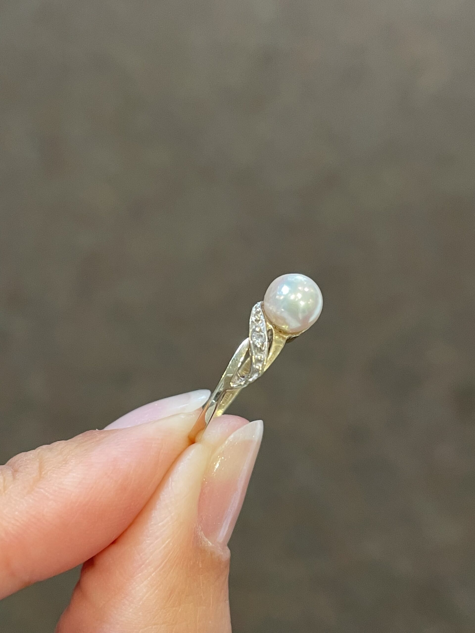 Vintage 14k yellow gold 6 mm cultured Pearl ring of a woven motif, with 2 genuine diamond accents. This ring is a size 4, but it can be slightly sized. This ring has an entire weight of 1.5 grams.
