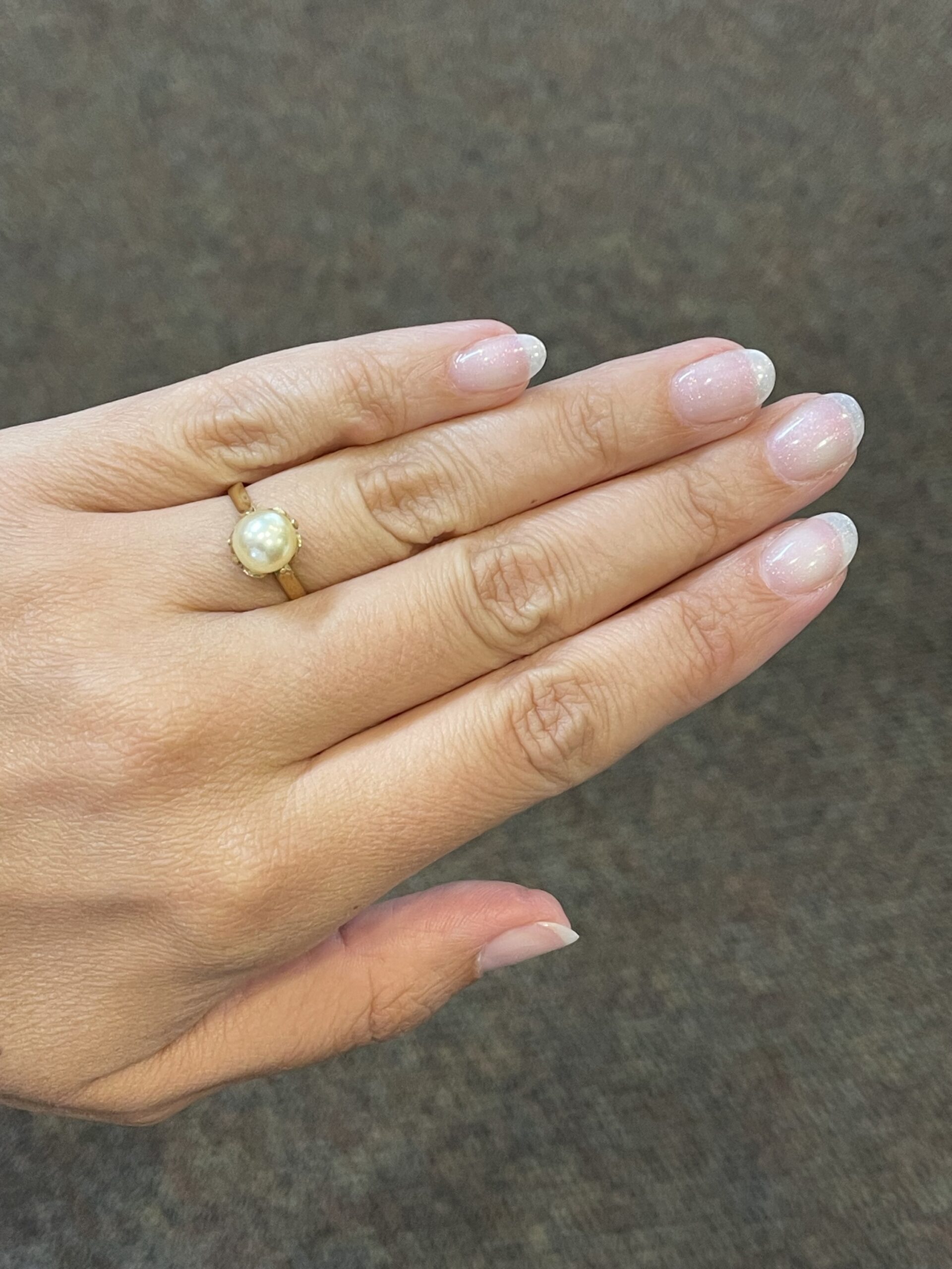 Vintage 14k yellow gold 7.5 mm cultured Pearl ring. This ring is a finger size 6 1/2, but it can be reasonably sized. If you require a specific size please make note in the comments section at checkout. This ring has an entire weight of 2.7 grams.