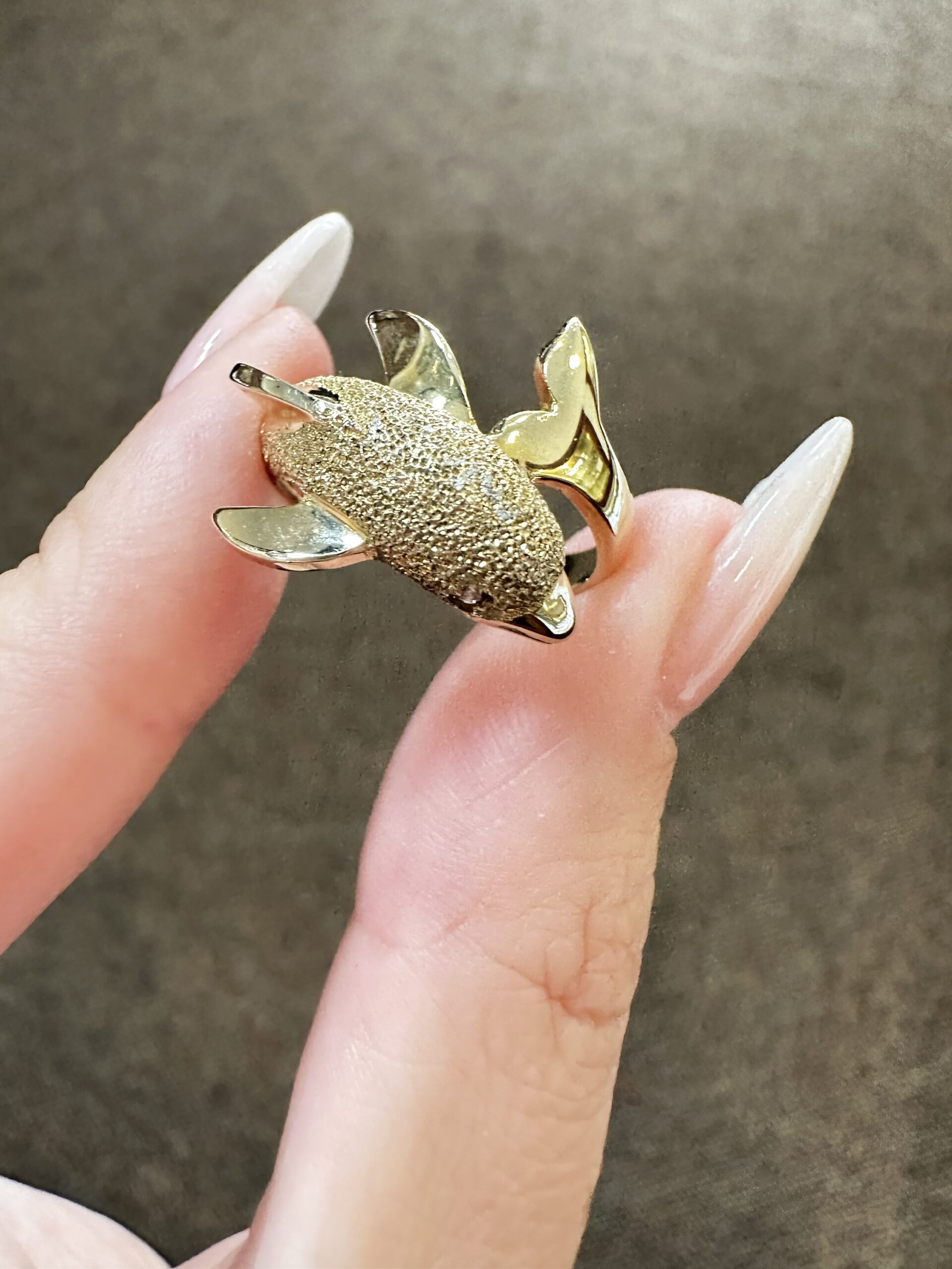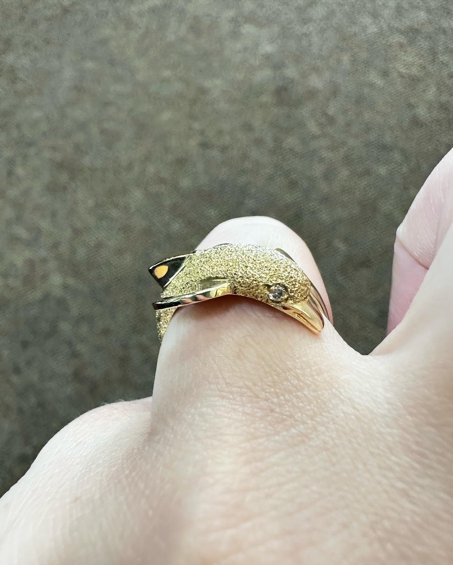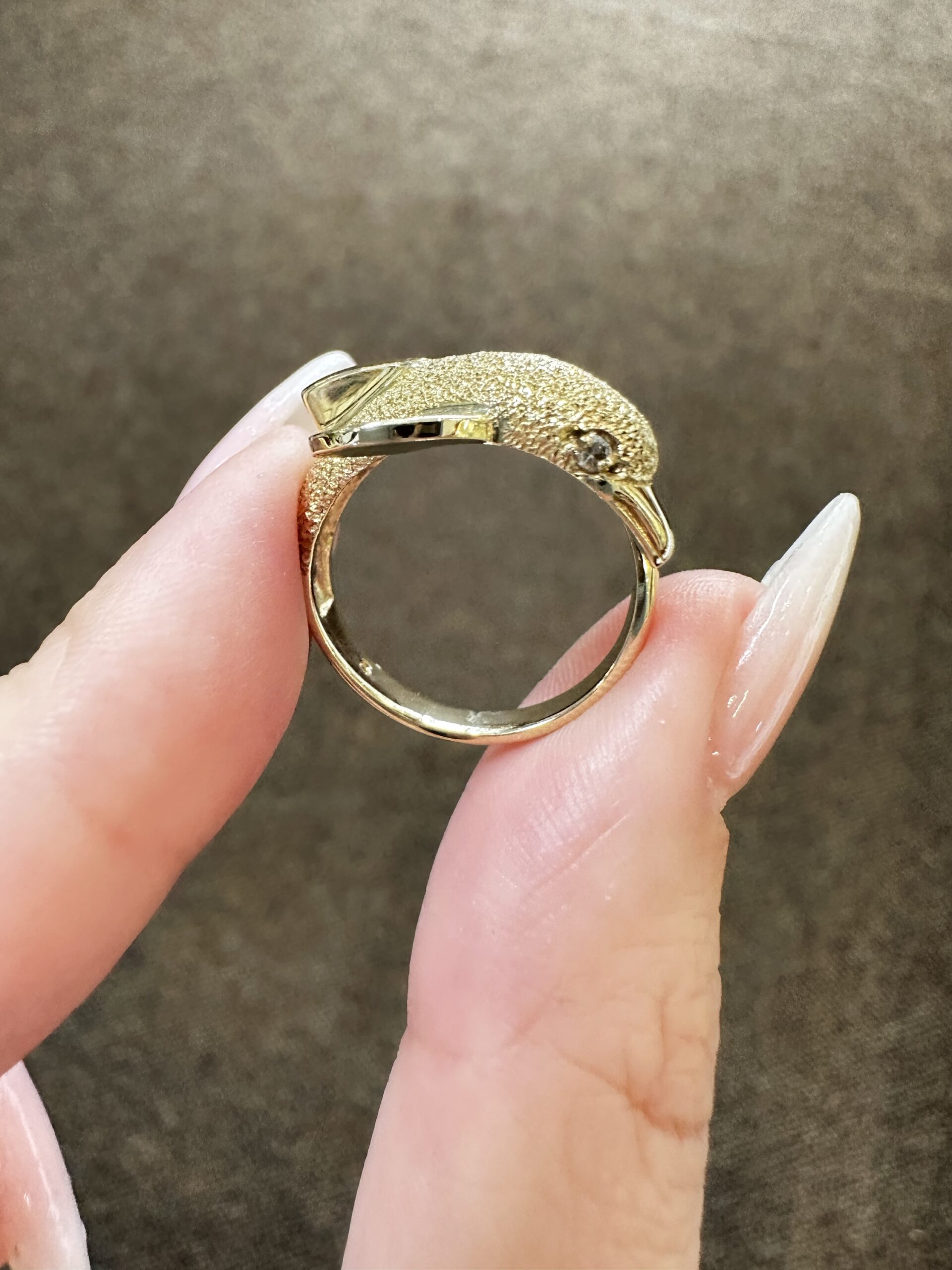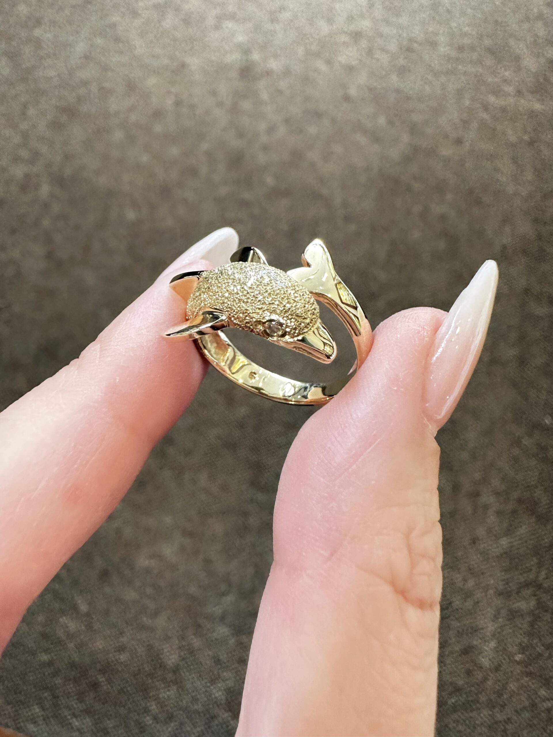 14k yellow gold Dolphin ring with genuine diamond accents for the eyes. This ring is a finger size 6, but it can be reasonably sized. Please make note of the finger size needed in the comments section at checkout. This ring has an entire weight of 5.5 grams.