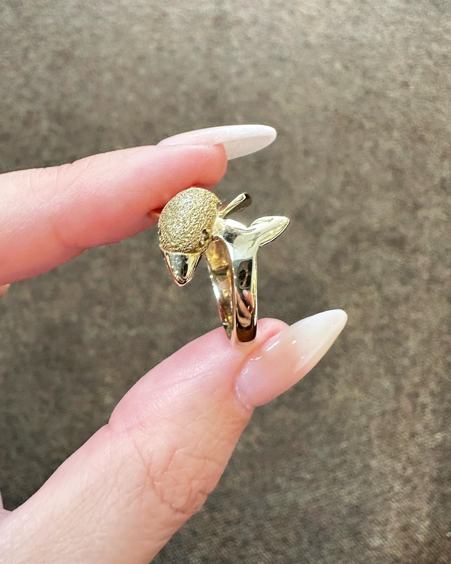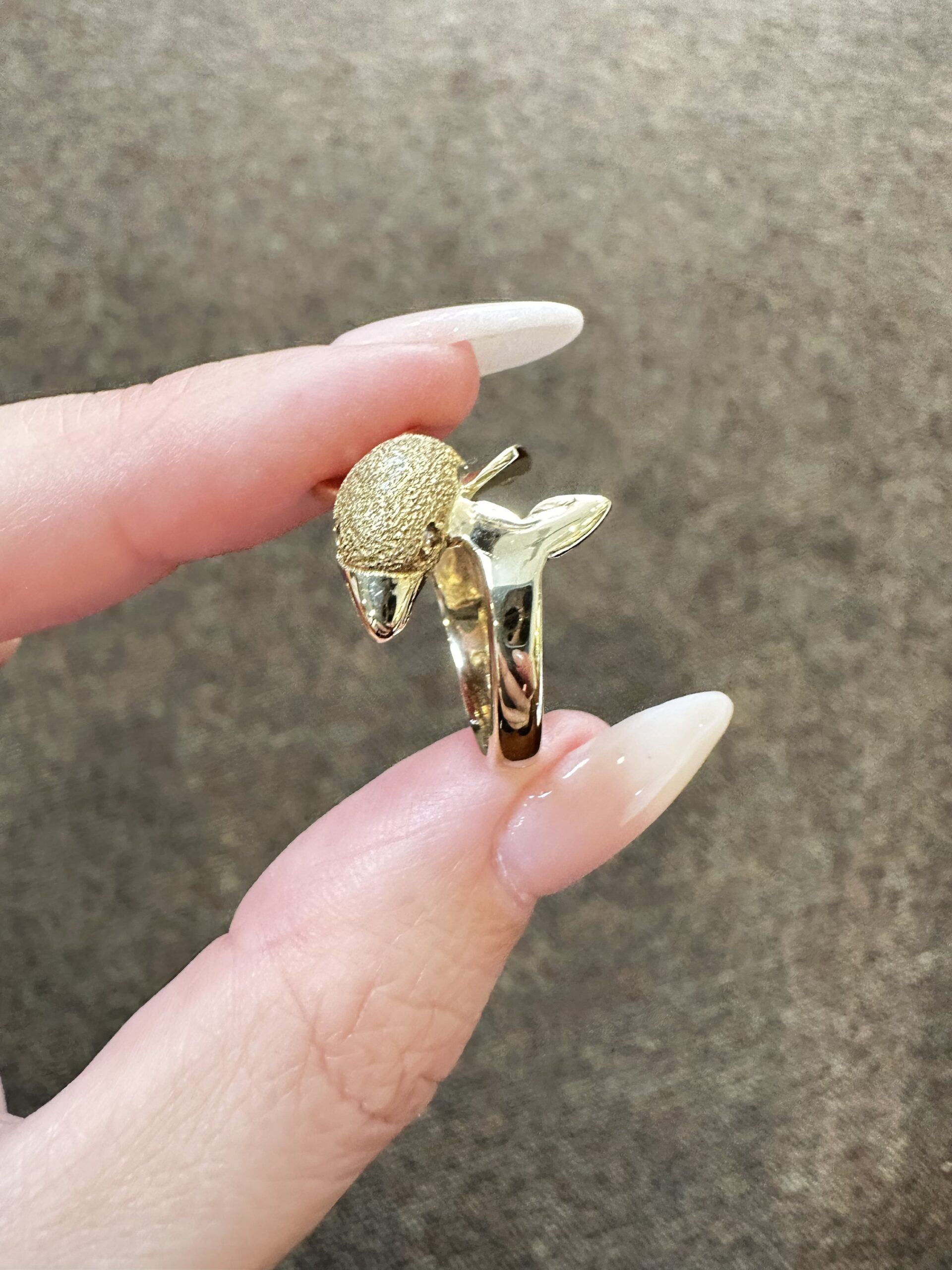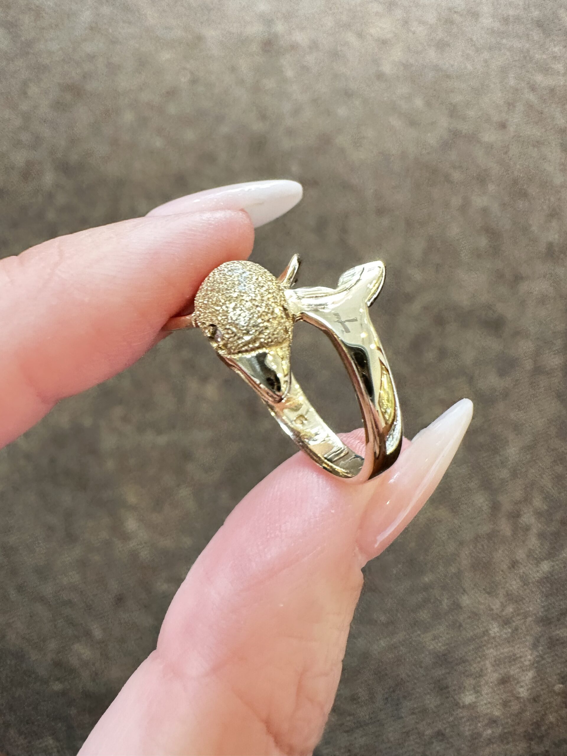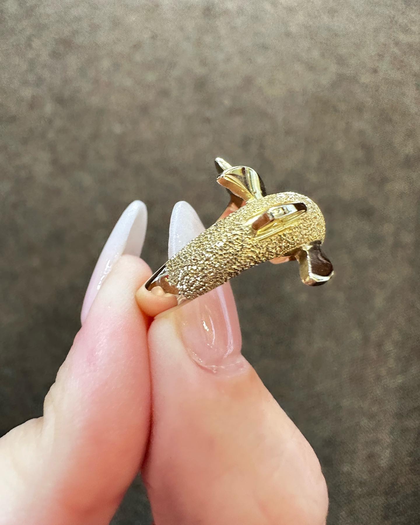 14k yellow gold Dolphin ring with genuine diamond accents for the eyes. This ring is a finger size 6, but it can be reasonably sized. Please make note of the finger size needed in the comments section at checkout. This ring has an entire weight of 5.5 grams.