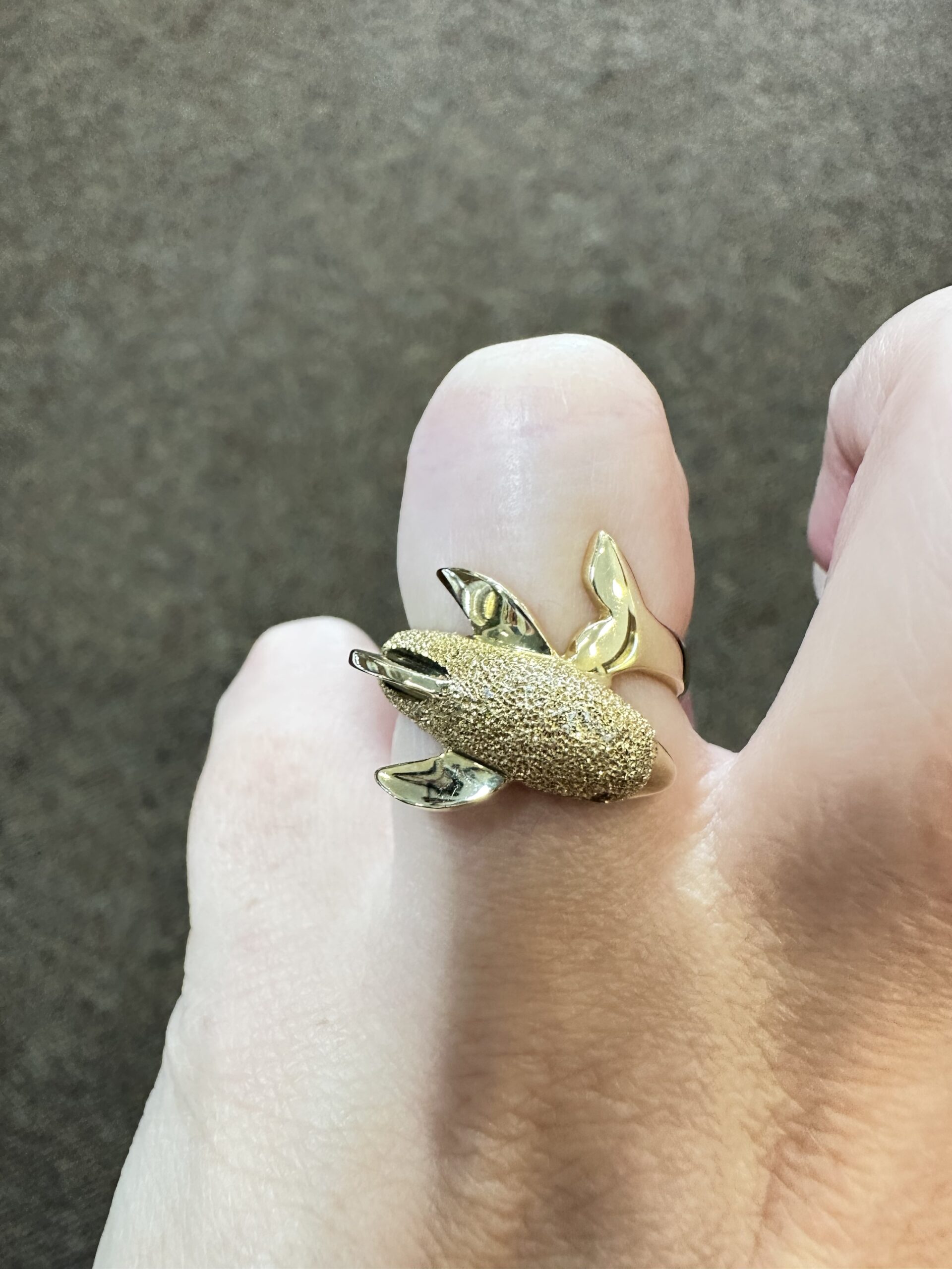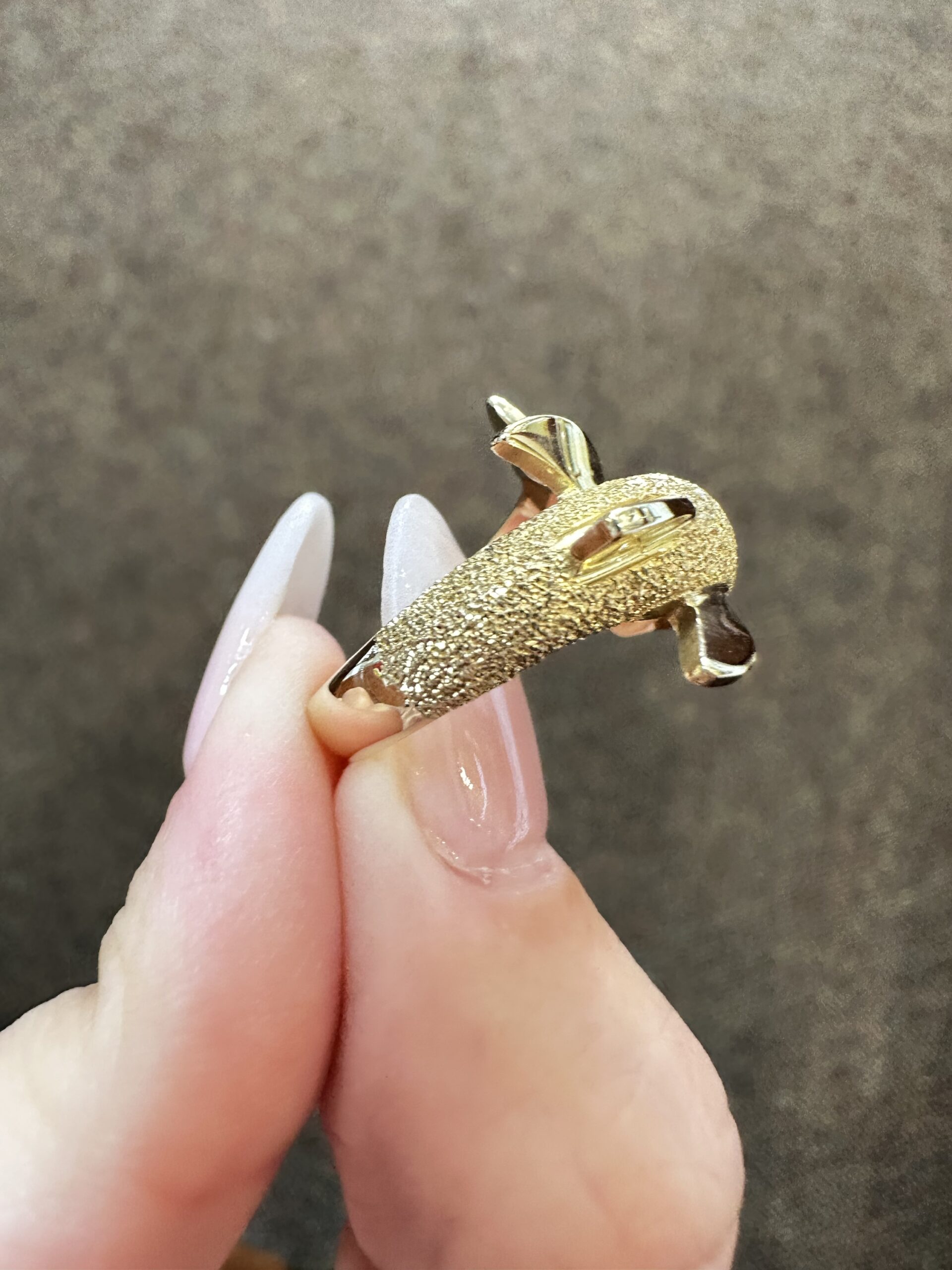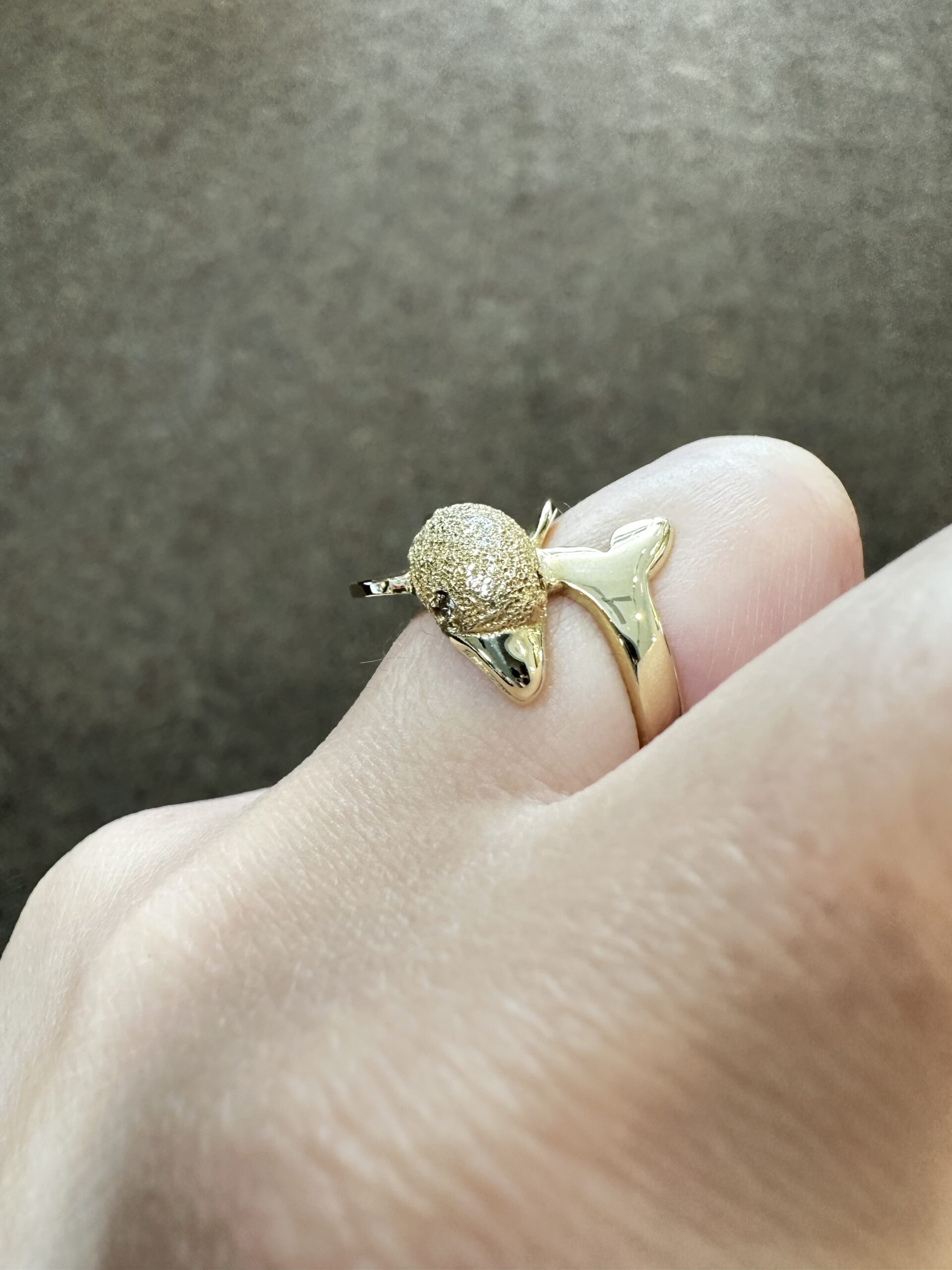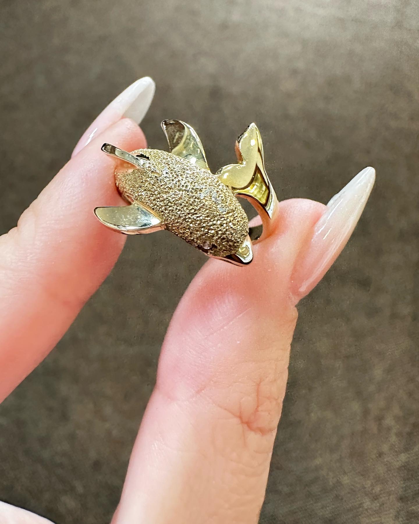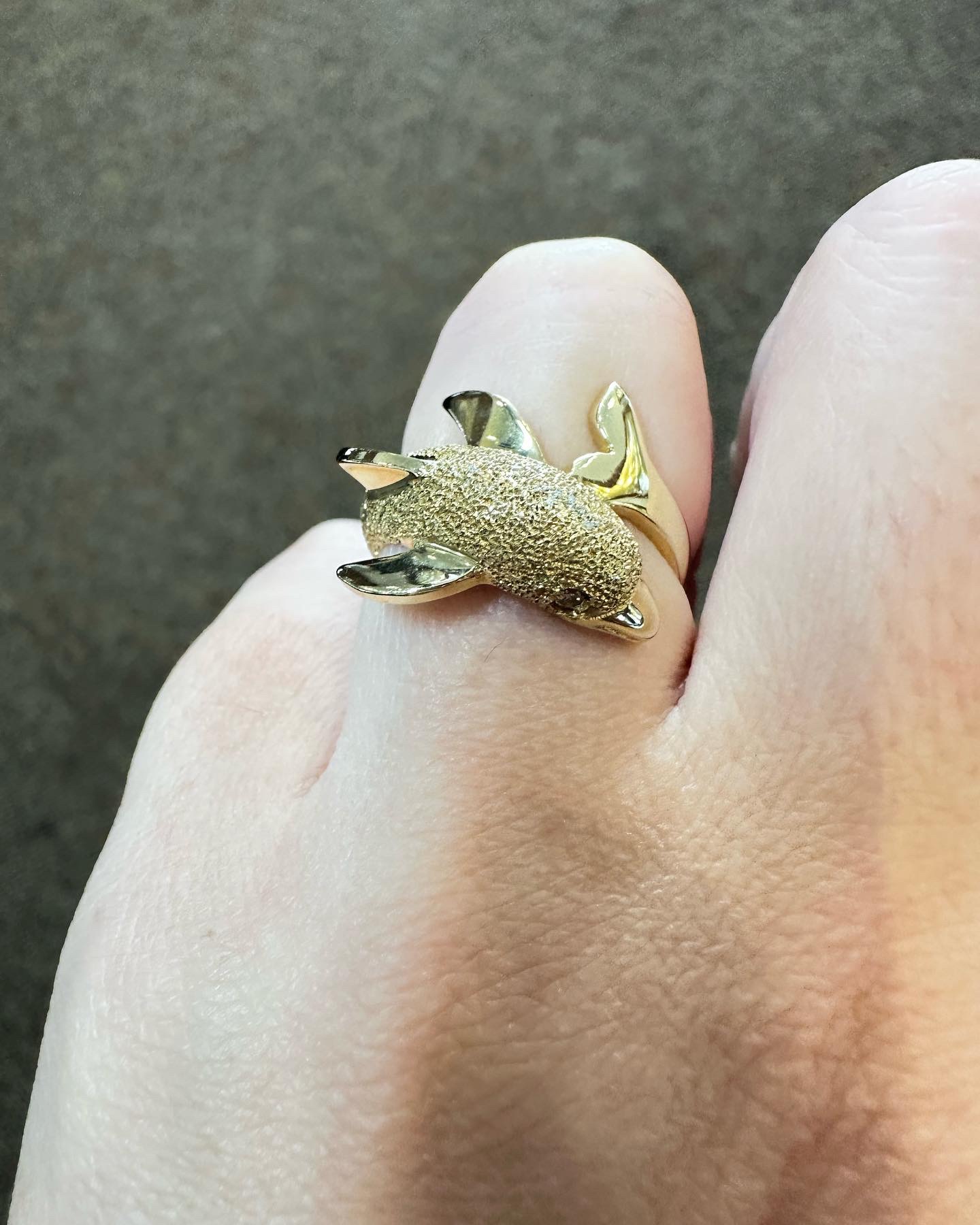 14k yellow gold Dolphin ring with genuine diamond accents for the eyes. This ring is a finger size 6, but it can be reasonably sized. Please make note of the finger size needed in the comments section at checkout. This ring has an entire weight of 5.5 grams.