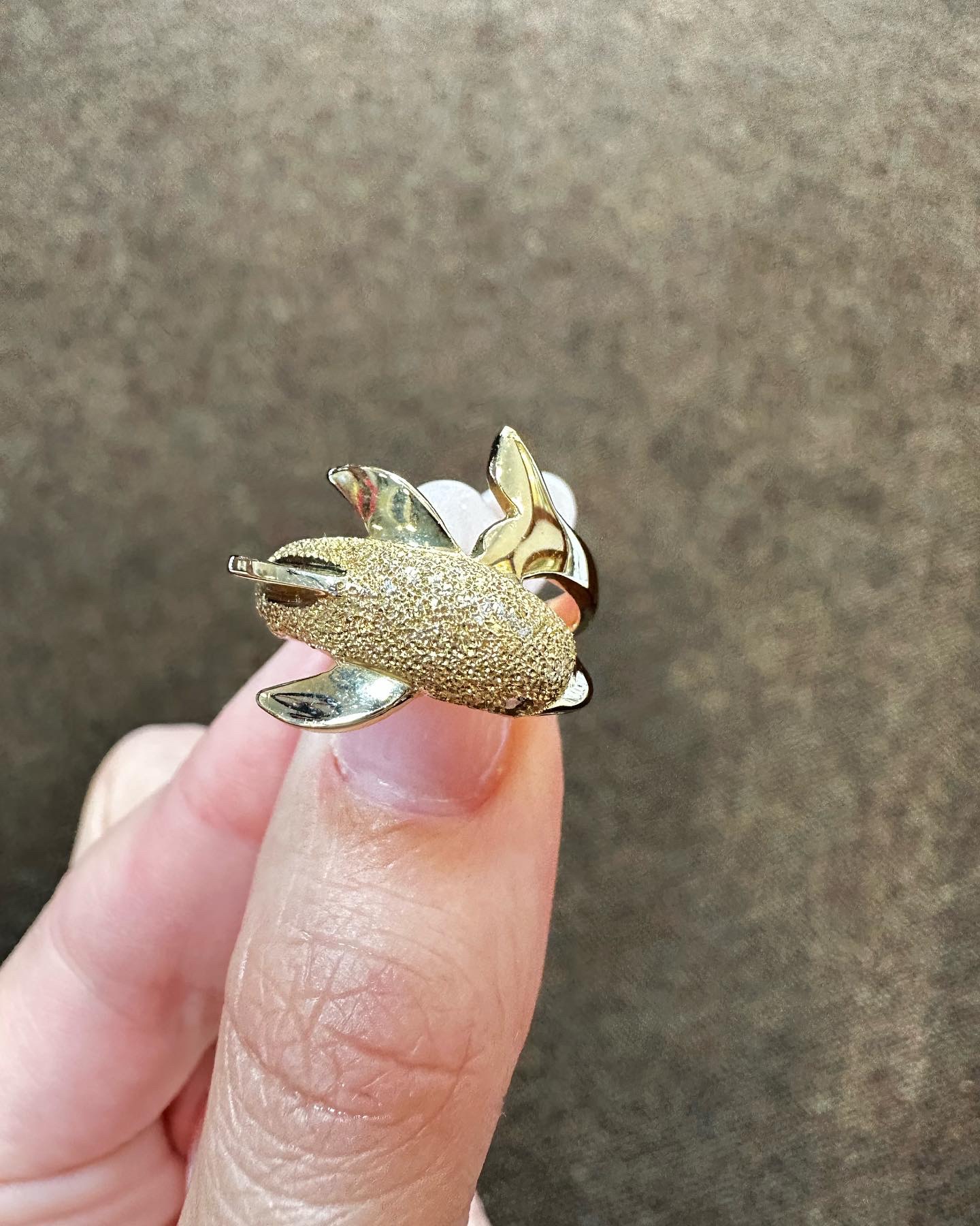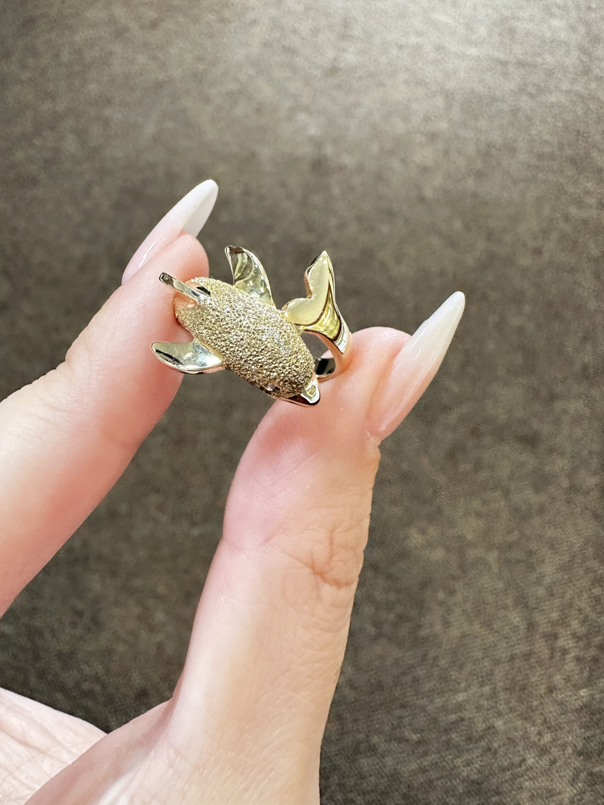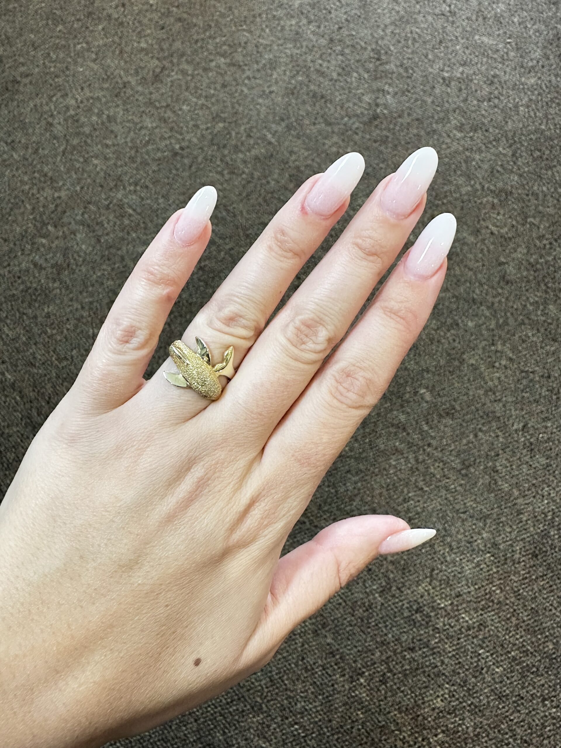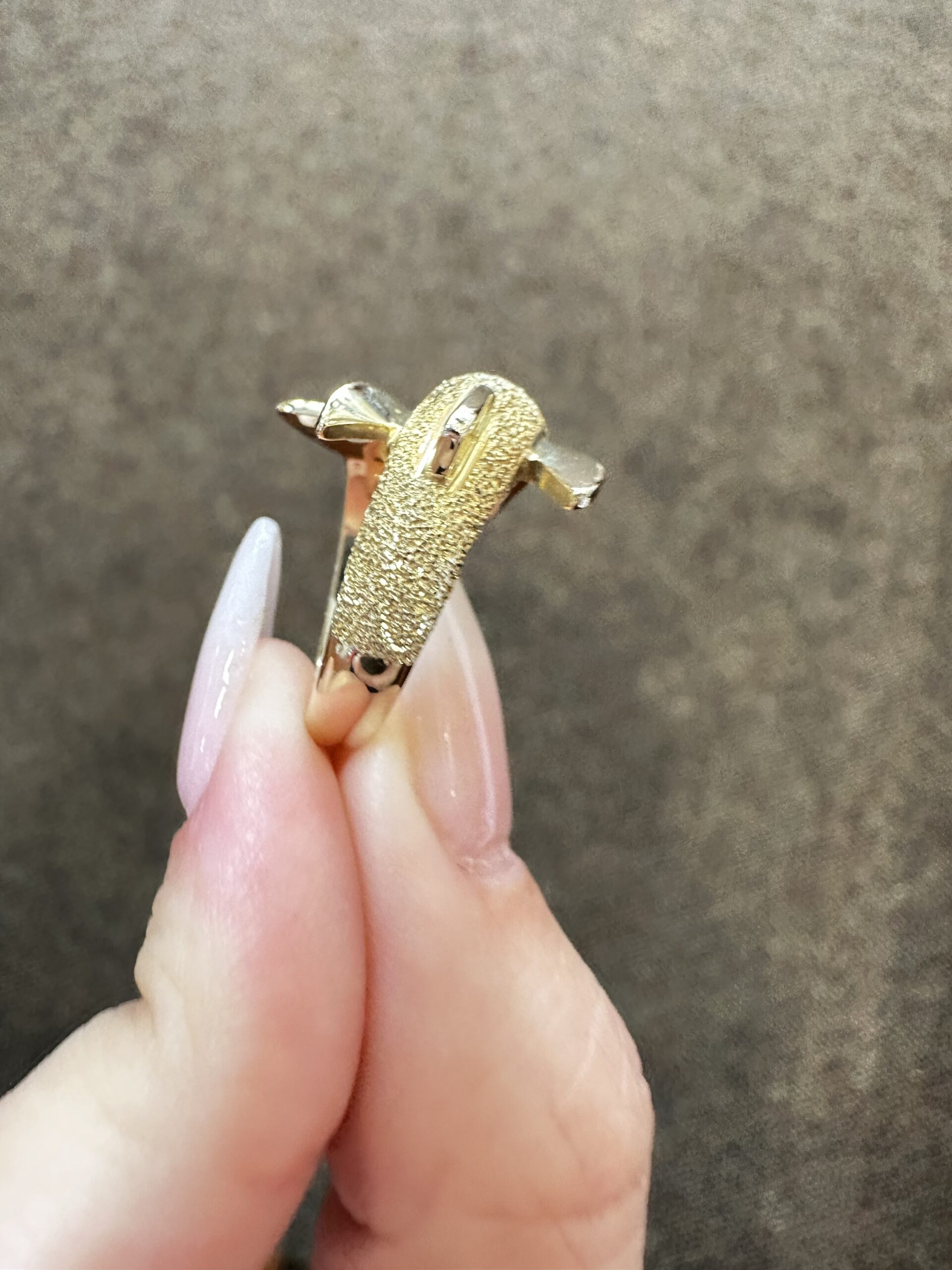 14k yellow gold Dolphin ring with genuine diamond accents for the eyes. This ring is a finger size 6, but it can be reasonably sized. Please make note of the finger size needed in the comments section at checkout. This ring has an entire weight of 5.5 grams.