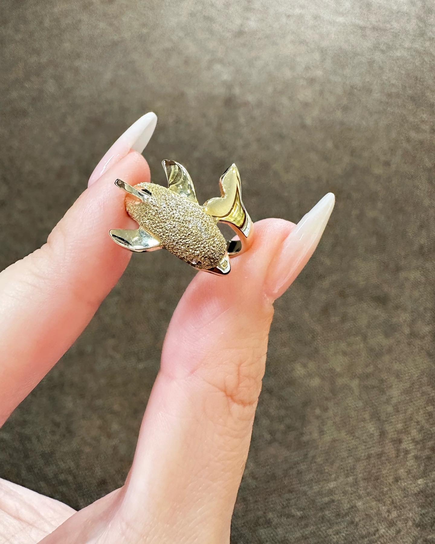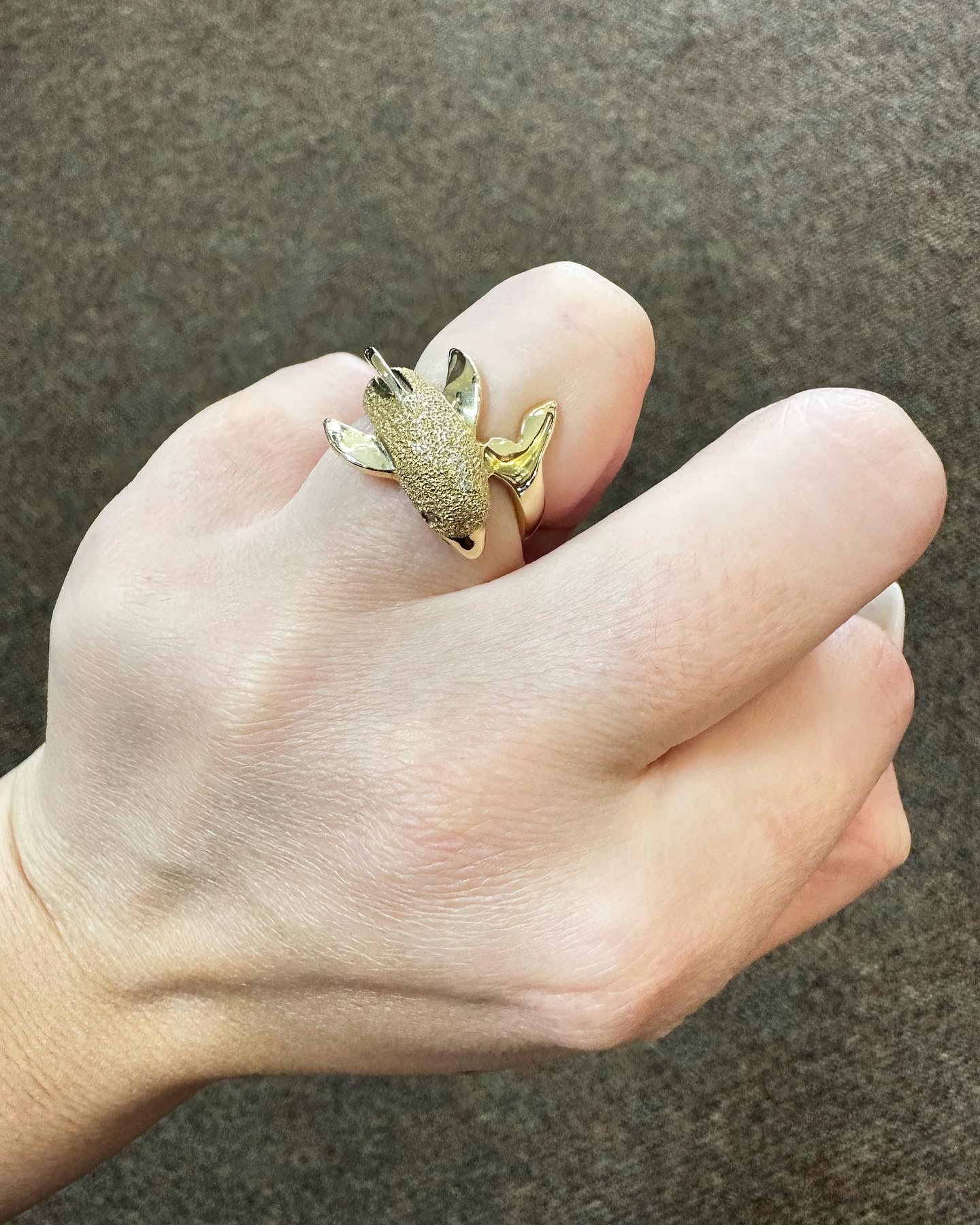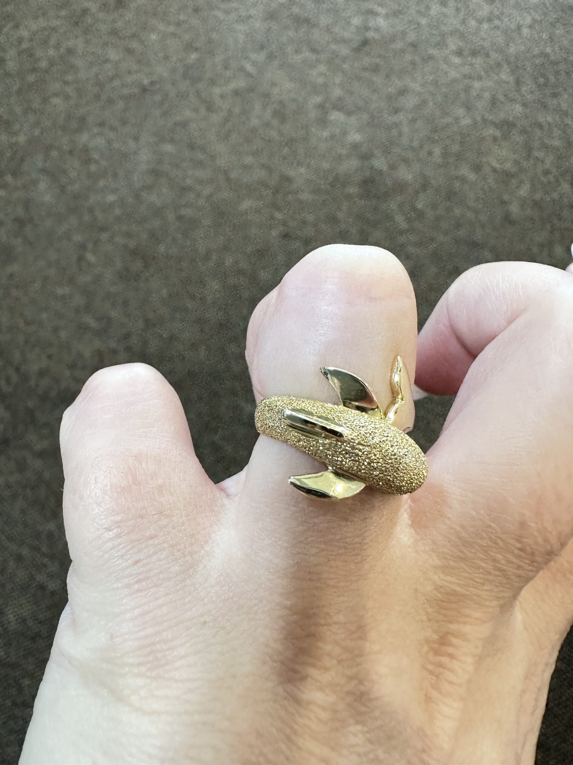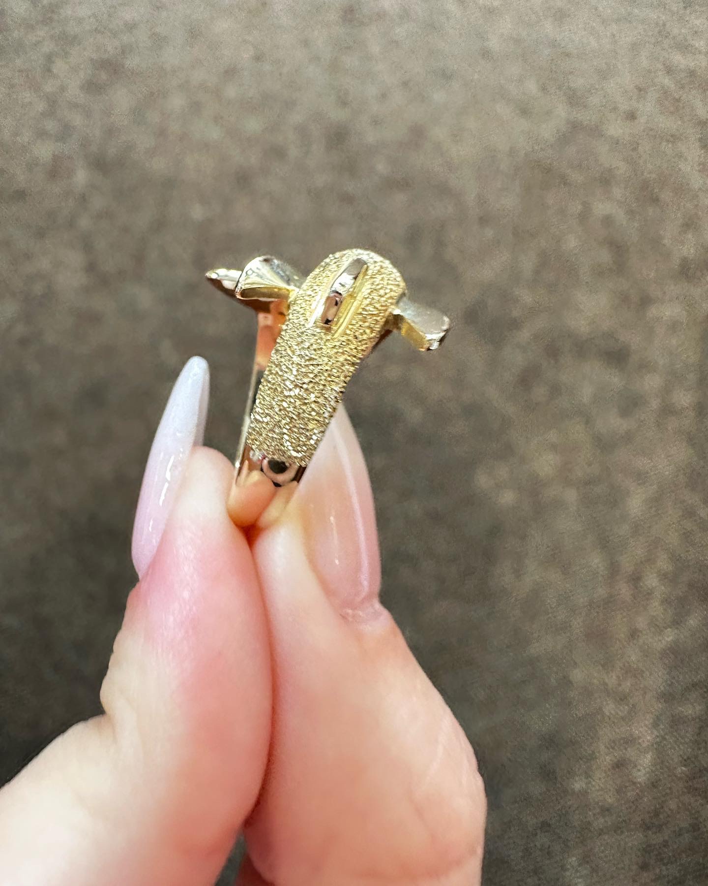 14k yellow gold Dolphin ring with genuine diamond accents for the eyes. This ring is a finger size 6, but it can be reasonably sized. Please make note of the finger size needed in the comments section at checkout. This ring has an entire weight of 5.5 grams.