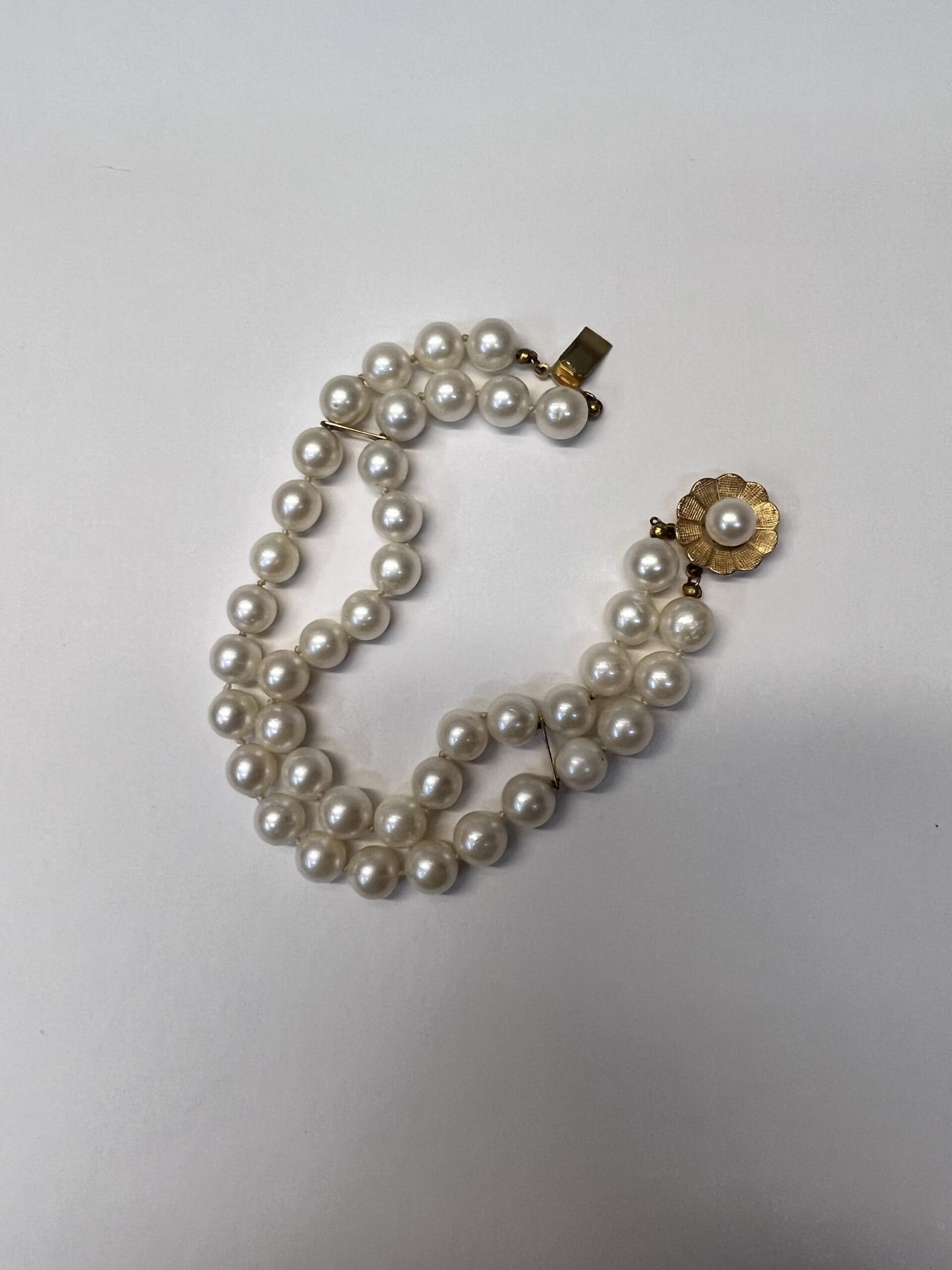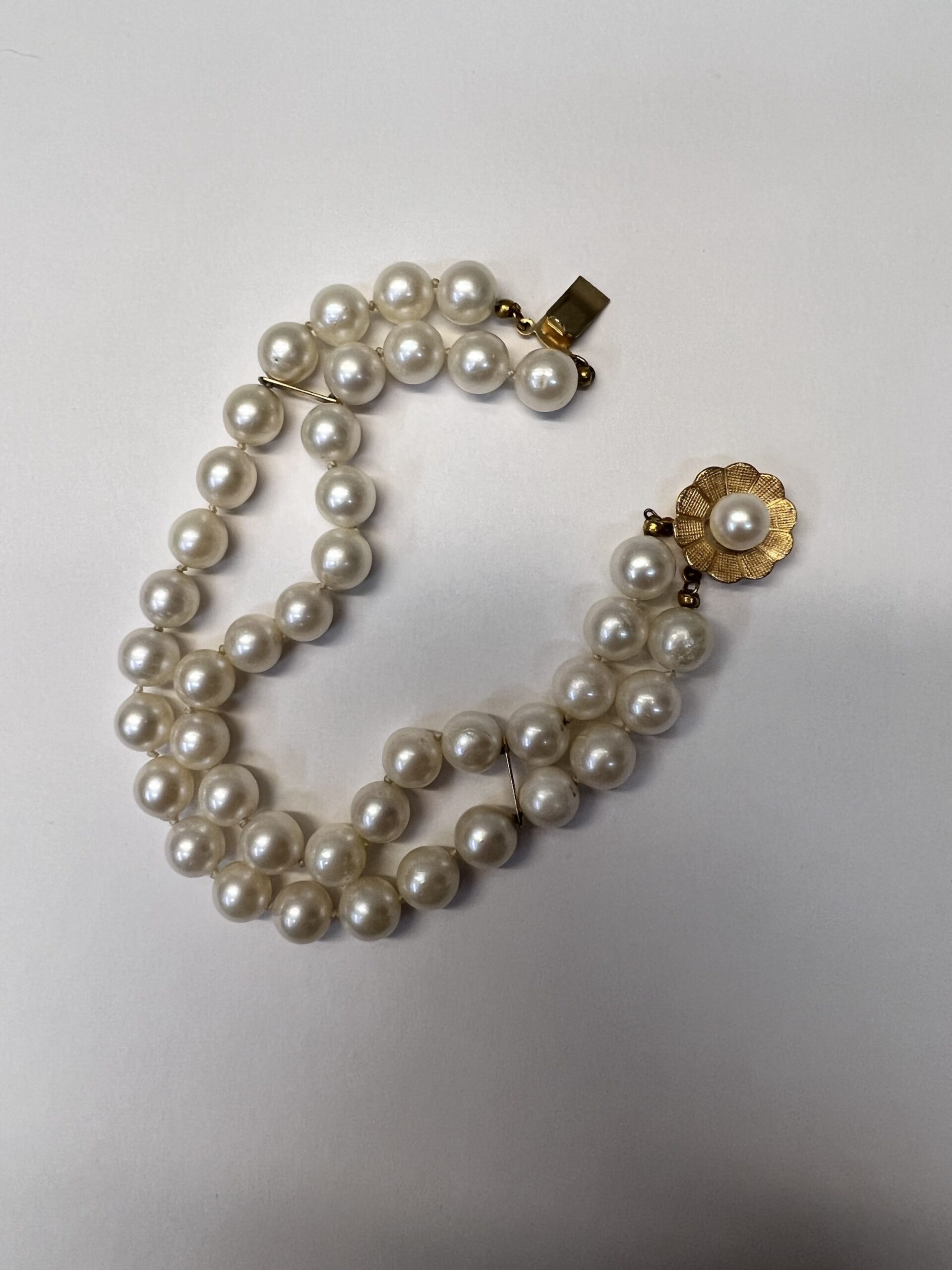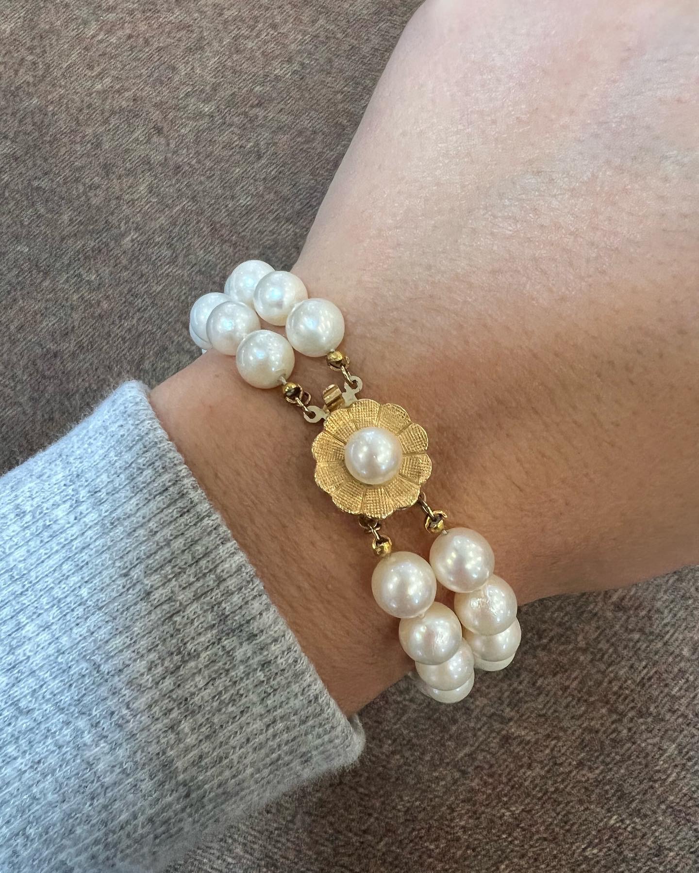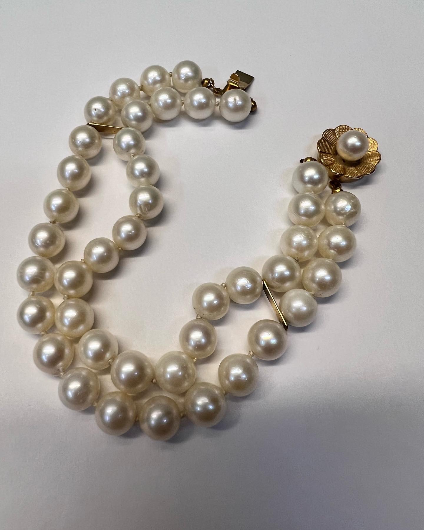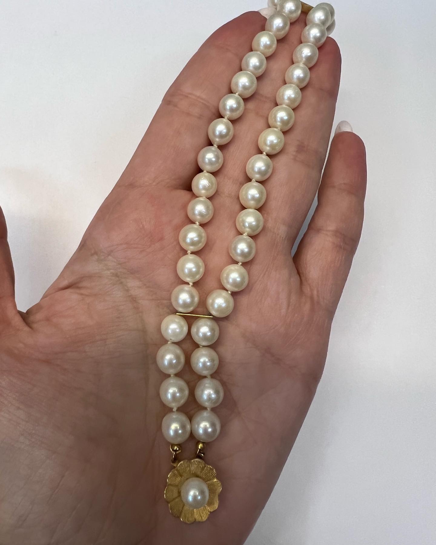 Vintage 7” 7 mm cultured pearl double strand bracelet with a 14k yellow gold flower clasp set with a 6 mm cultured pearl. This bracelet has an entire weight of 26.2 grams.