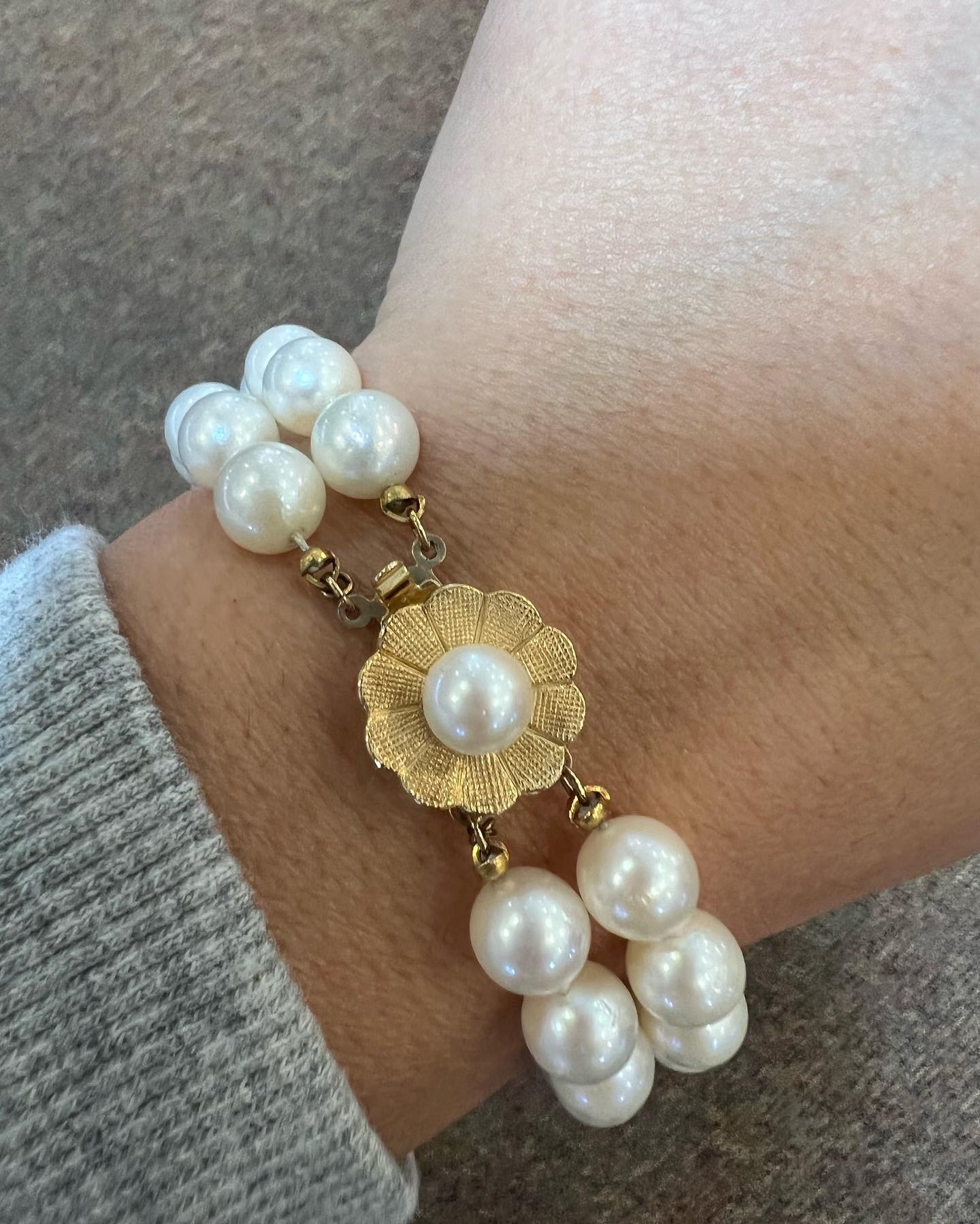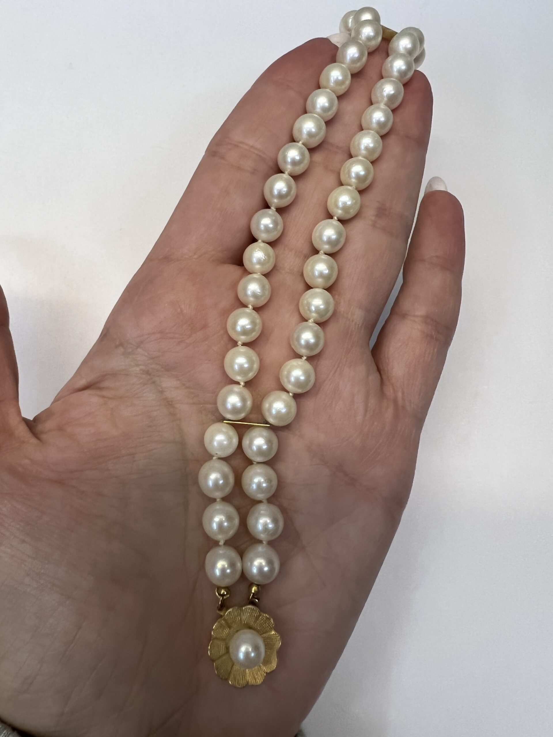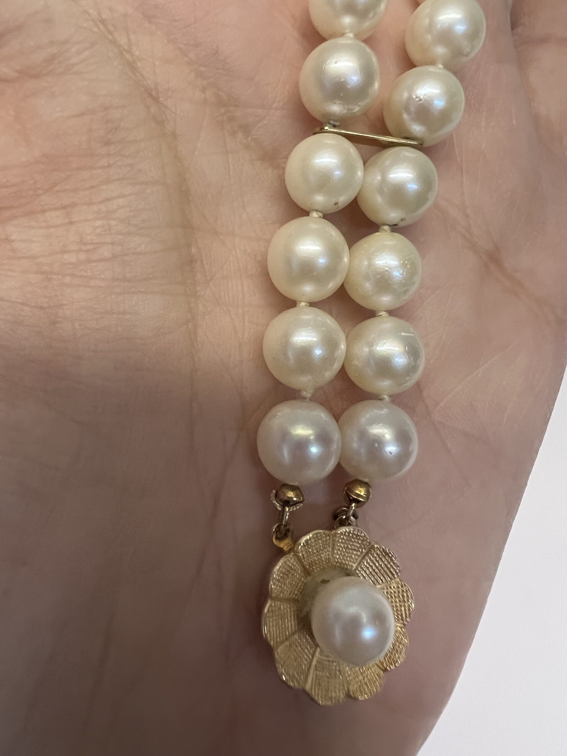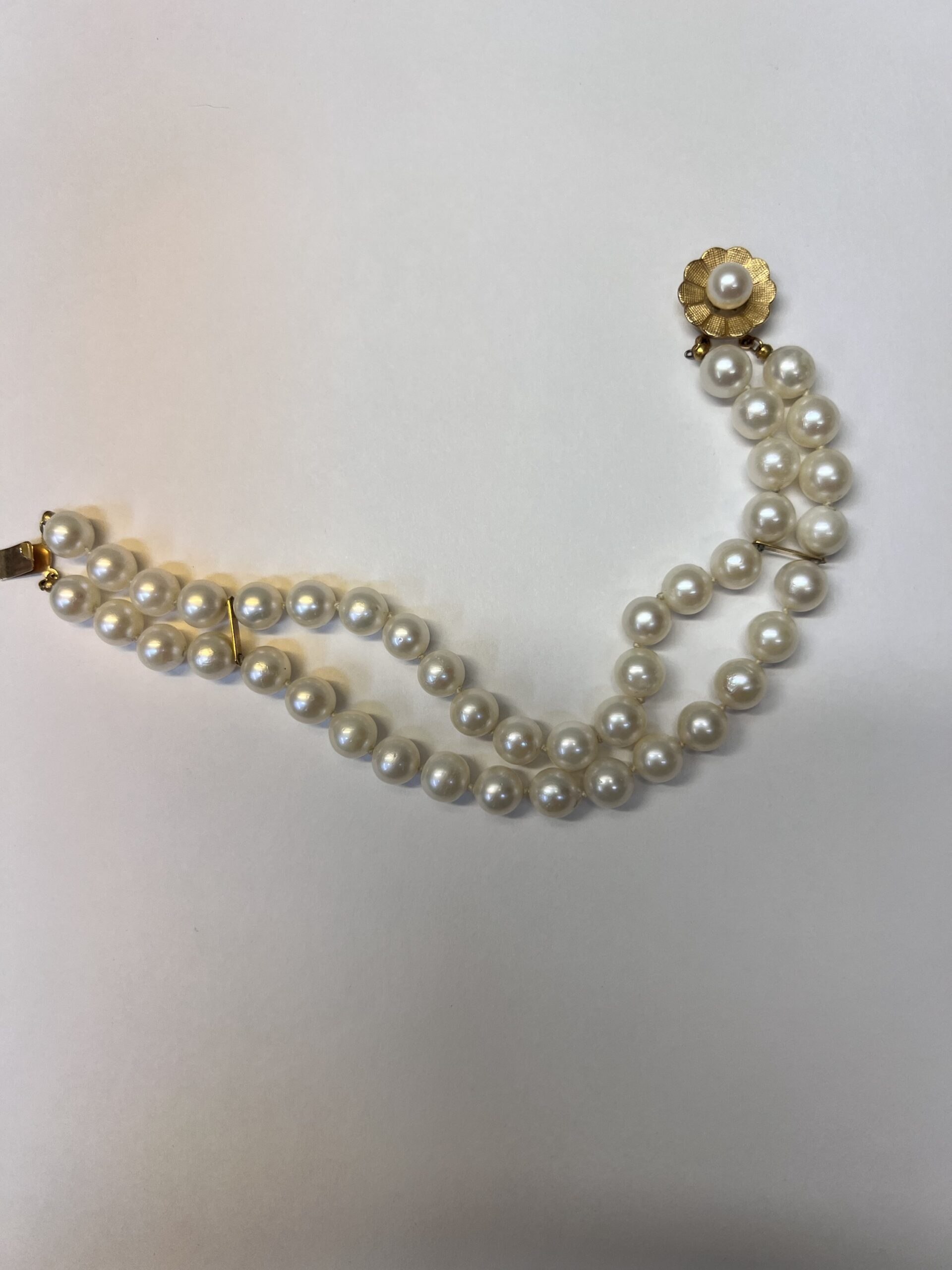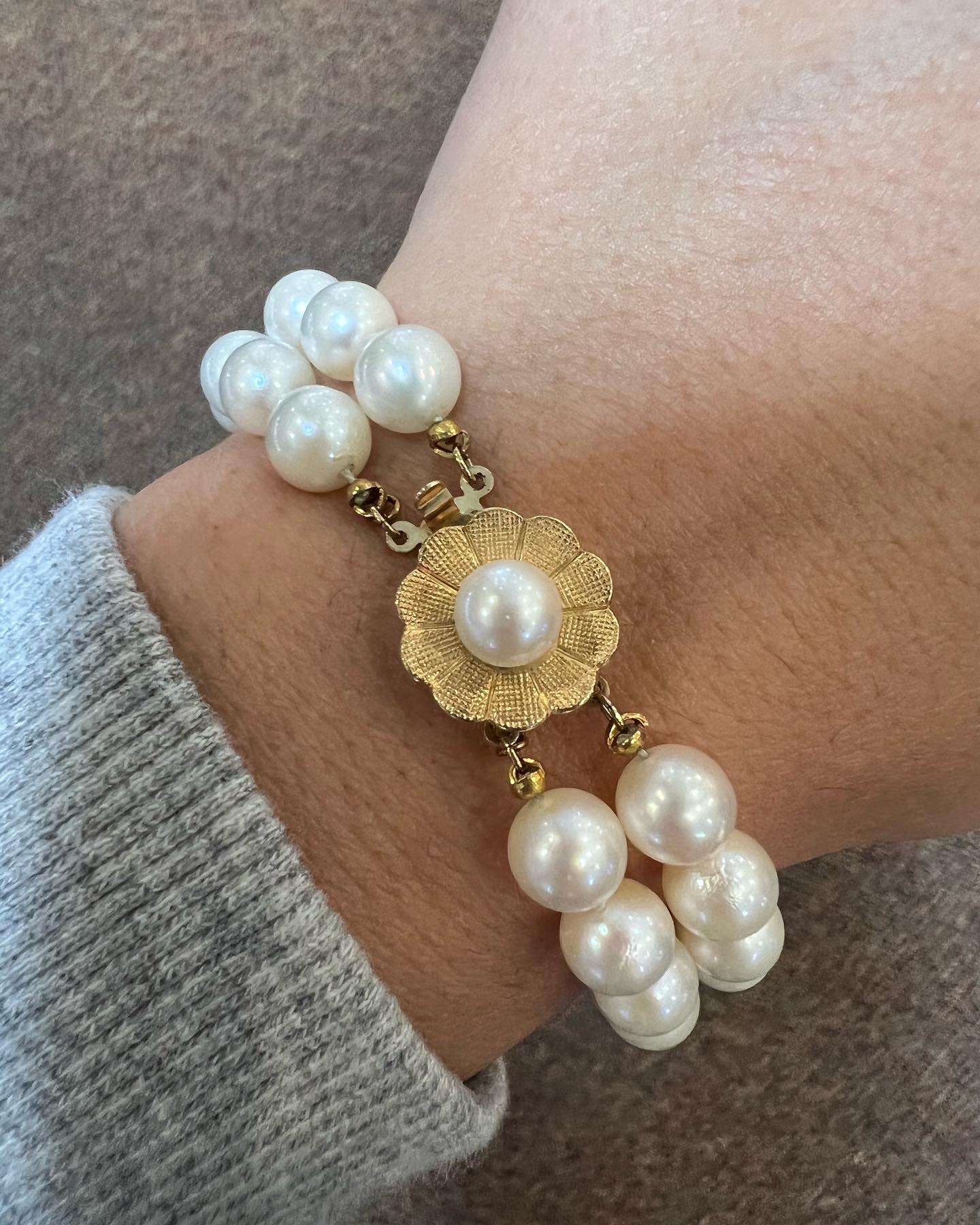 Vintage 7” 7 mm cultured pearl double strand bracelet with a 14k yellow gold flower clasp set with a 6 mm cultured pearl. This bracelet has an entire weight of 26.2 grams.