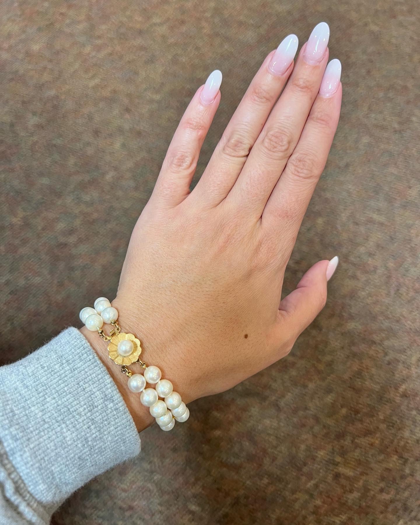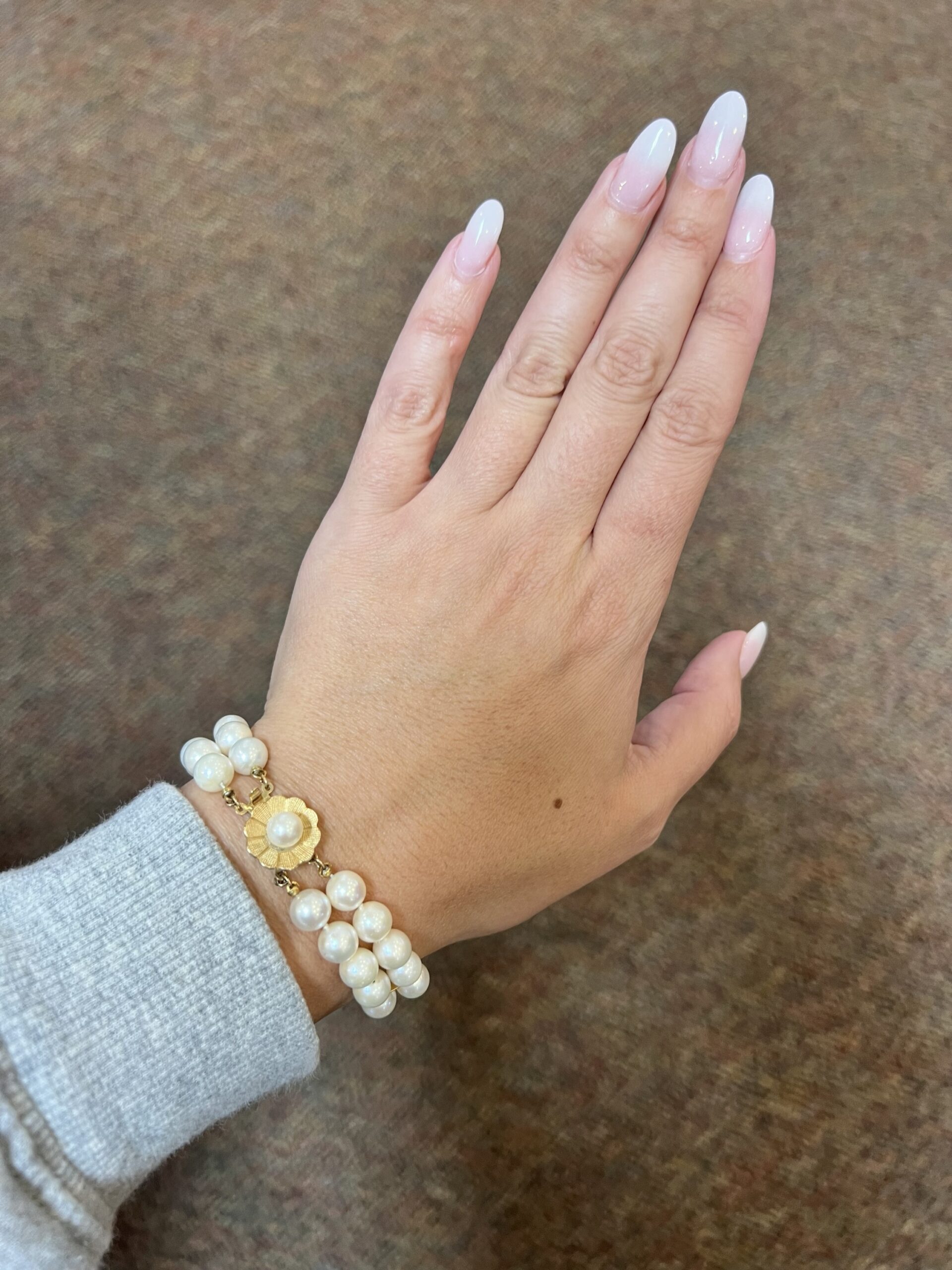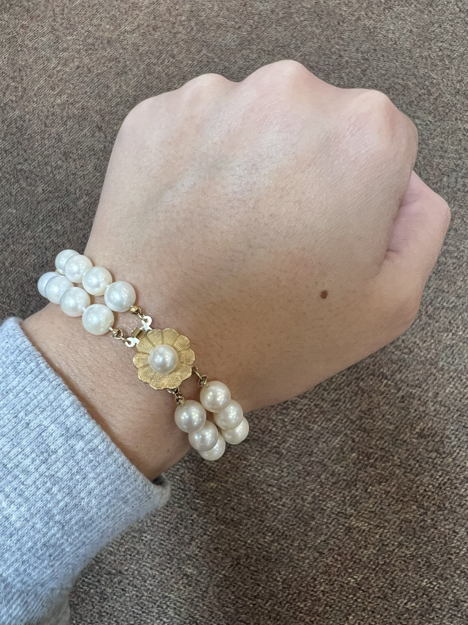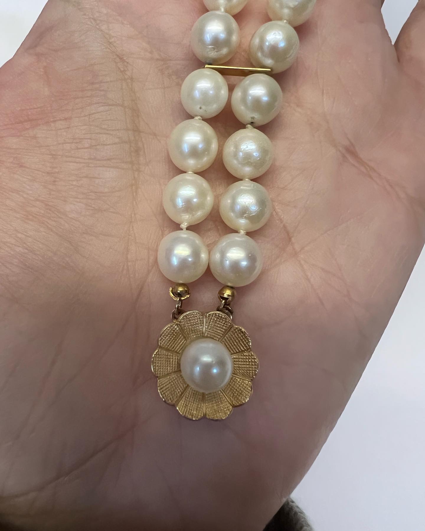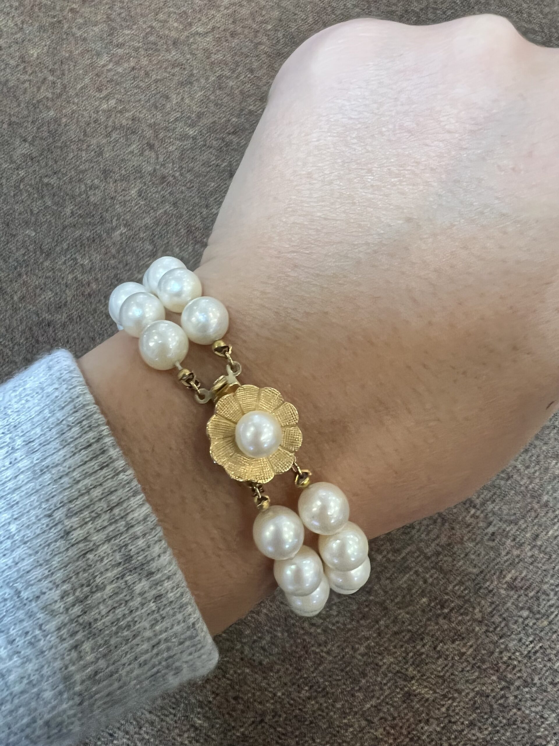 Vintage 7” 7 mm cultured pearl double strand bracelet with a 14k yellow gold flower clasp set with a 6 mm cultured pearl. This bracelet has an entire weight of 26.2 grams.