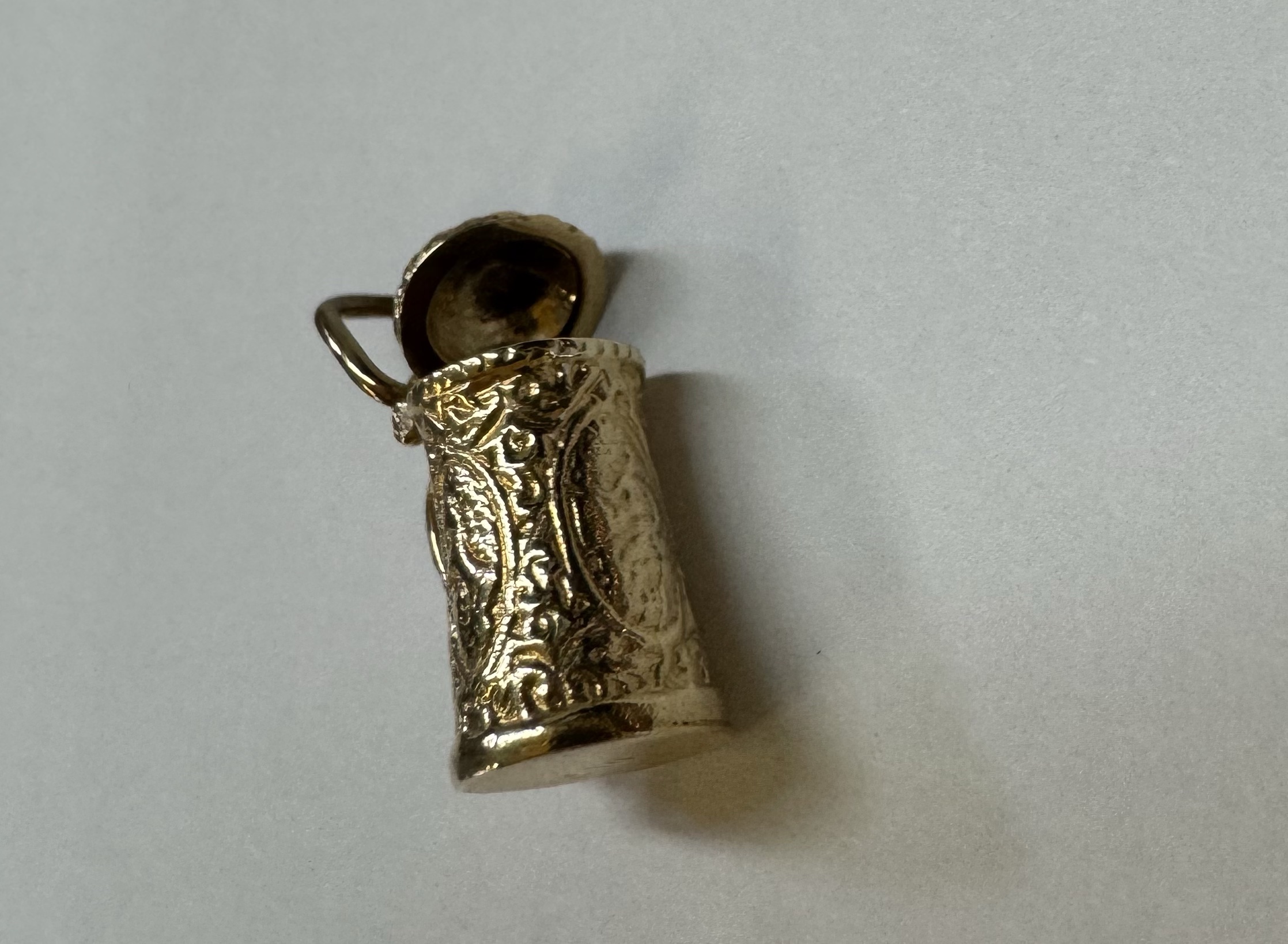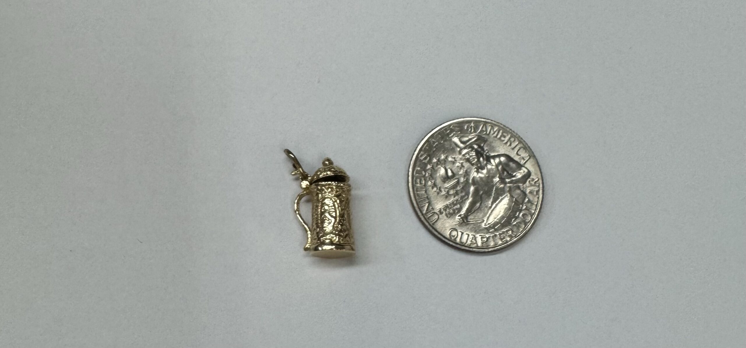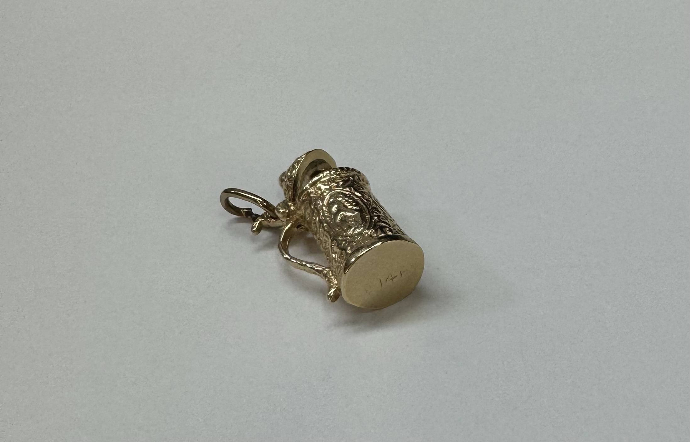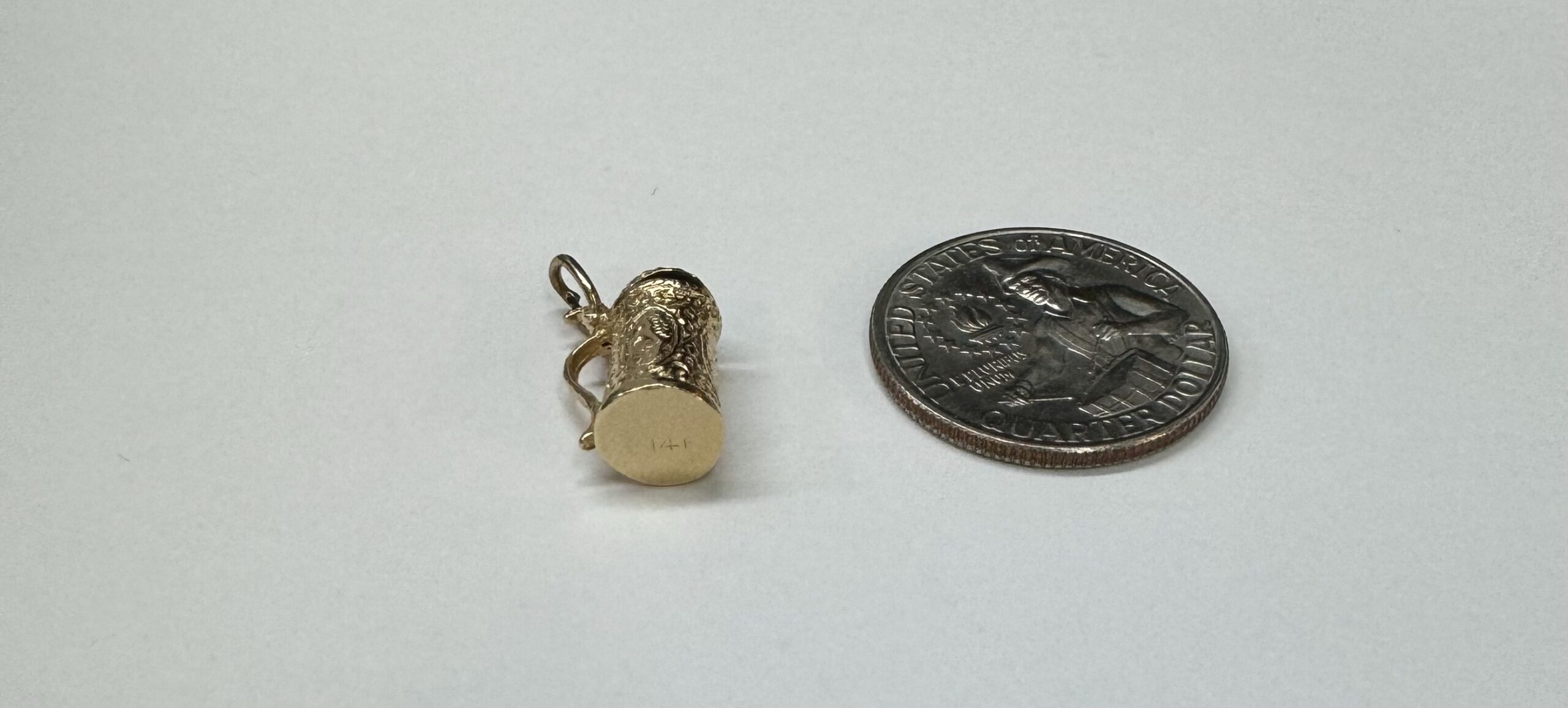 Vintage 14k yellow gold engraved beer stein charm/pendant. This piece has an entire weight of 3.1 grams. We will replace the jump ring on this piece once it is sold.