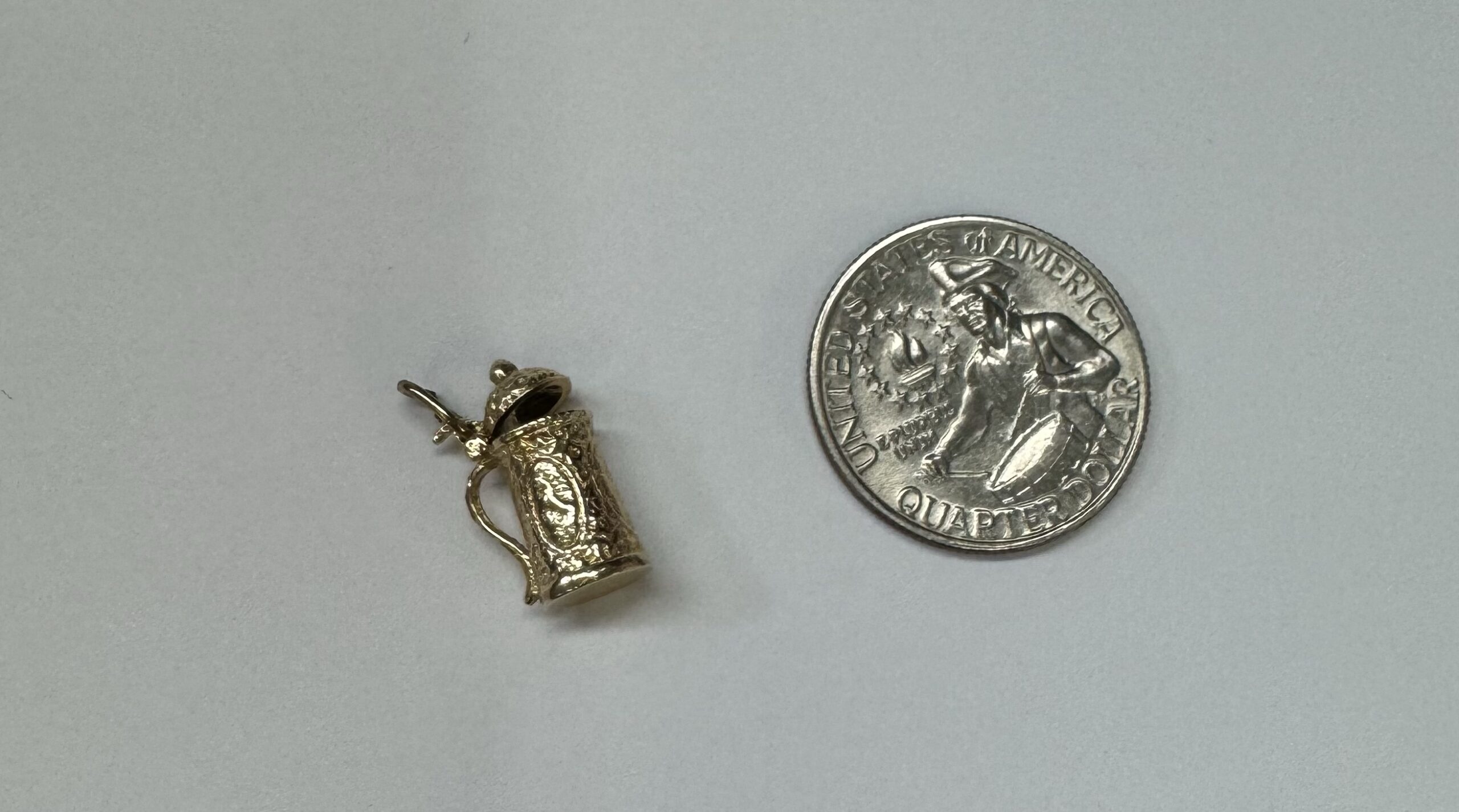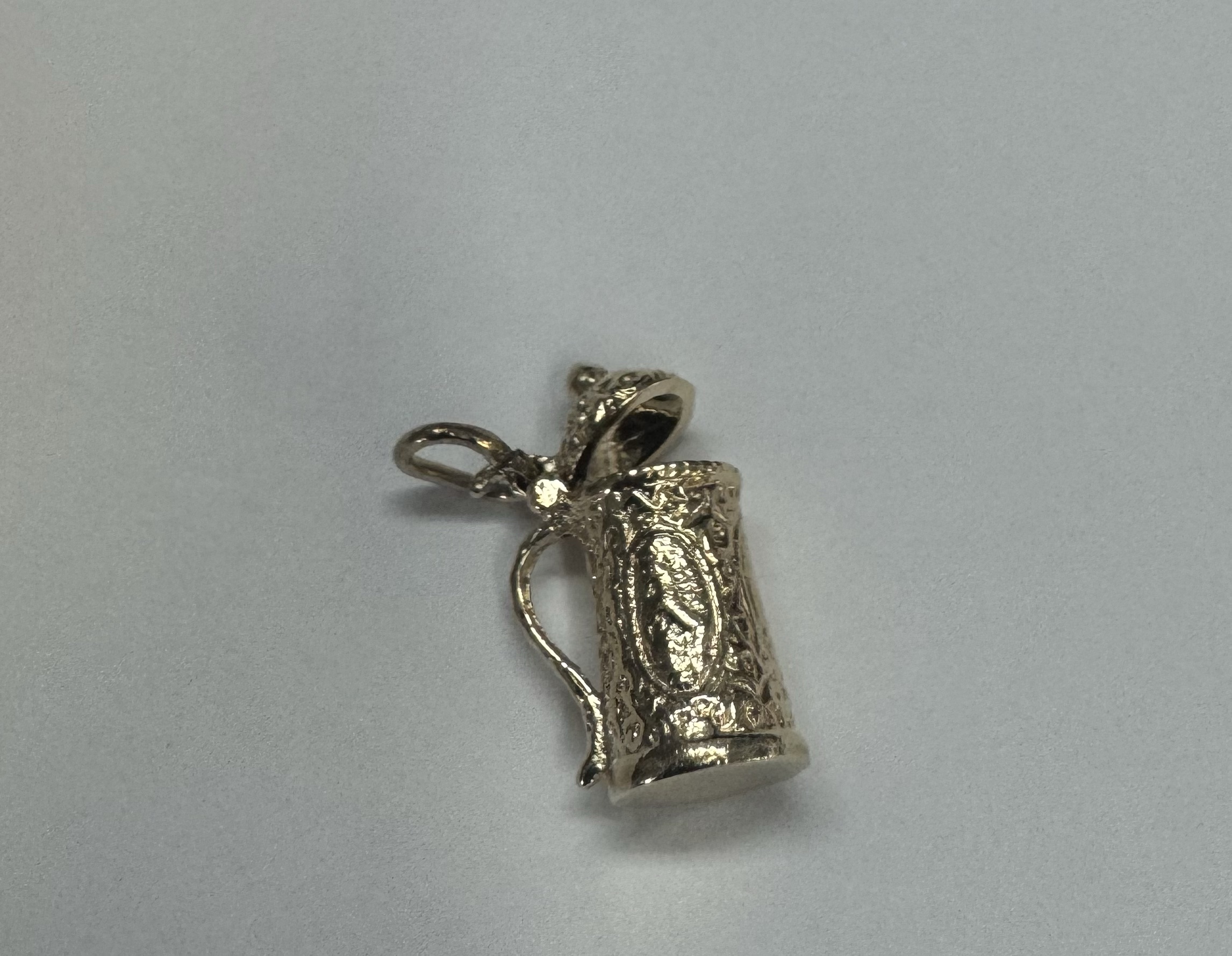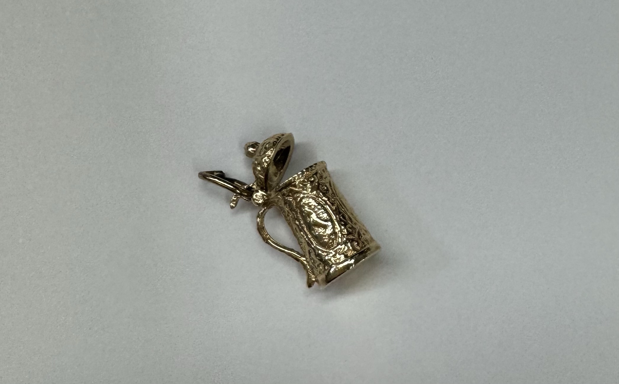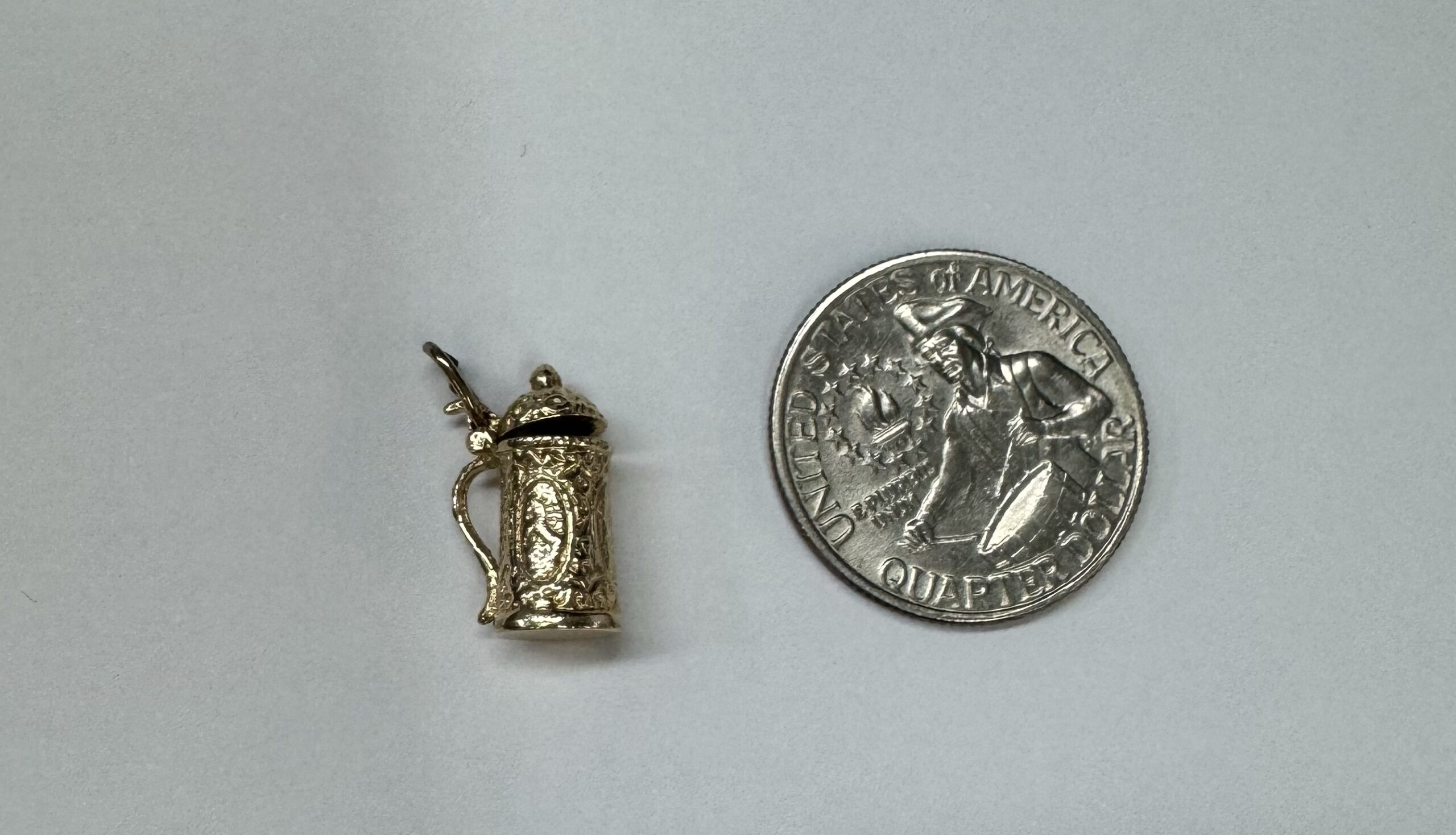 Vintage 14k yellow gold engraved beer stein charm/pendant. This piece has an entire weight of 3.1 grams. We will replace the jump ring on this piece once it is sold.