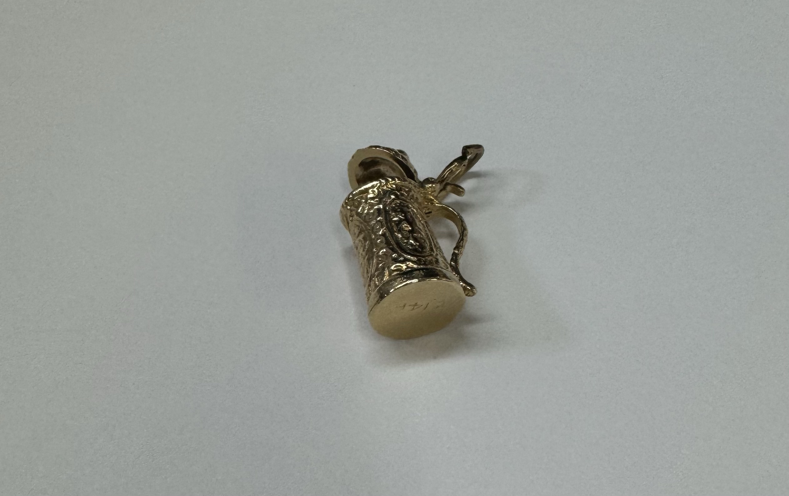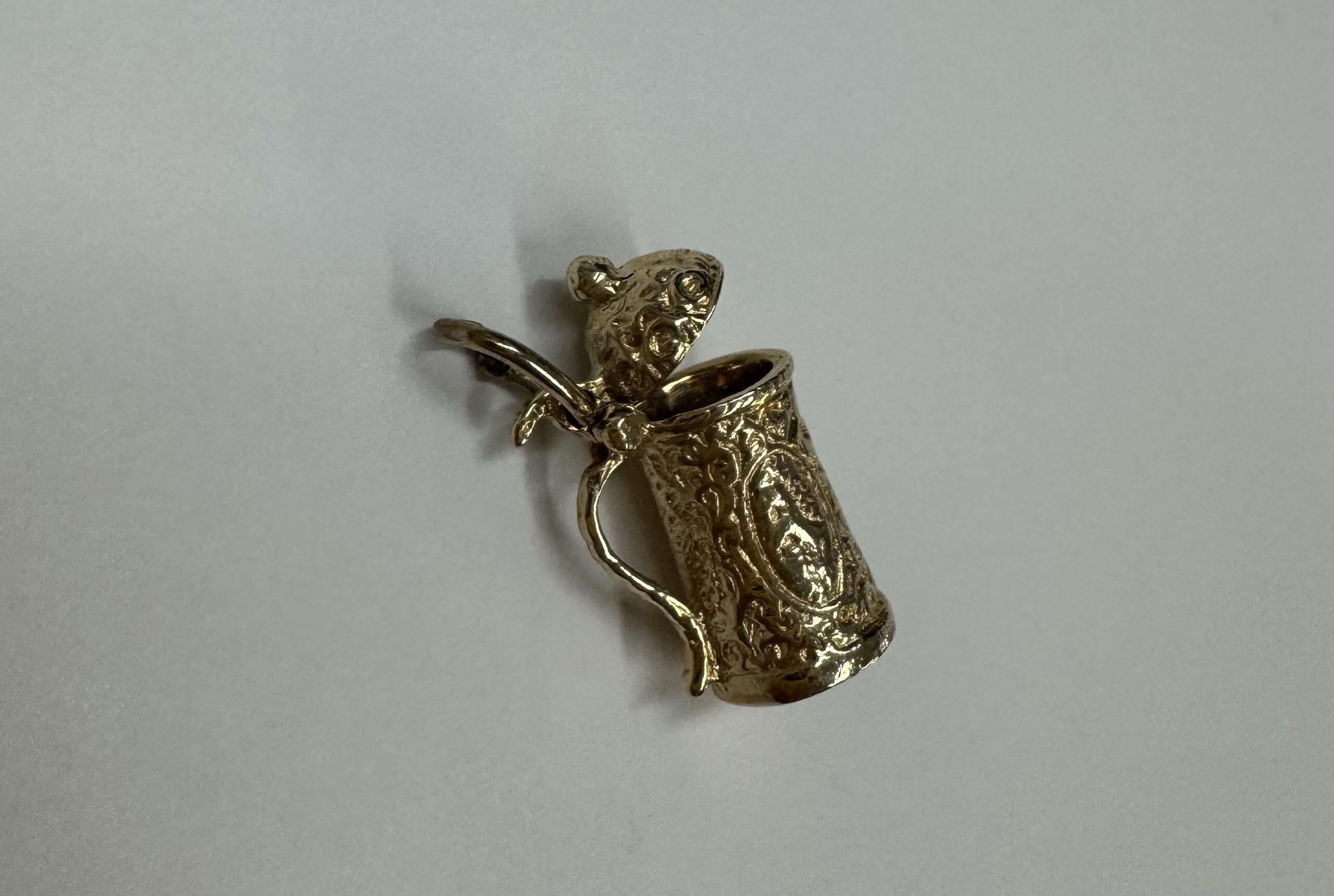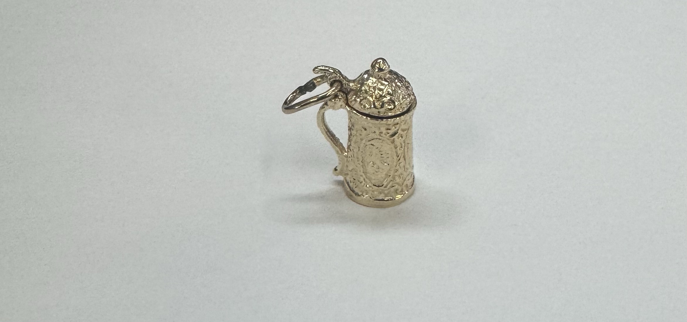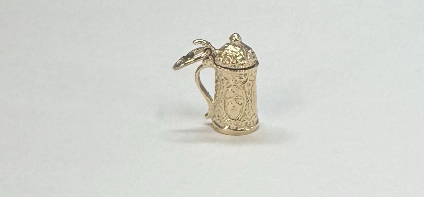Vintage 14k yellow gold engraved beer stein charm/pendant. This piece has an entire weight of 3.1 grams. We will replace the jump ring on this piece once it is sold.
