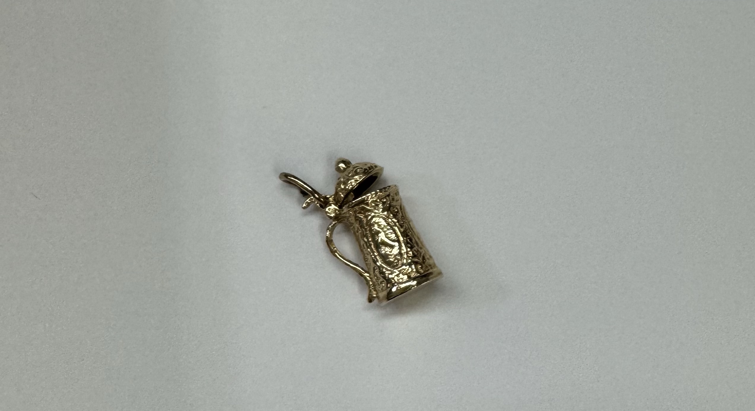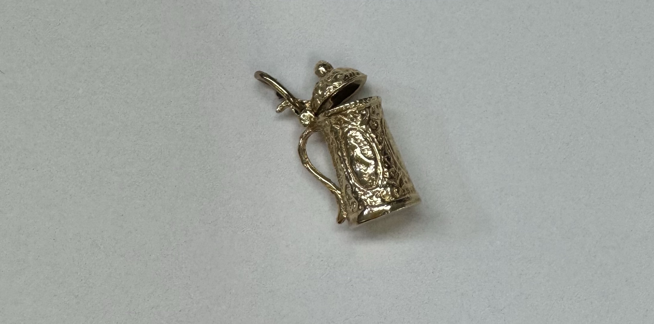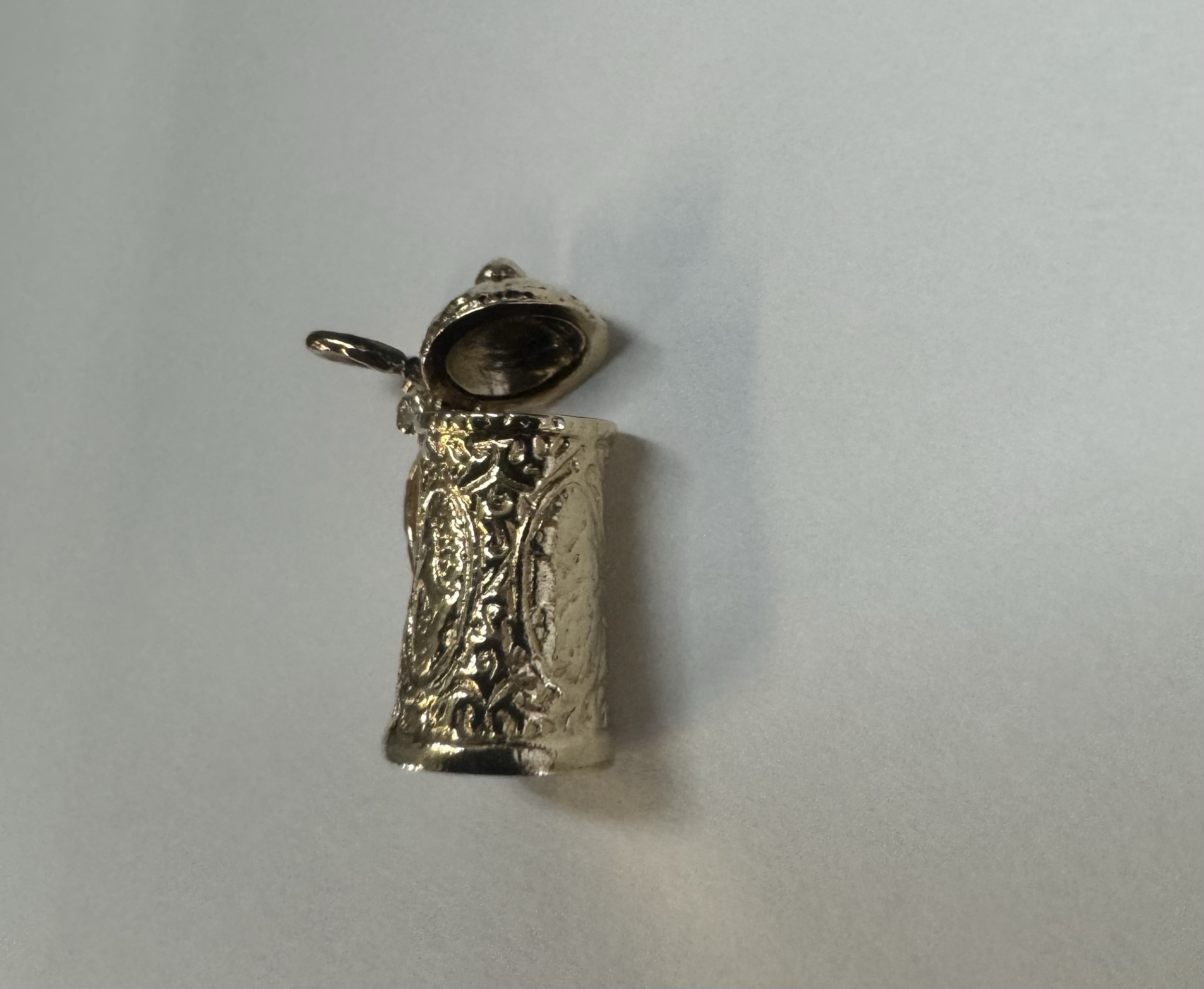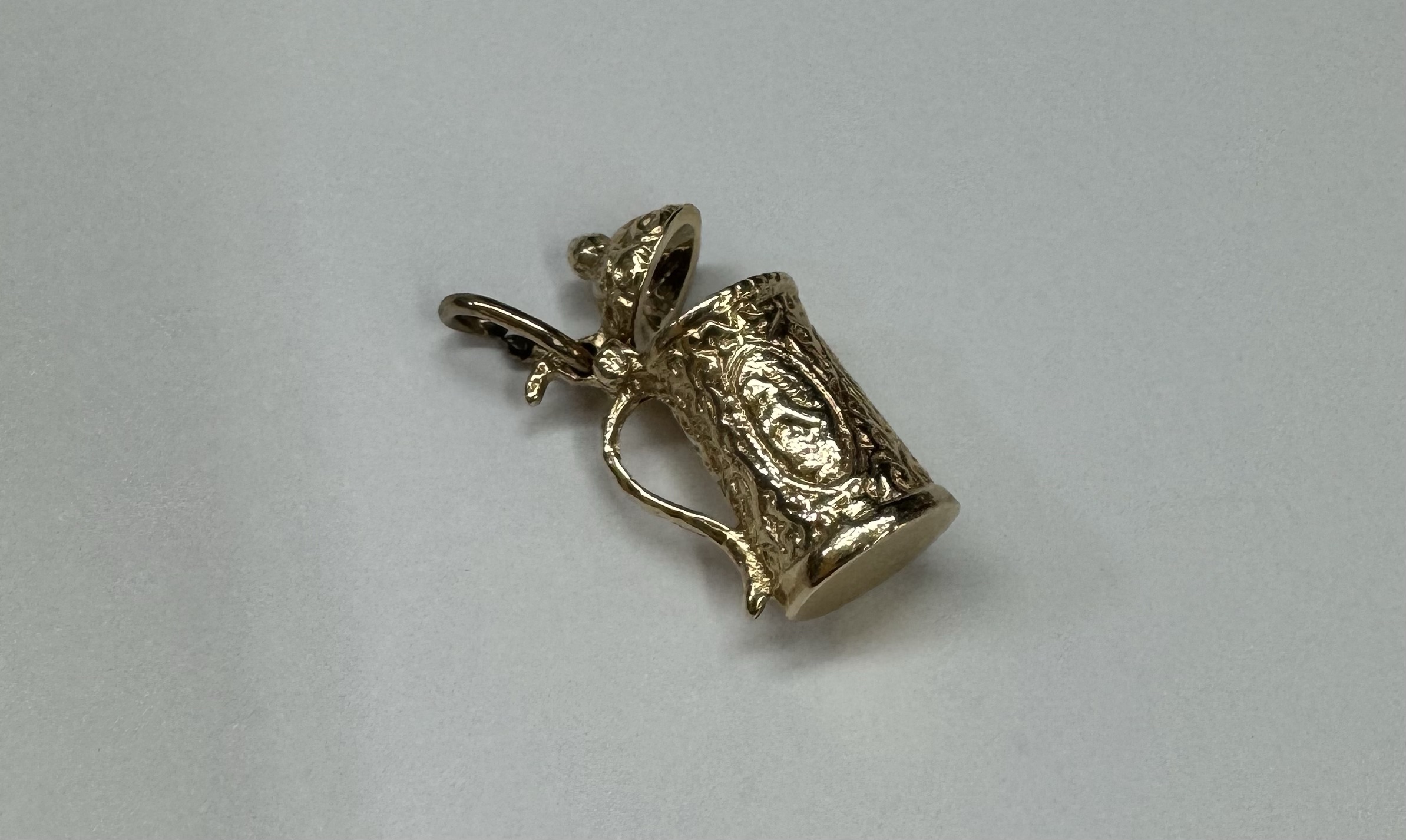 Vintage 14k yellow gold engraved beer stein charm/pendant. This piece has an entire weight of 3.1 grams. We will replace the jump ring on this piece once it is sold.