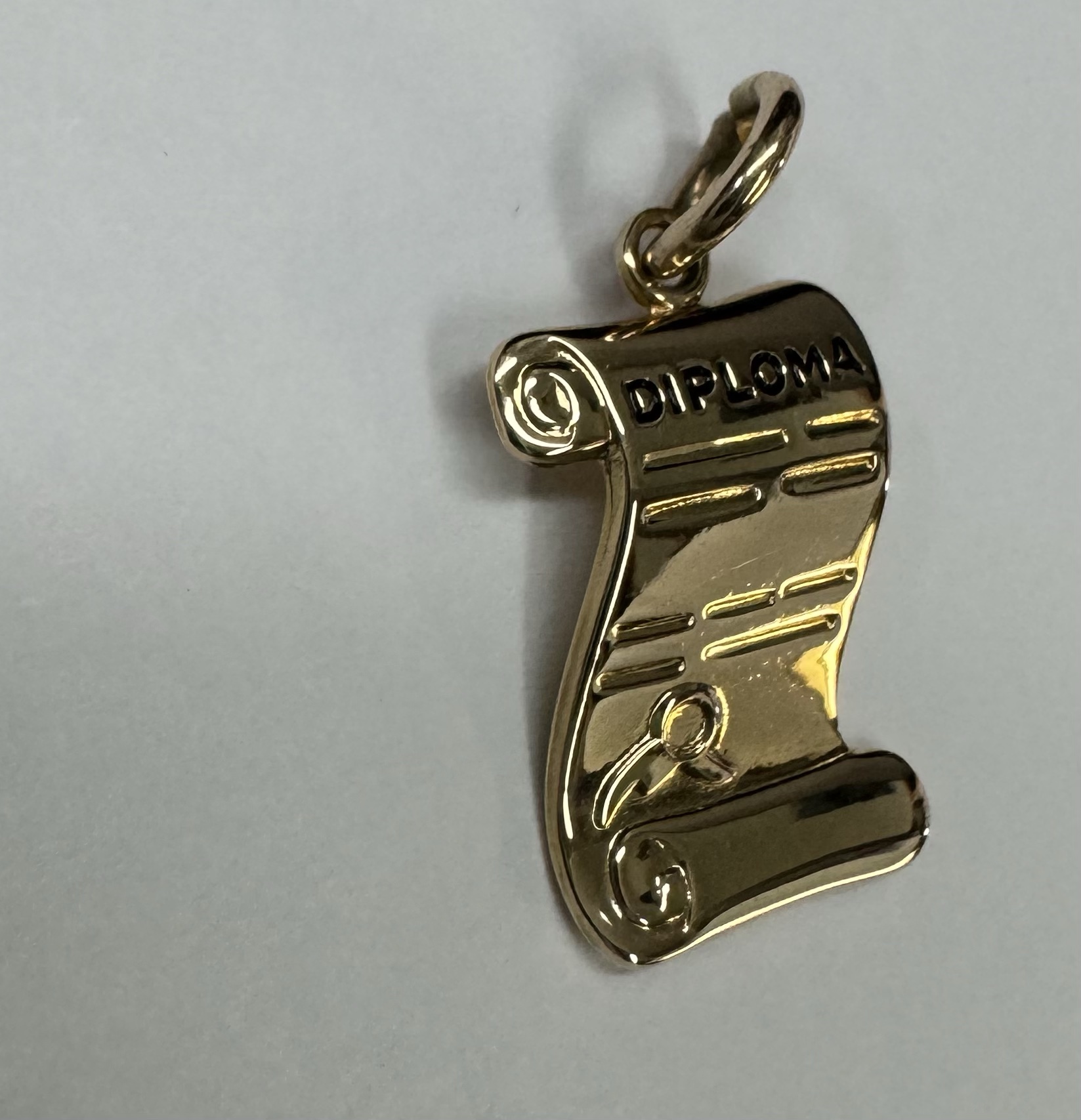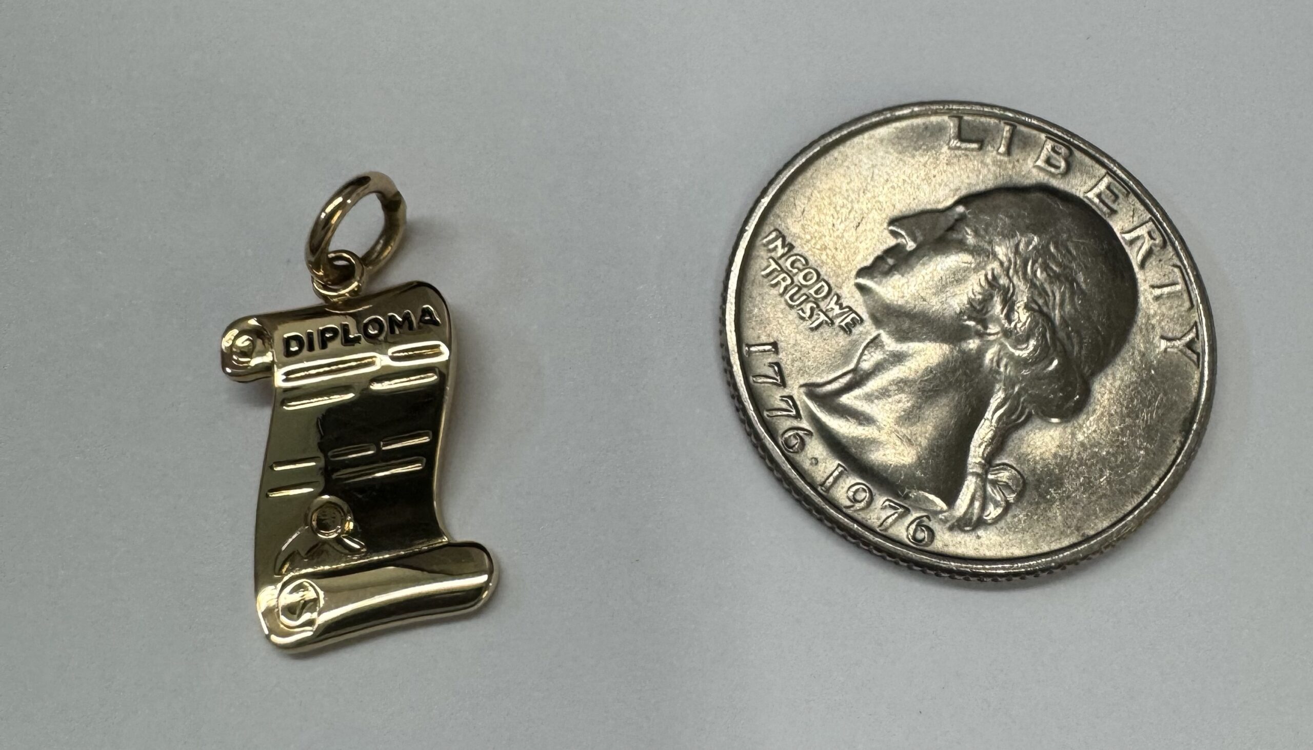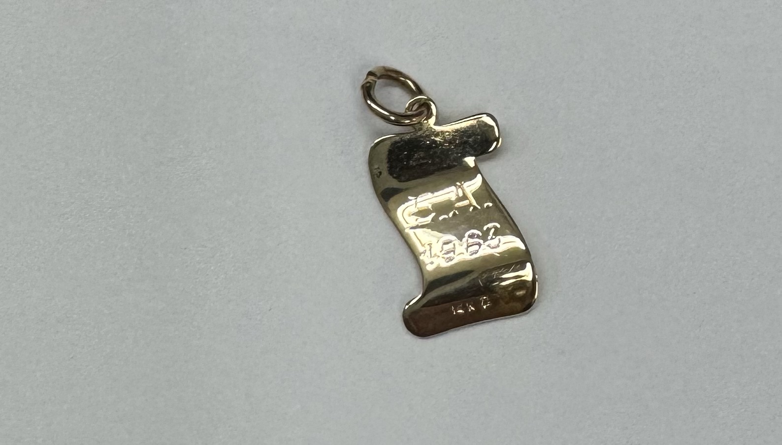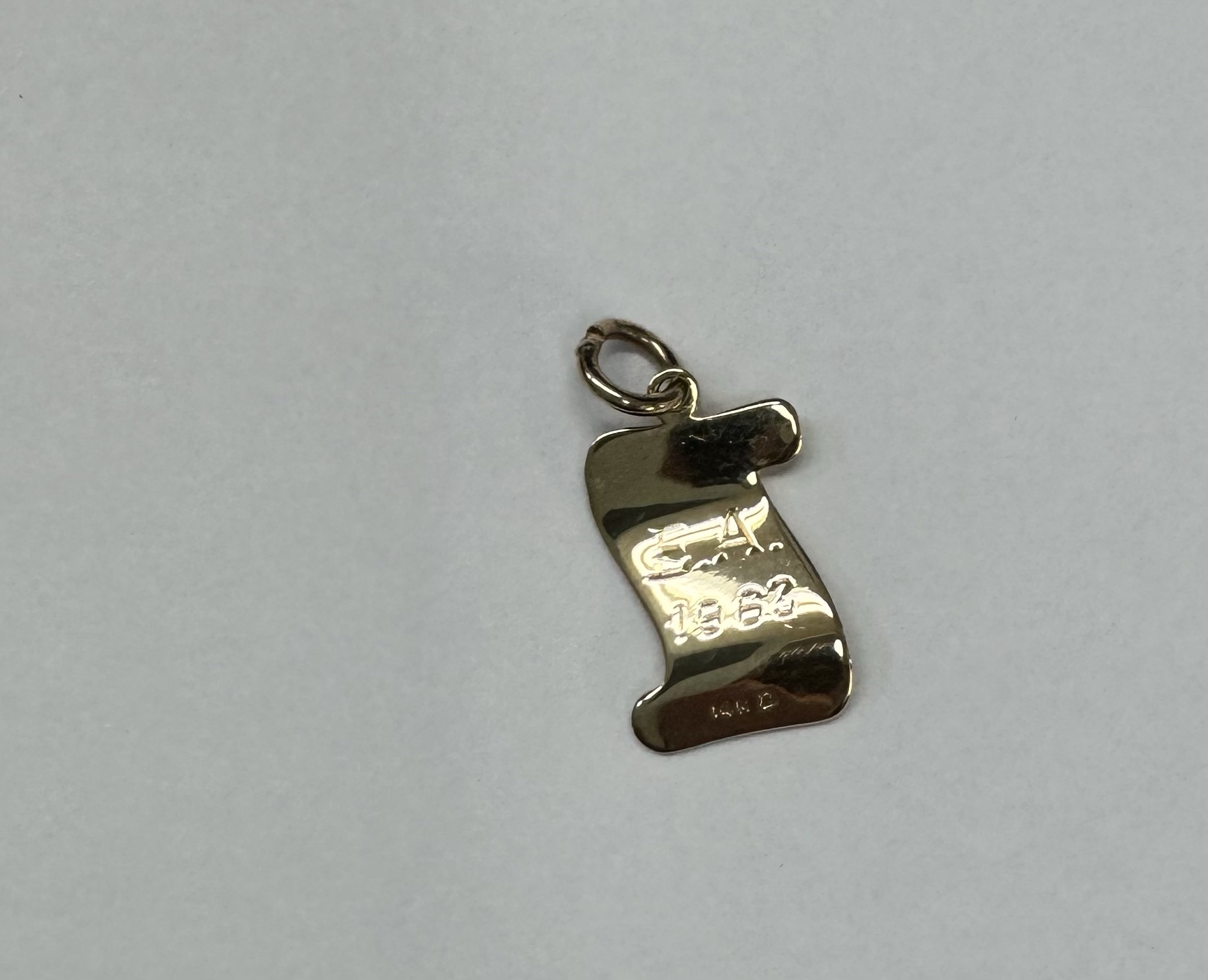 Vintage 14k yellow gold diploma charm, engraved “E.A. 1964”. This charm has an entire weight of 2.1 grams.
