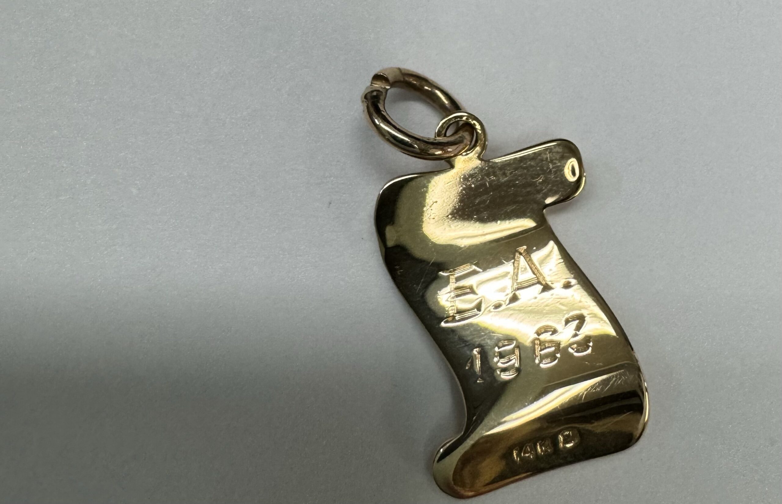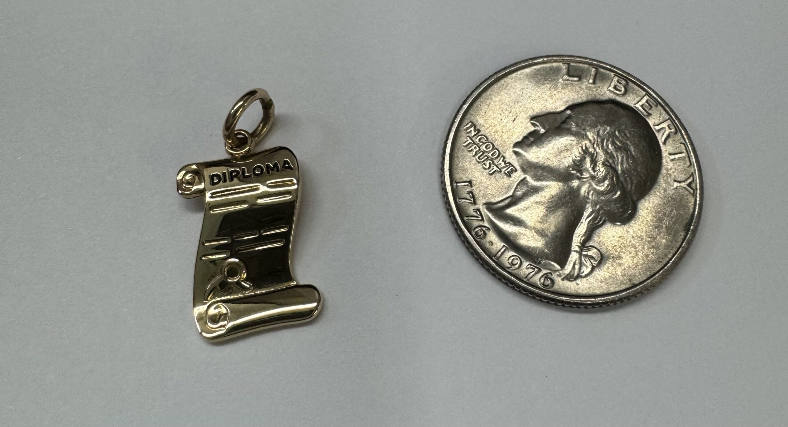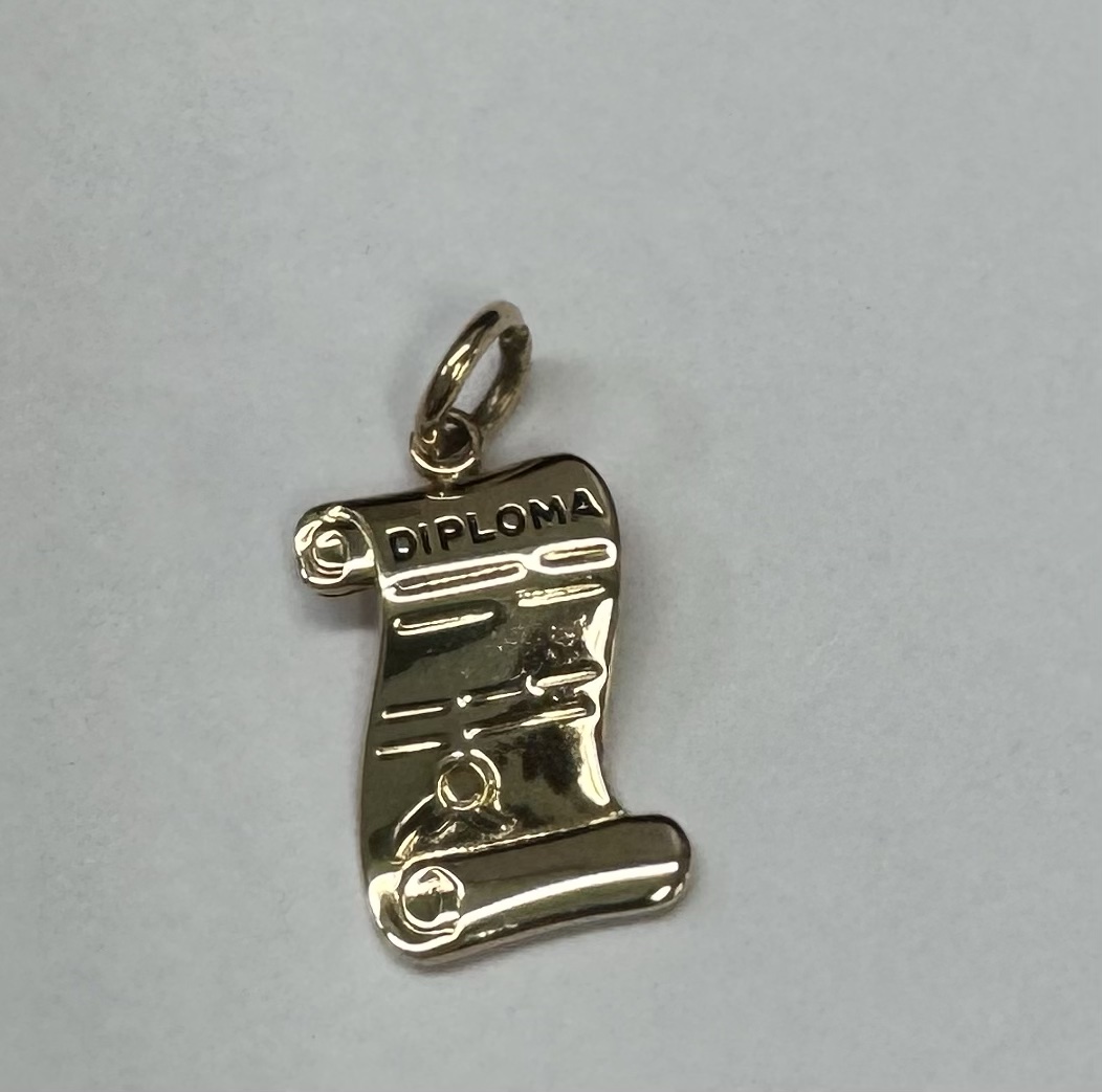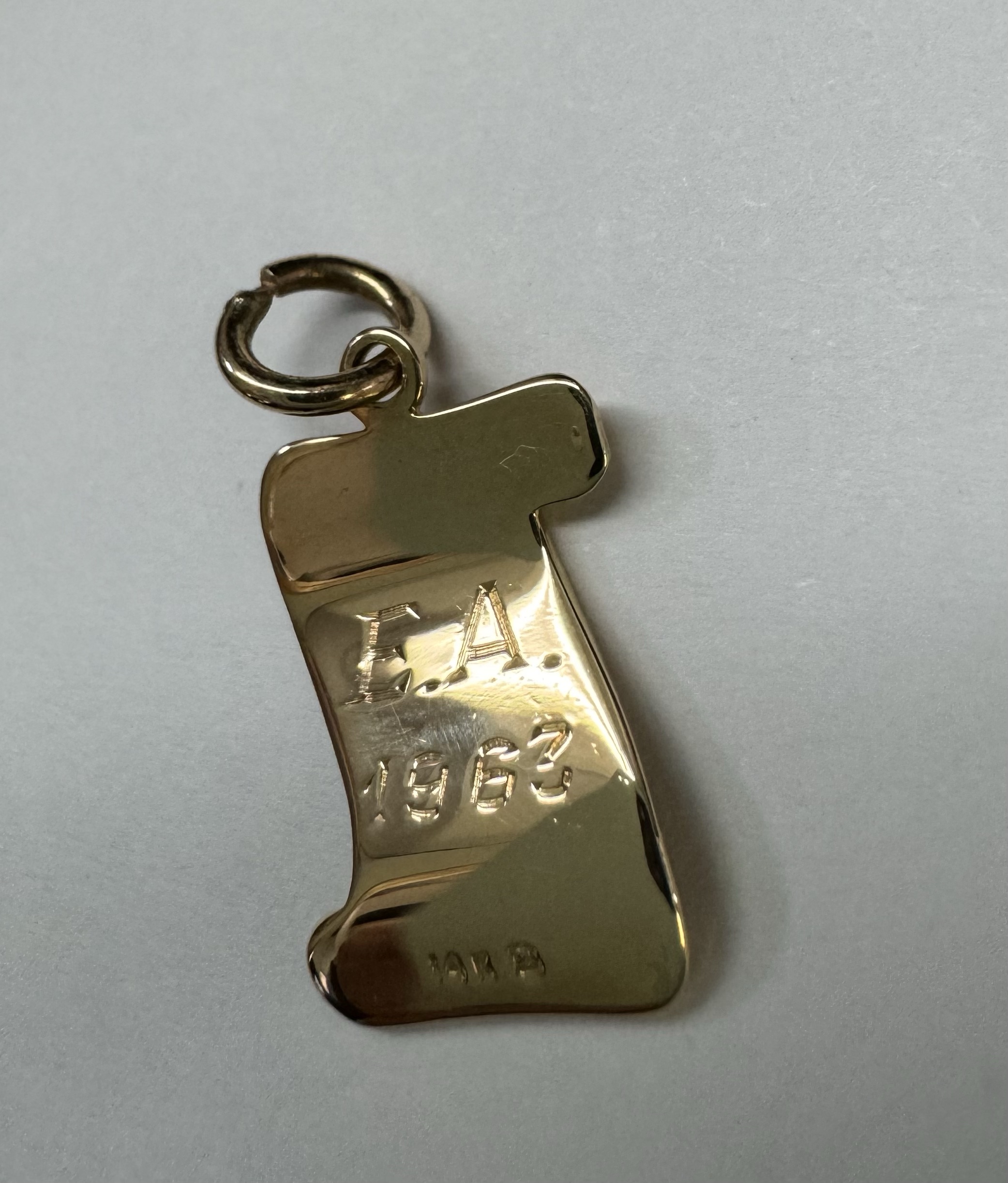 Vintage 14k yellow gold diploma charm, engraved “E.A. 1964”. This charm has an entire weight of 2.1 grams.