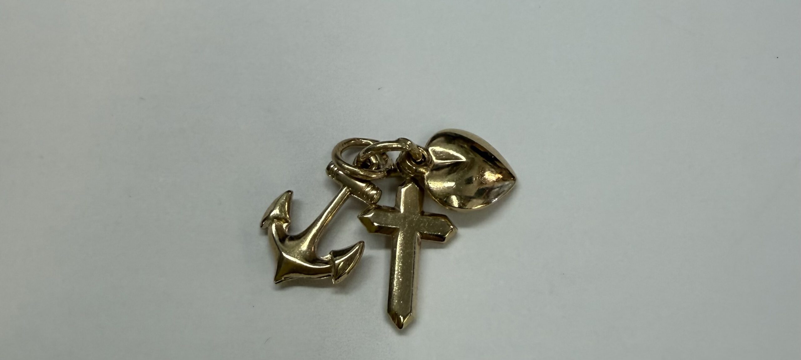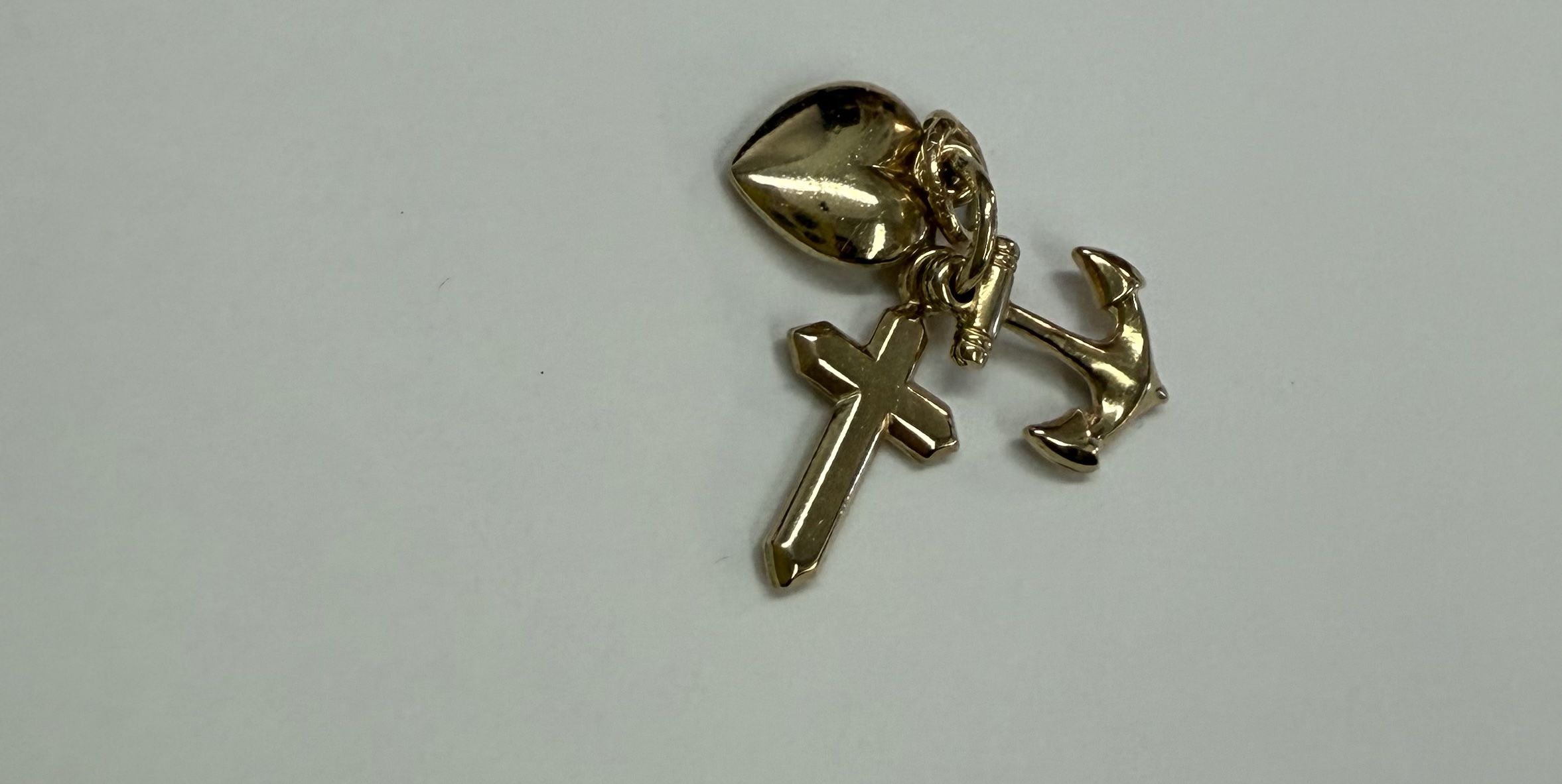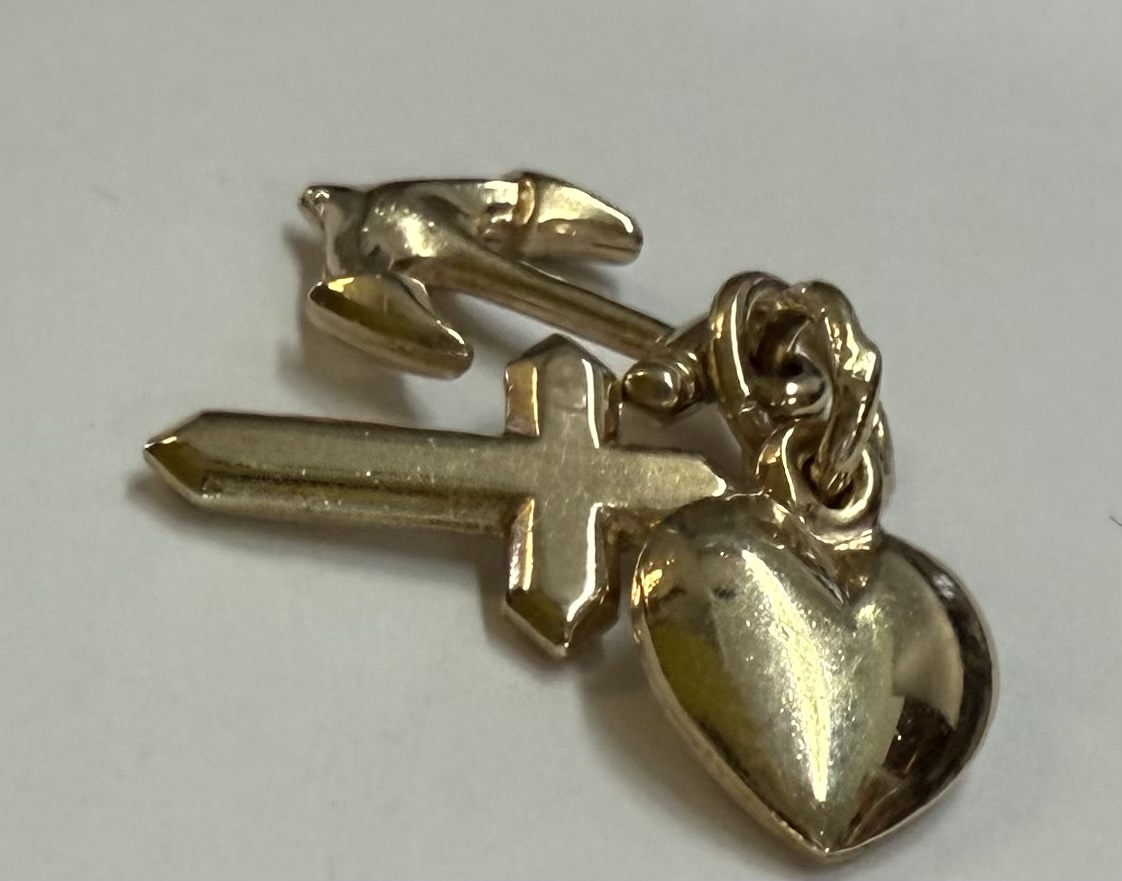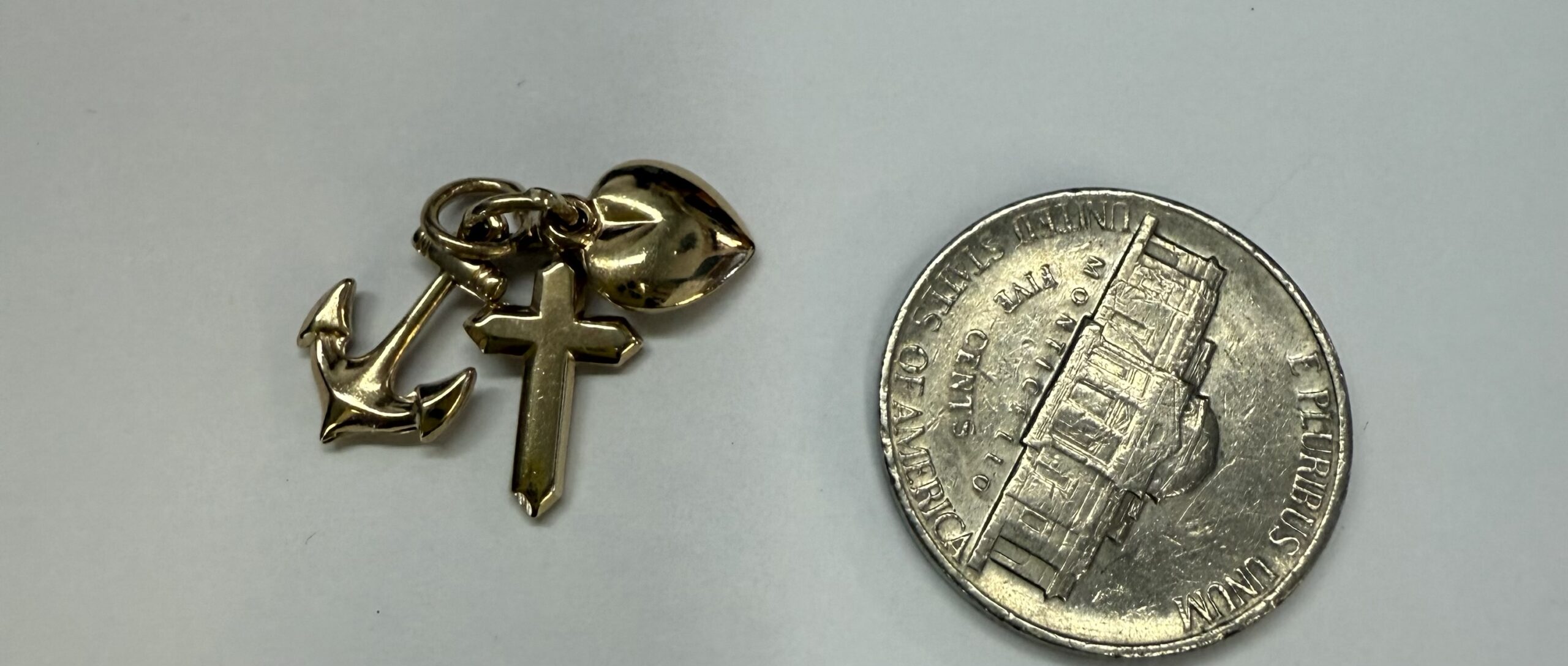 Vintage 14k yellow gold Faith, Hope, and Charity charm. This piece has an entire weight of 1.5 grams.