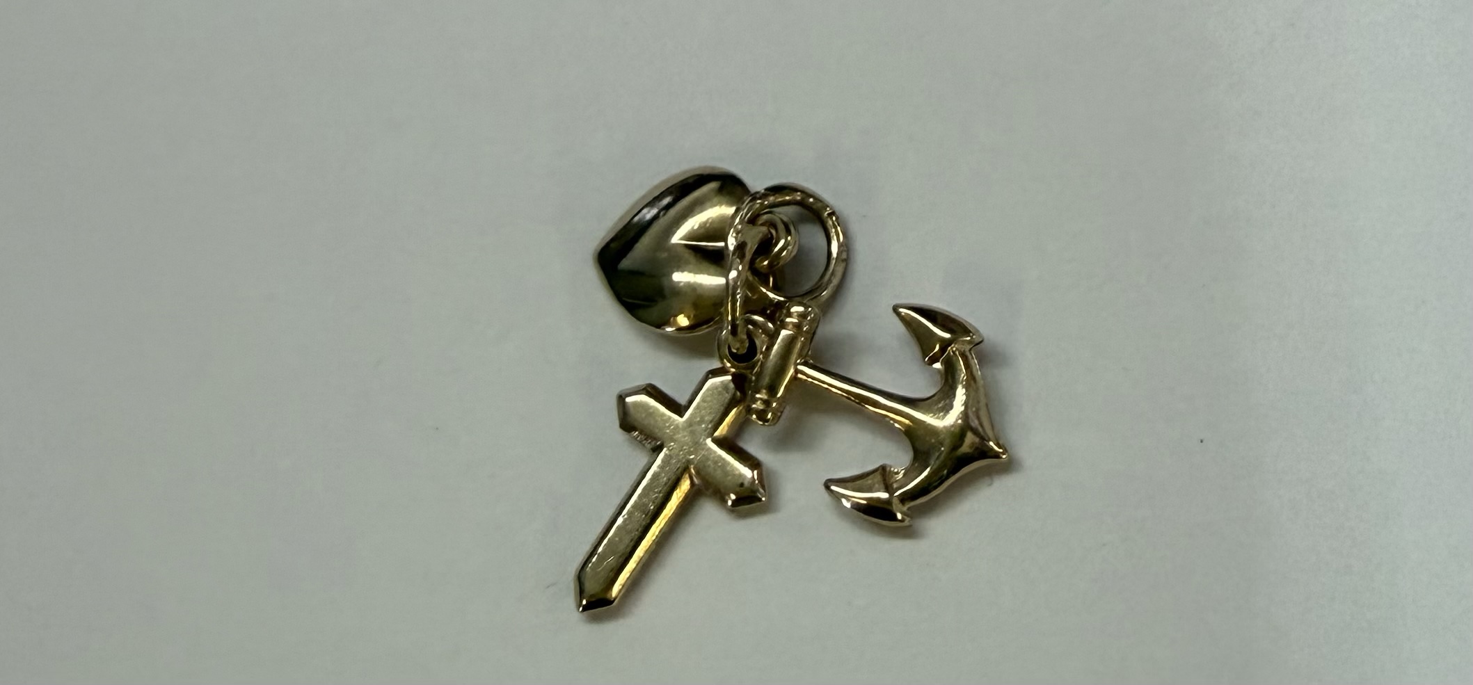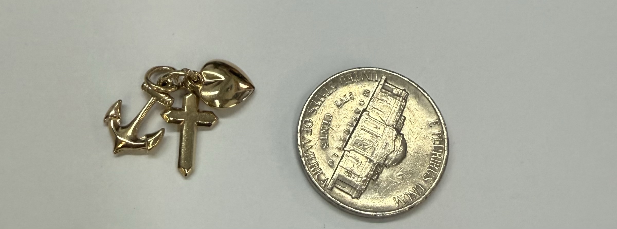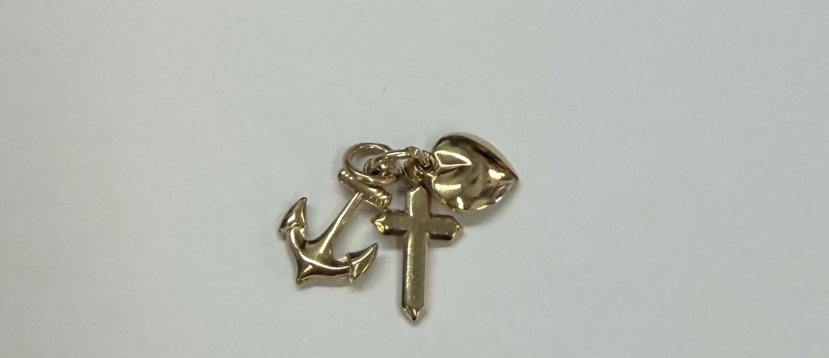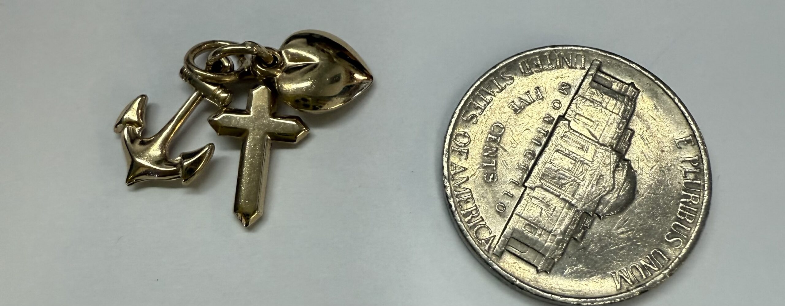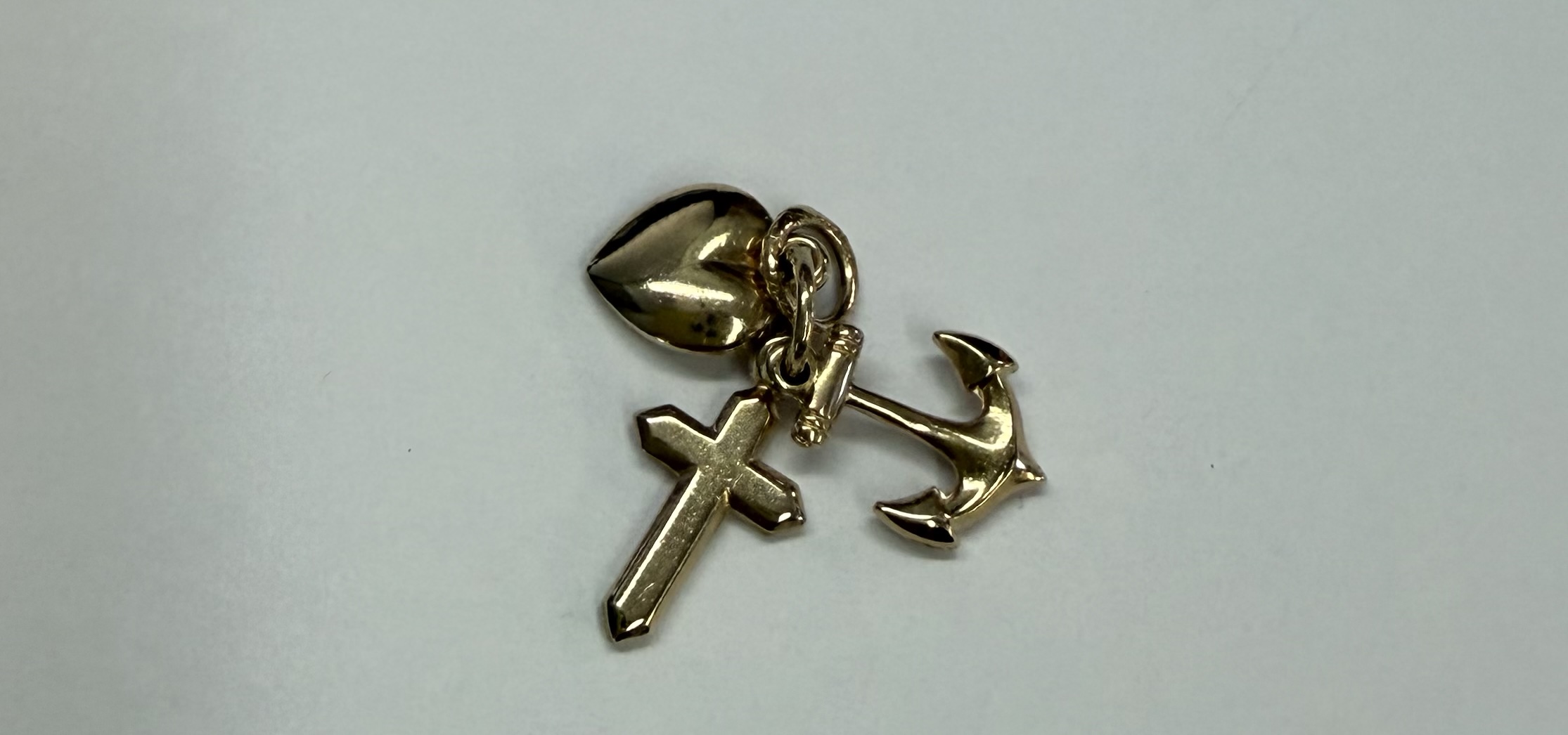 Vintage 14k yellow gold Faith, Hope, and Charity charm. This piece has an entire weight of 1.5 grams.