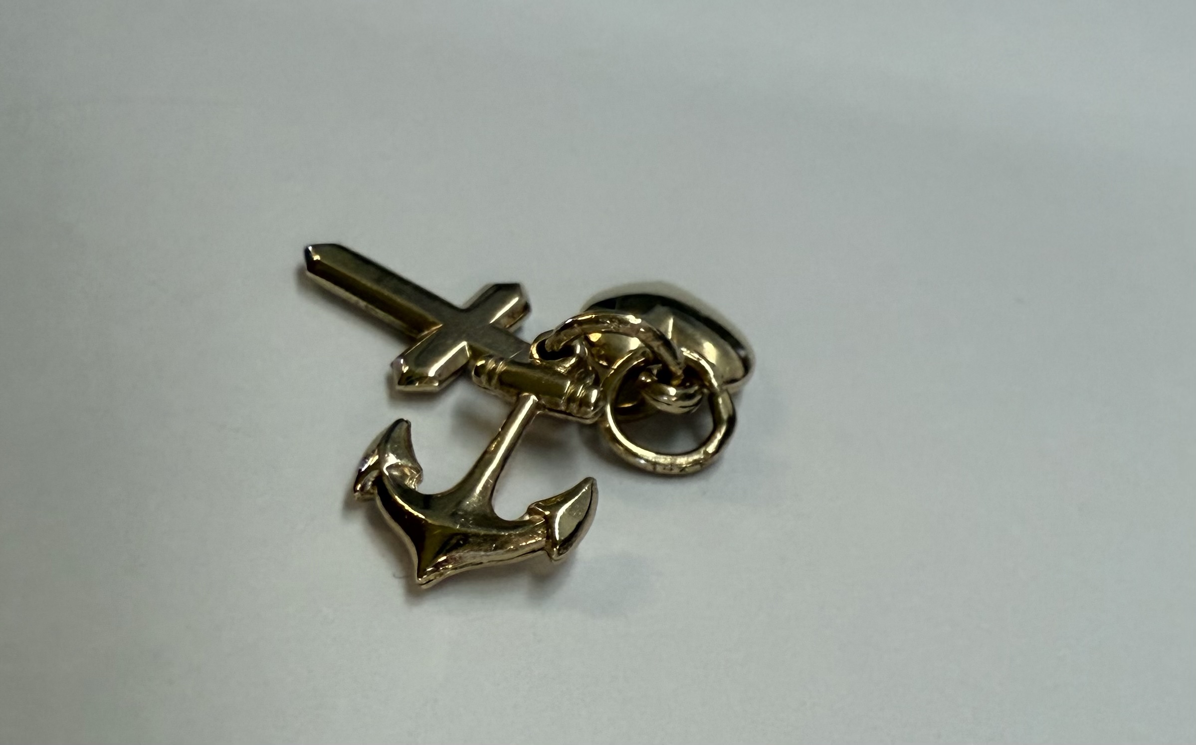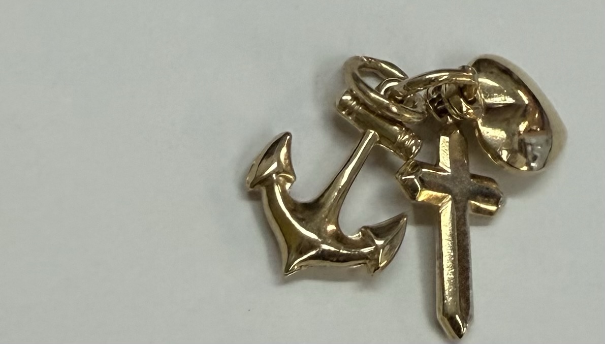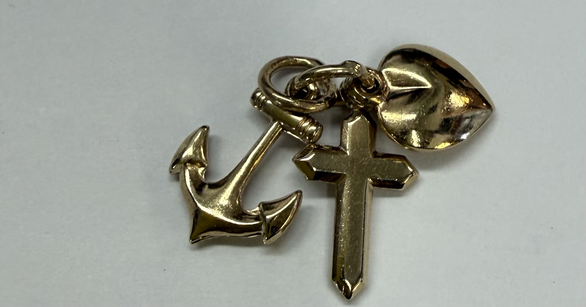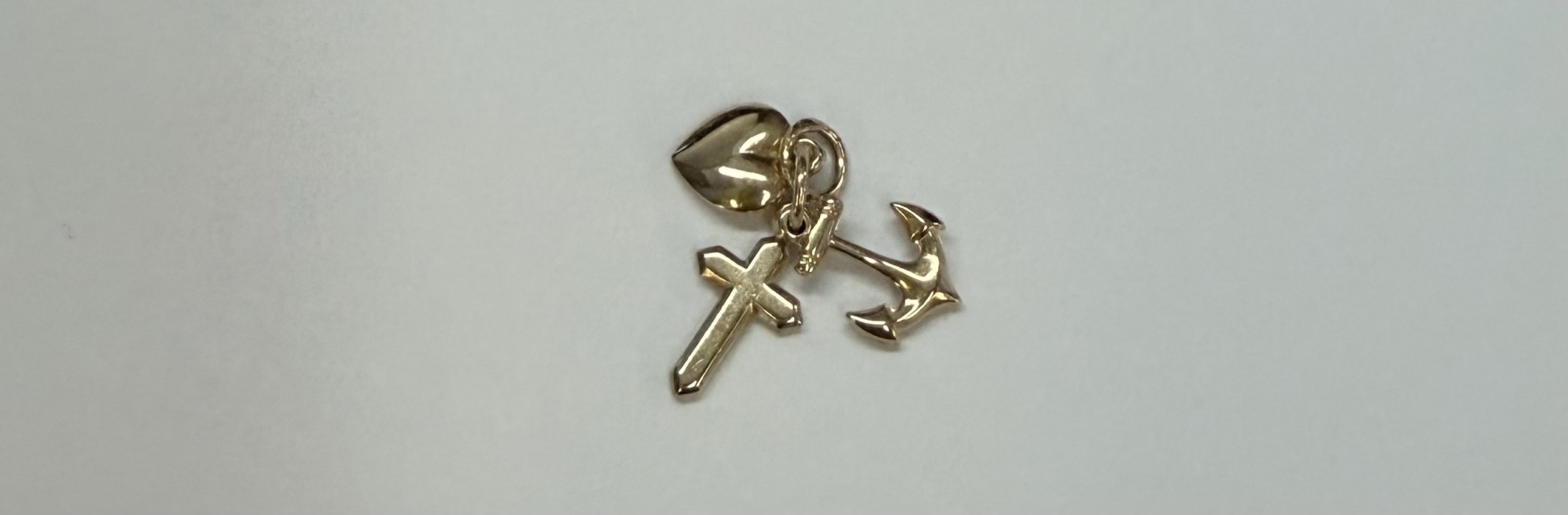 Vintage 14k yellow gold Faith, Hope, and Charity charm. This piece has an entire weight of 1.5 grams.