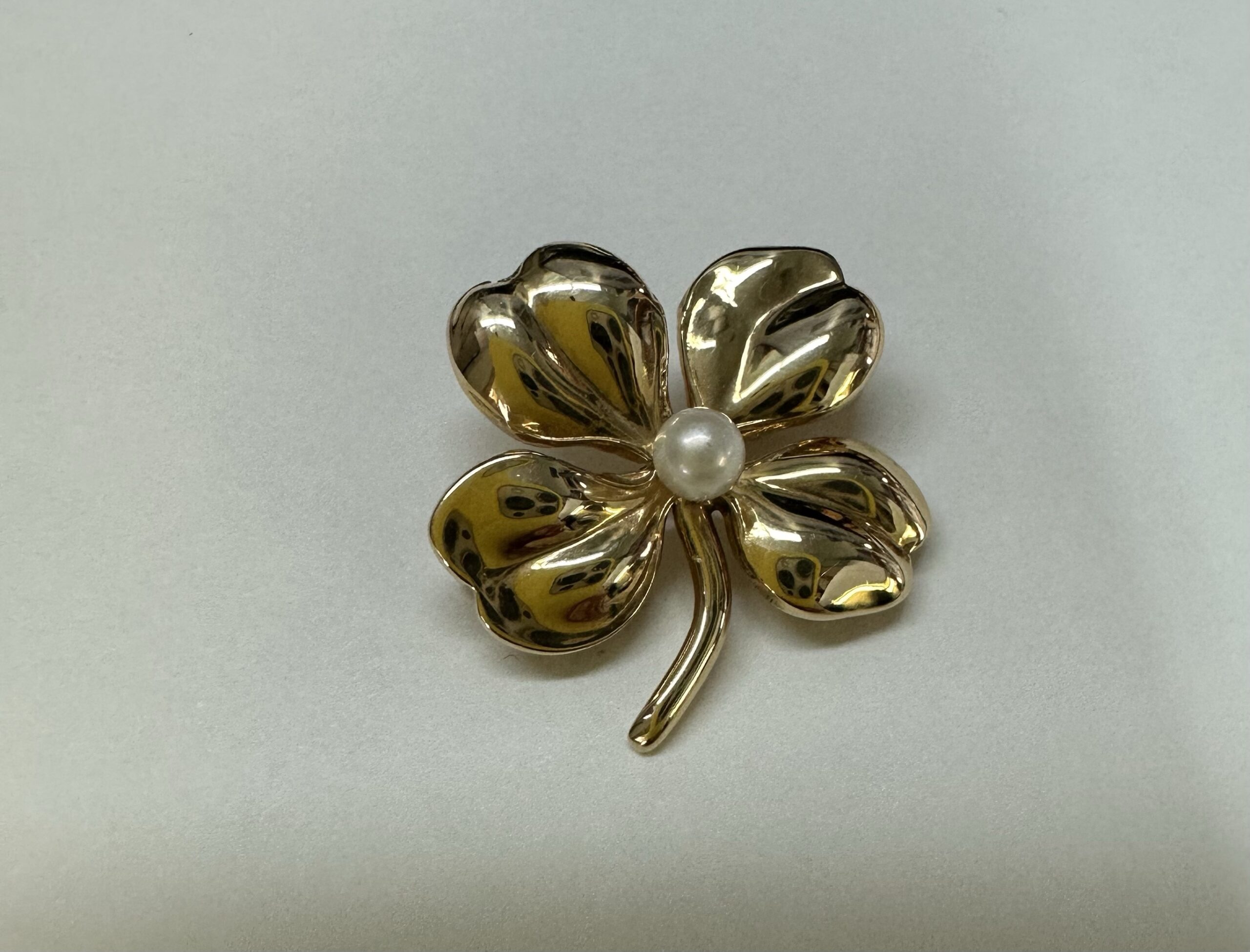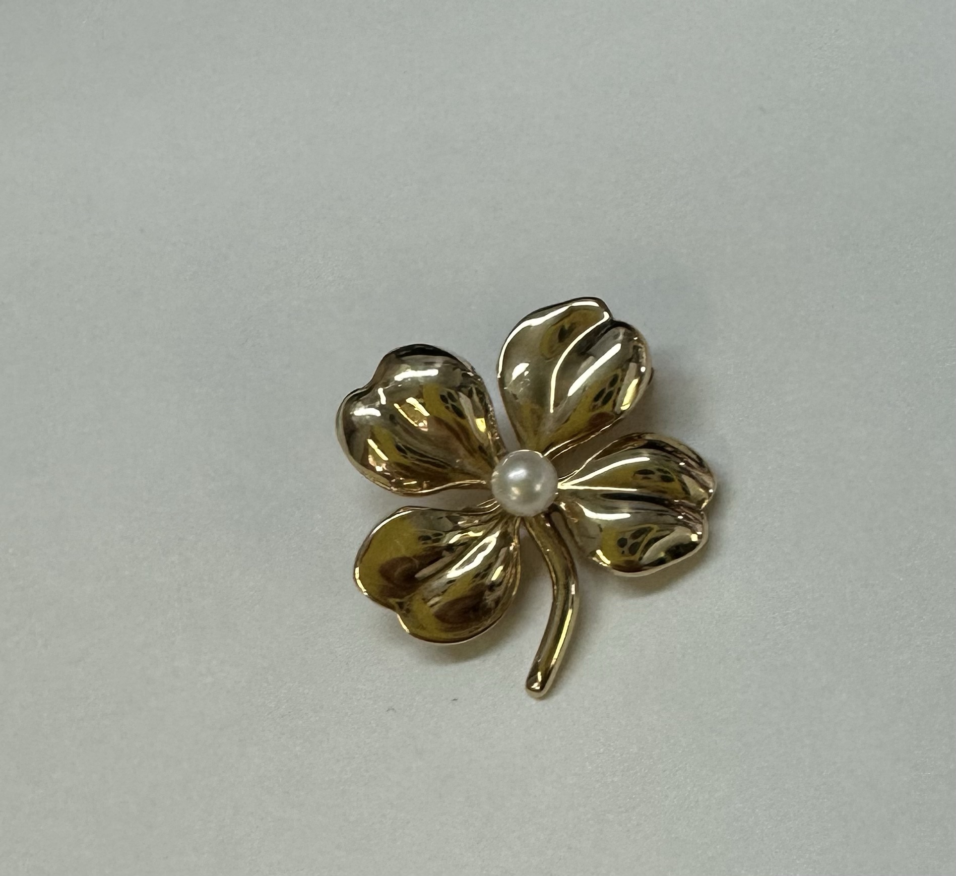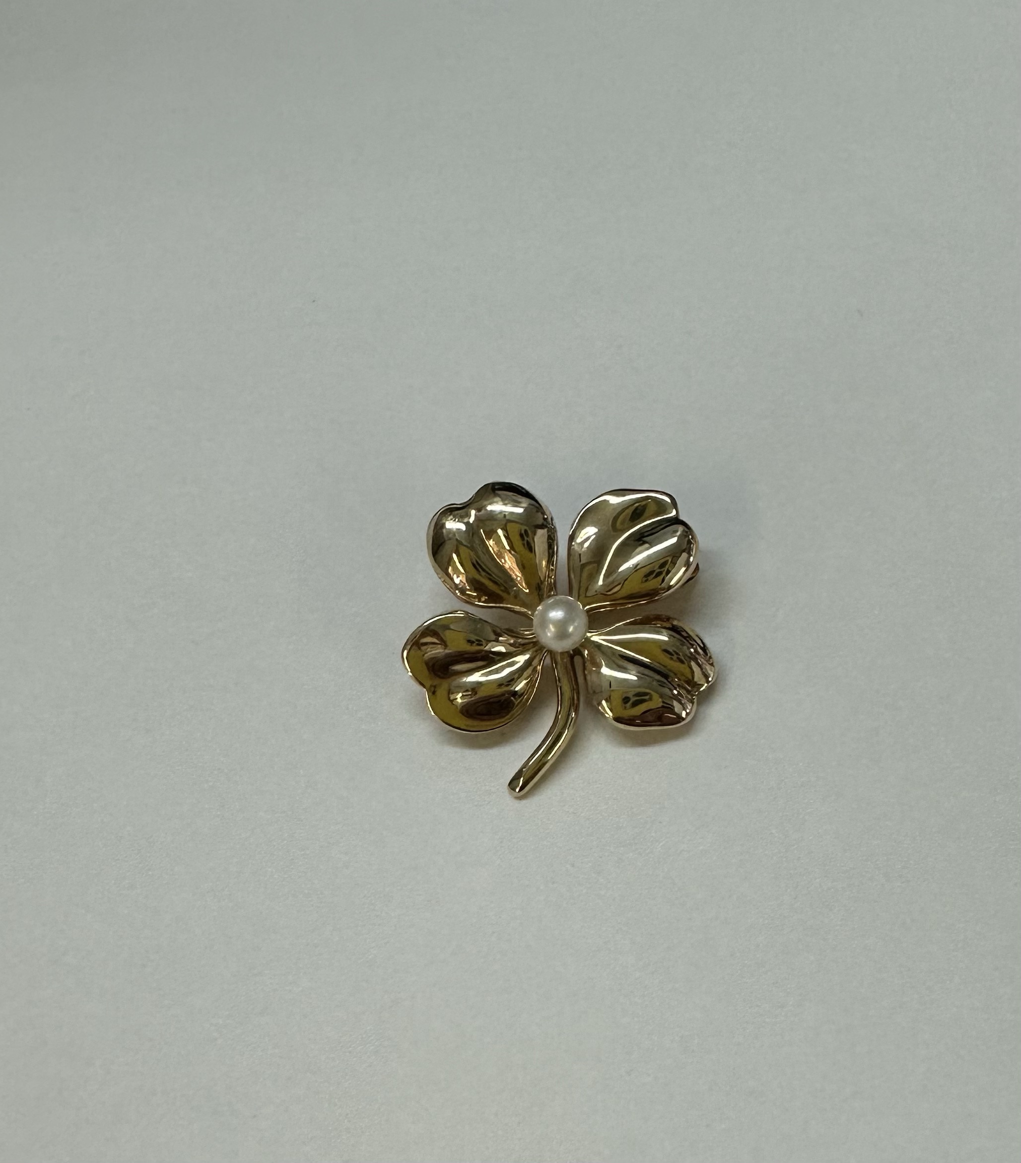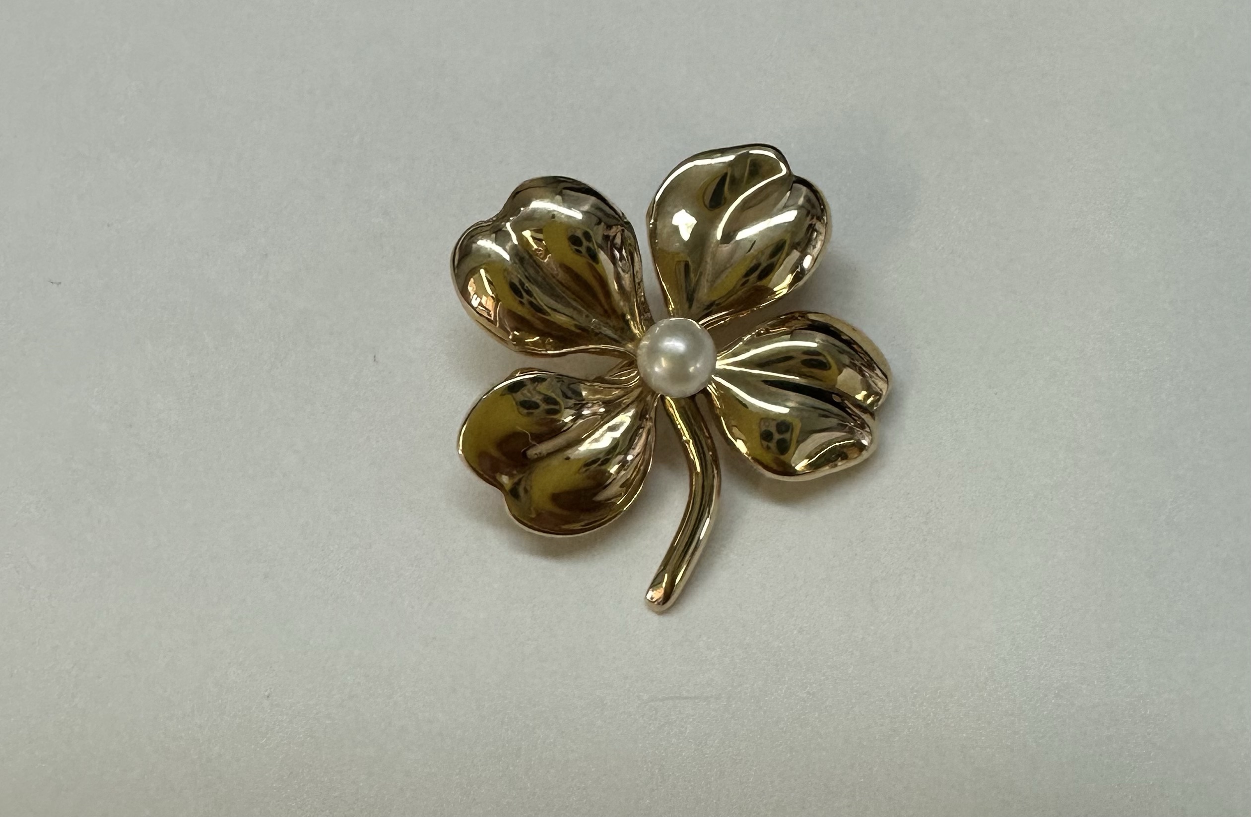 Vintage 14k yellow gold four left clover brooch with seed pearl accent, 3.1 grams.