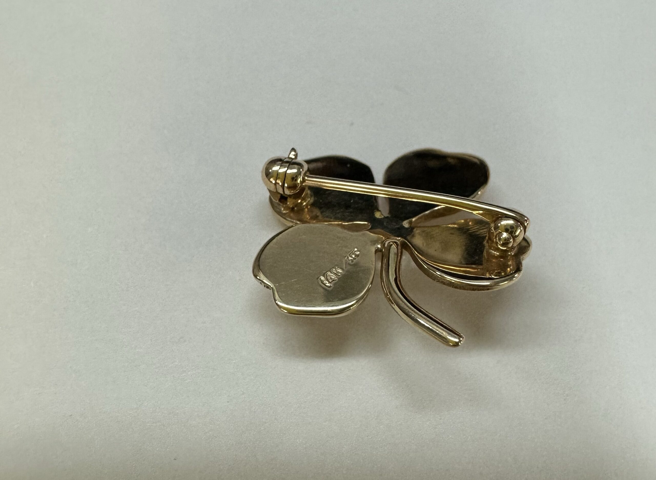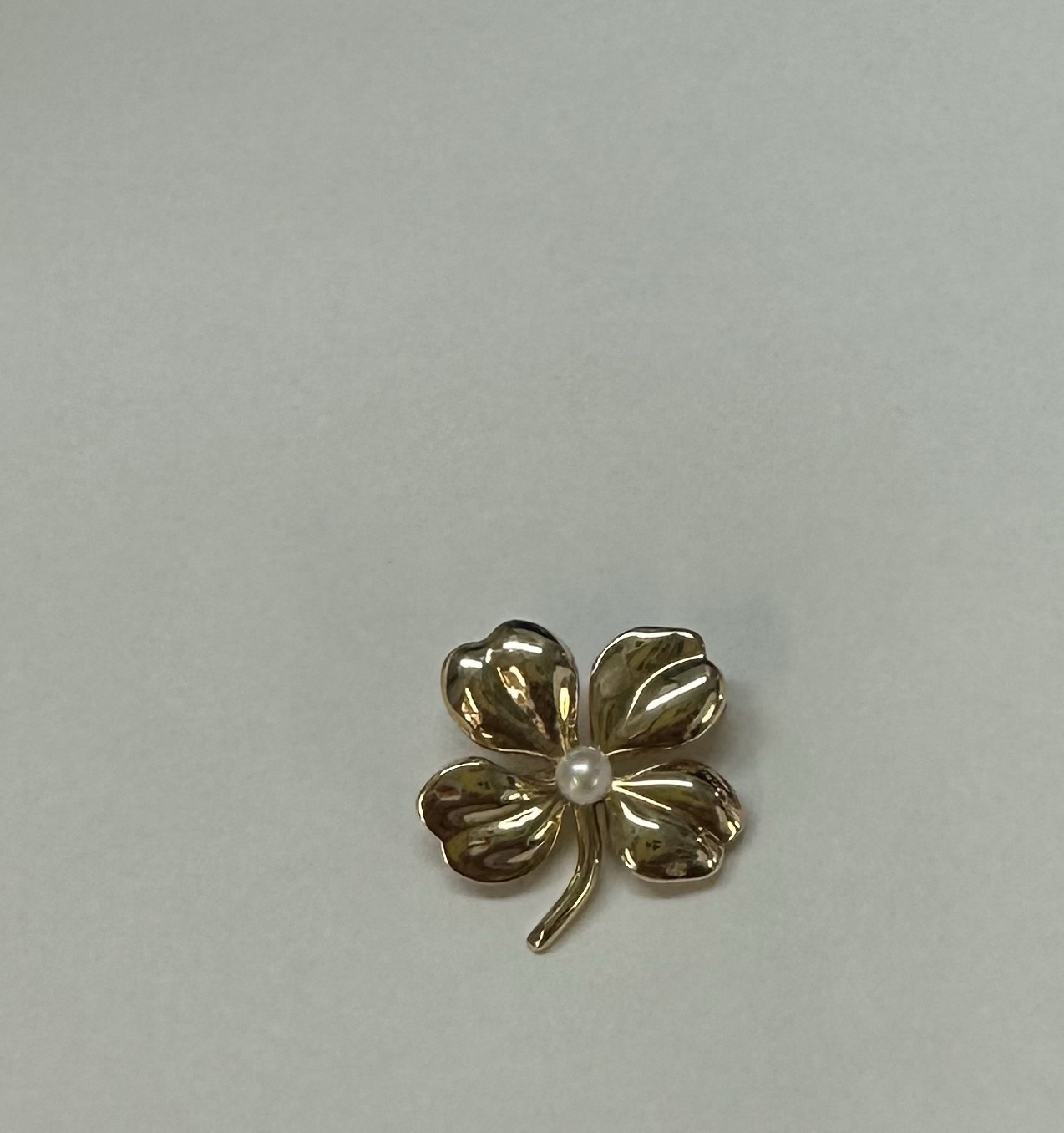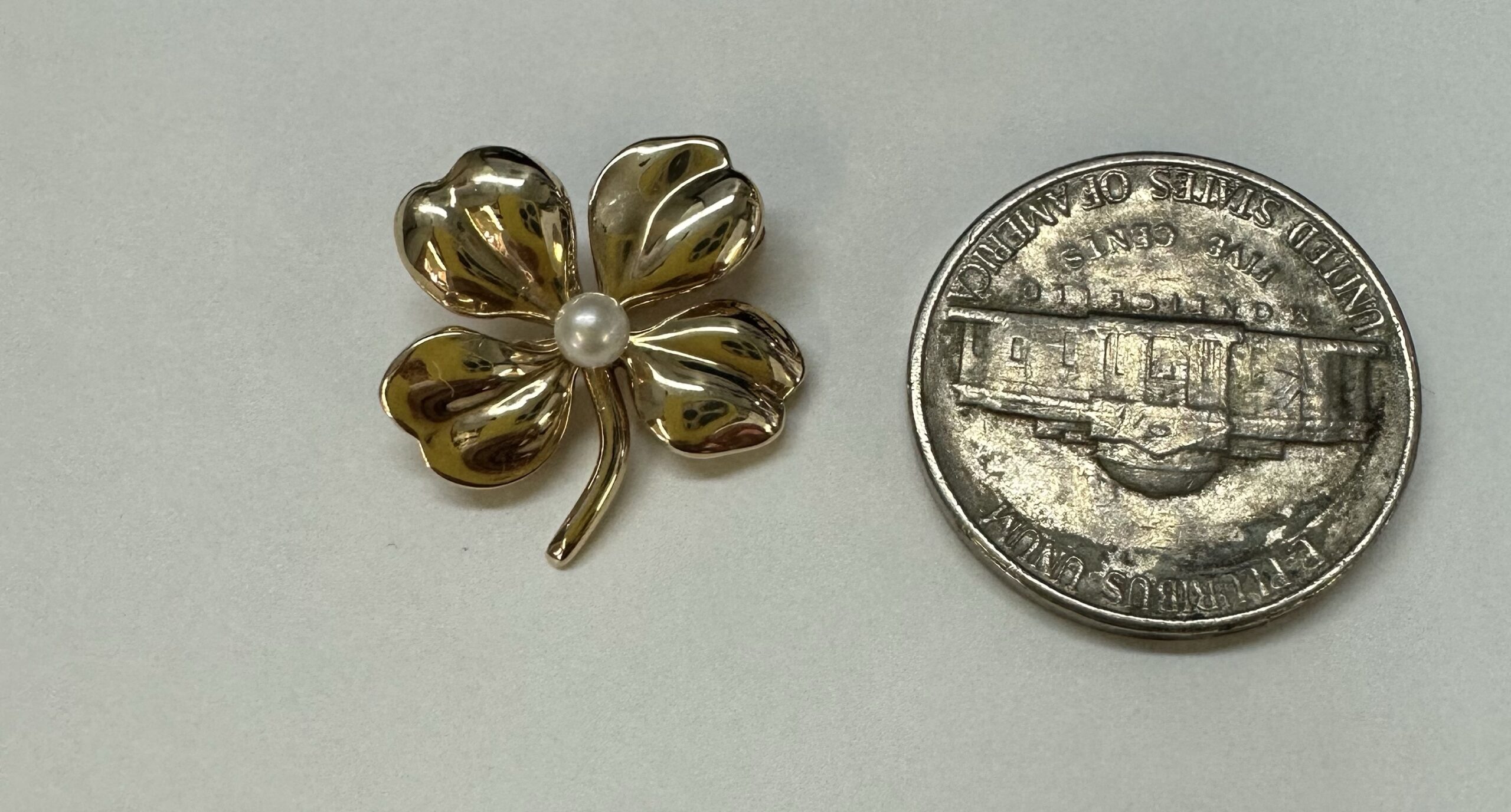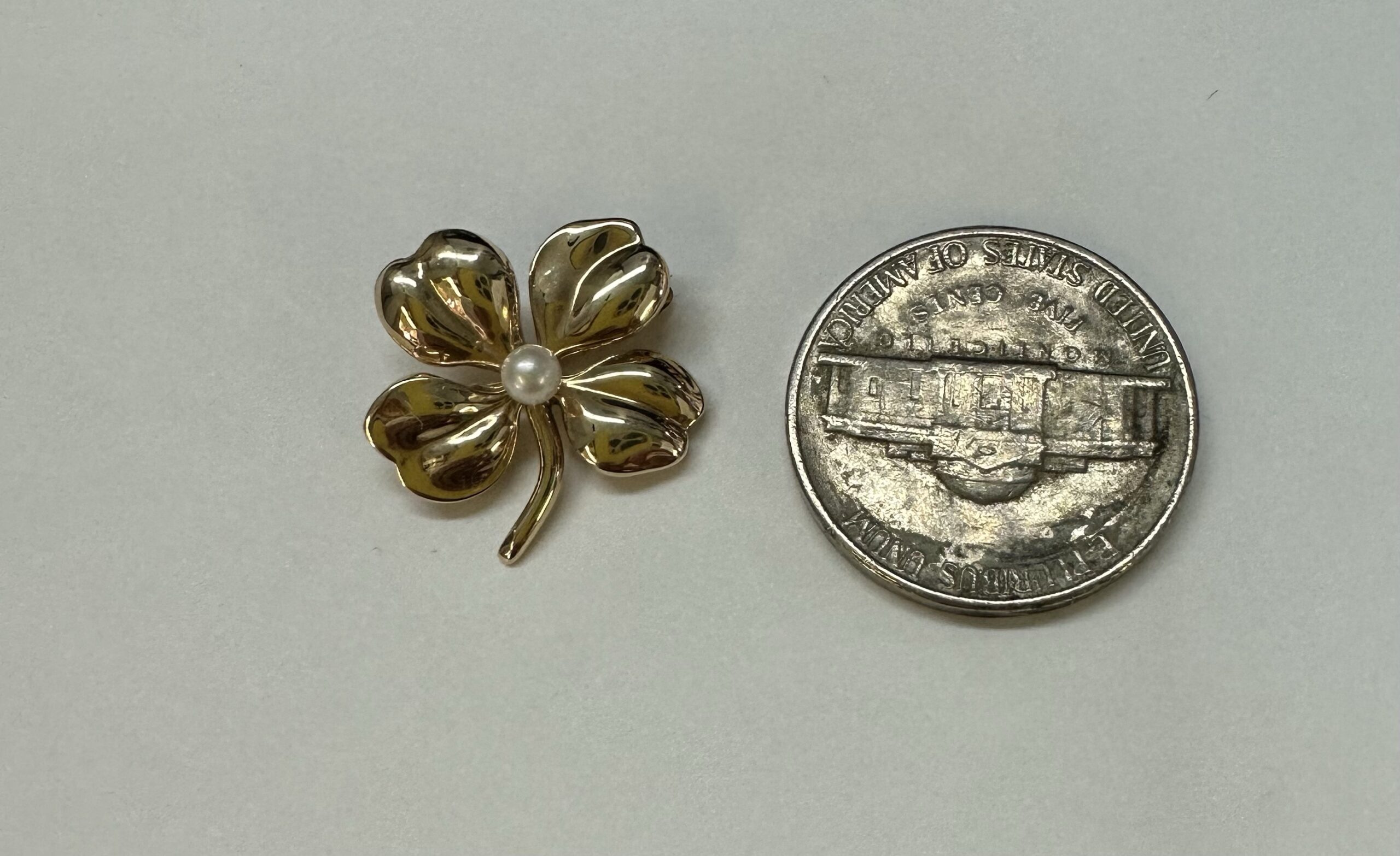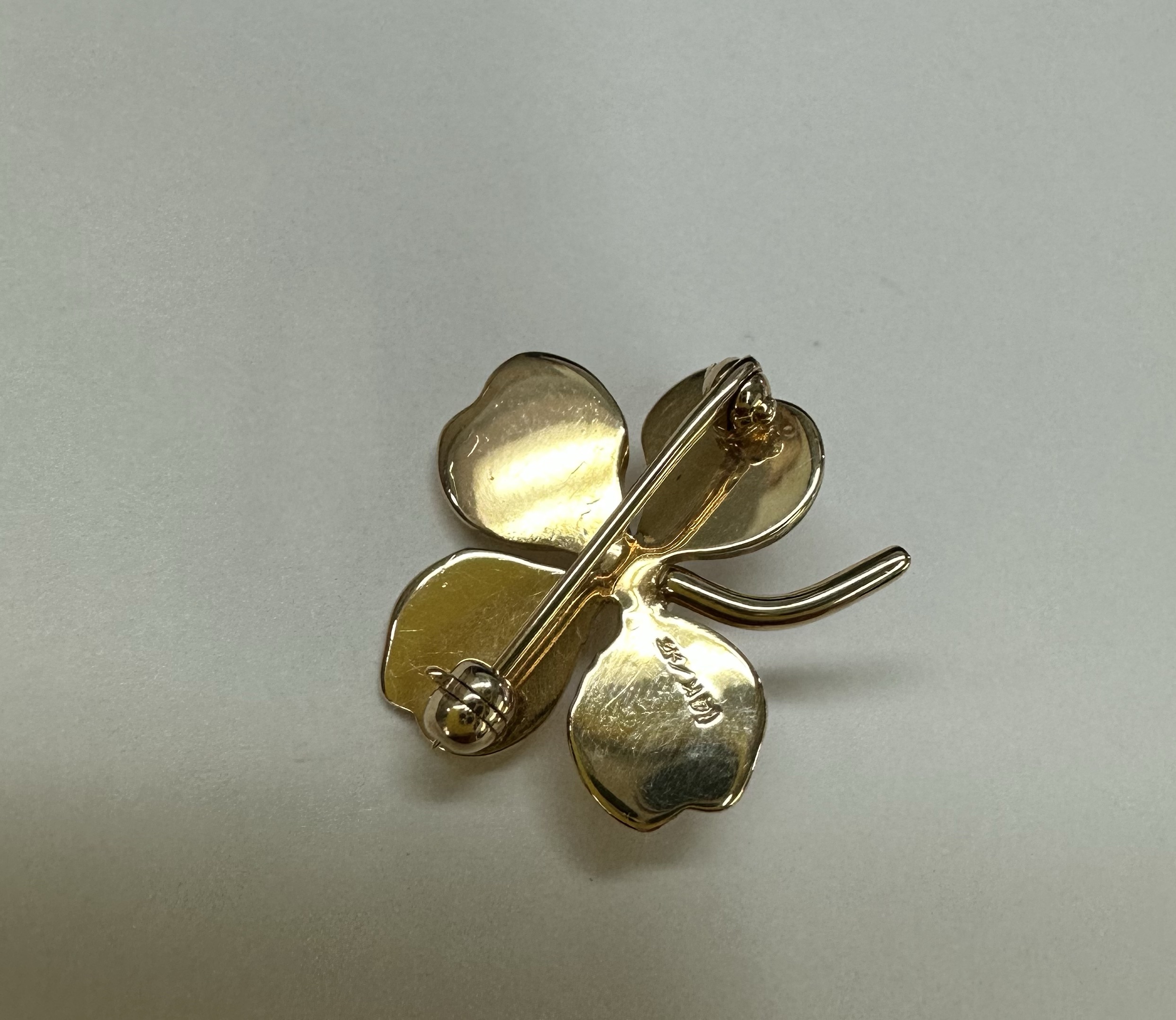 Vintage 14k yellow gold four left clover brooch with seed pearl accent, 3.1 grams.