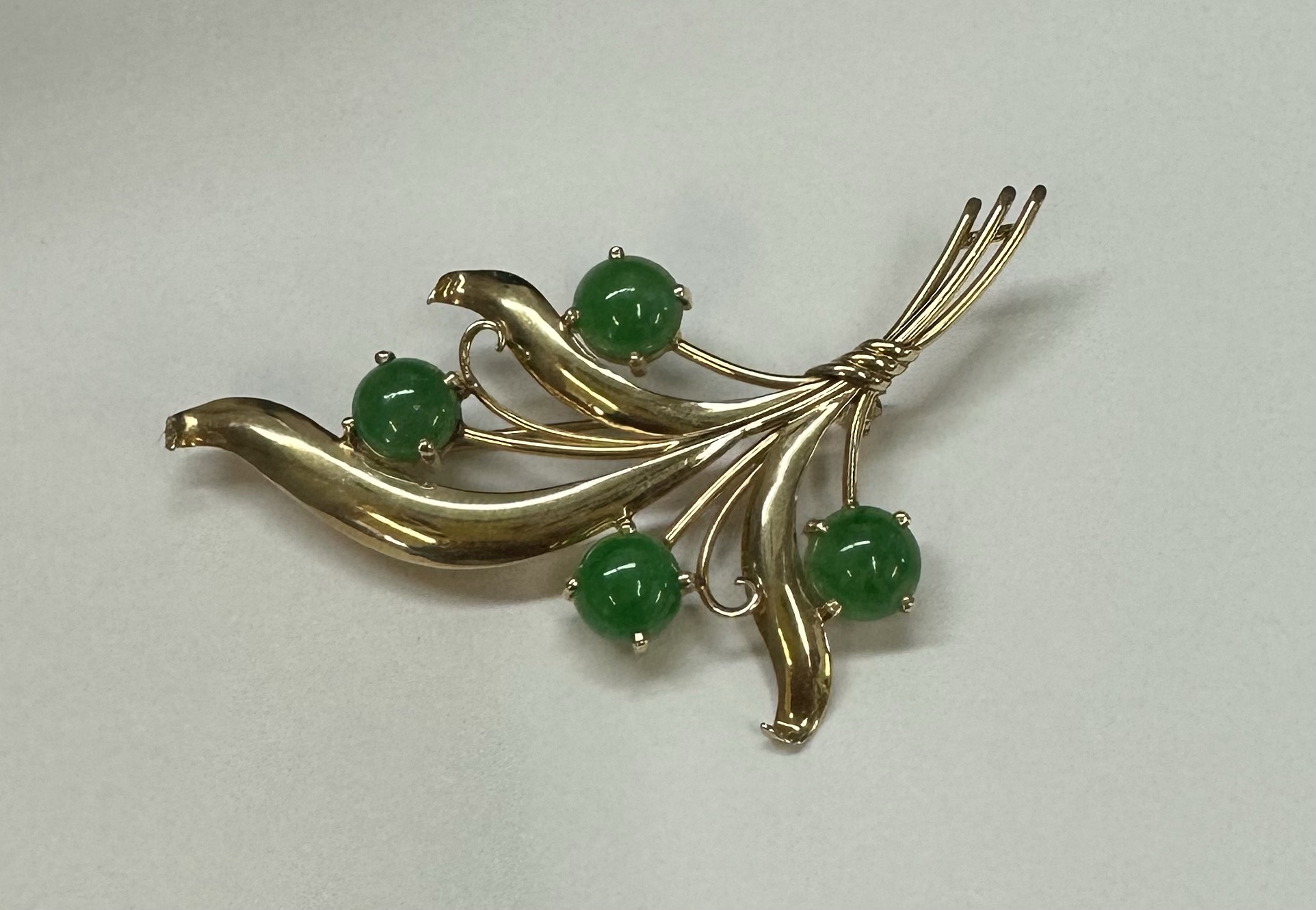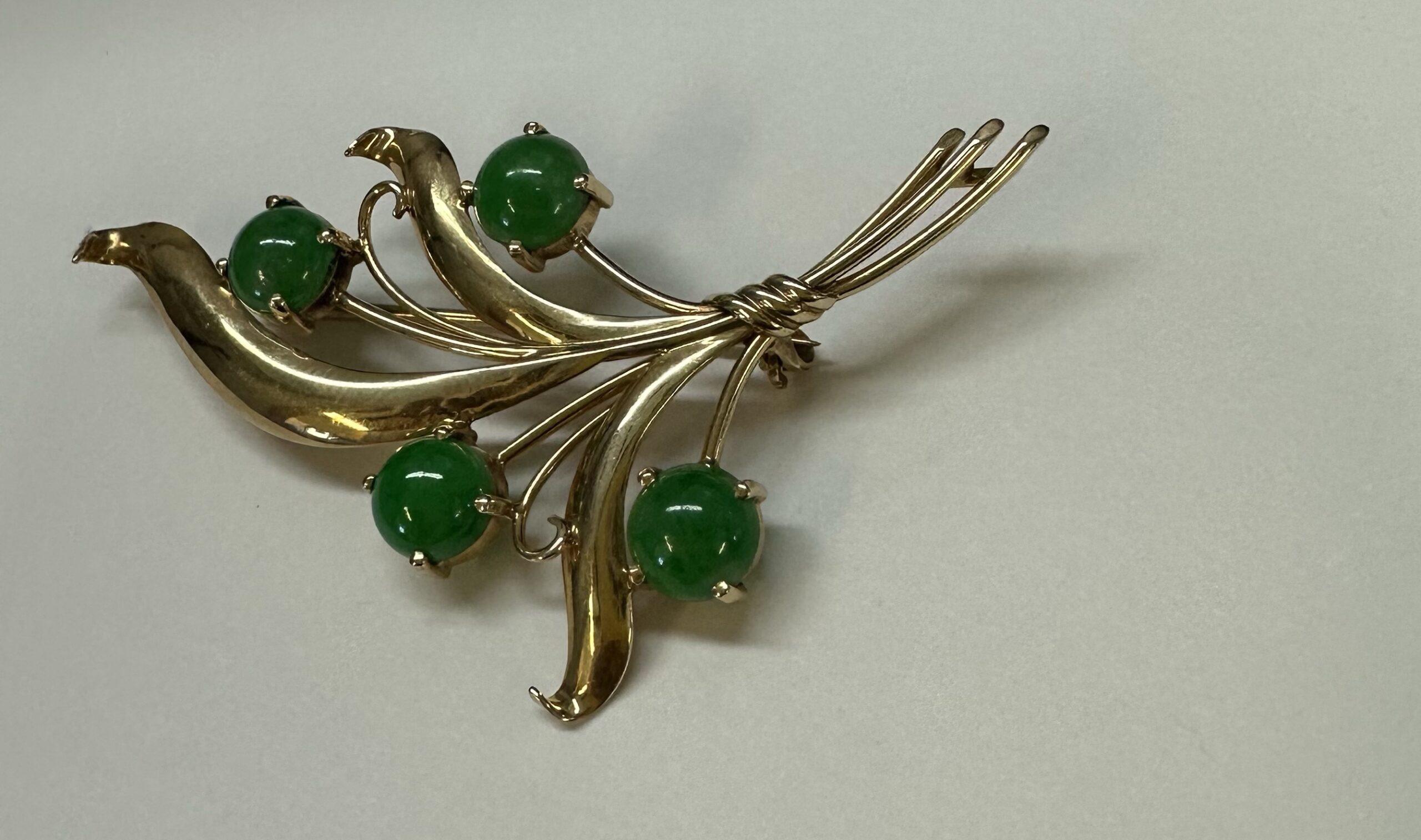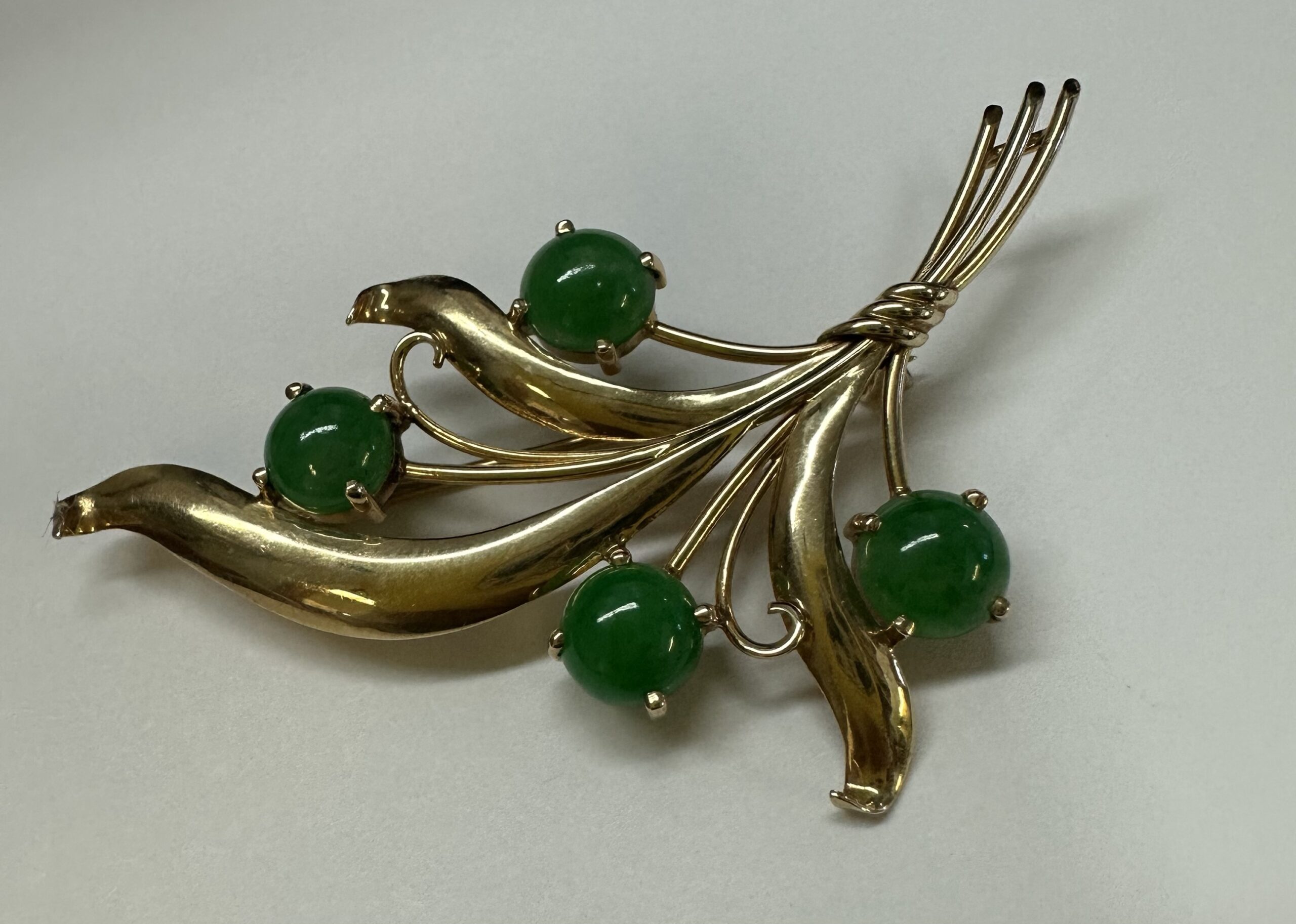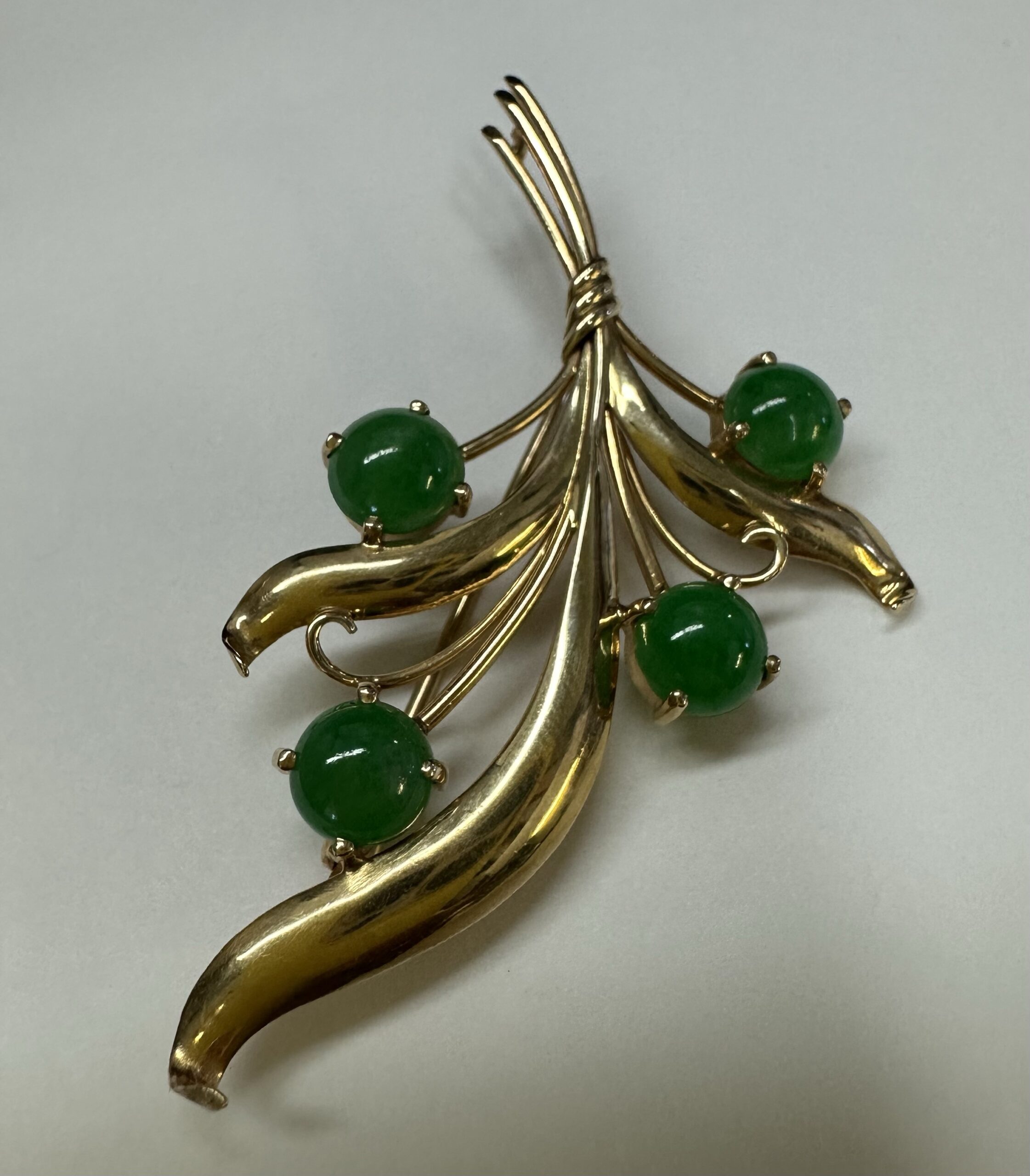 Vintage 14k yellow gold Jadeite brooch of a spray motif, consisting of four 6 mm round genuine Jadeite gemstones. This brooch has an entire weight of 5.6 grams. This brooch measures 2.5″ in length and approximately 1″ in width.