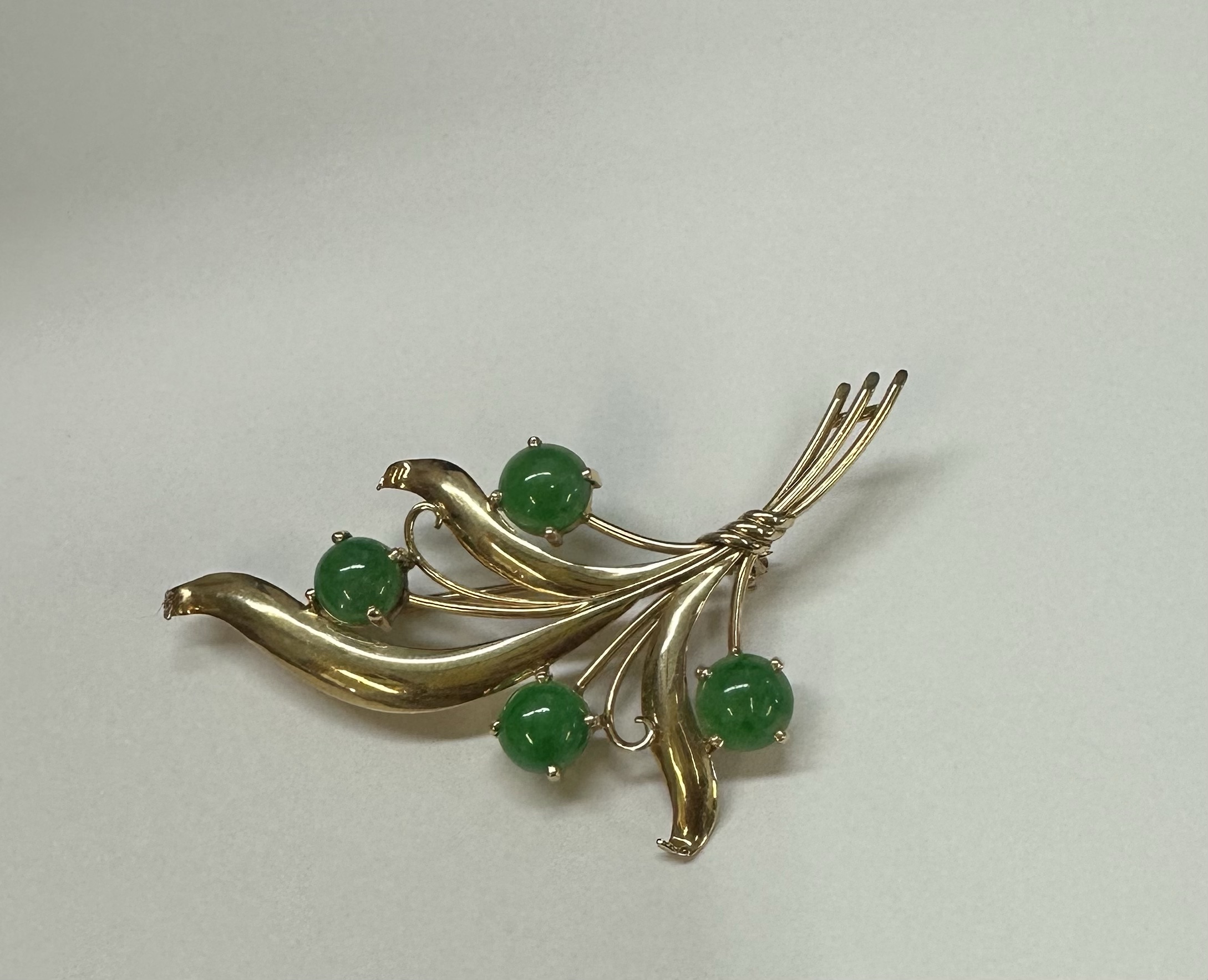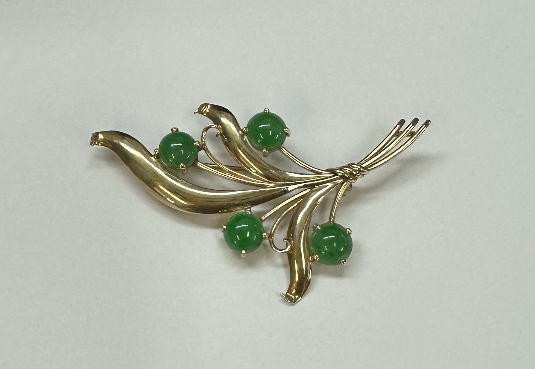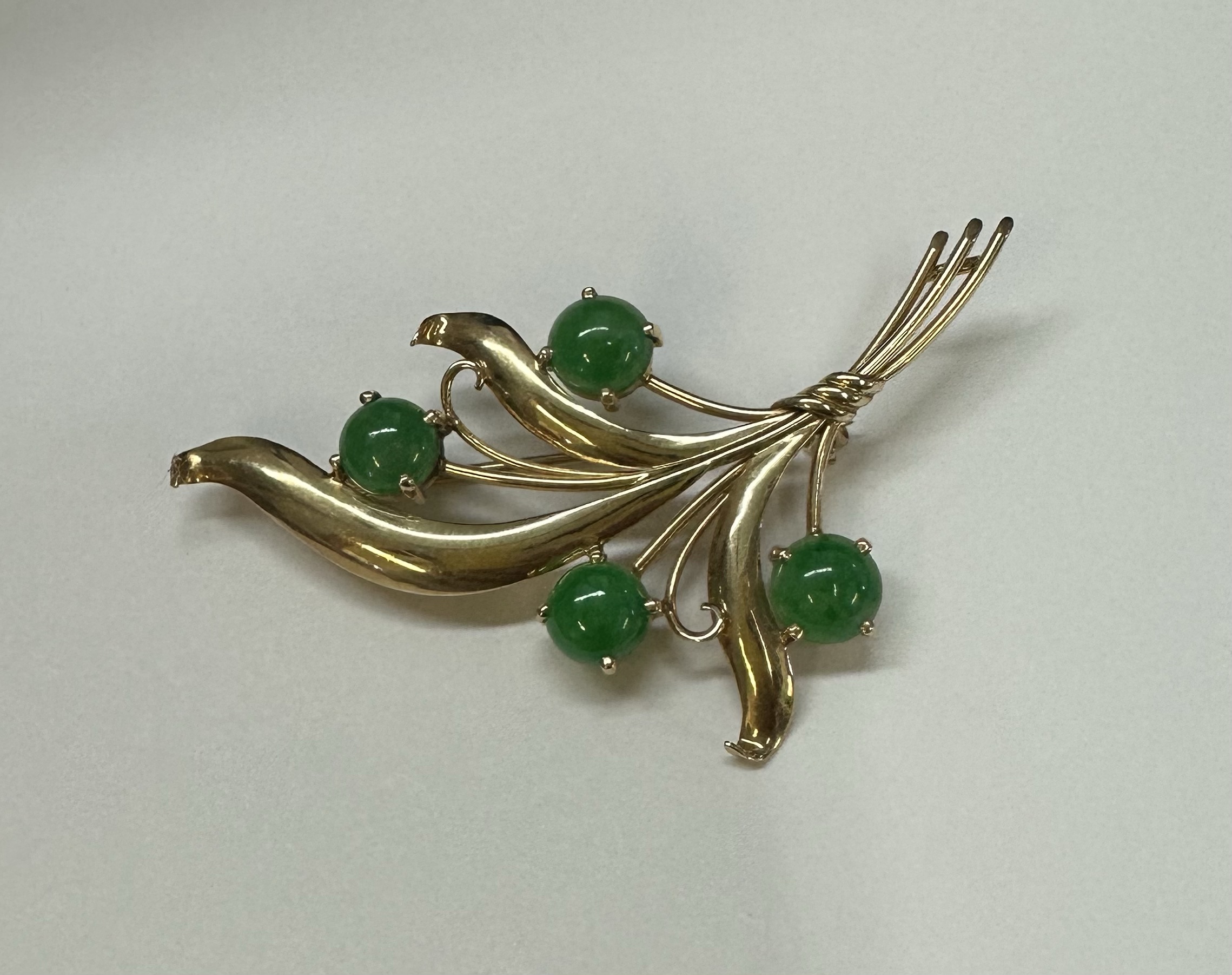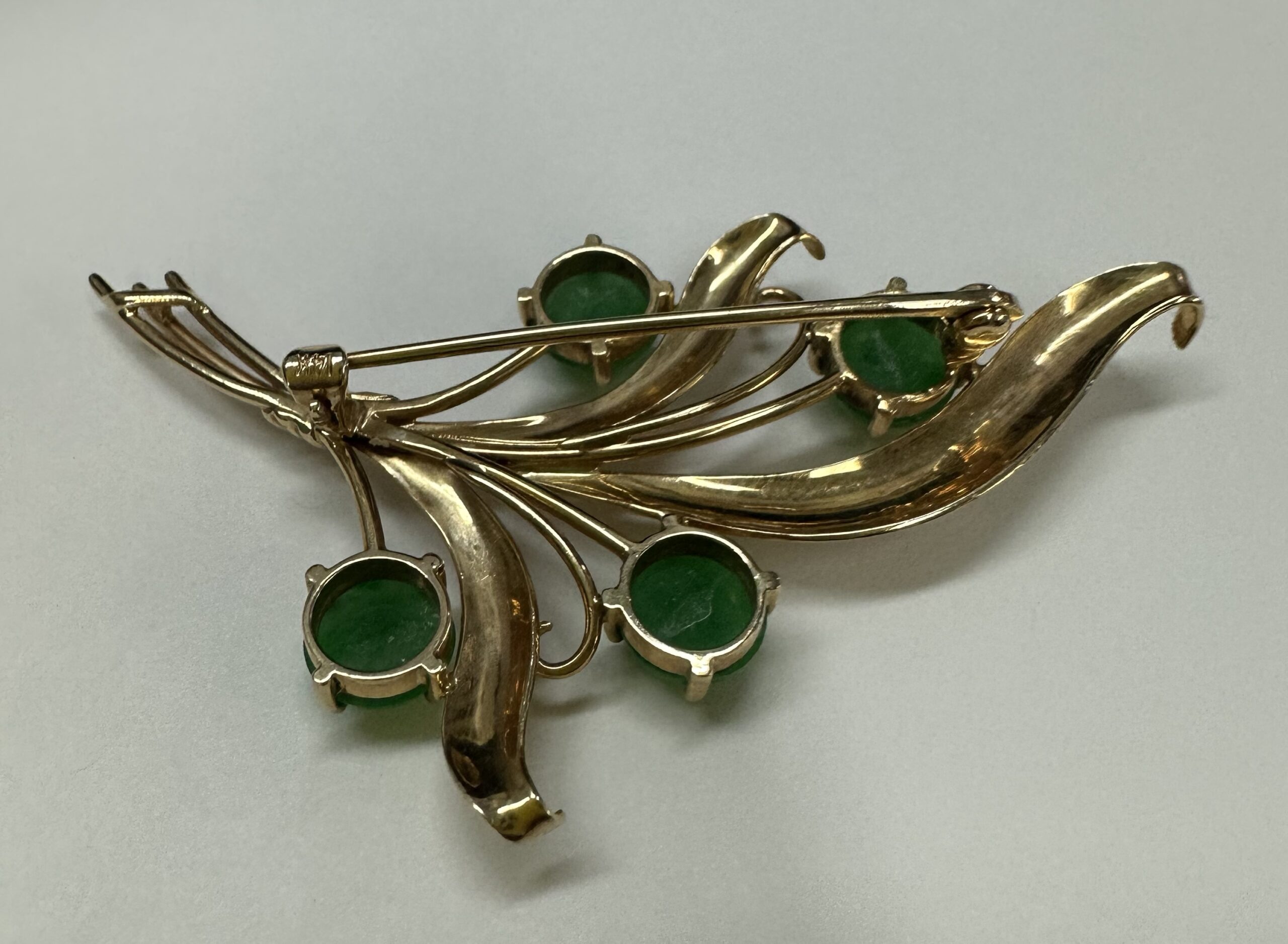 Vintage 14k yellow gold Jadeite brooch of a spray motif, consisting of four 6 mm round genuine Jadeite gemstones. This brooch has an entire weight of 5.6 grams. This brooch measures 2.5″ in length and approximately 1″ in width.