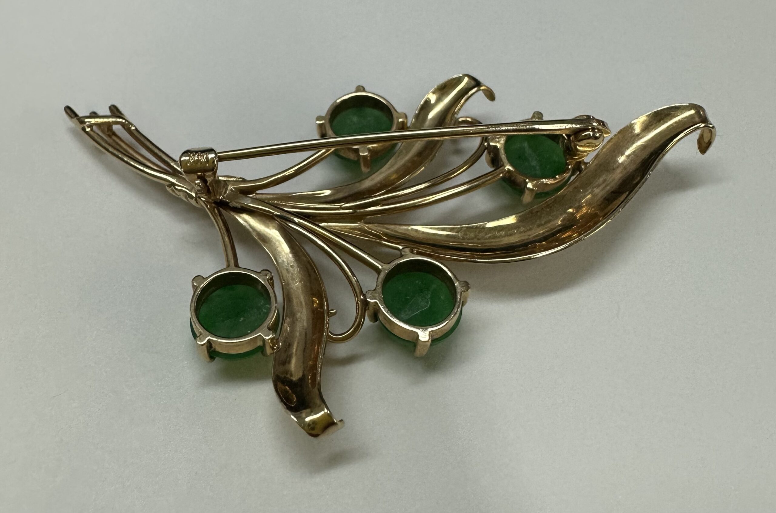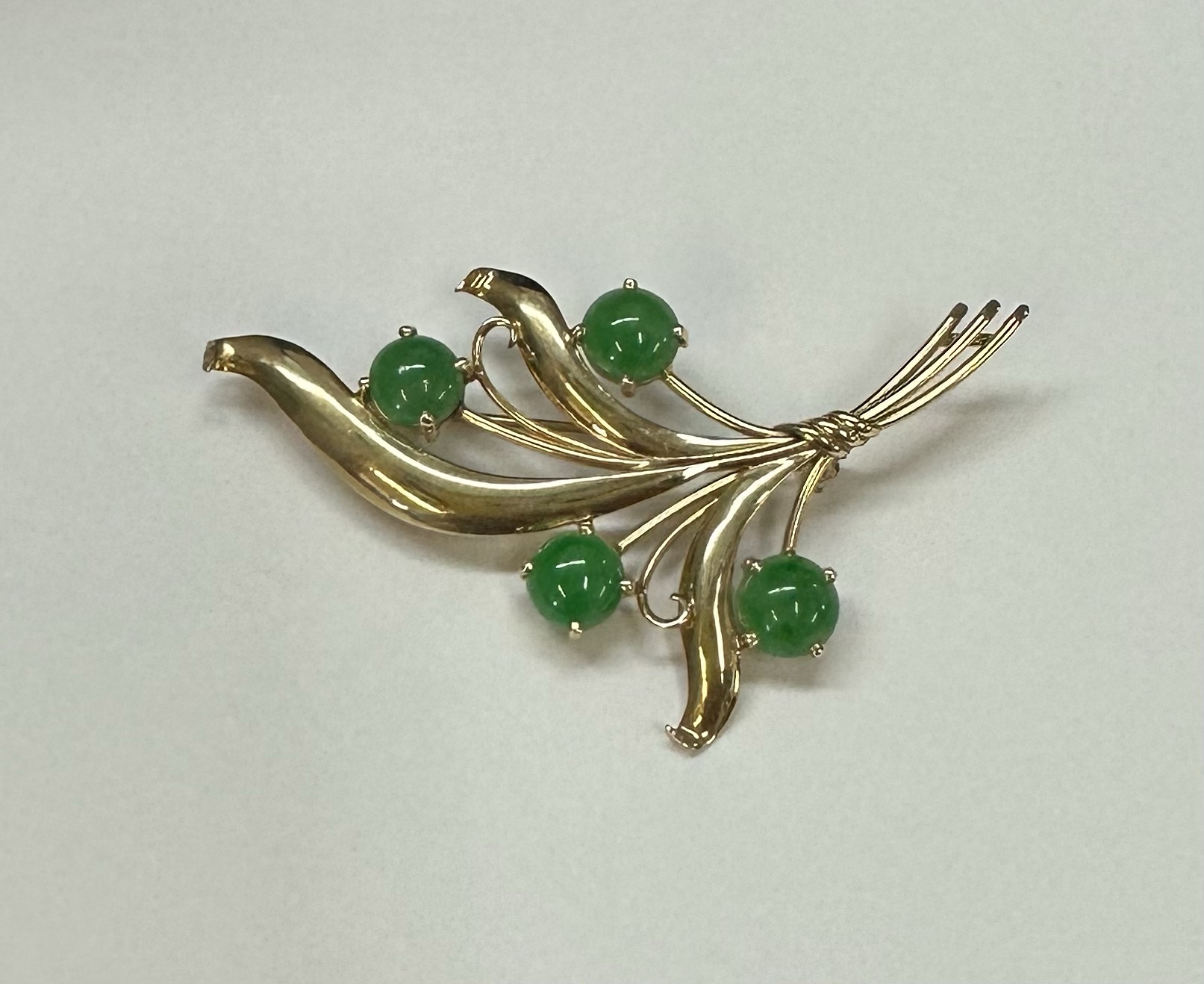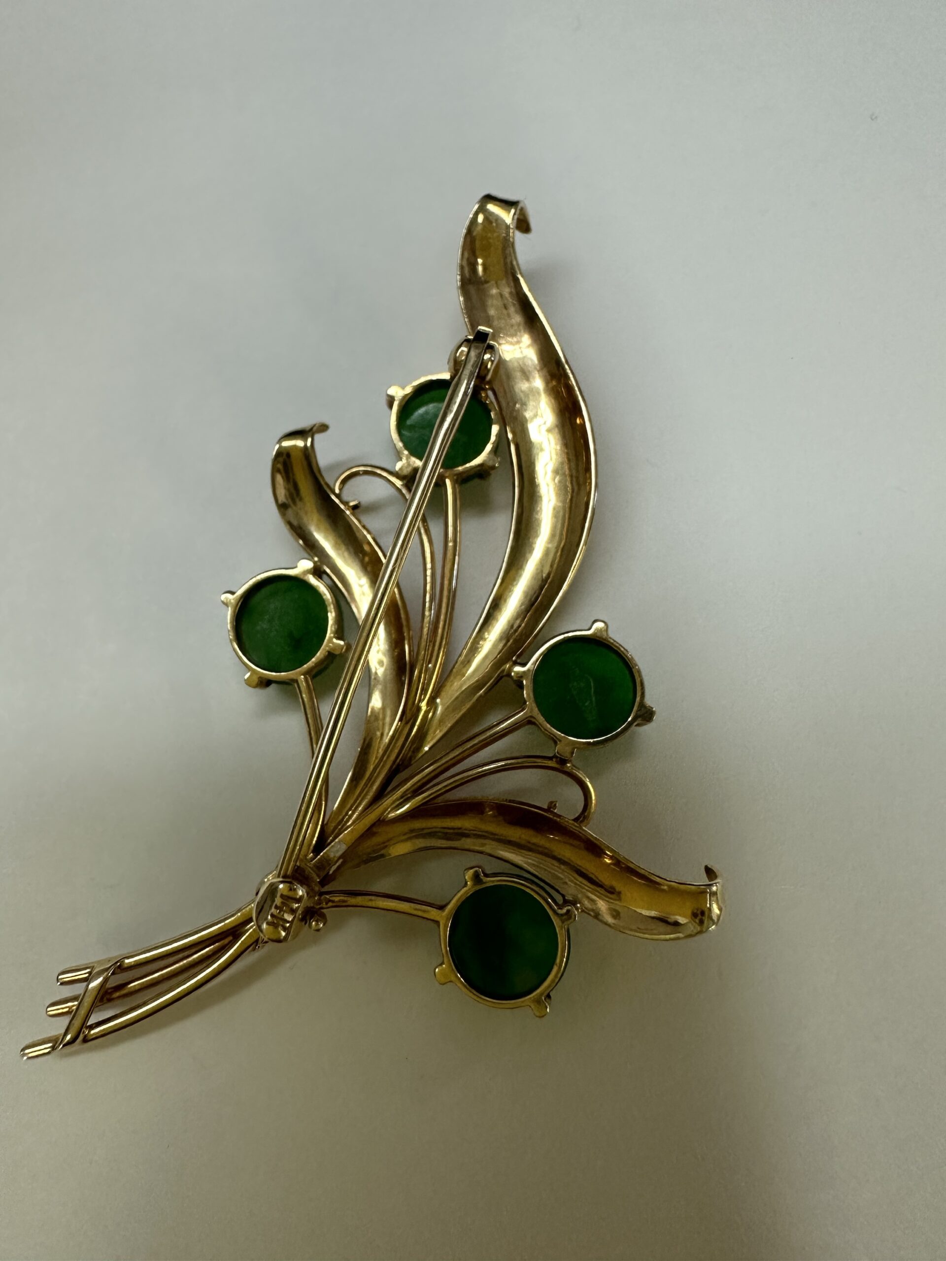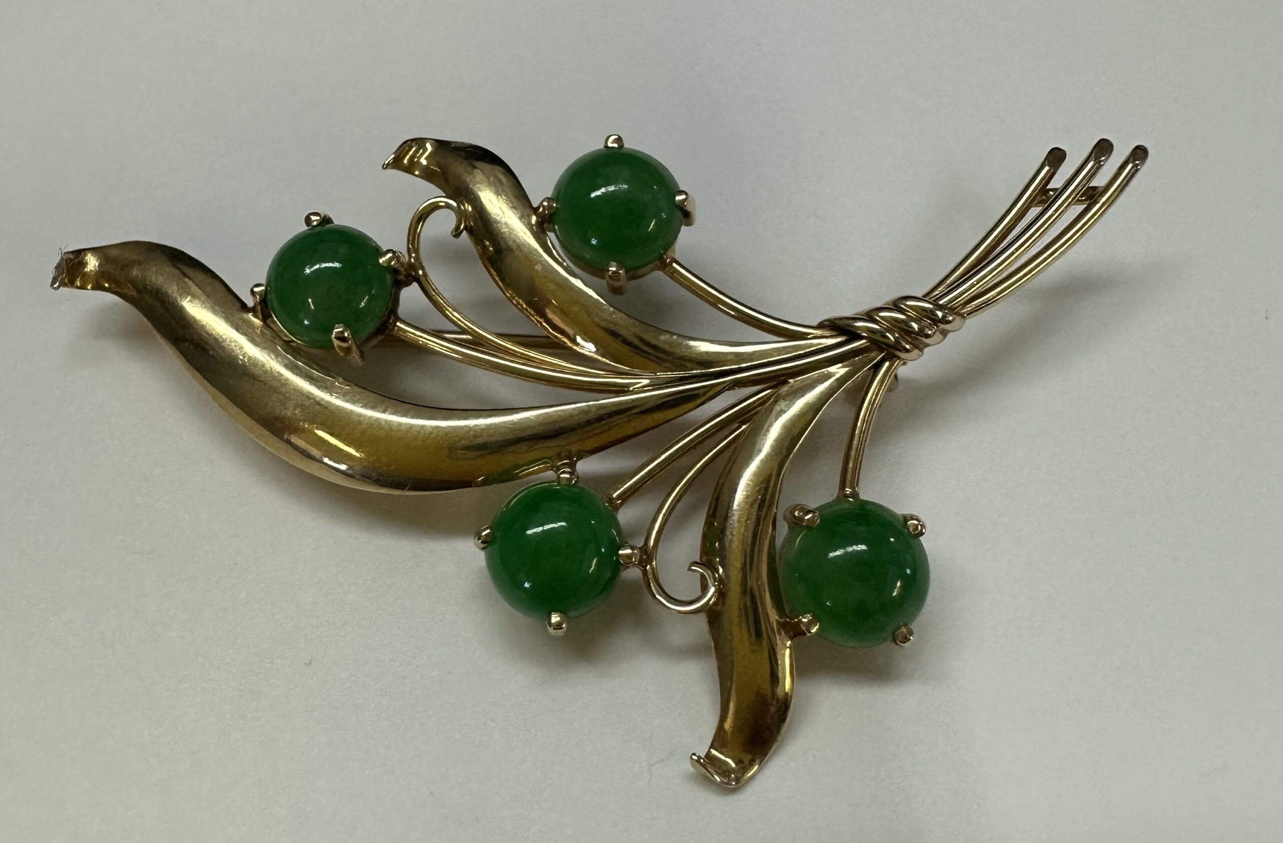 Vintage 14k yellow gold Jadeite brooch of a spray motif, consisting of four 6 mm round genuine Jadeite gemstones. This brooch has an entire weight of 5.6 grams. This brooch measures 2.5″ in length and approximately 1″ in width.