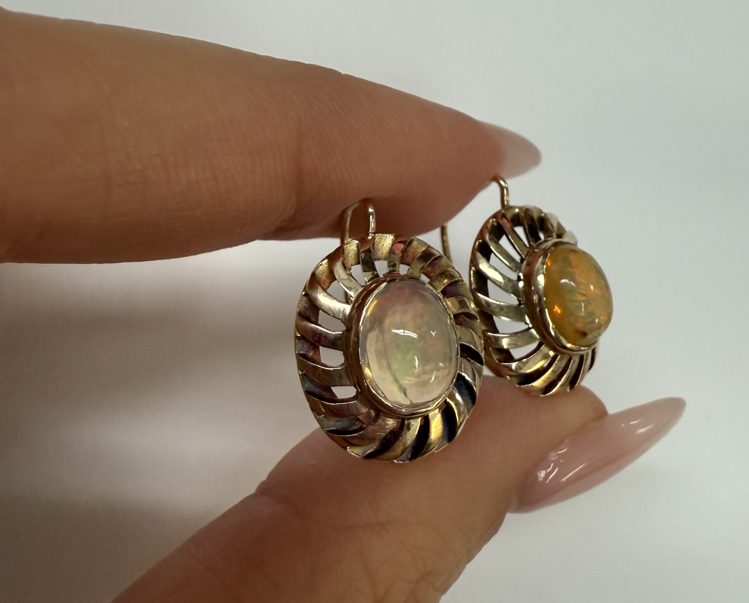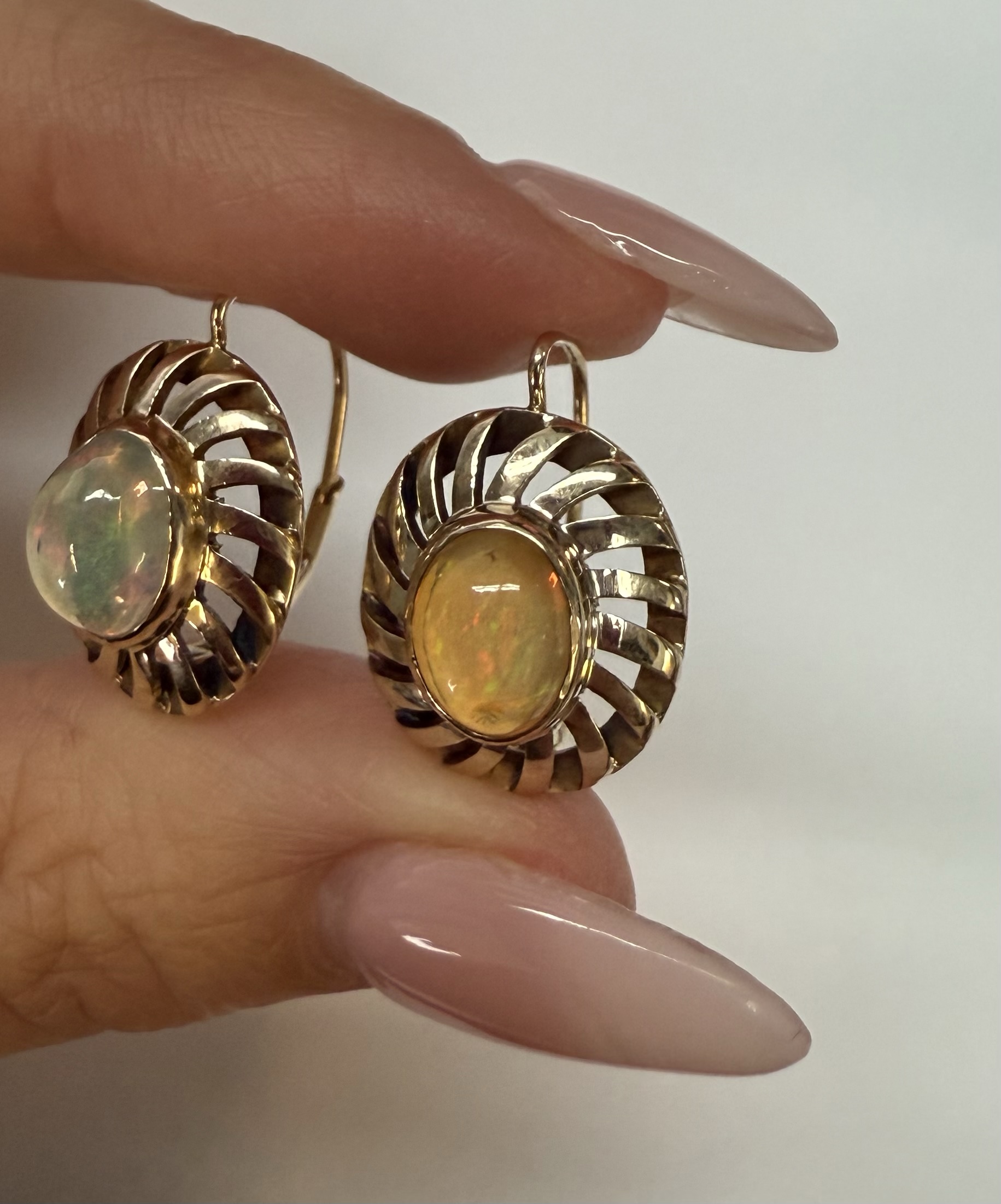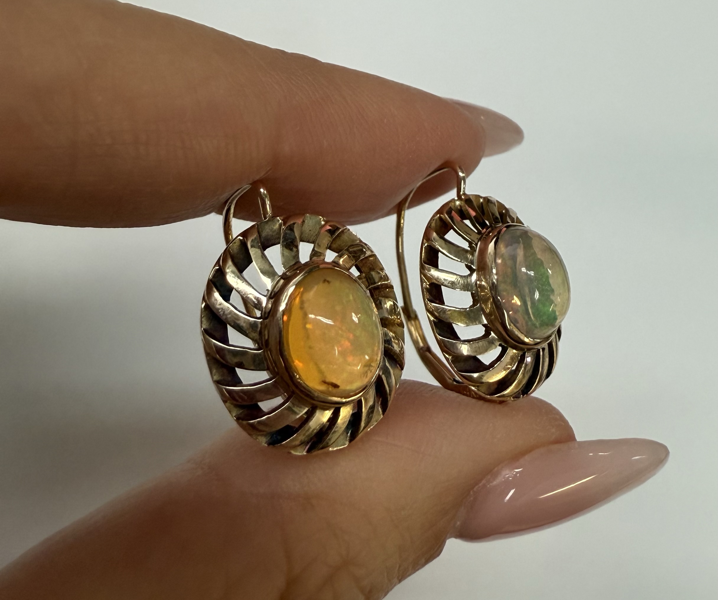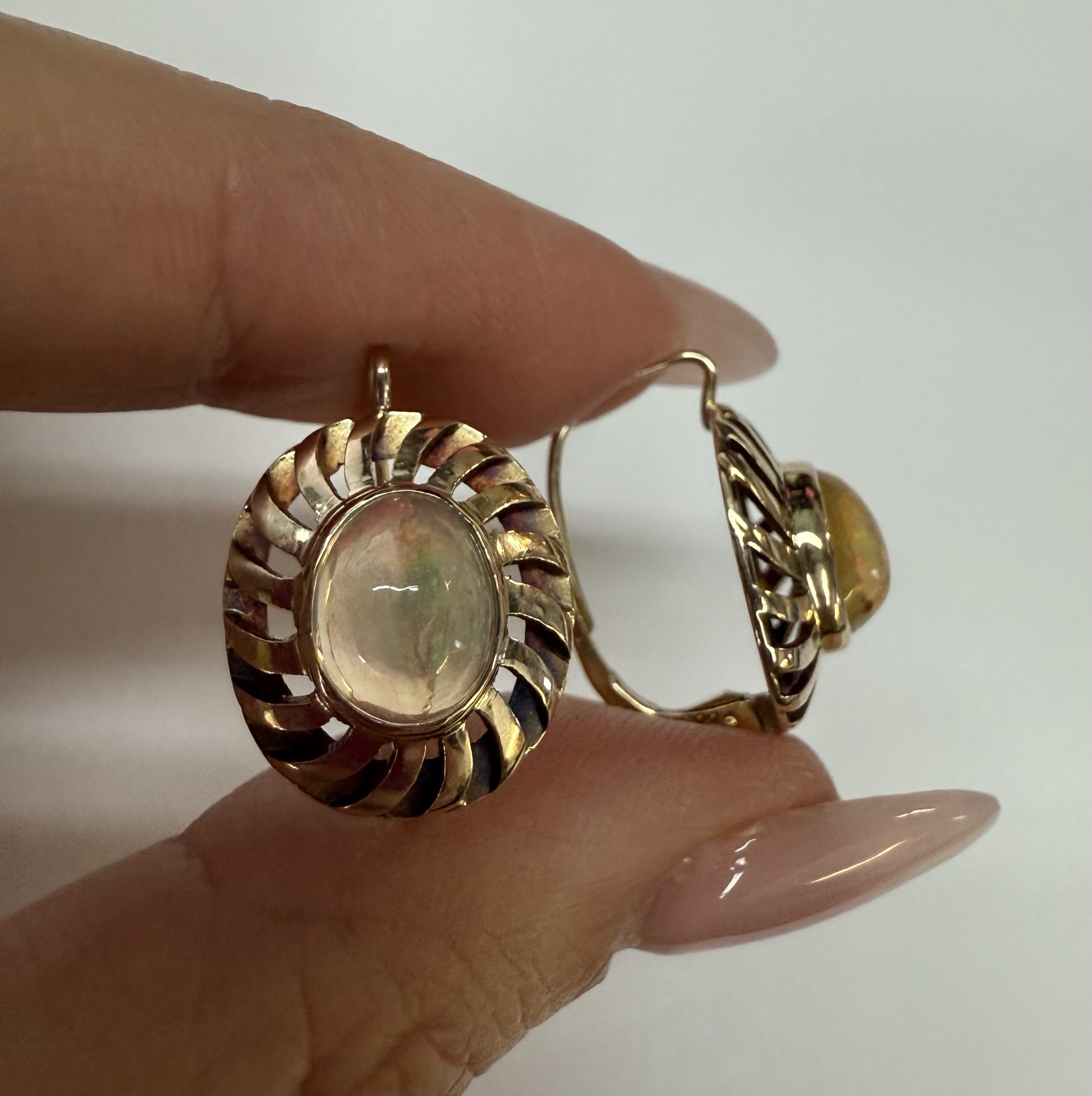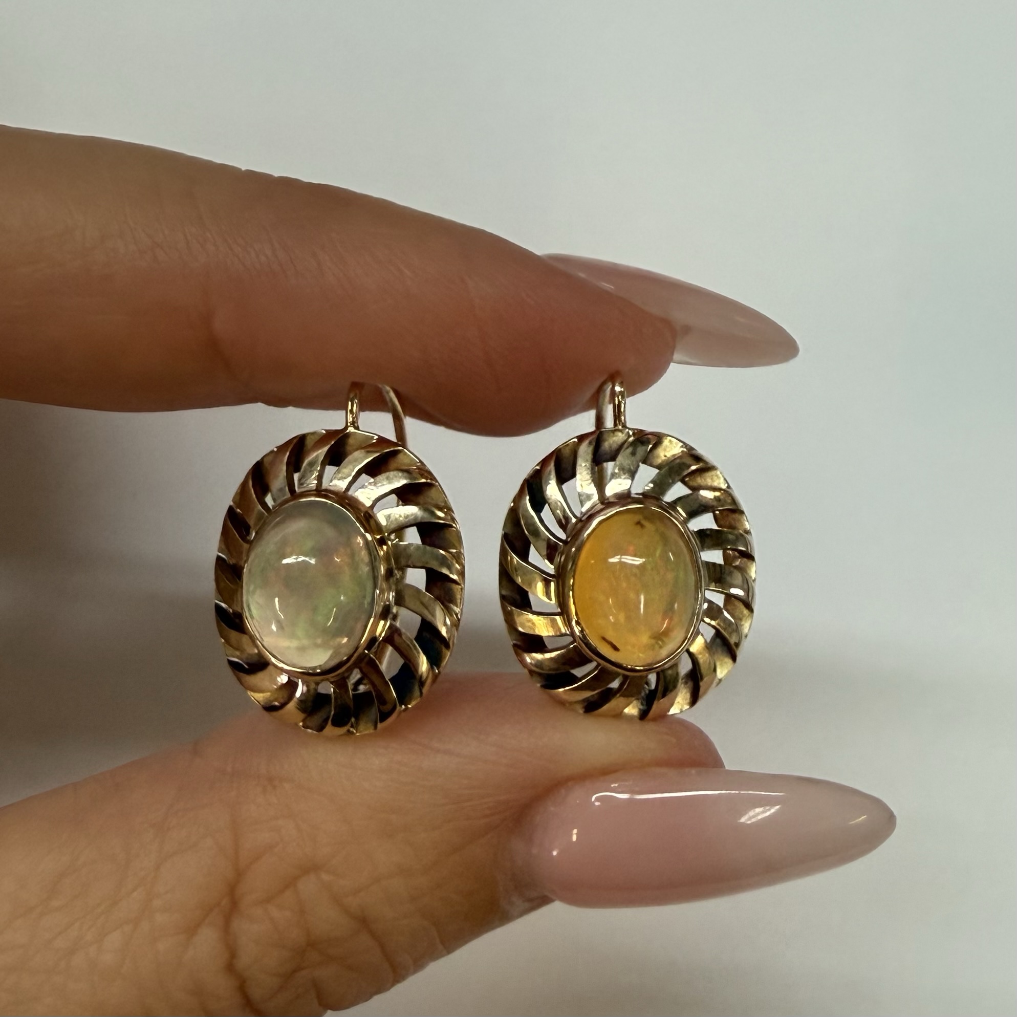 One-of-a-kind vintage 14k yellow gold genuine bezel set oval shaped, cabochon cut Opal lever back earrings with openwork frames. These earrings have an entire weight of 3.8 grams. The Opals measure approximately 8 x 6 mm in size.