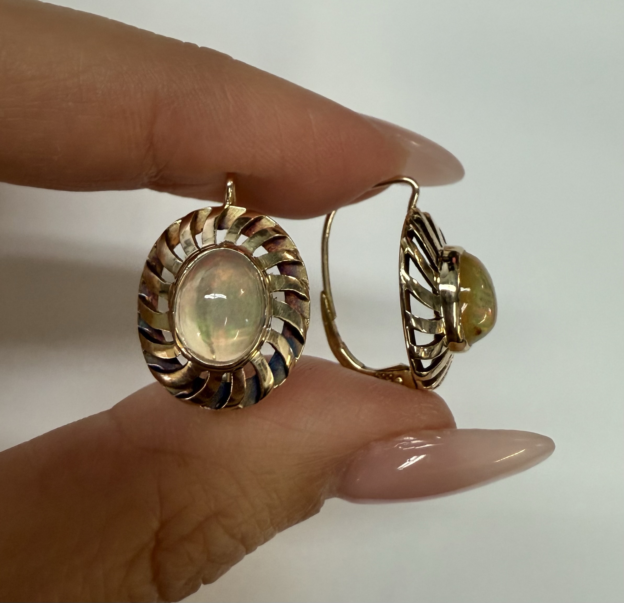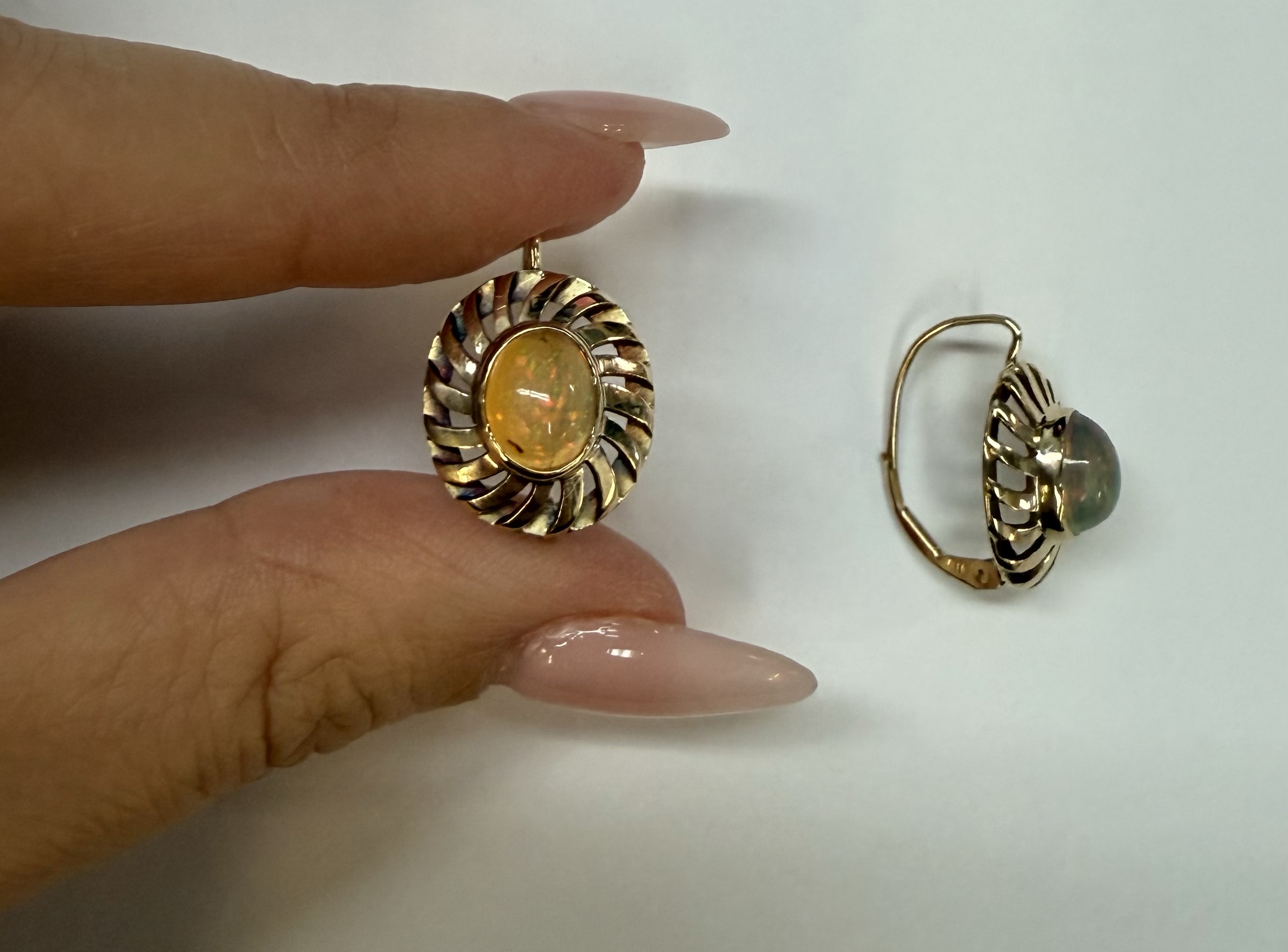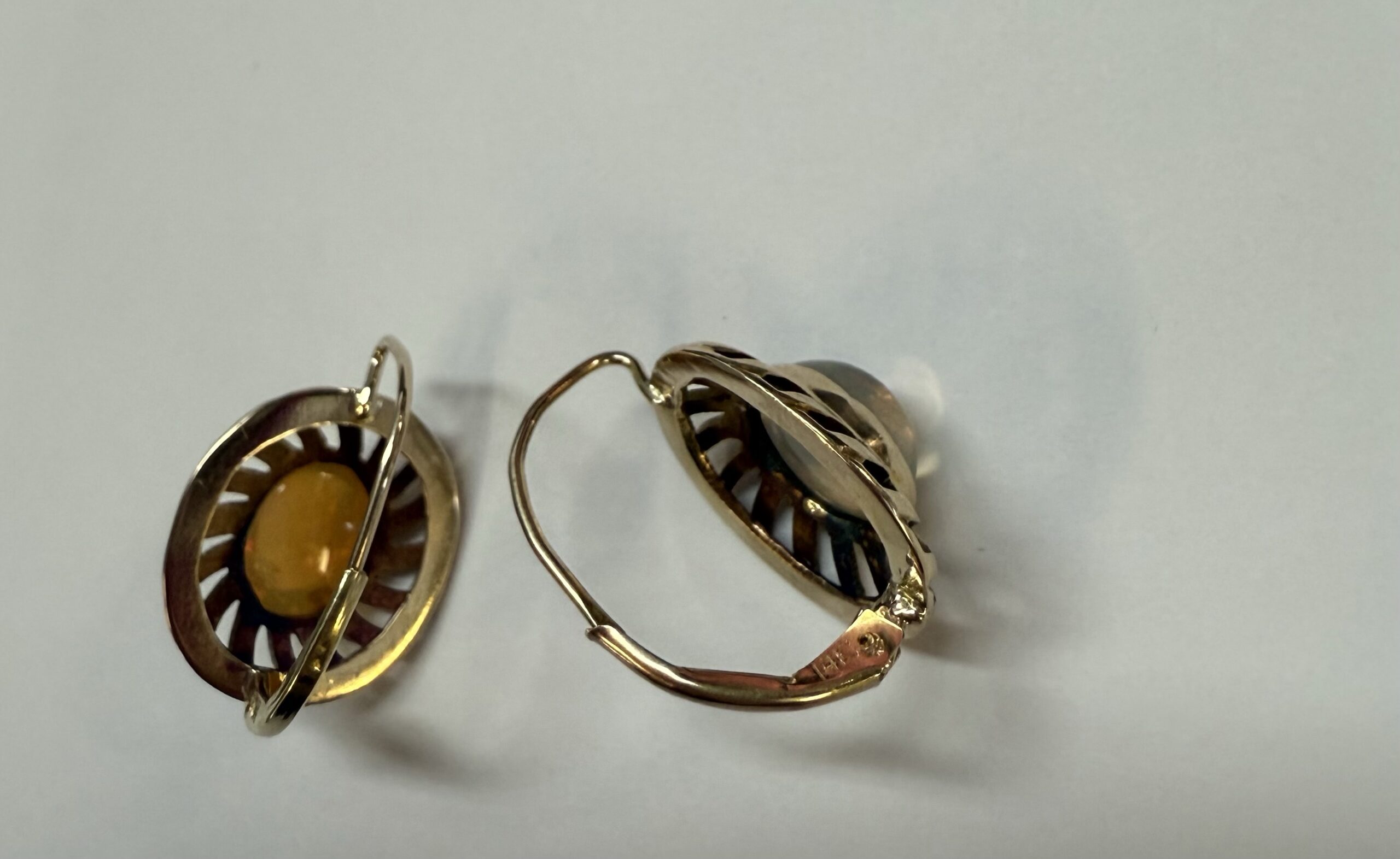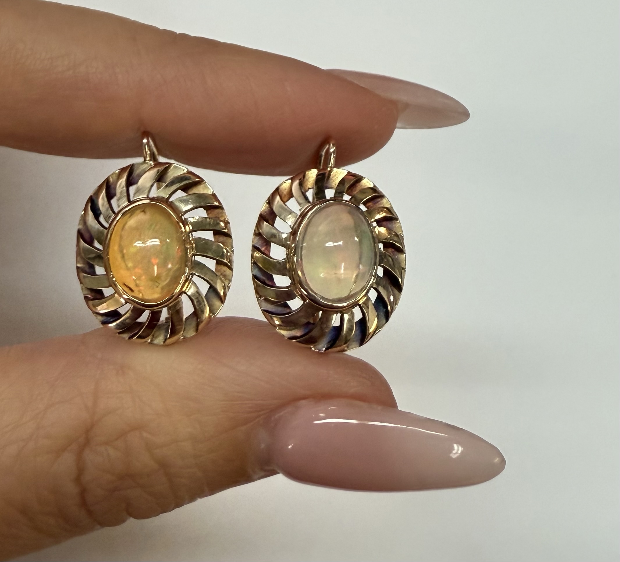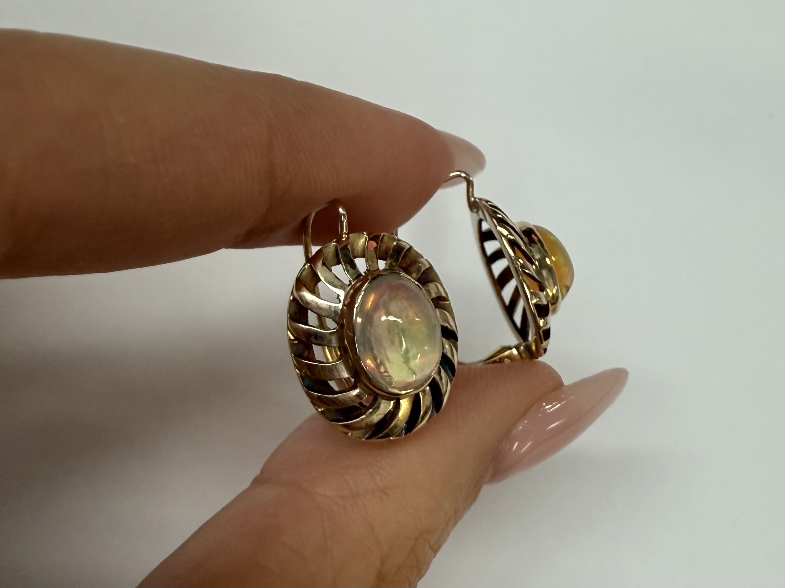 One-of-a-kind vintage 14k yellow gold genuine bezel set oval shaped, cabochon cut Opal lever back earrings with openwork frames. These earrings have an entire weight of 3.8 grams. The Opals measure approximately 8 x 6 mm in size.