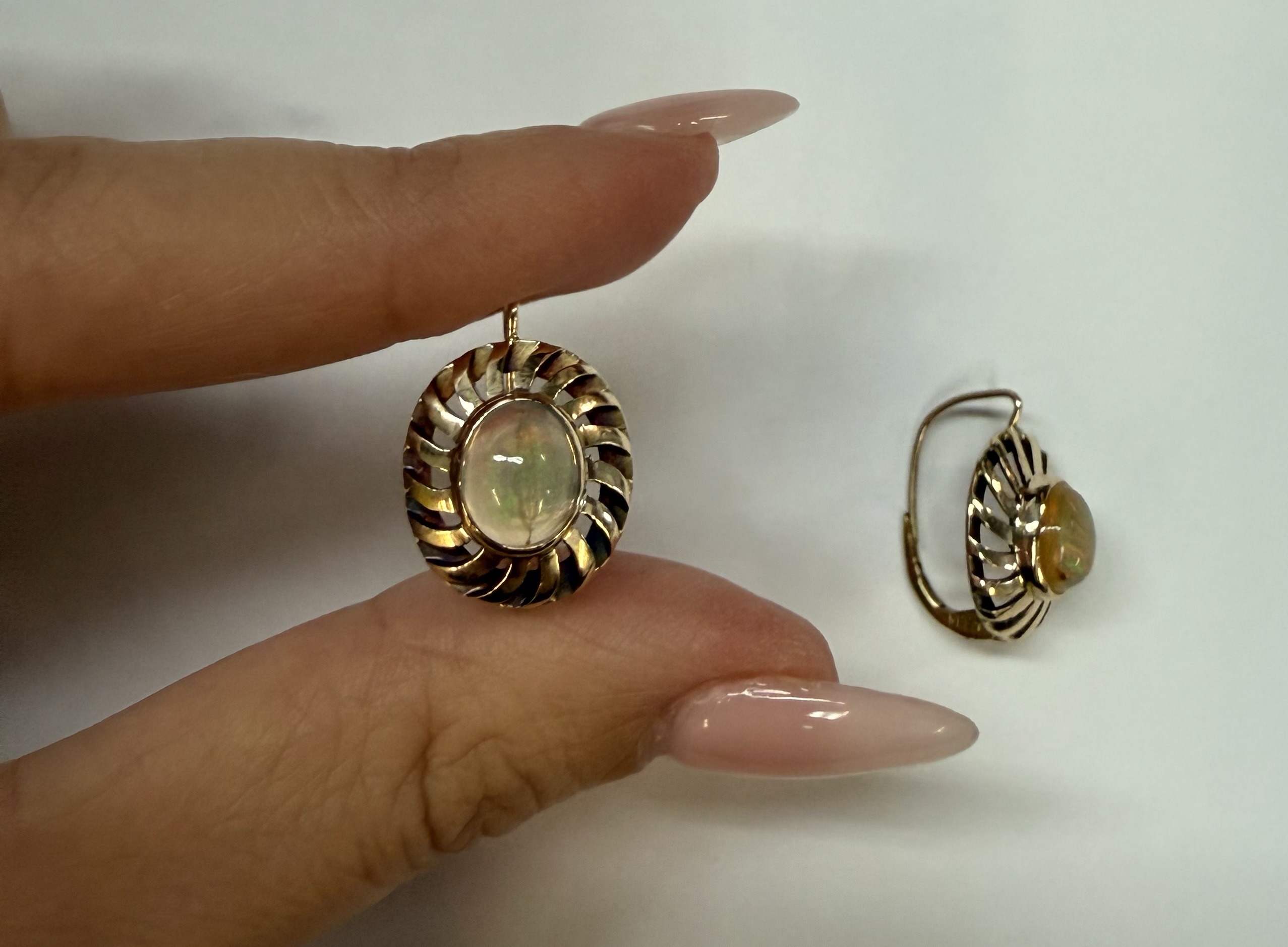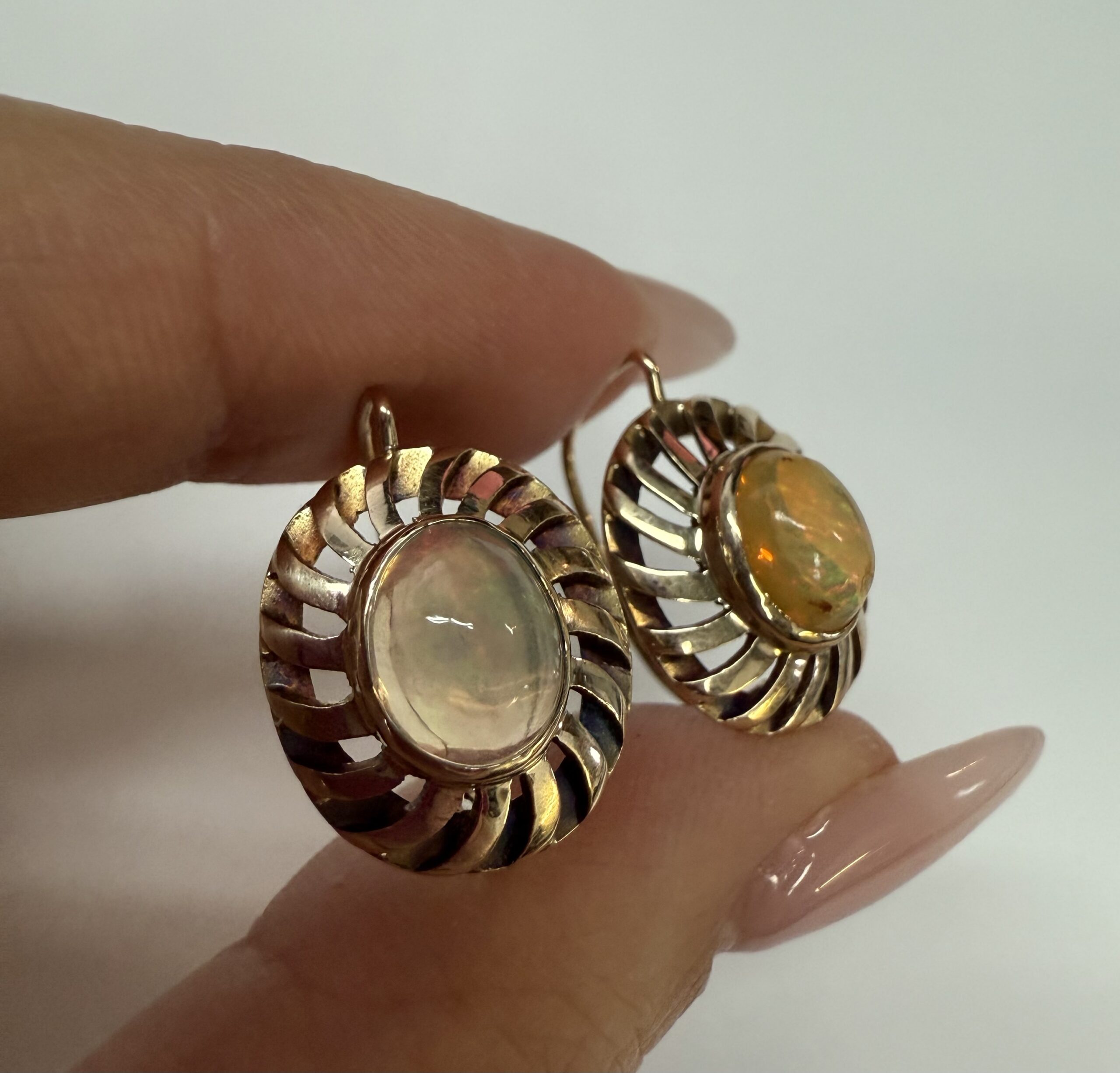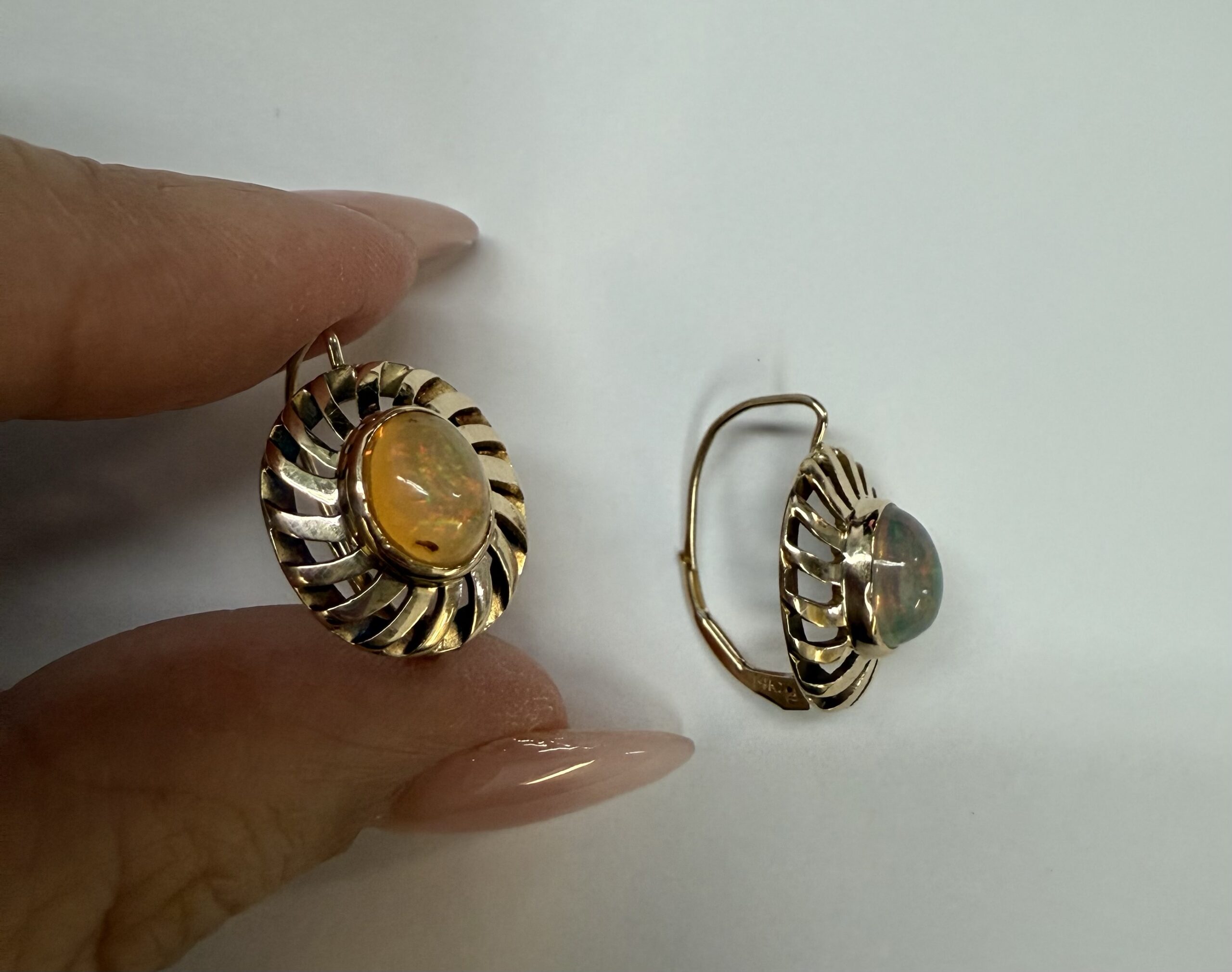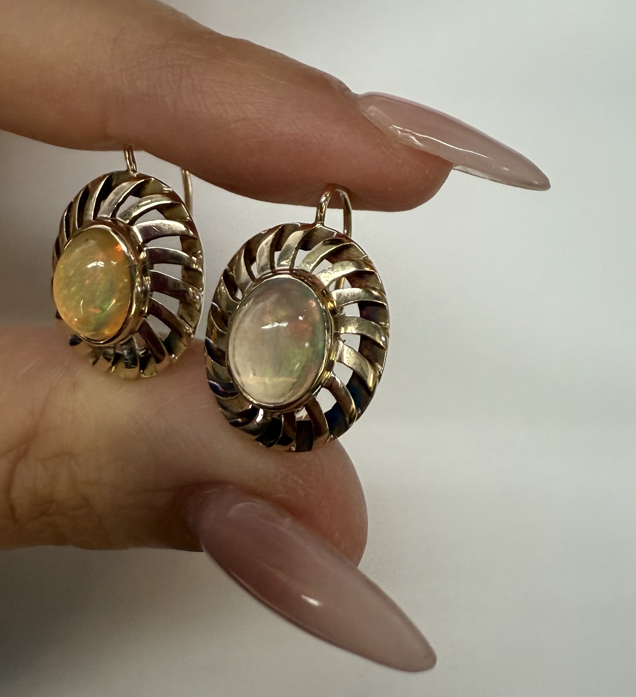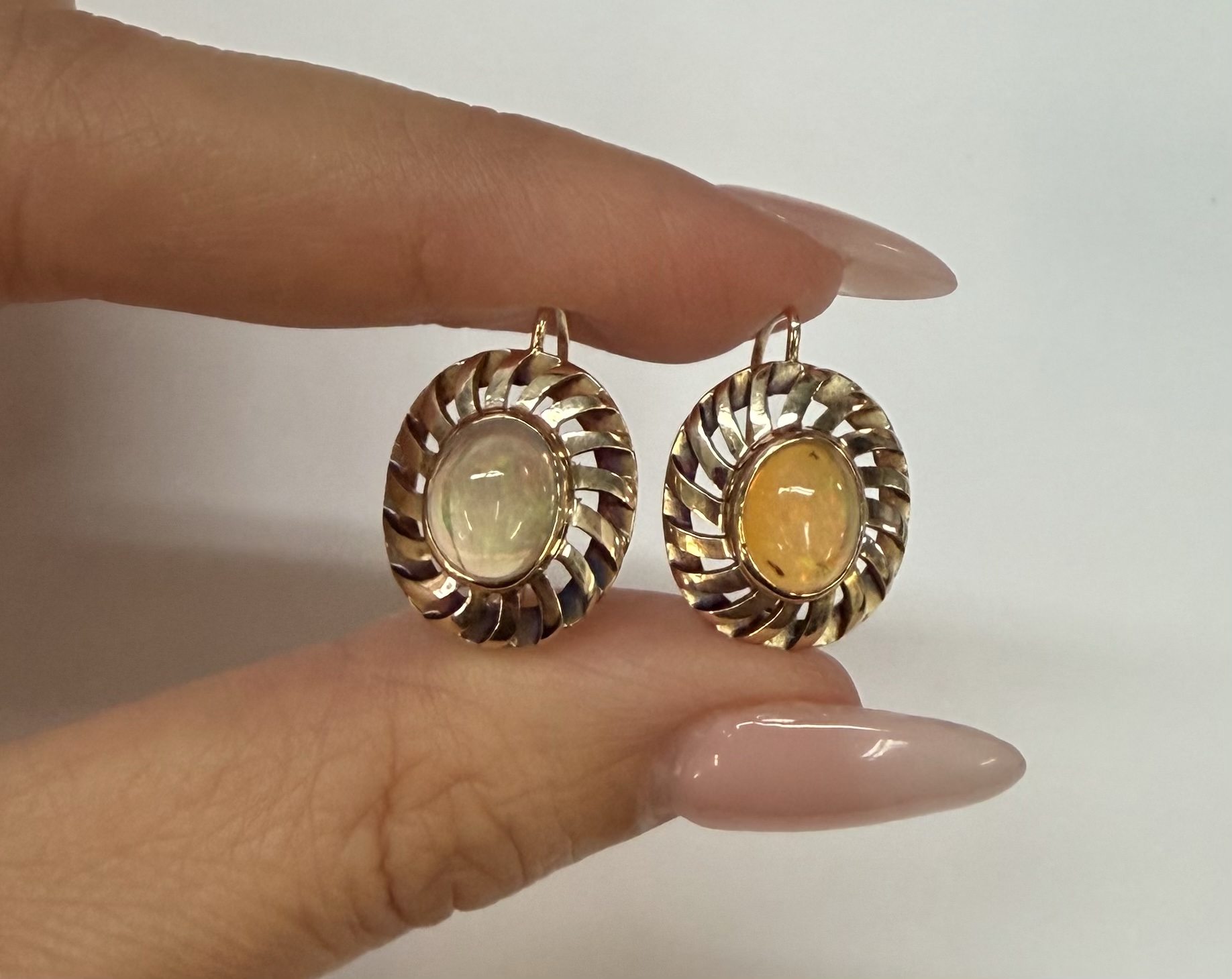 One-of-a-kind vintage 14k yellow gold genuine bezel set oval shaped, cabochon cut Opal lever back earrings with openwork frames. These earrings have an entire weight of 3.8 grams. The Opals measure approximately 8 x 6 mm in size.