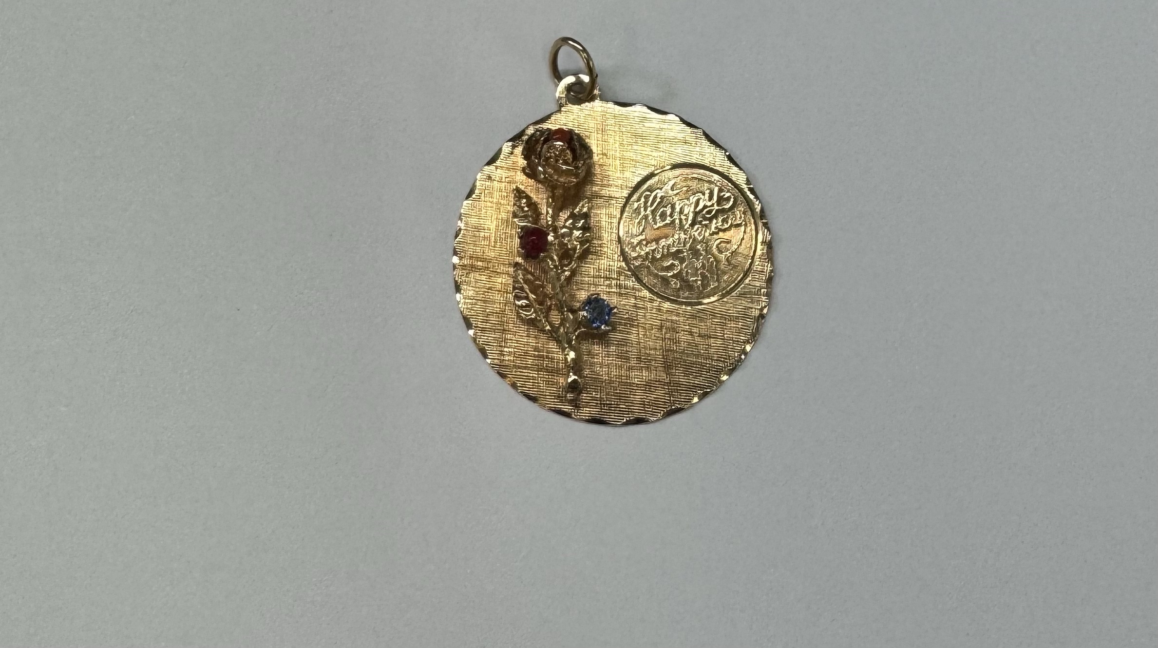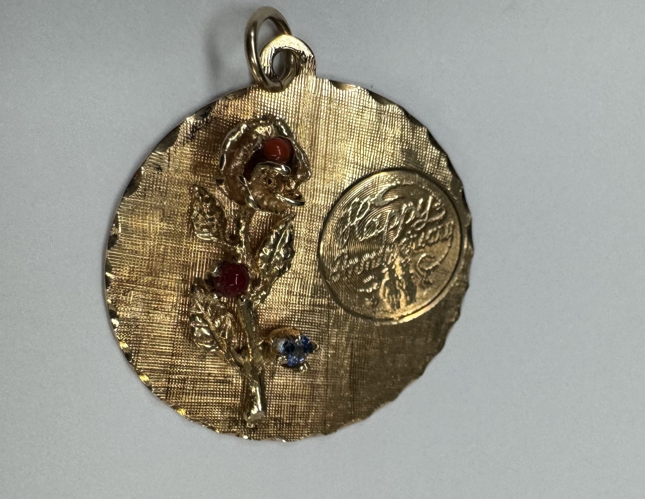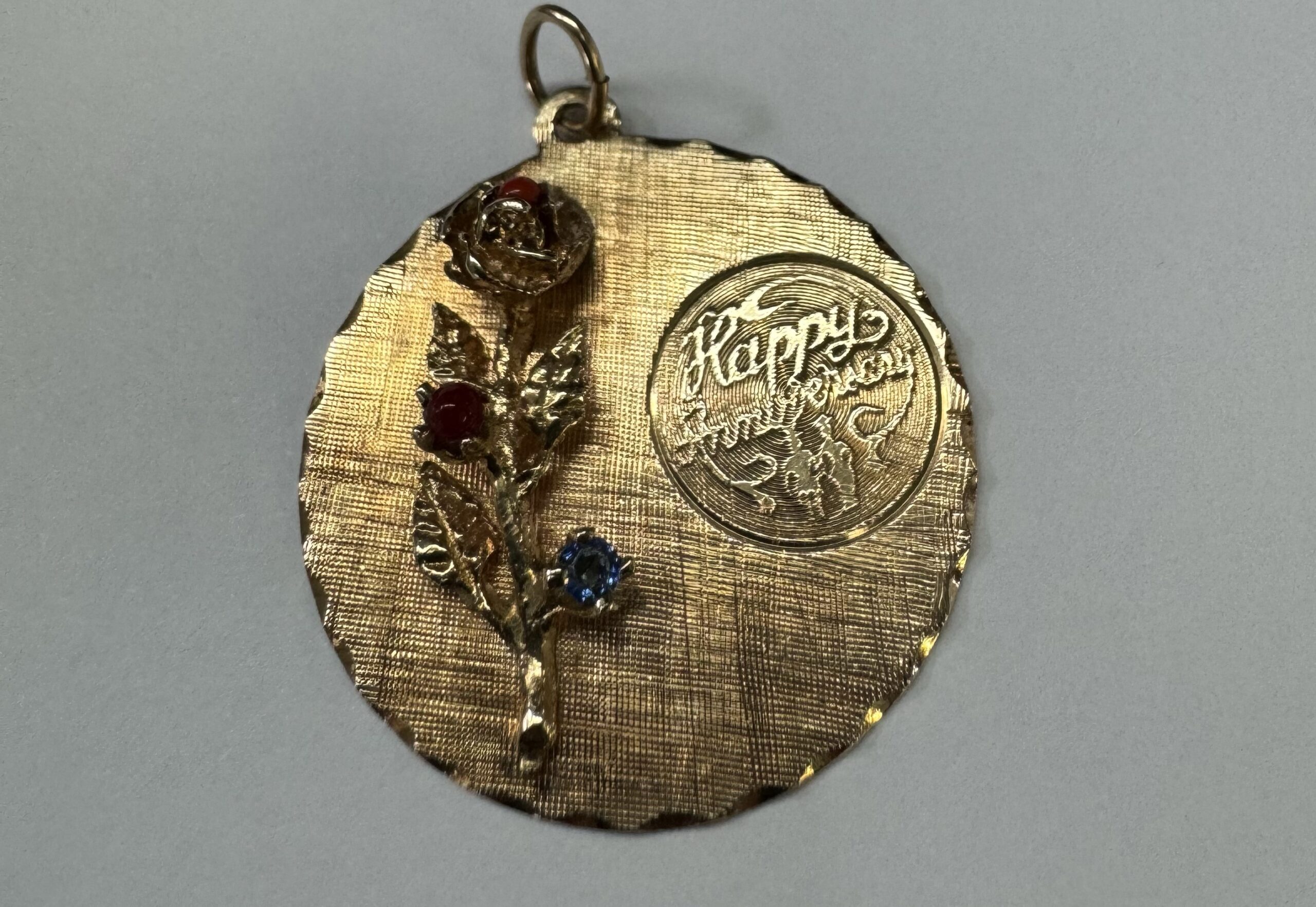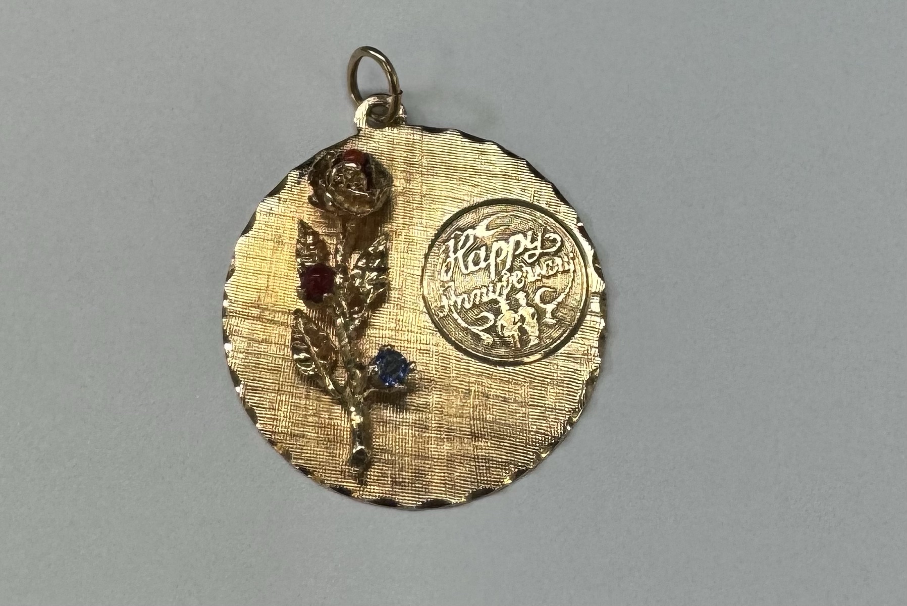 Vintage 14k yellow gold 25 mm large flat disc engraved “Happy anniversary” with rose detail and genuine gemstone accents. This disc measures mm in size, and the charm has an entire weight of 3.7 grams.