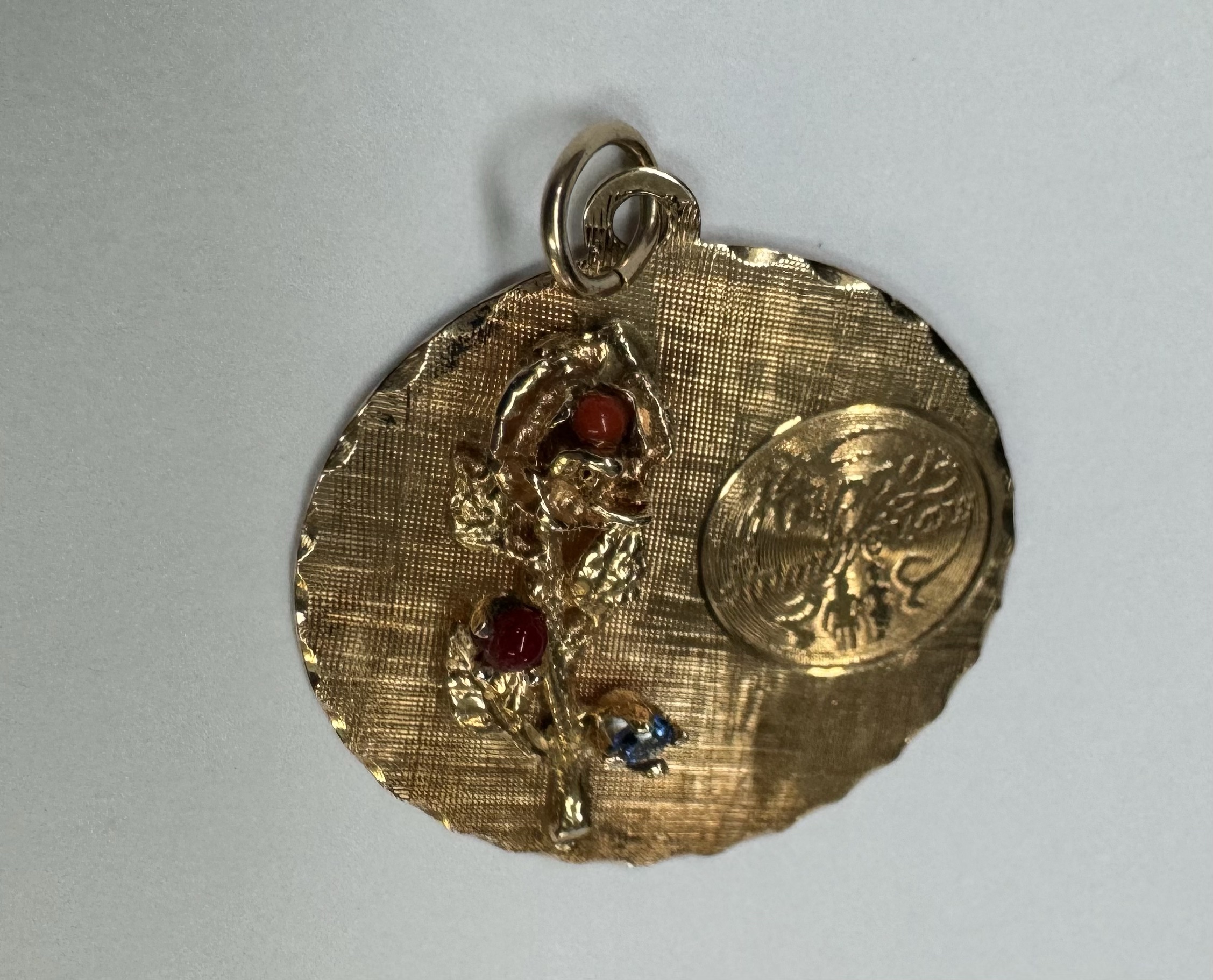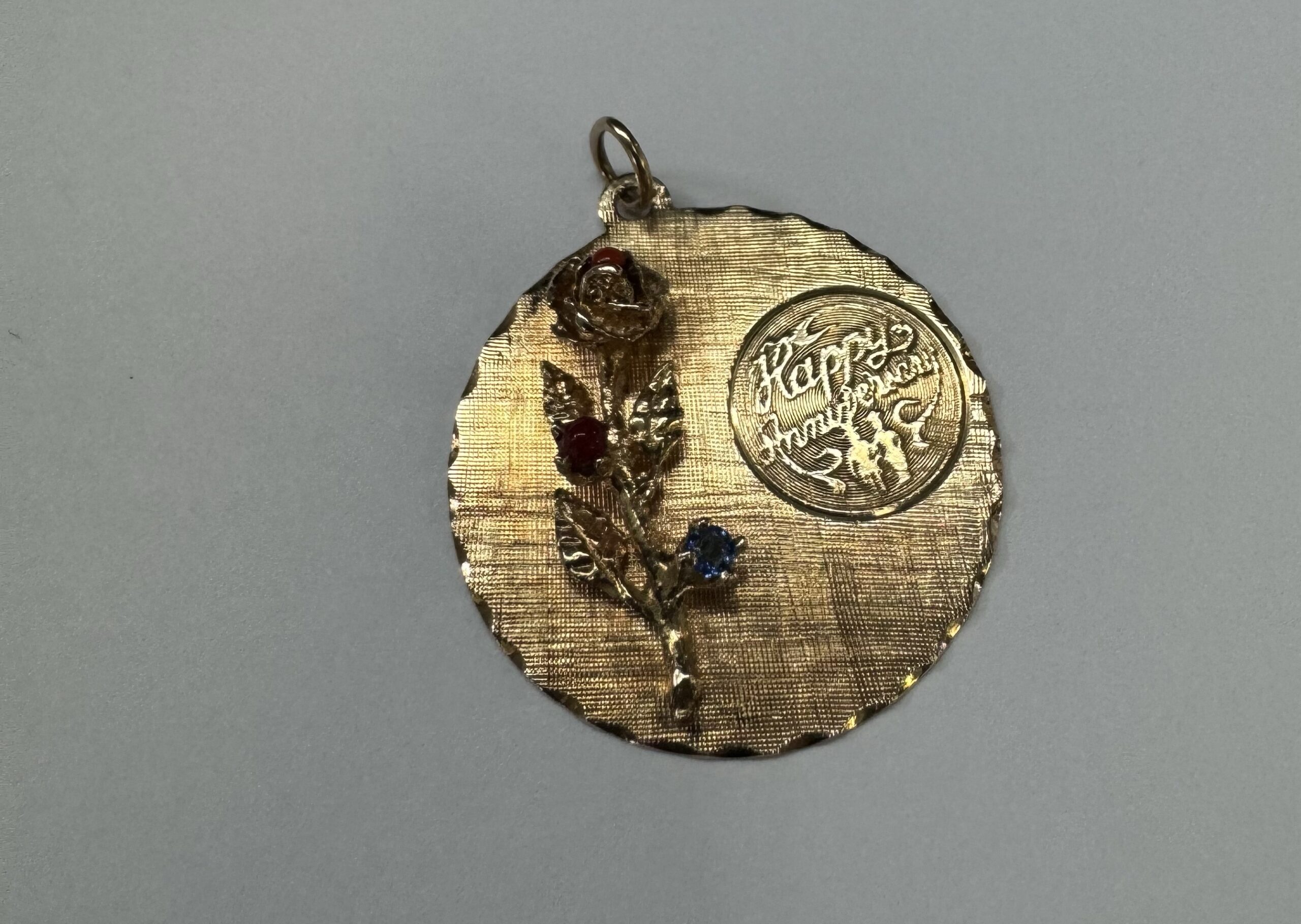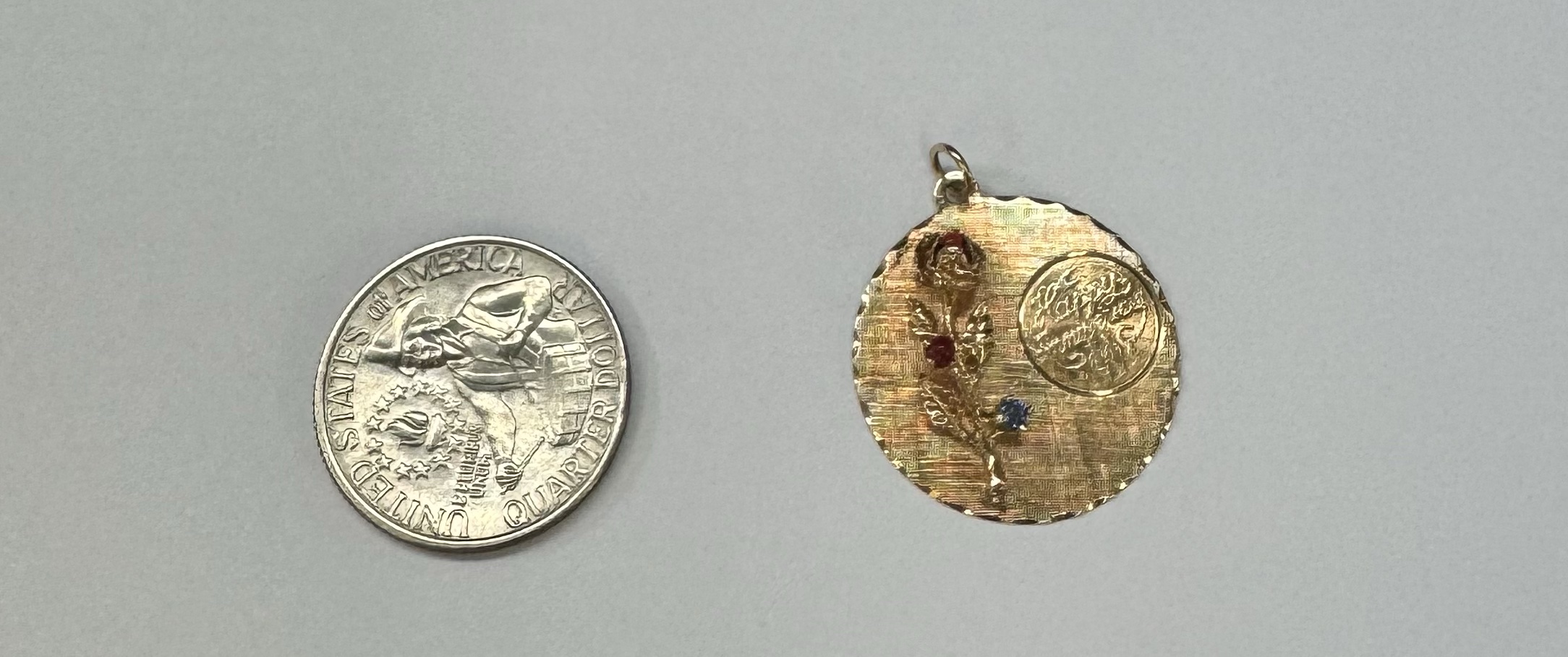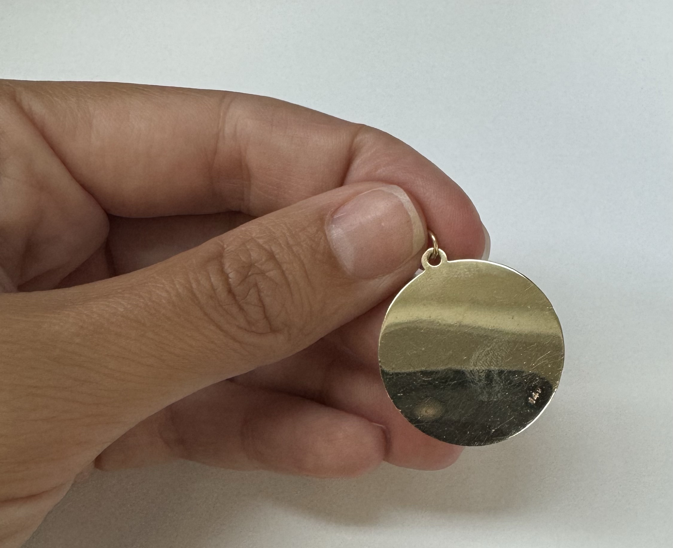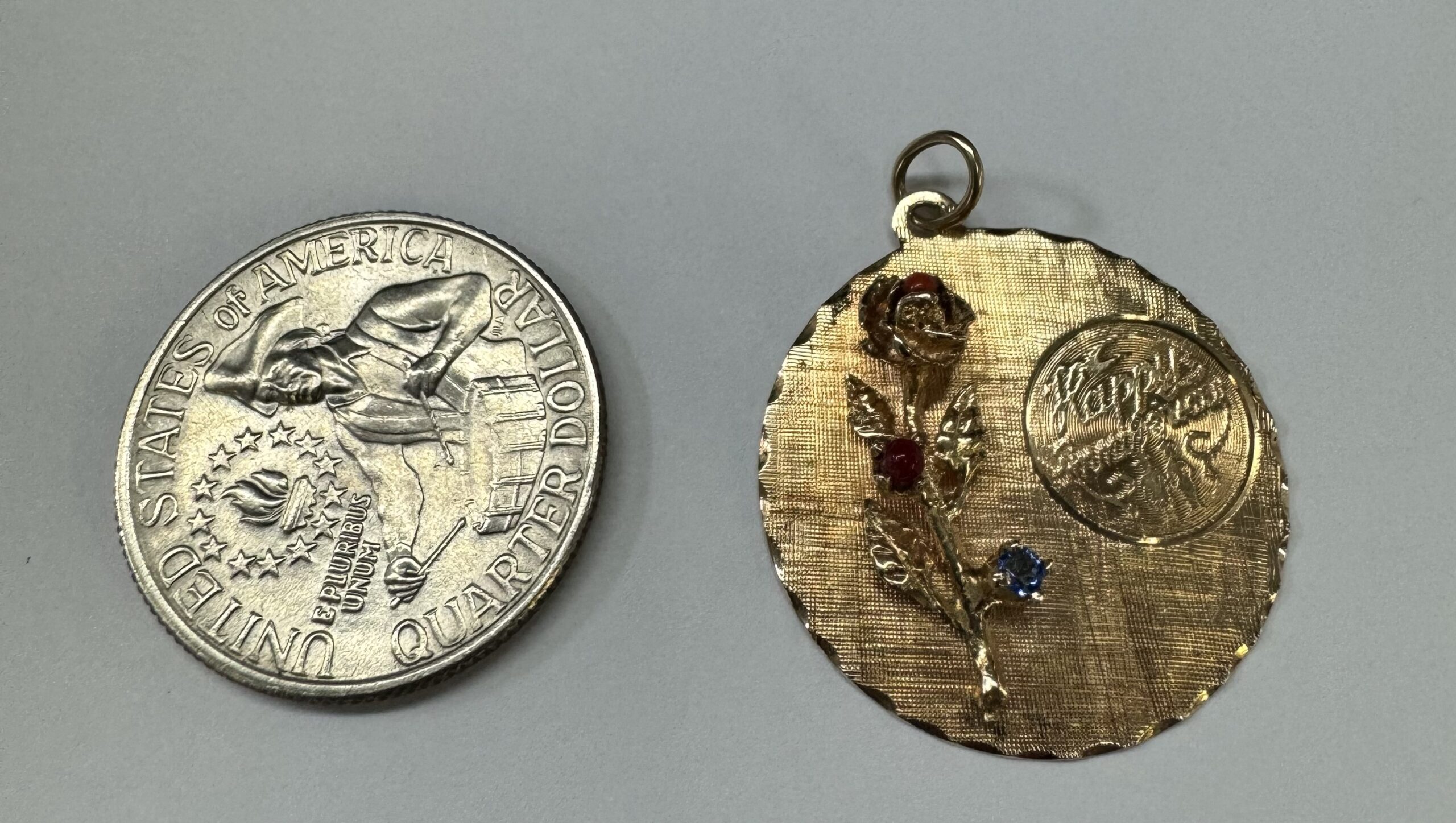 Vintage 14k yellow gold 25 mm large flat disc engraved “Happy anniversary” with rose detail and genuine gemstone accents. This disc measures mm in size, and the charm has an entire weight of 3.7 grams.