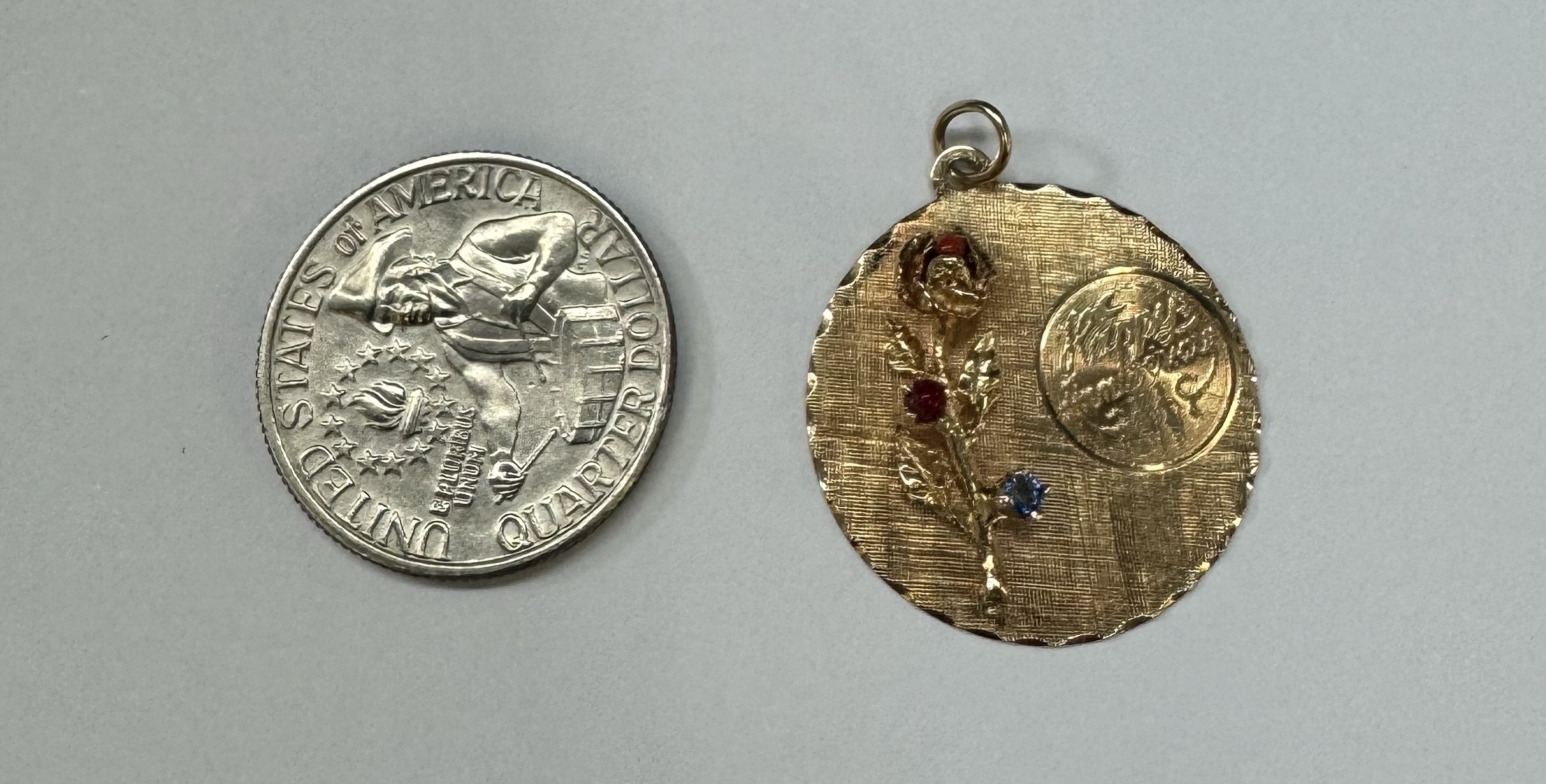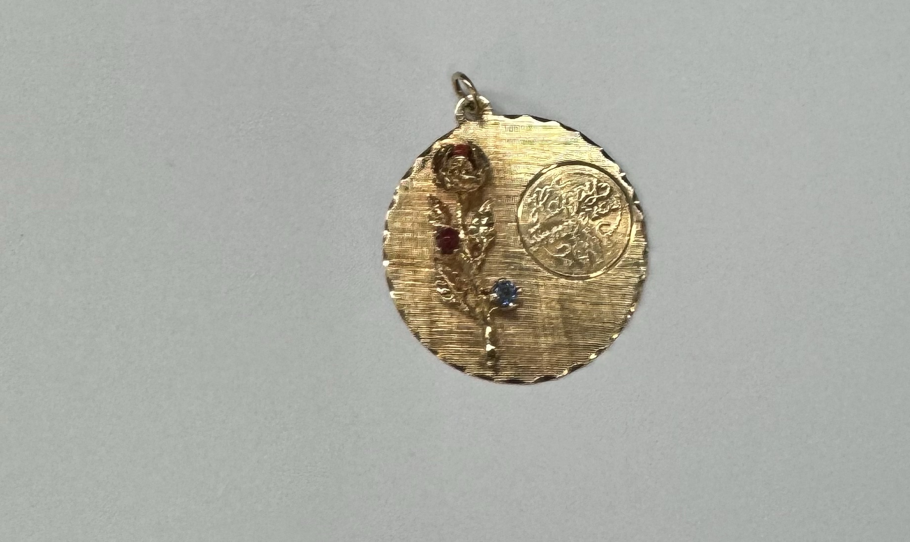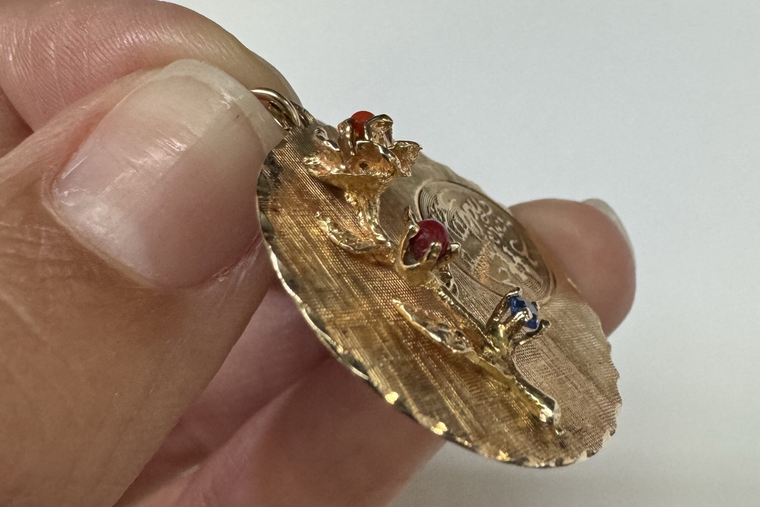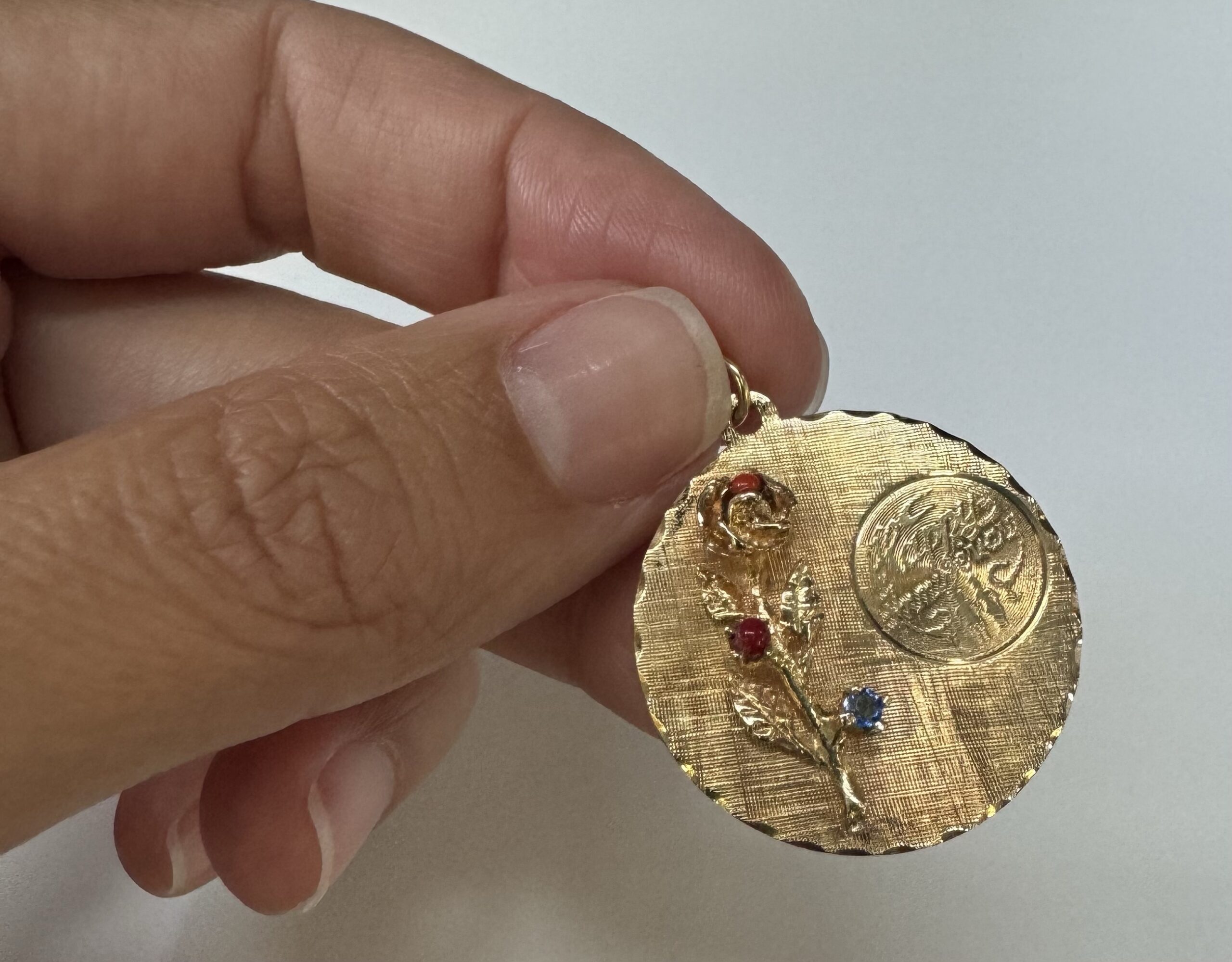 Vintage 14k yellow gold 25 mm large flat disc engraved “Happy anniversary” with rose detail and genuine gemstone accents. This disc measures mm in size, and the charm has an entire weight of 3.7 grams.