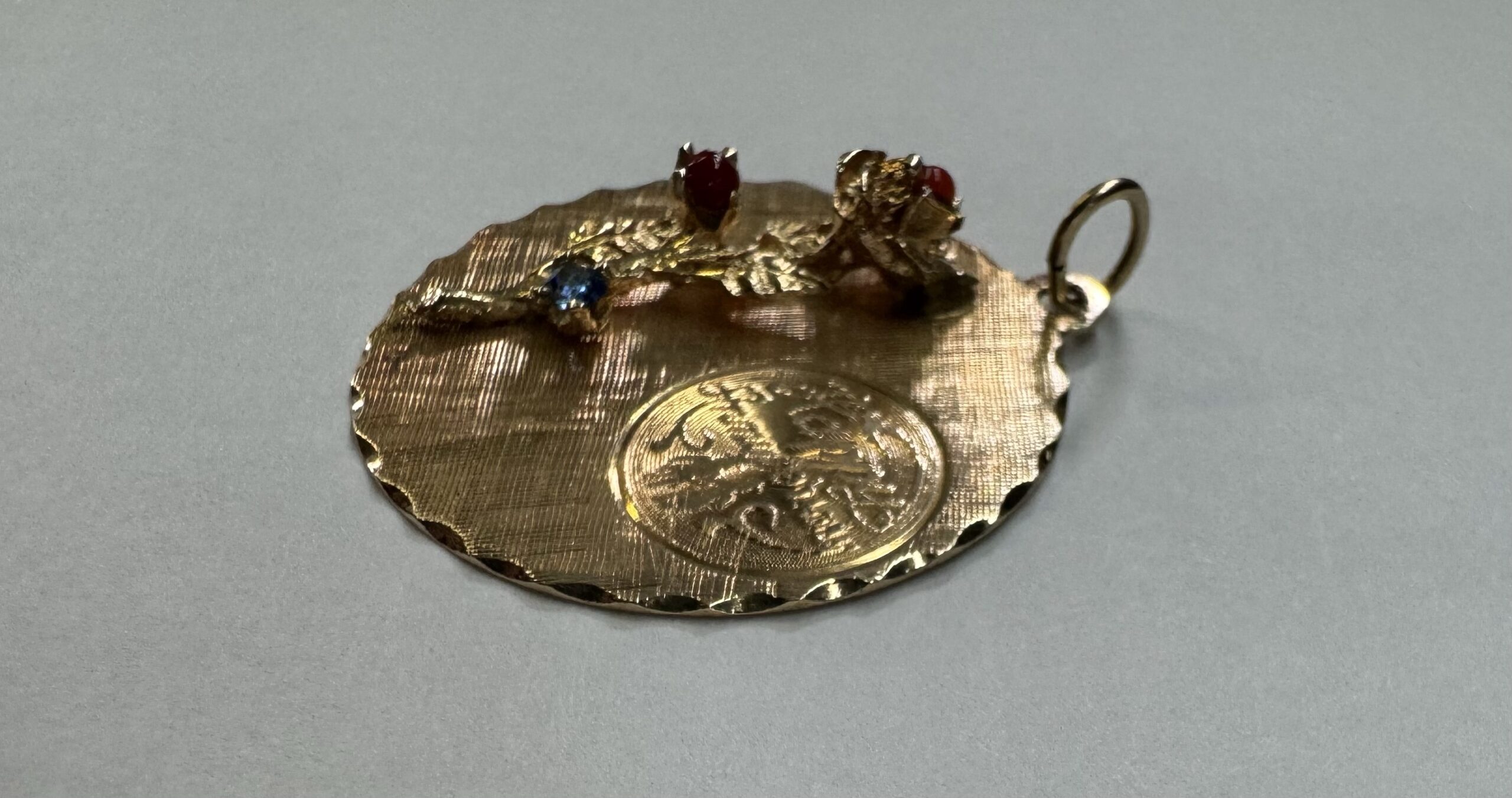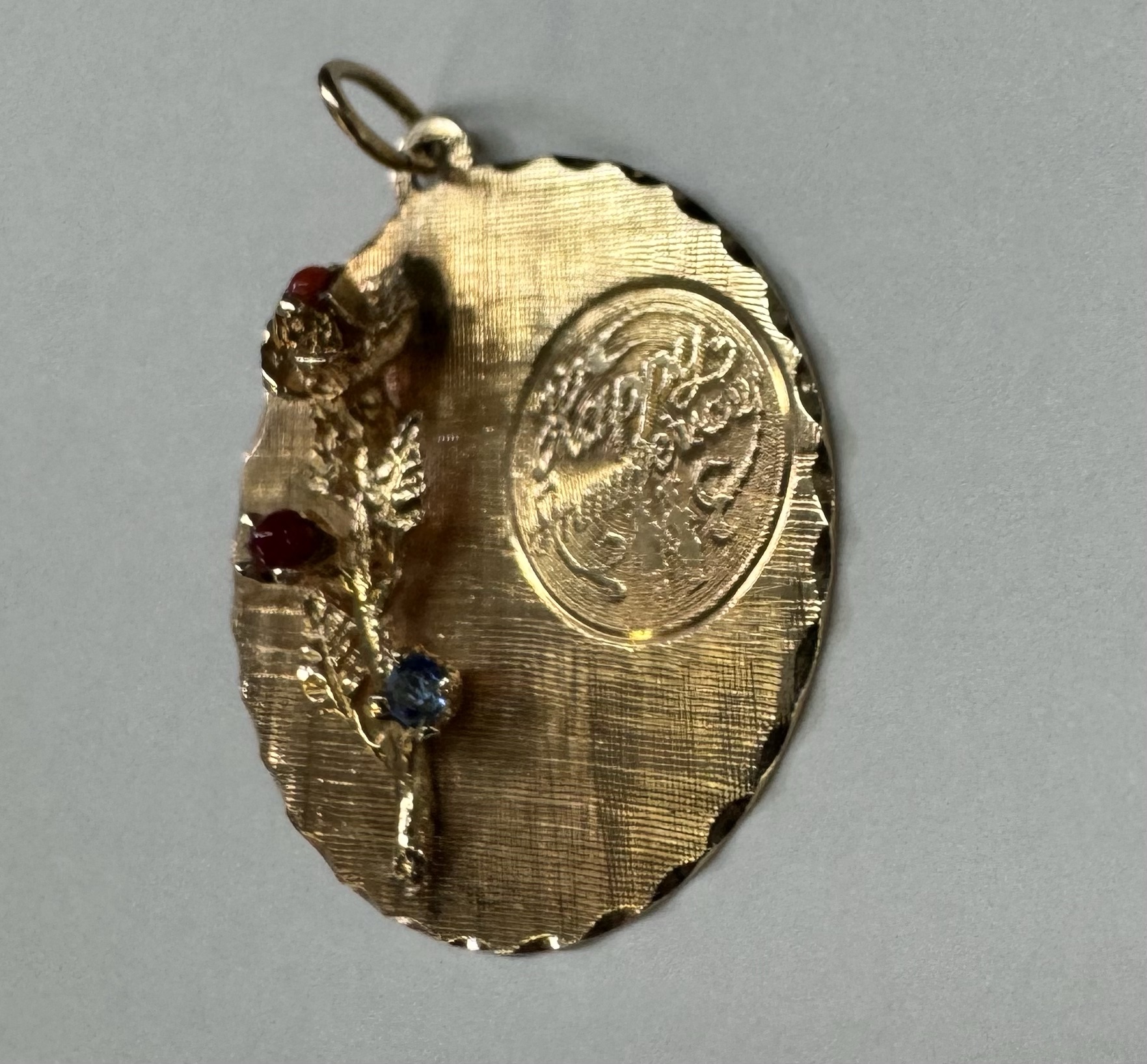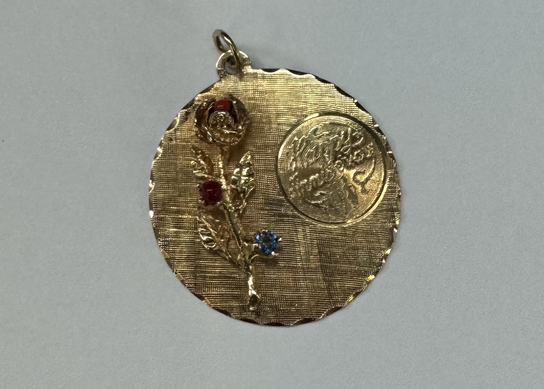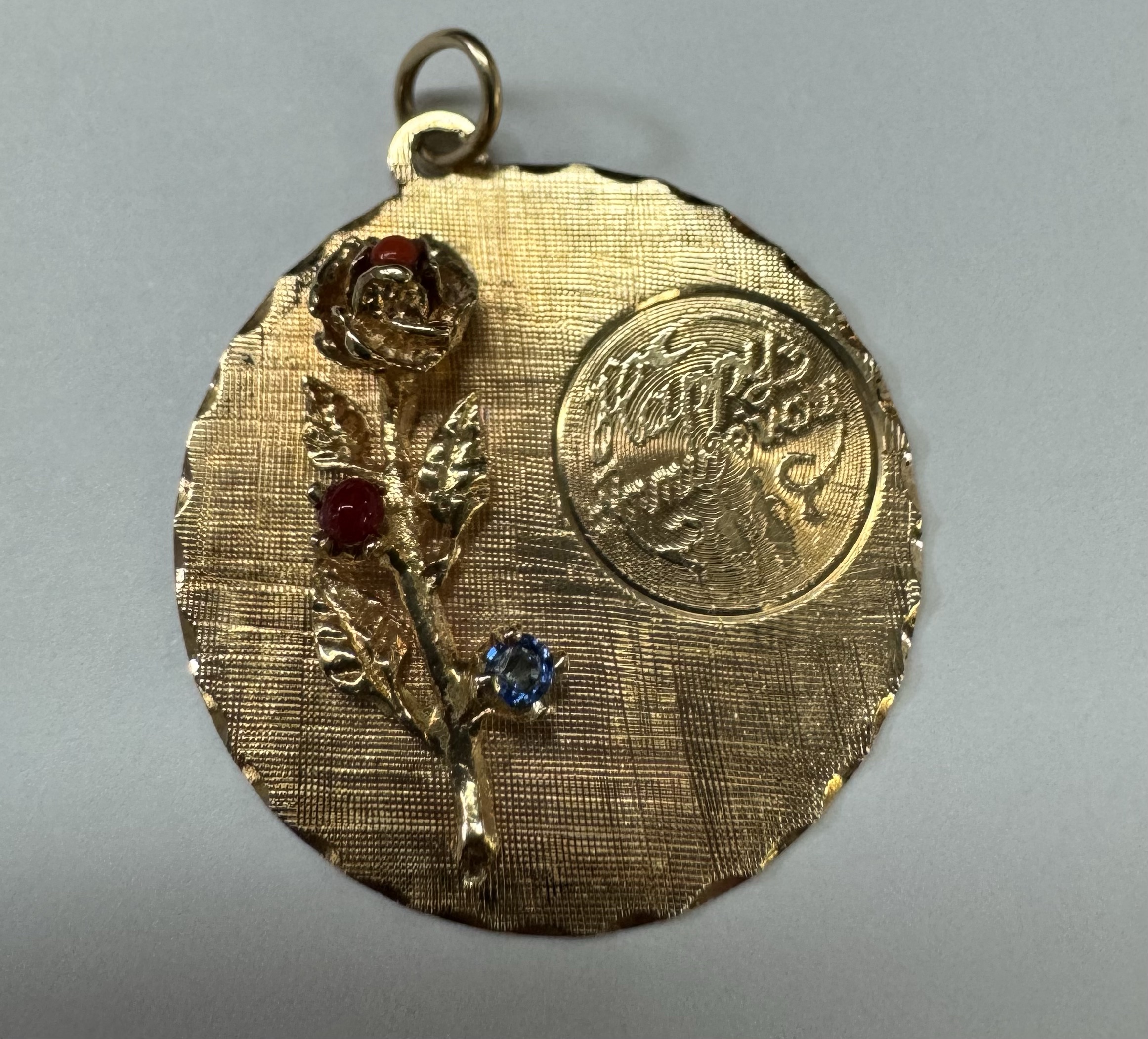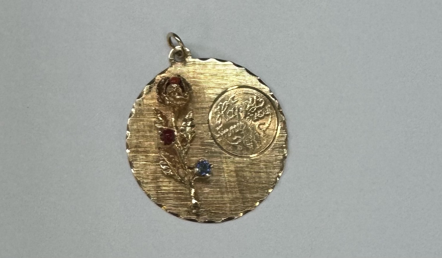 Vintage 14k yellow gold 25 mm large flat disc engraved “Happy anniversary” with rose detail and genuine gemstone accents. This disc measures mm in size, and the charm has an entire weight of 3.7 grams.