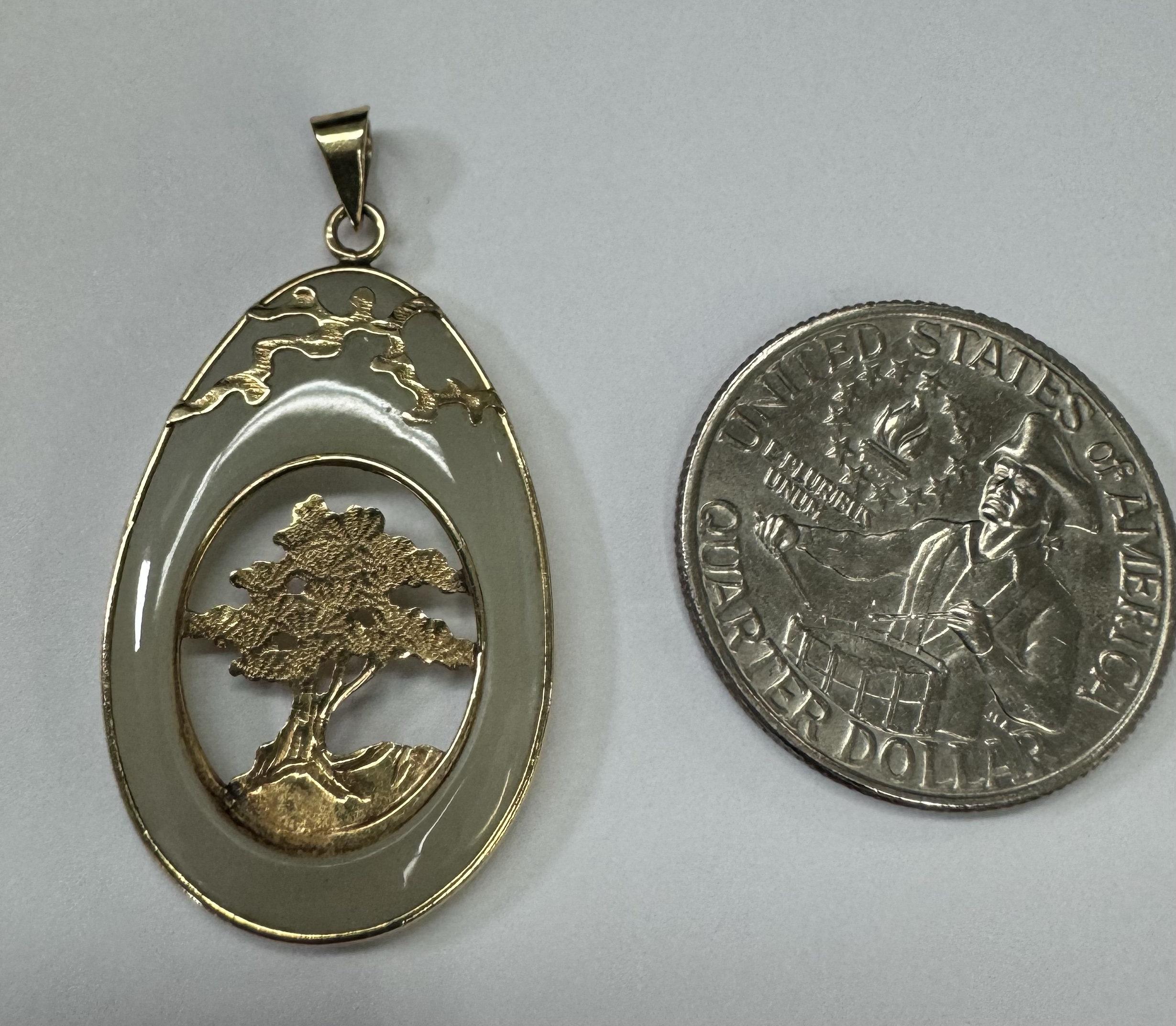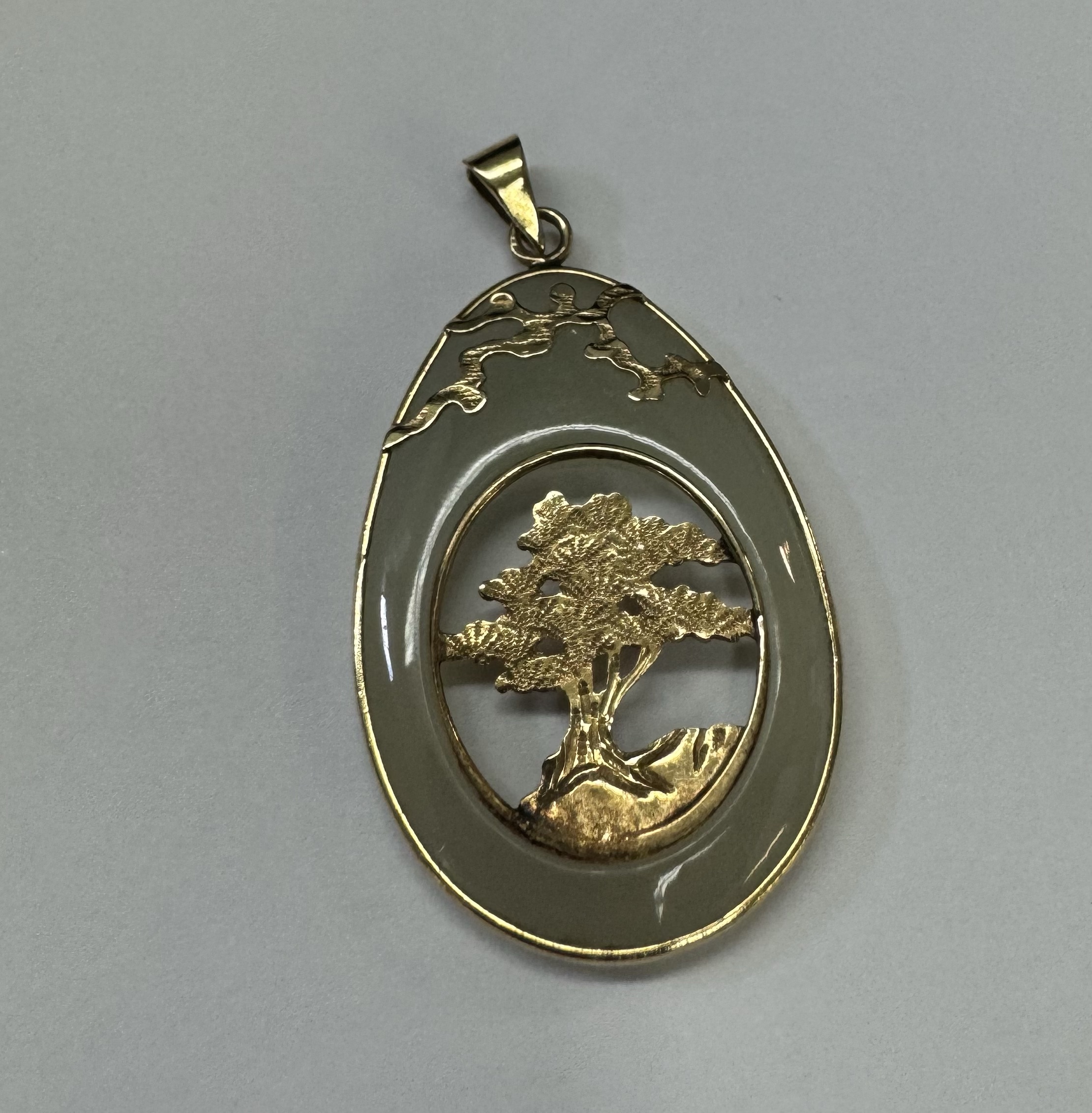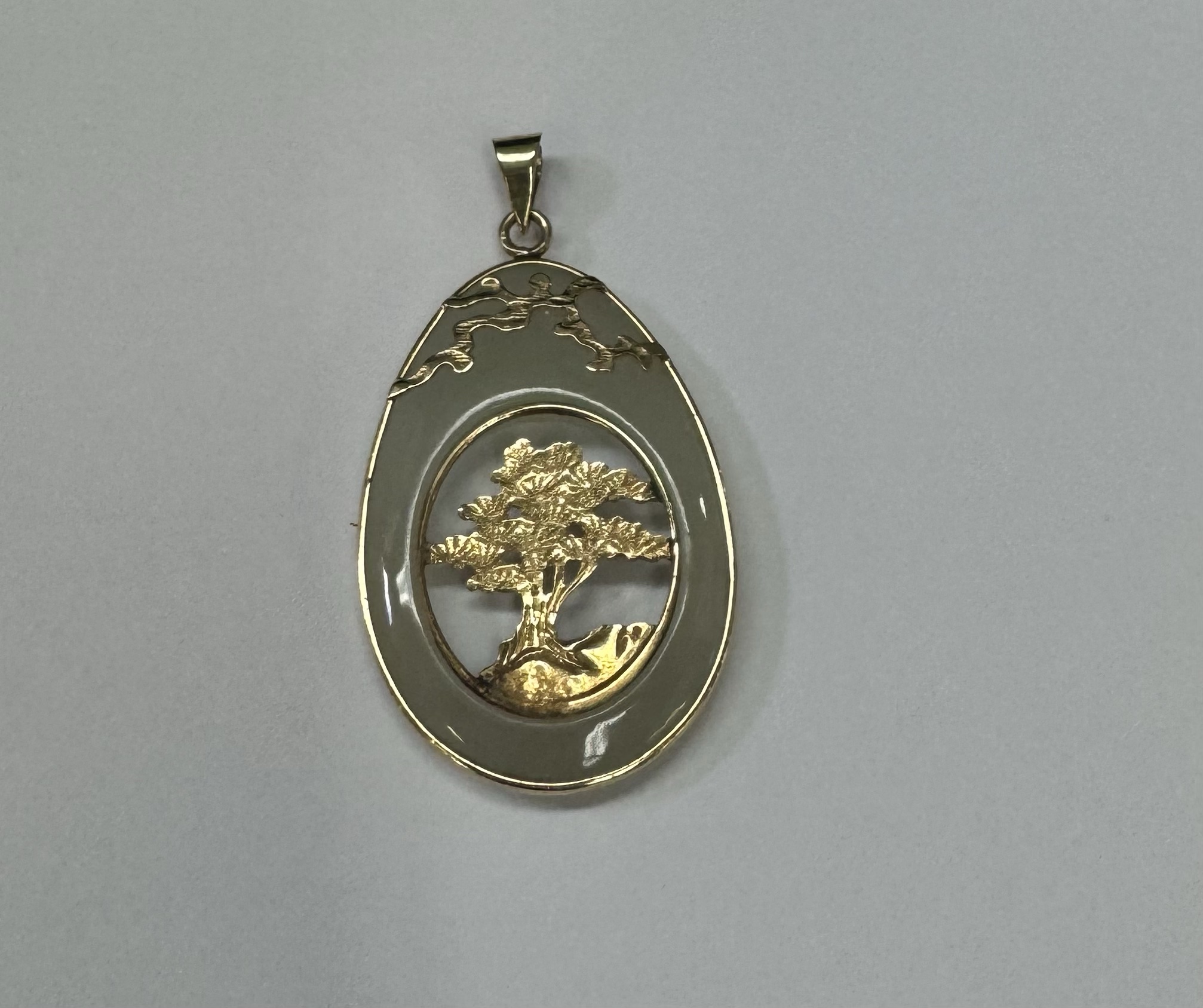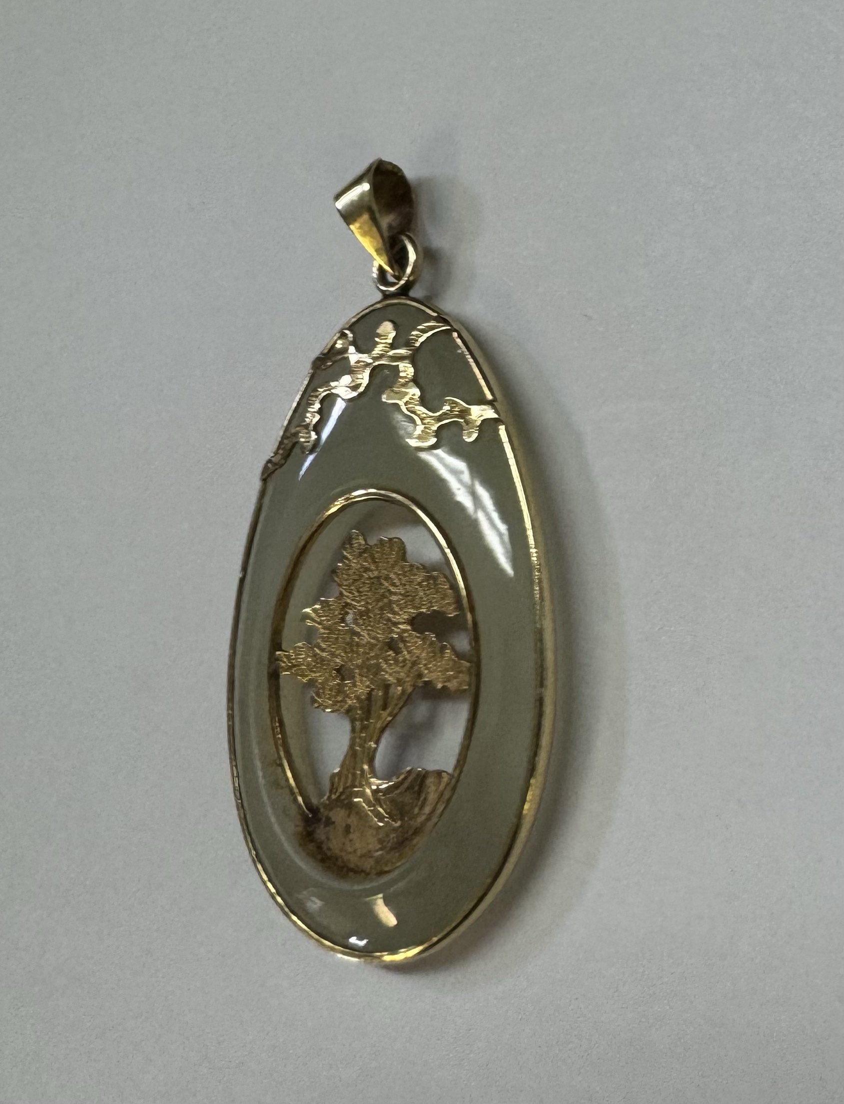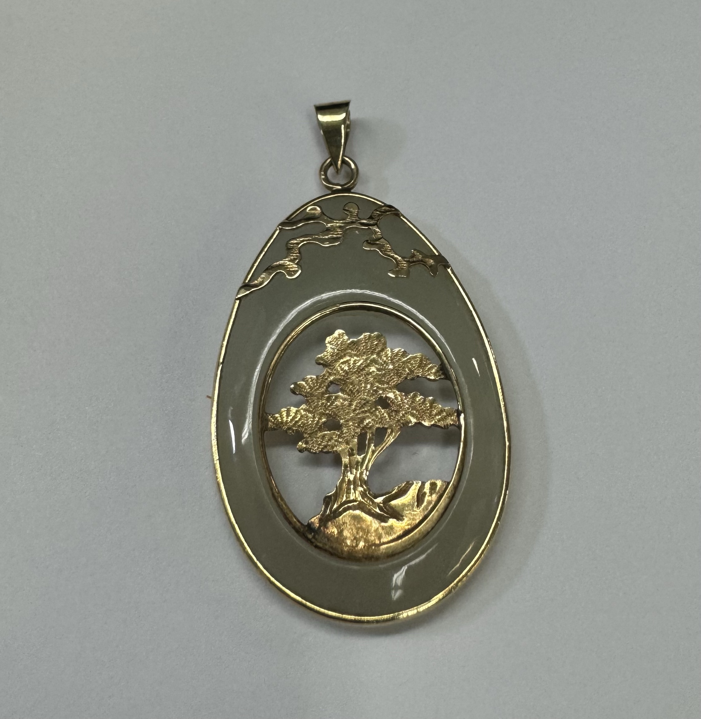 Vintage 14k yellow gold genuine Jadeite pendant with a 14k yellow gold carved tree. This piece has an entire weight of 3.37 grams.