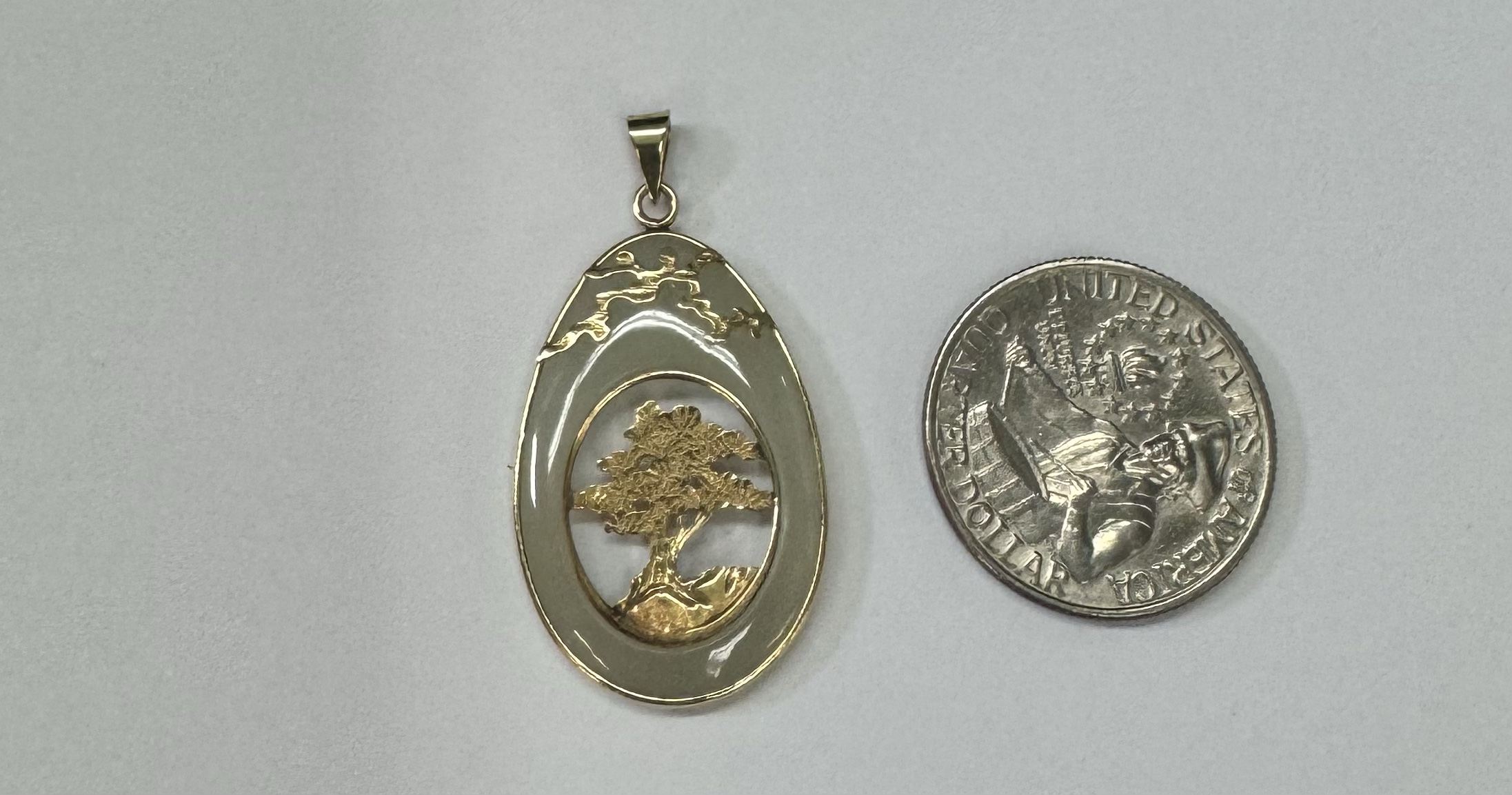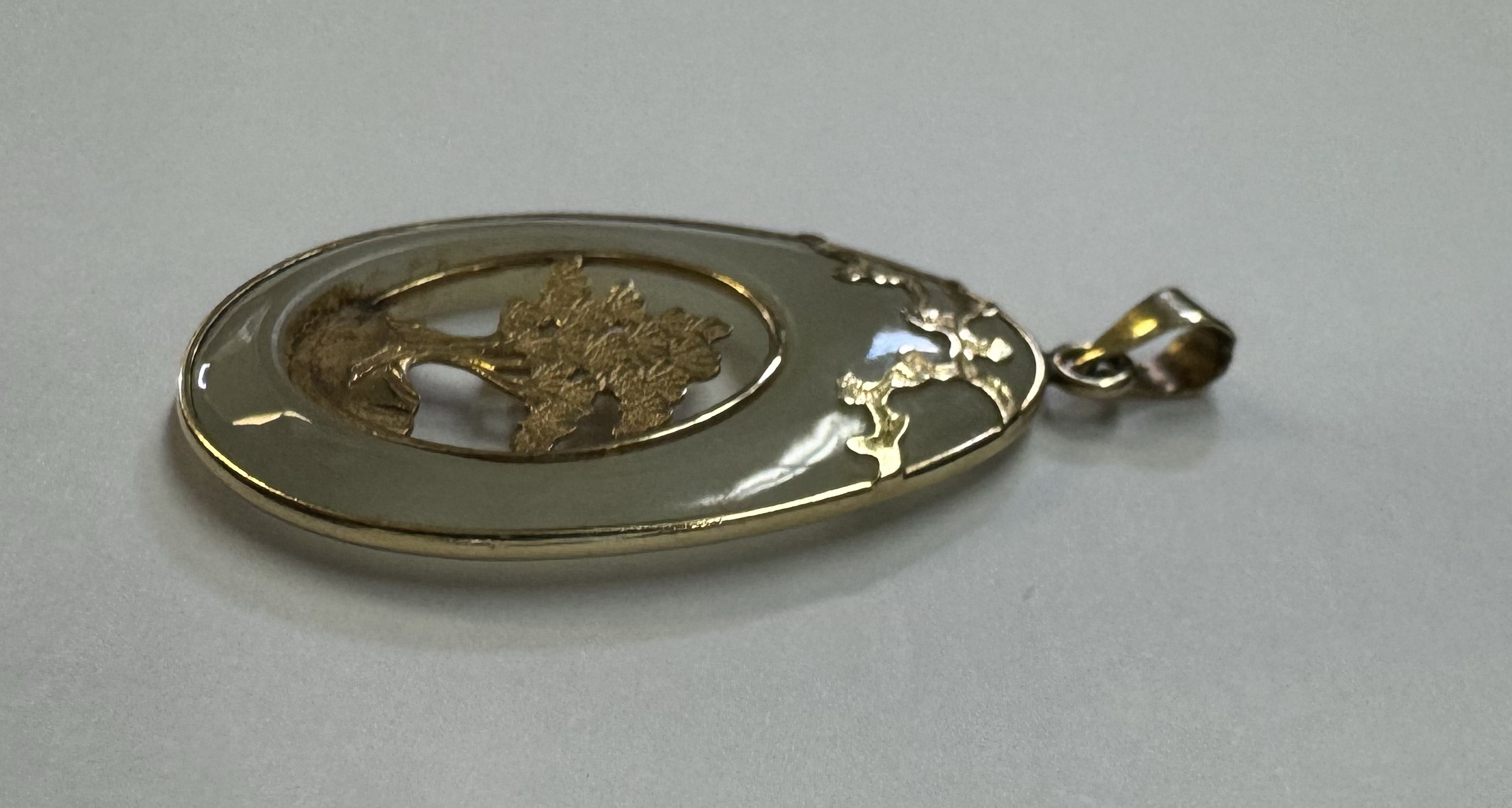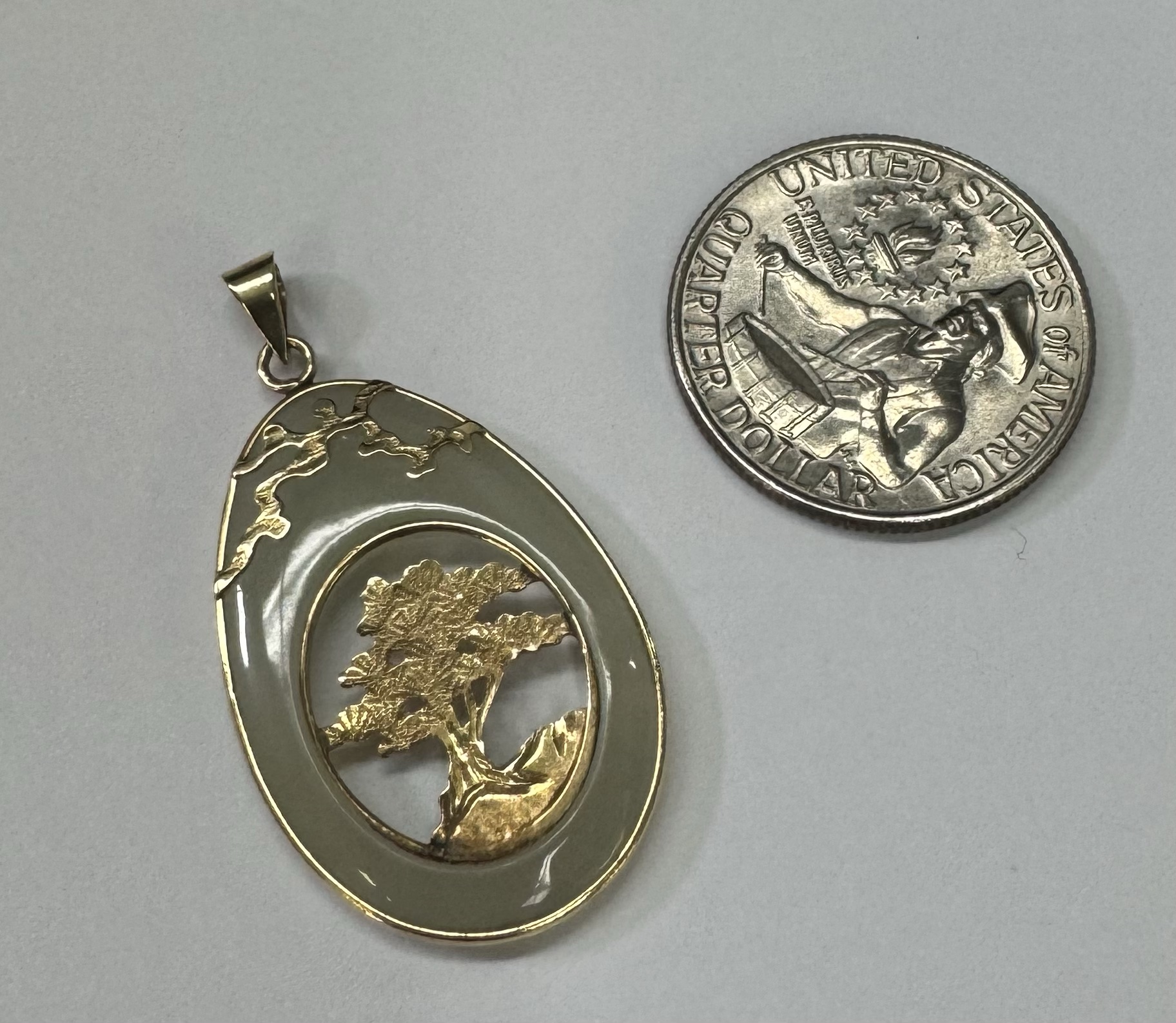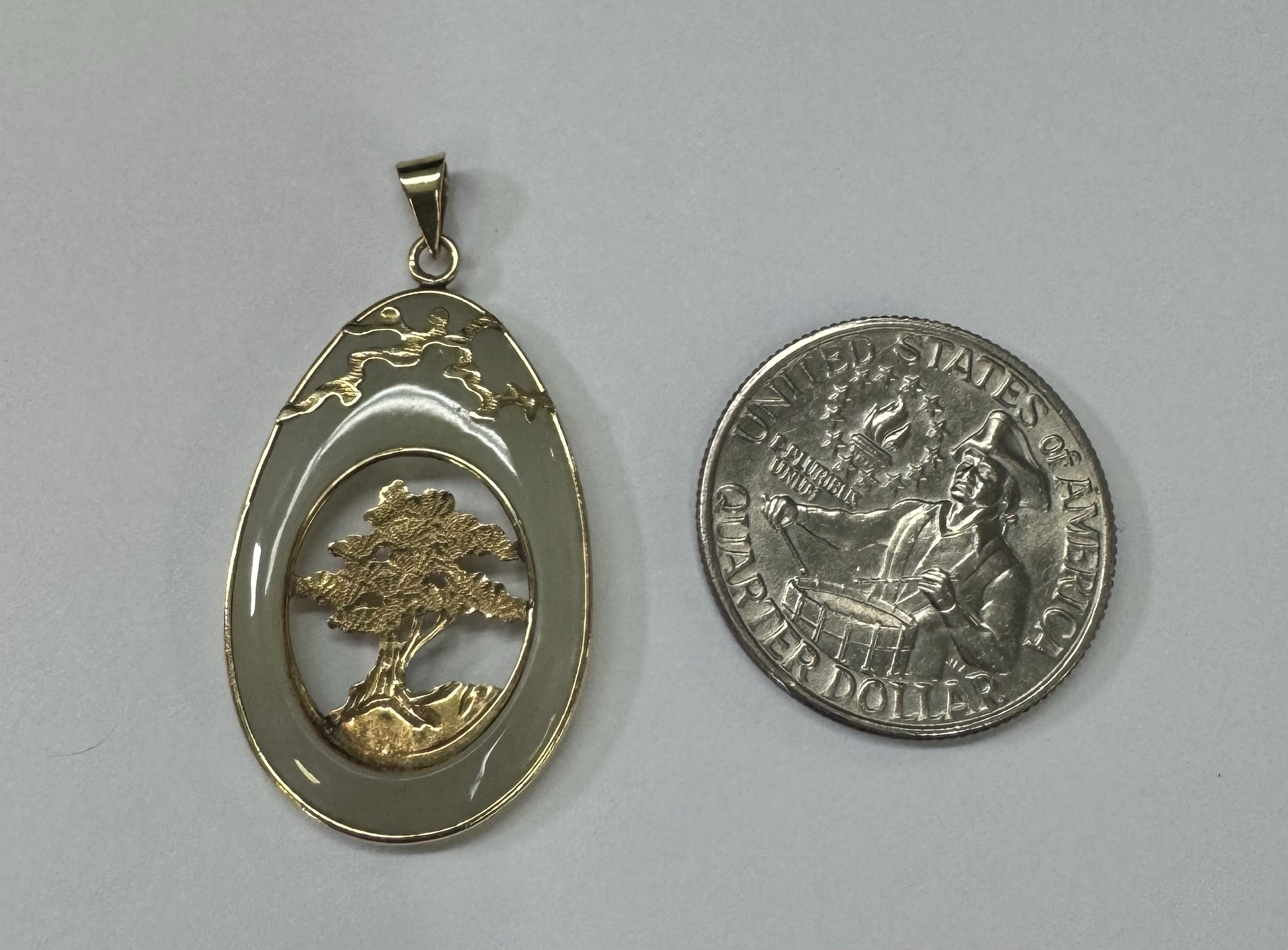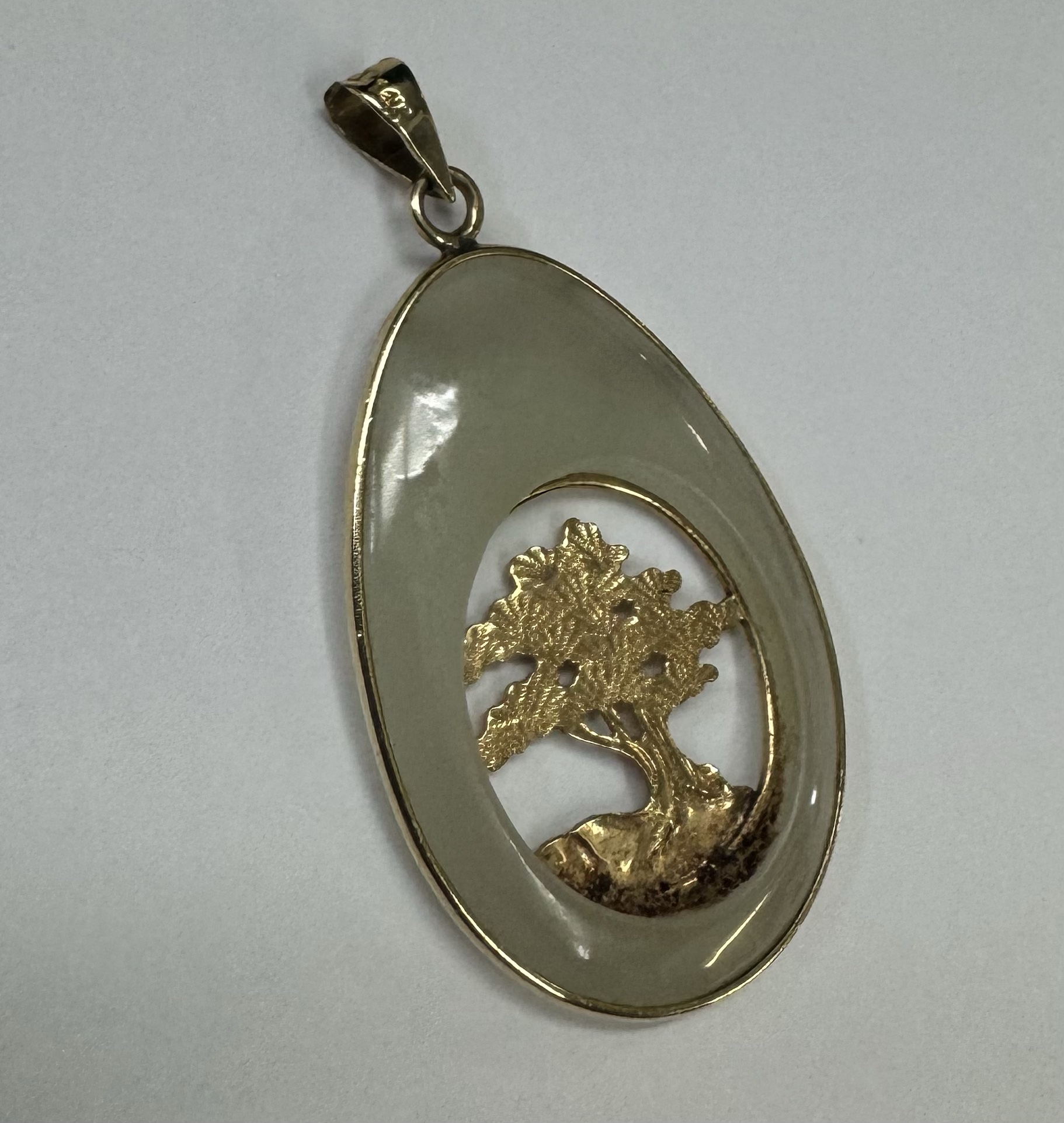 Vintage 14k yellow gold genuine Jadeite pendant with a 14k yellow gold carved tree. This piece has an entire weight of 3.37 grams.