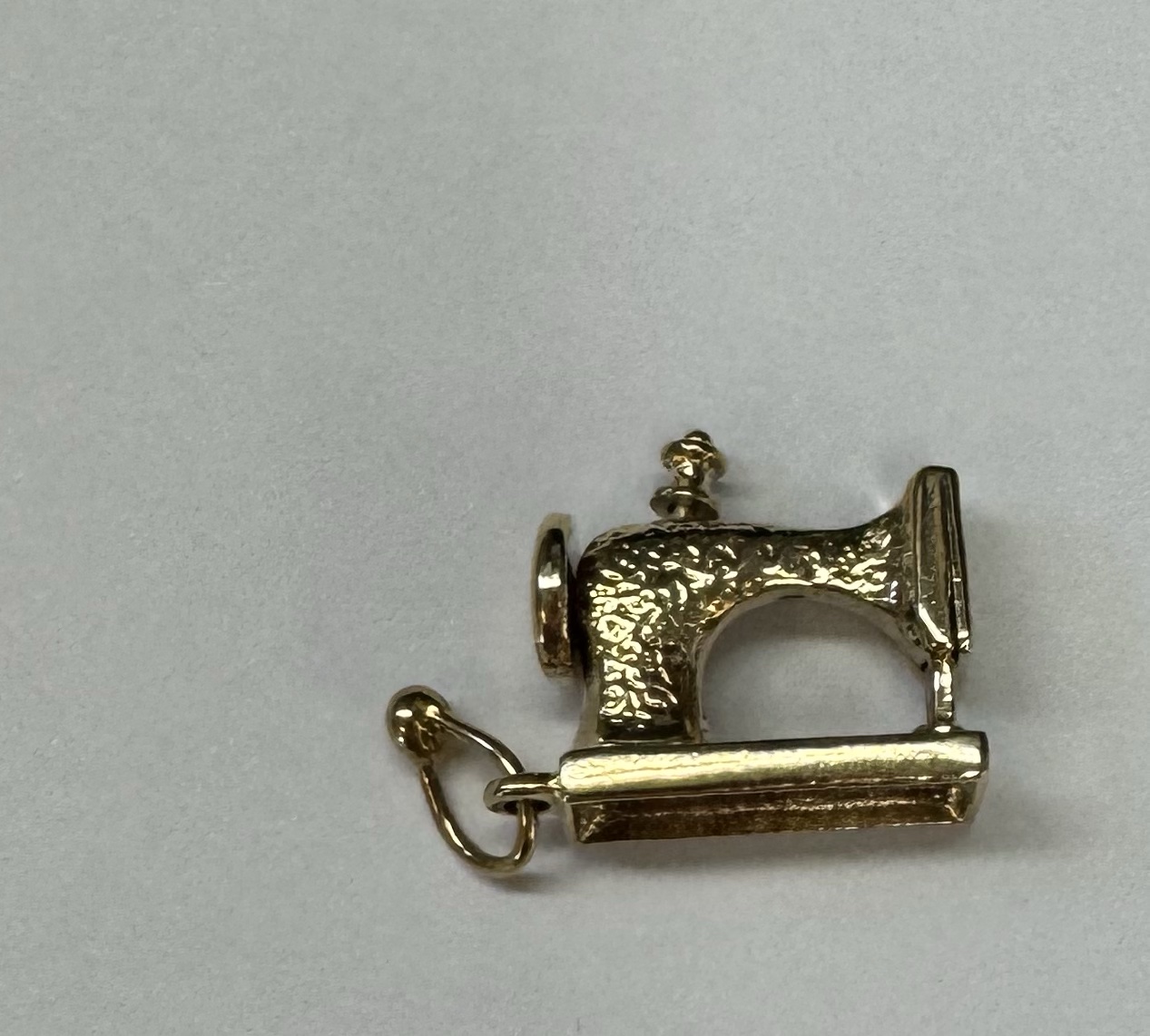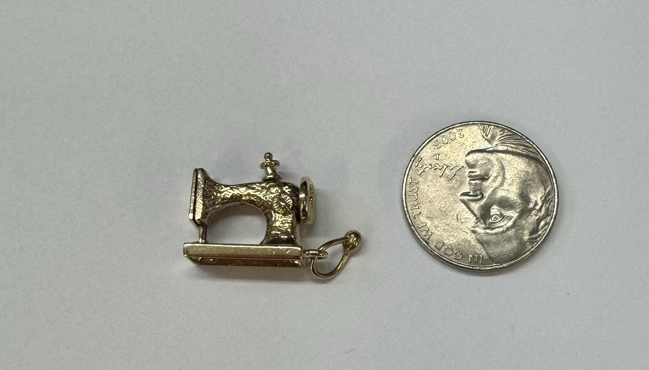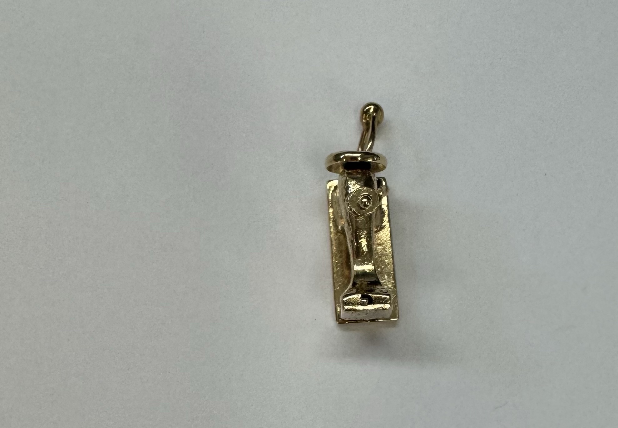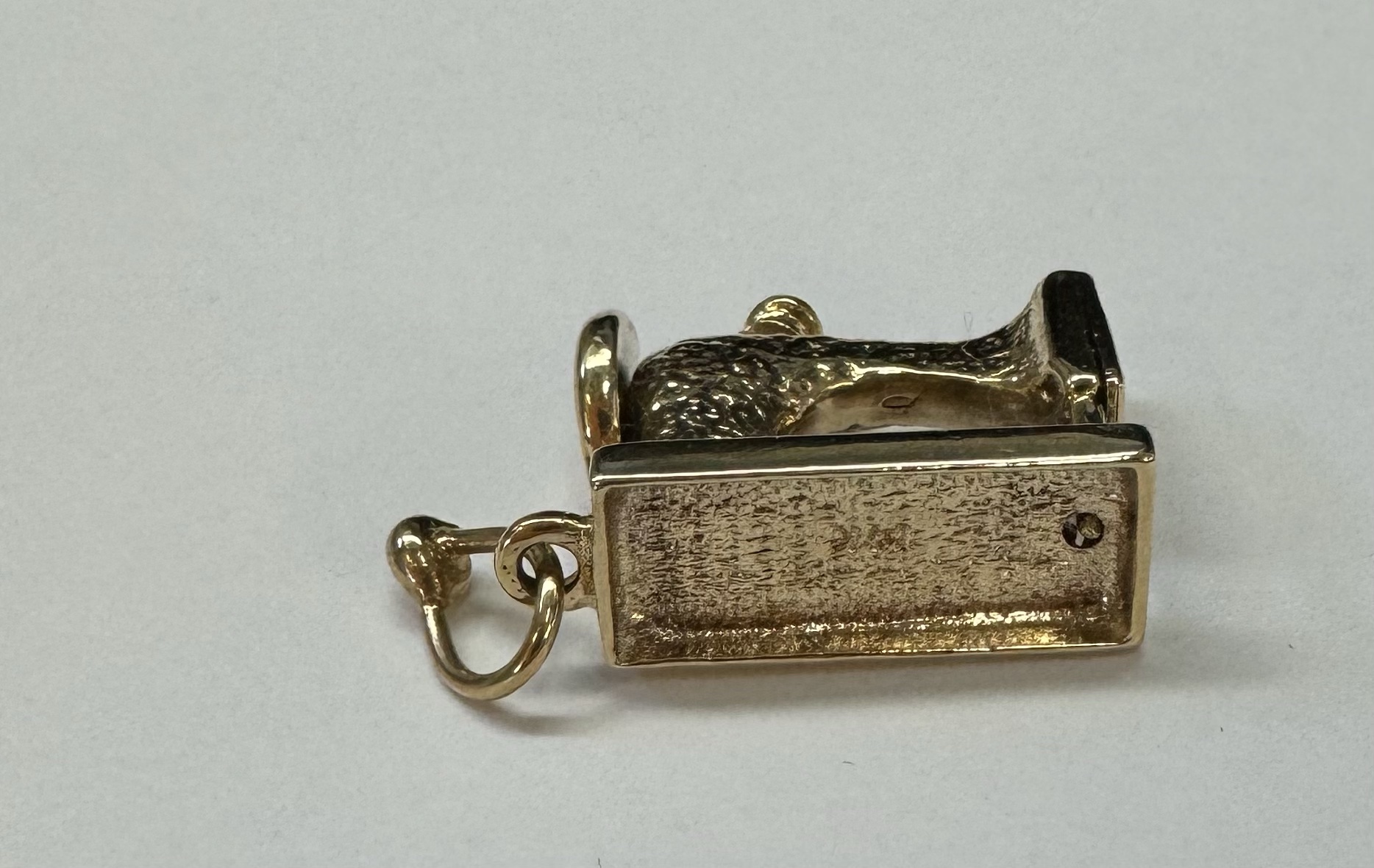 Vintage 14k yellow gold engraved Sewing machine charm/pendant. This piece has an entire weight of 5.0 grams.