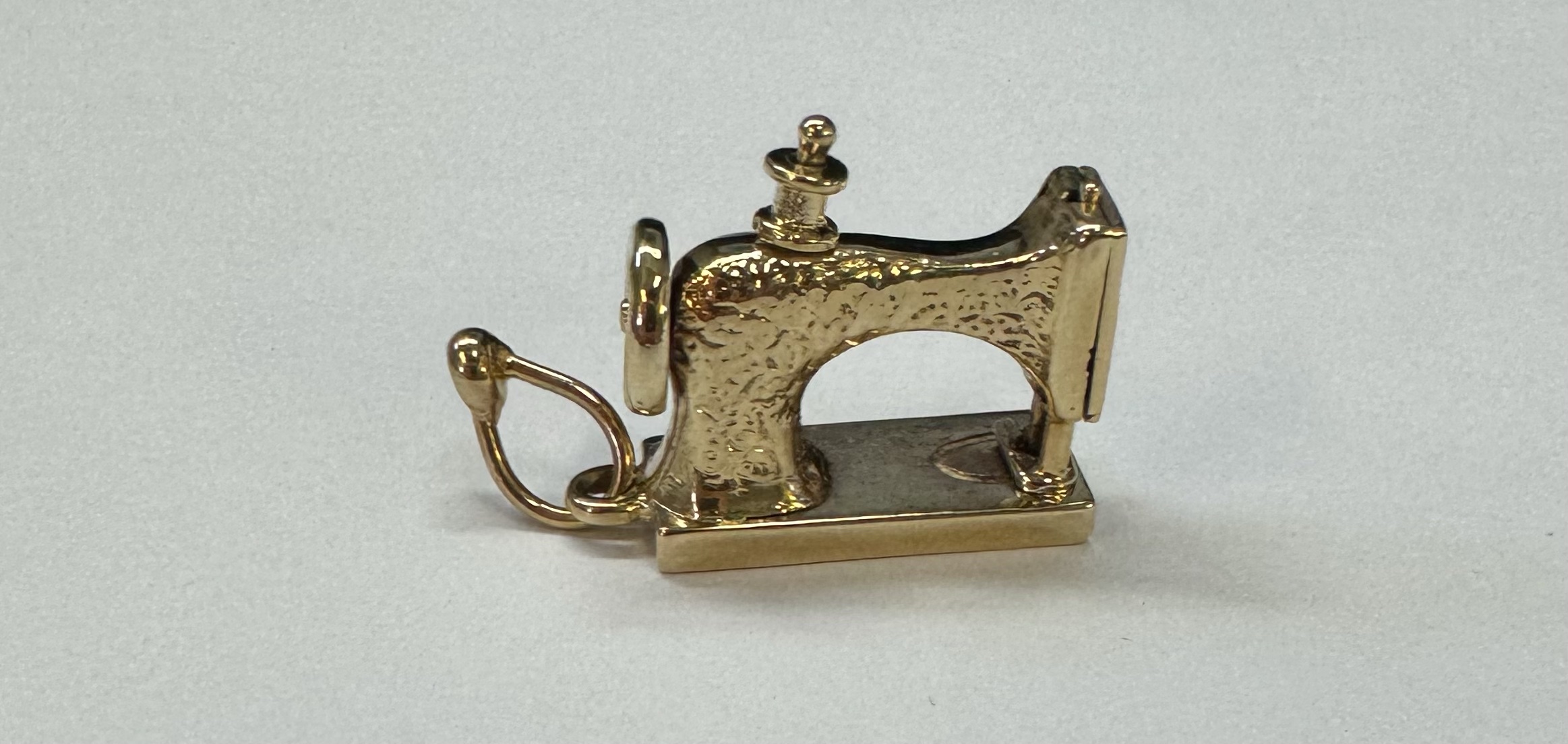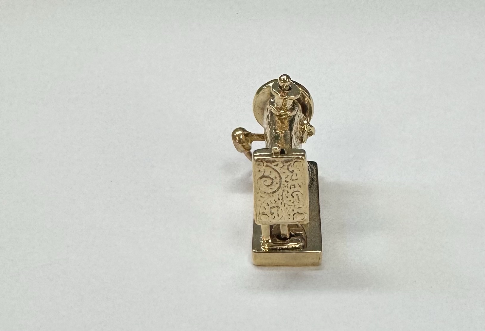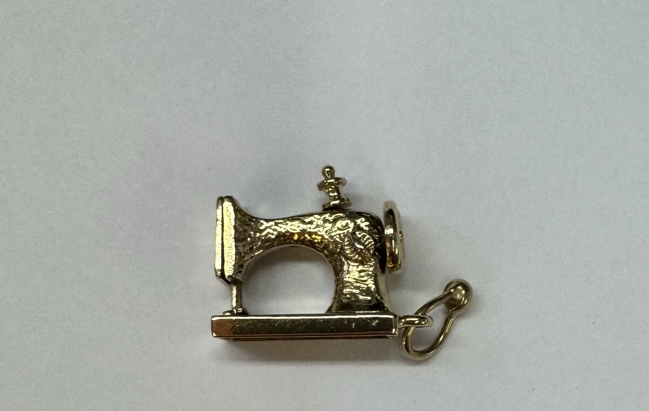 Vintage 14k yellow gold engraved Sewing machine charm/pendant. This piece has an entire weight of 5.0 grams.