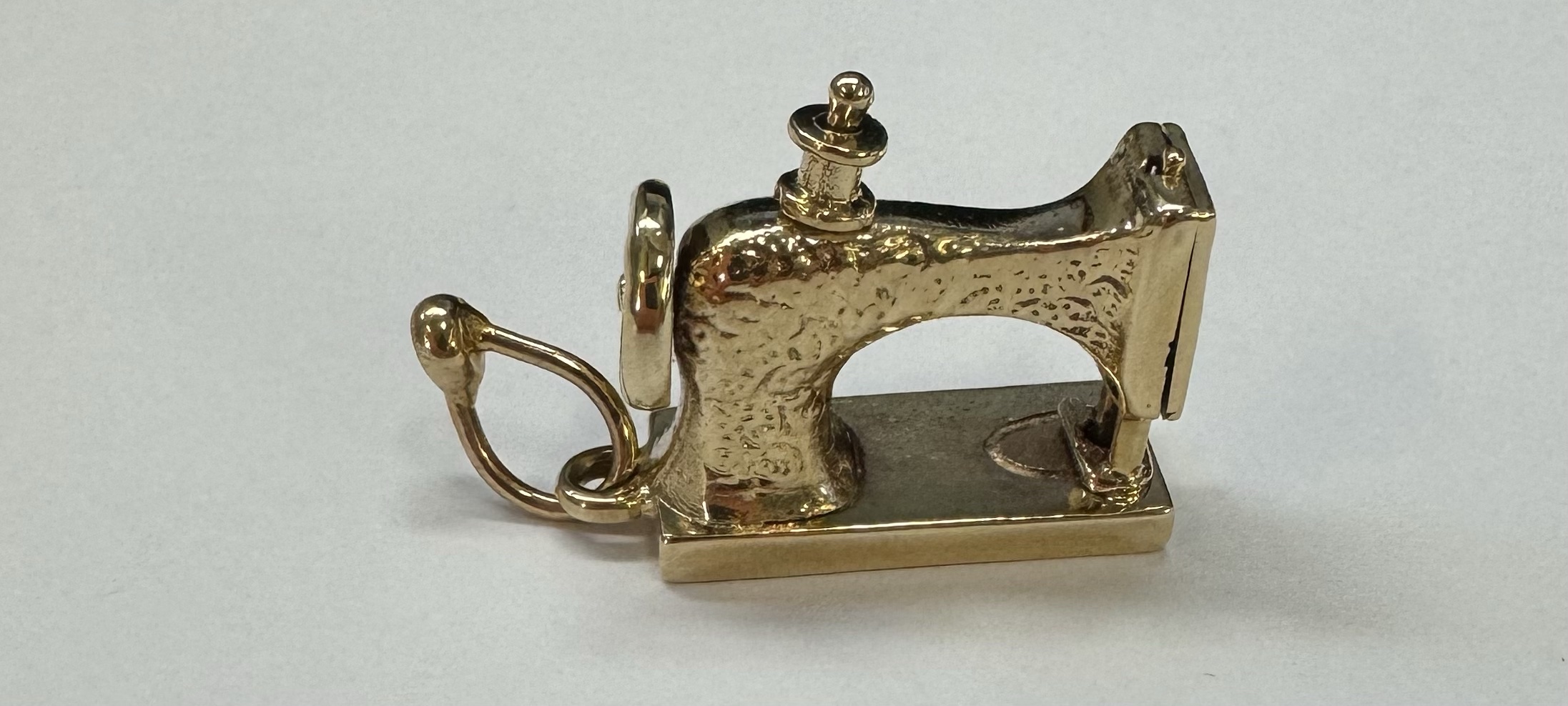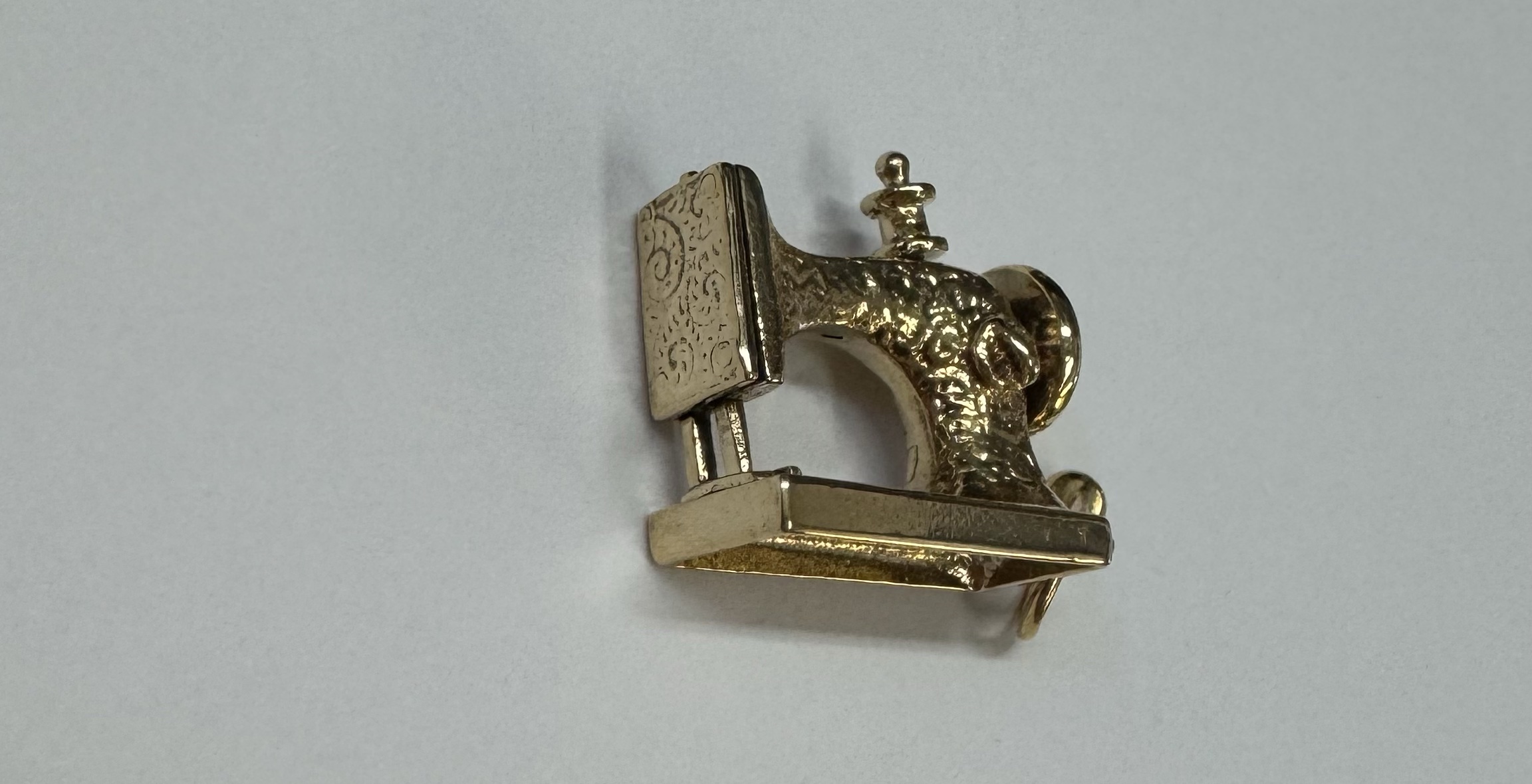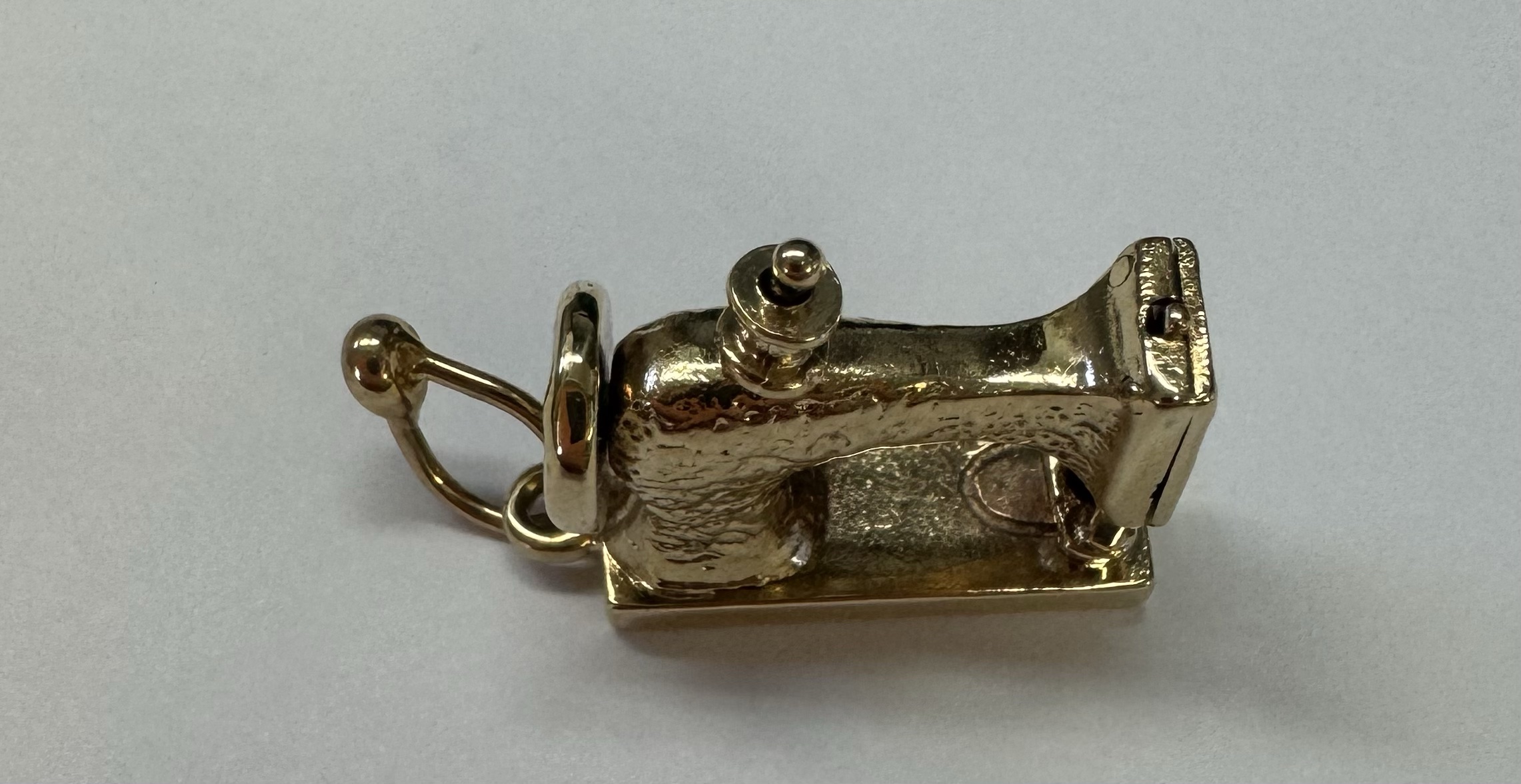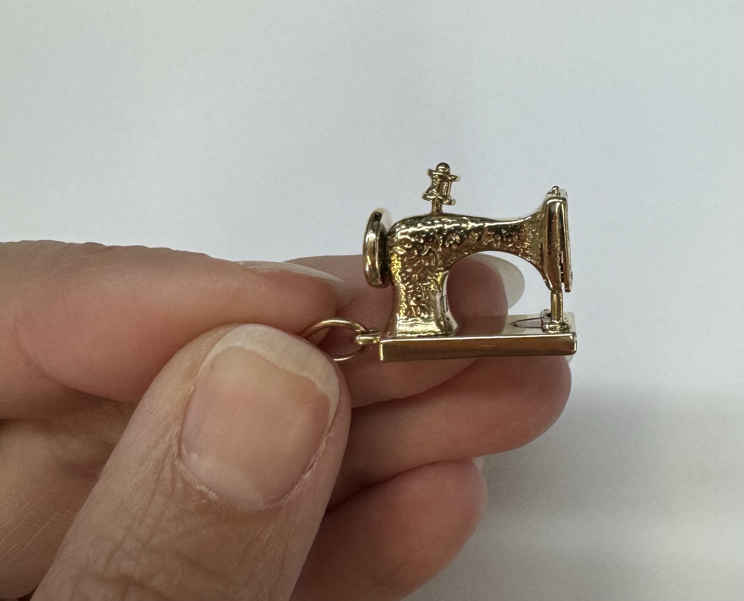 Vintage 14k yellow gold engraved Sewing machine charm/pendant. This piece has an entire weight of 5.0 grams.