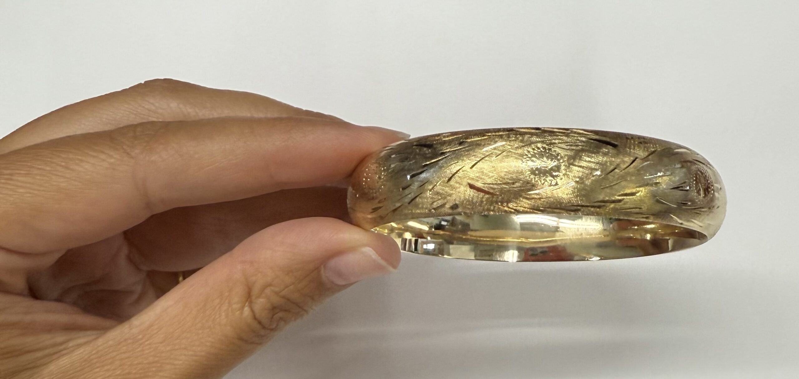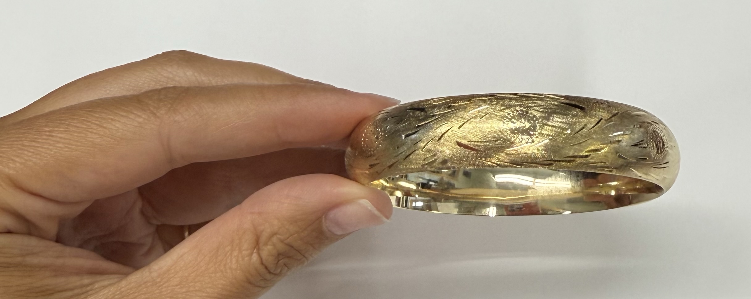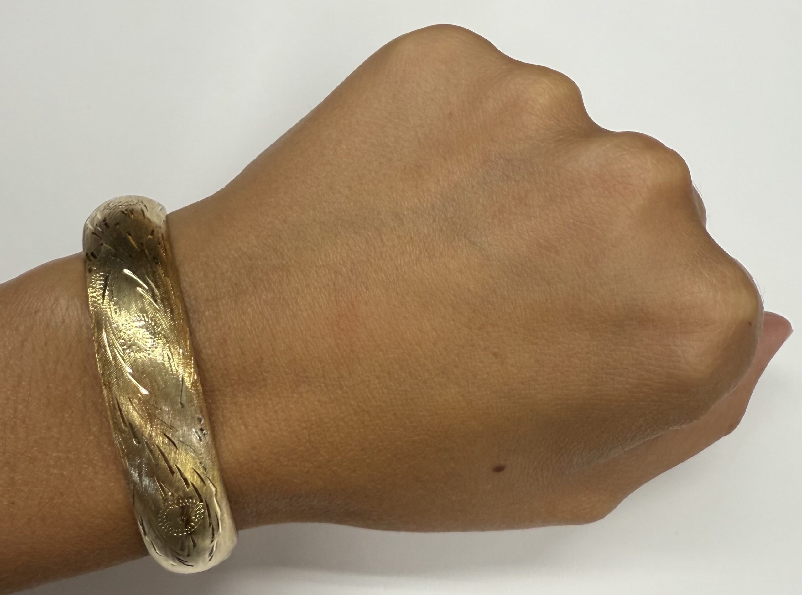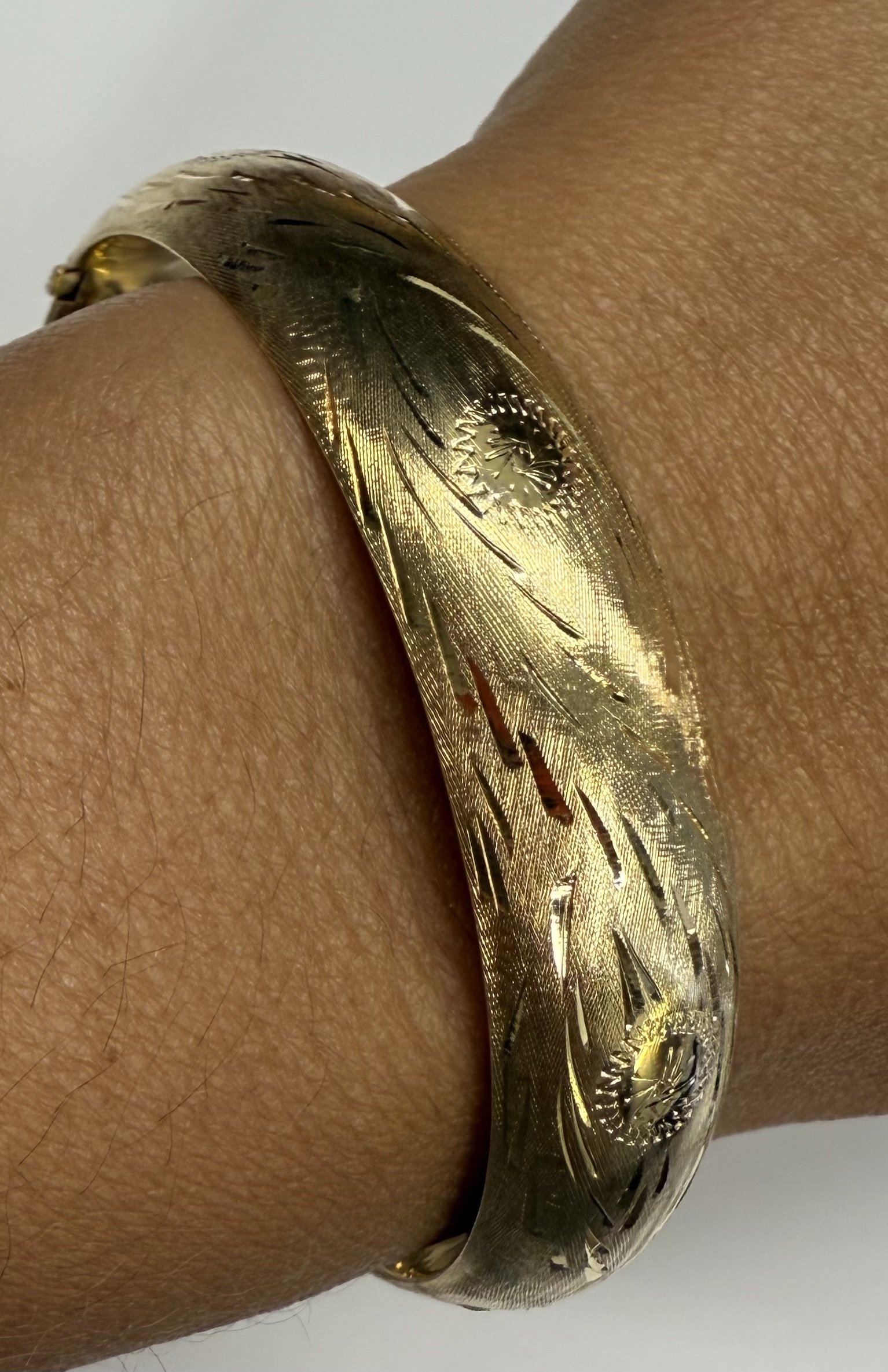 Vintage 14k yellow gold oval shaped 13.57 mm engraved, hinged bangle bracelet, 8″ (around the outside), 19.0 grams @$1,995 (only one like this available!)