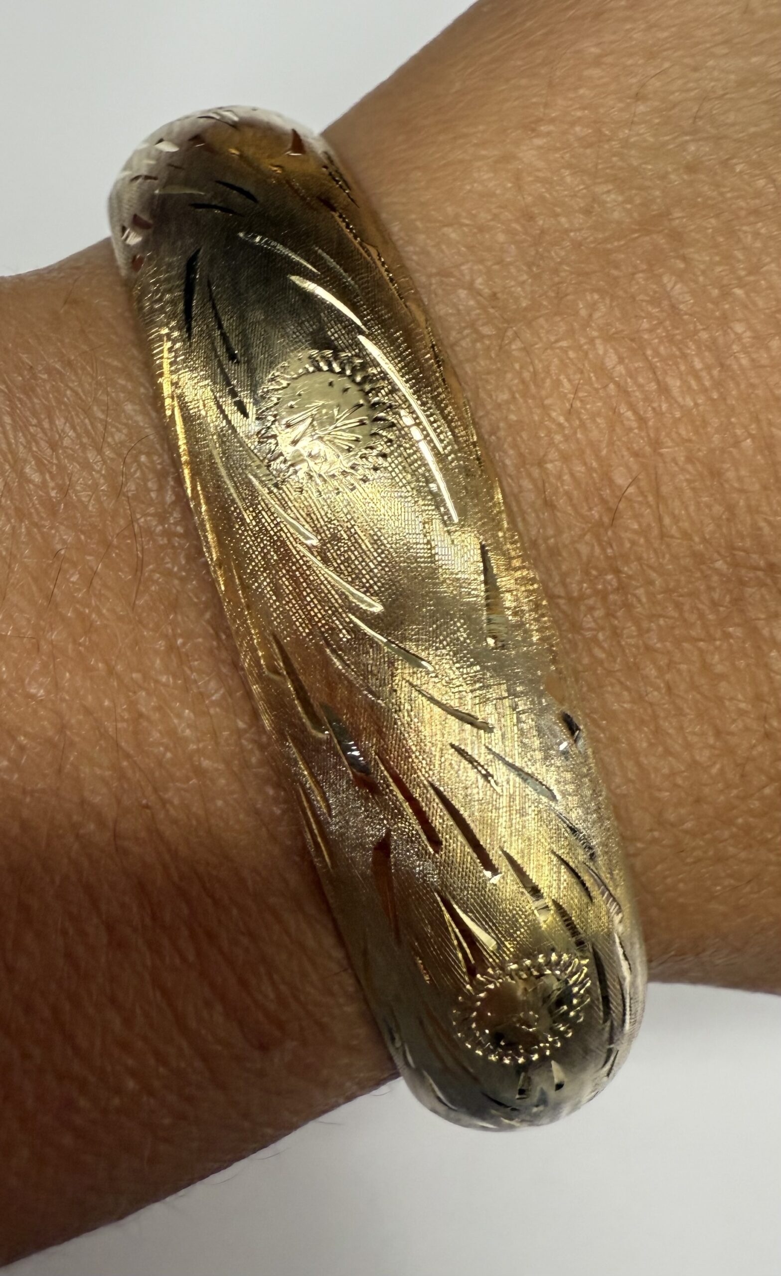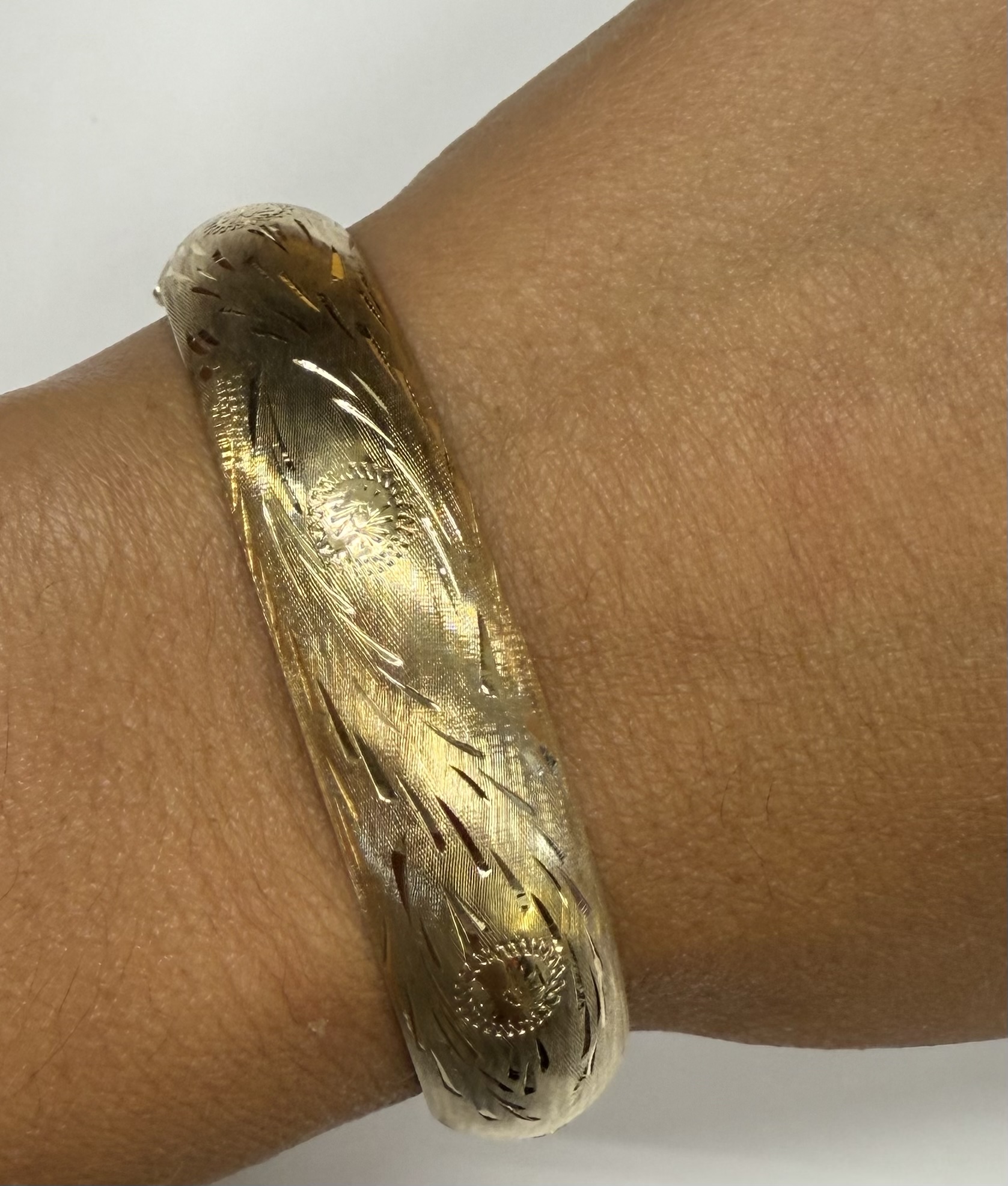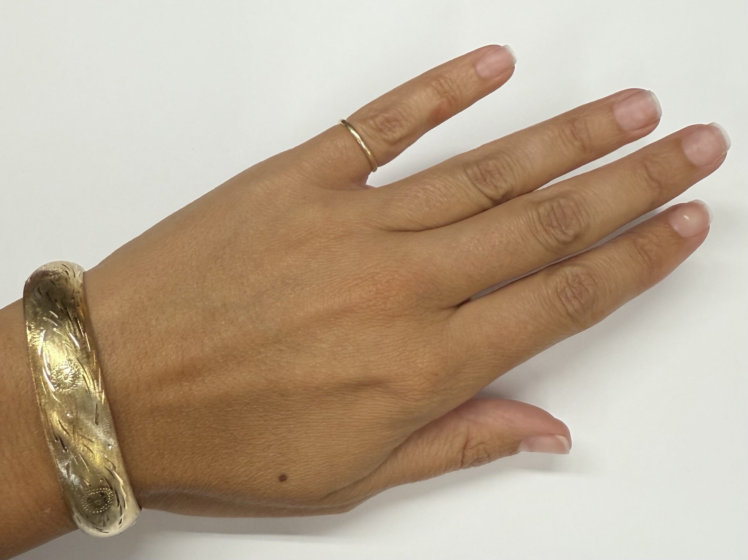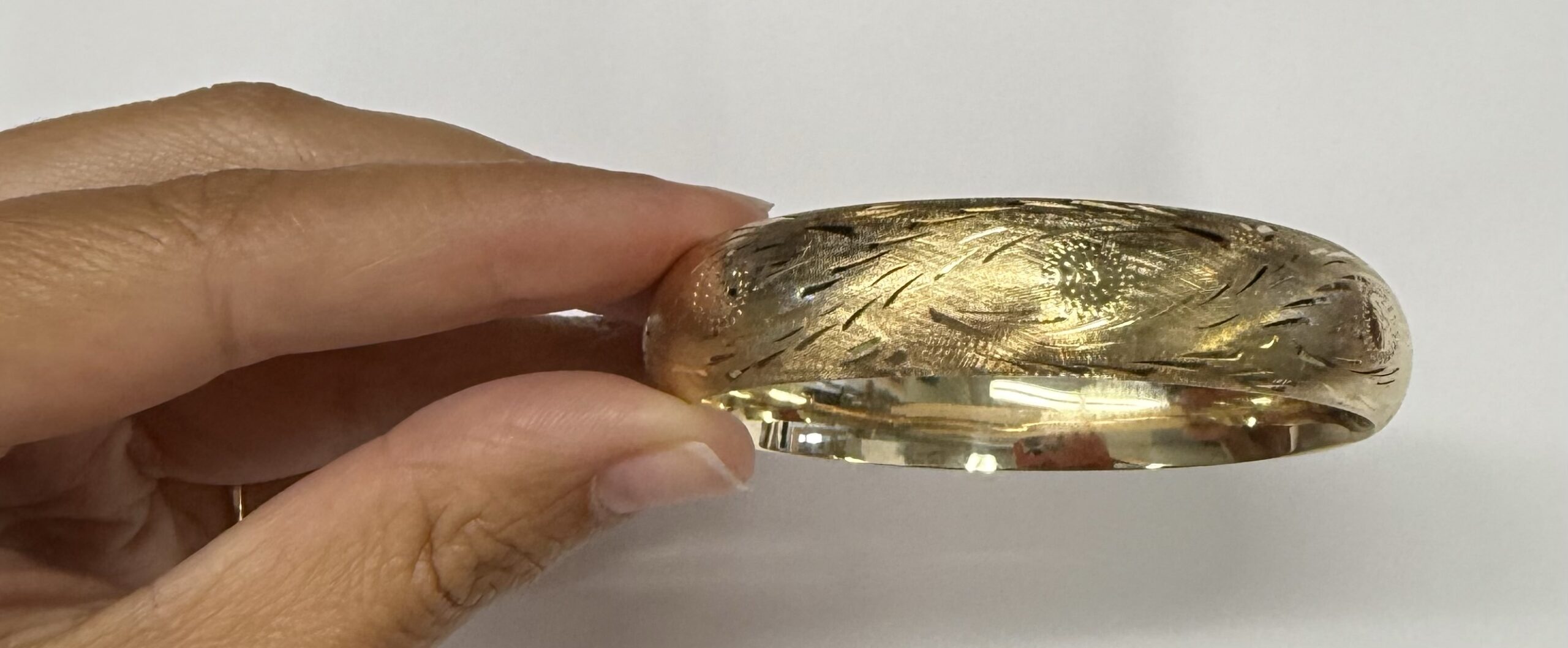 Vintage 14k yellow gold oval shaped 13.57 mm engraved, hinged bangle bracelet, 8″ (around the outside), 19.0 grams @$1,995 (only one like this available!)
