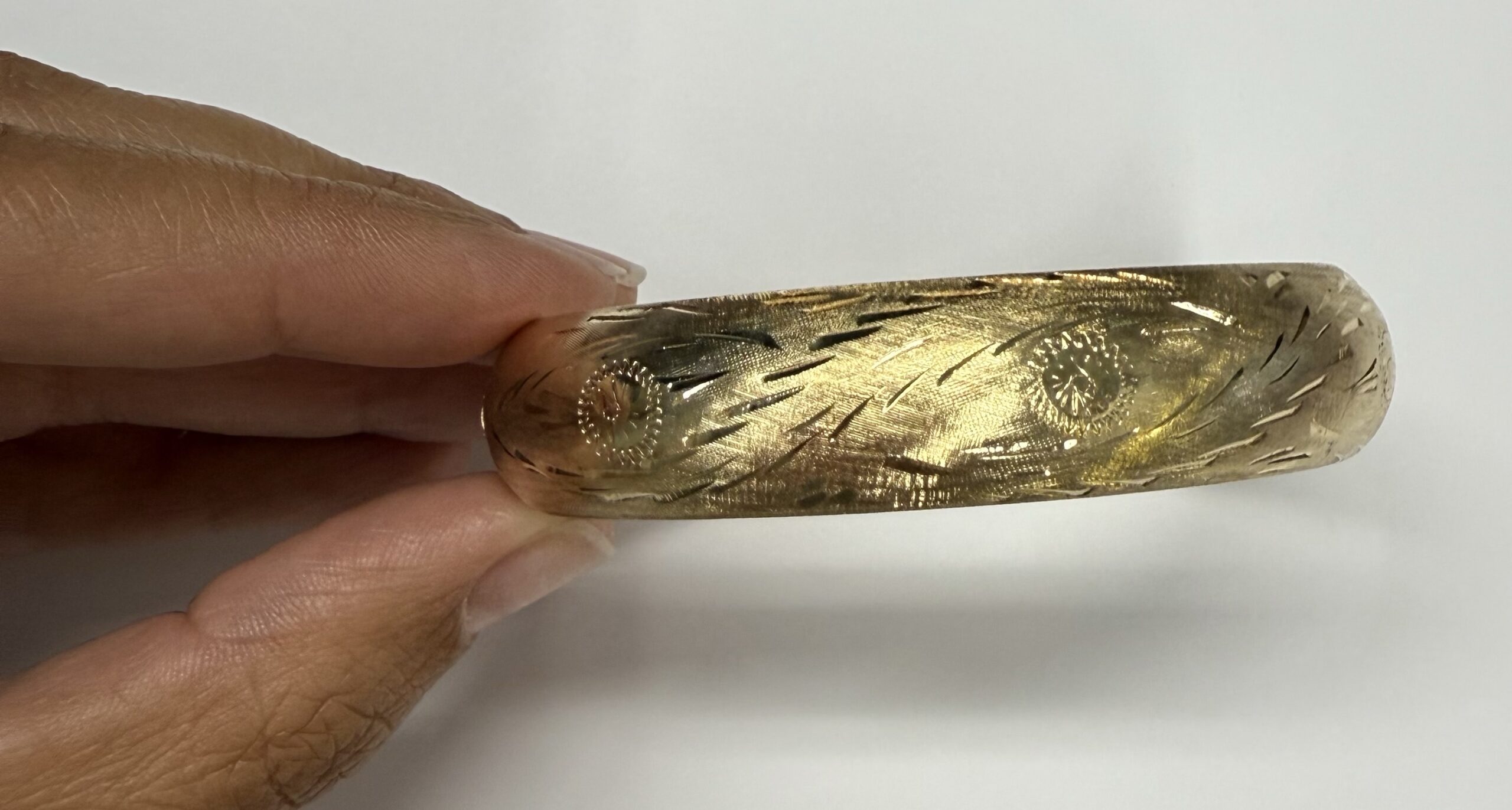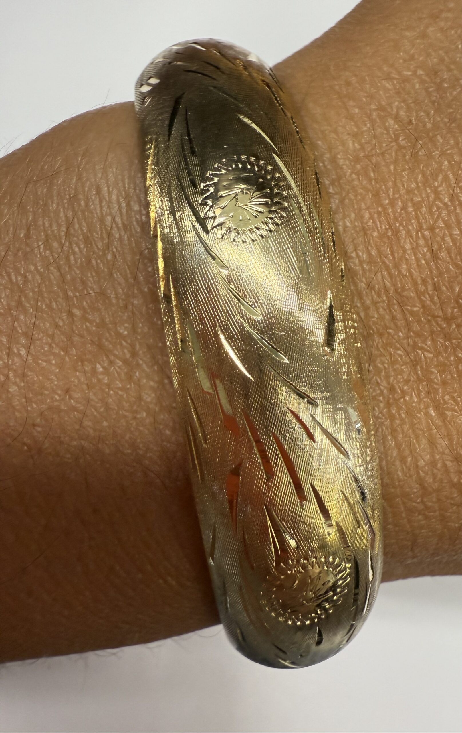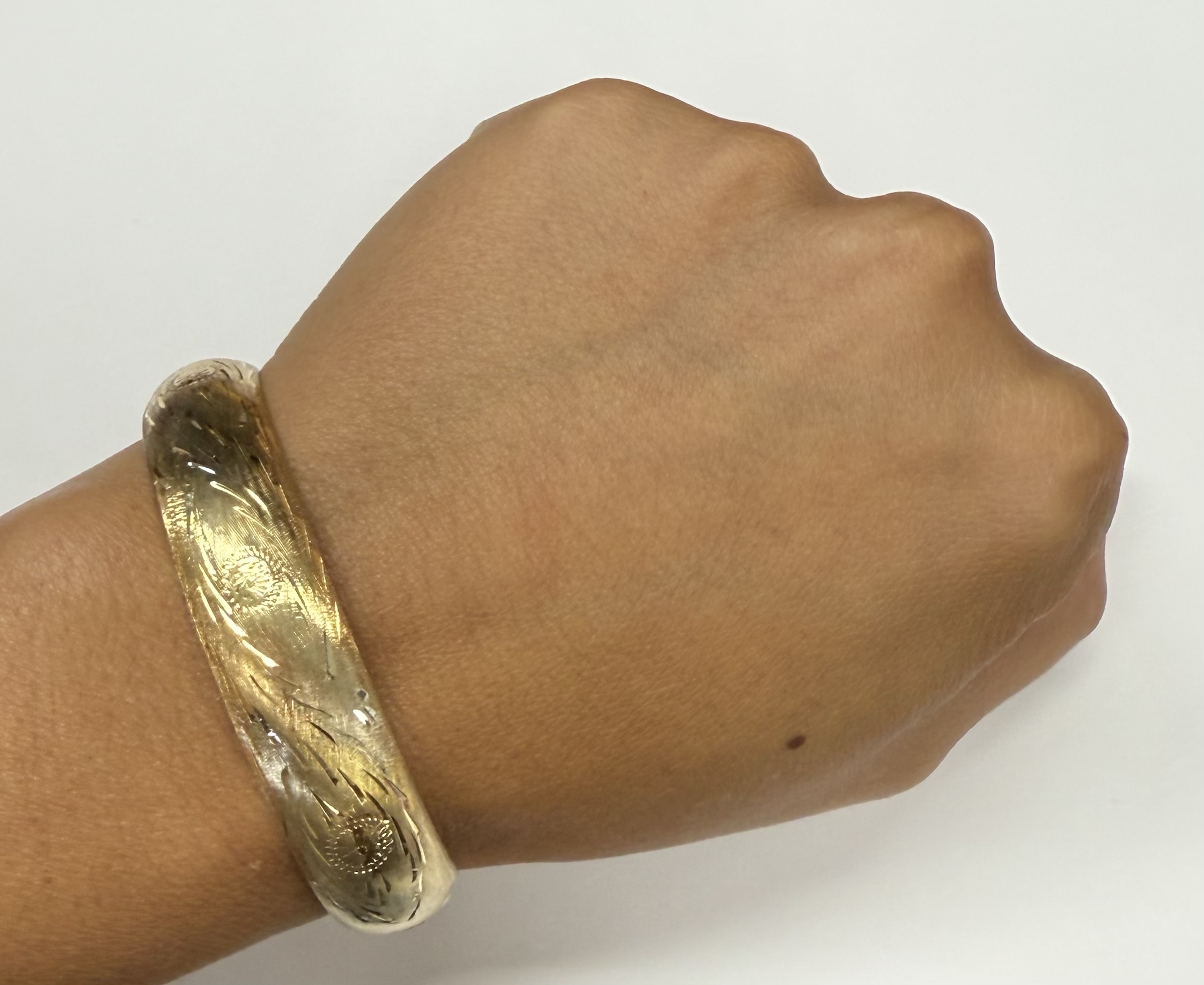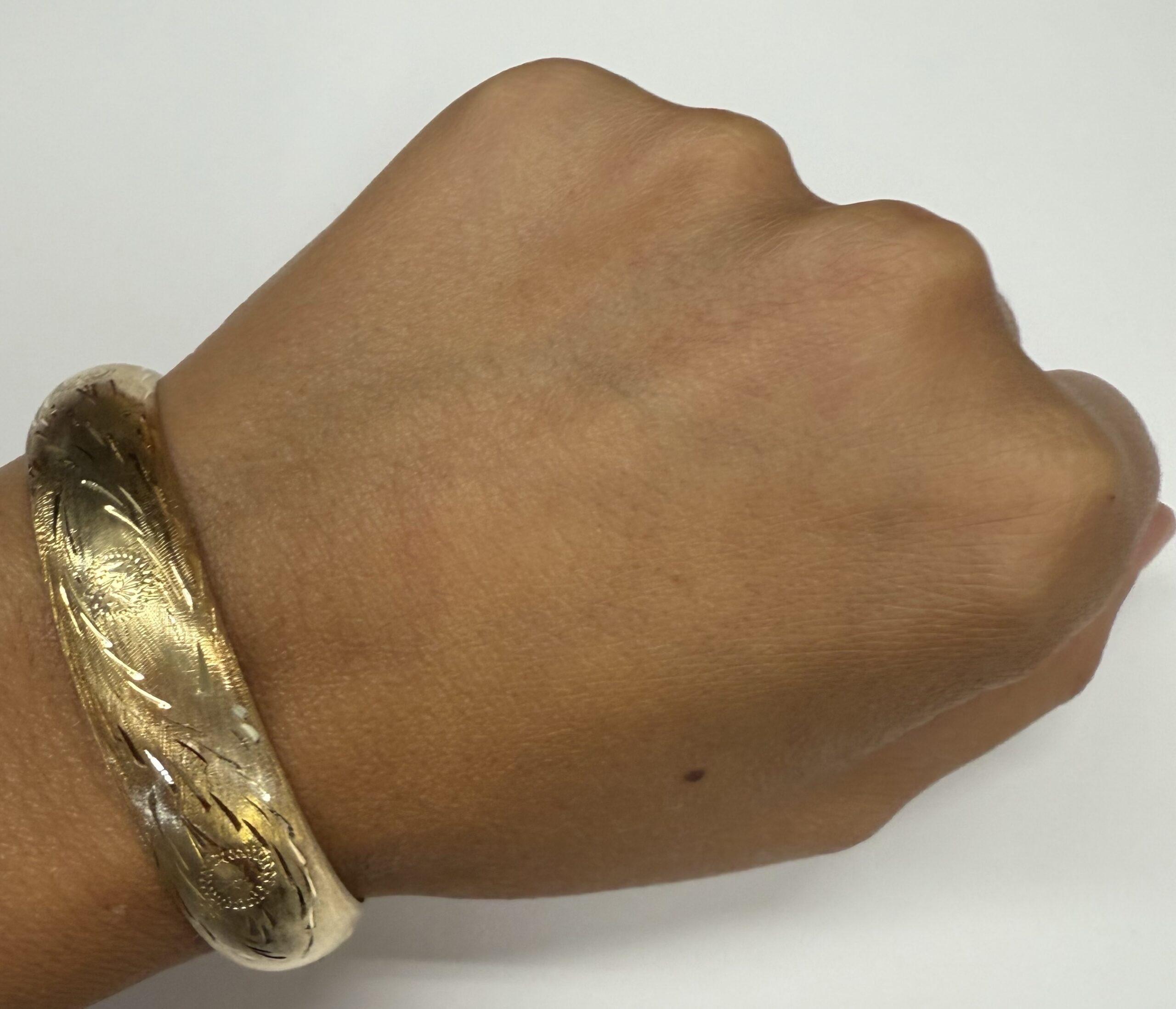 Vintage 14k yellow gold oval shaped 13.57 mm engraved, hinged bangle bracelet, 8″ (around the outside), 19.0 grams @$1,995 (only one like this available!)