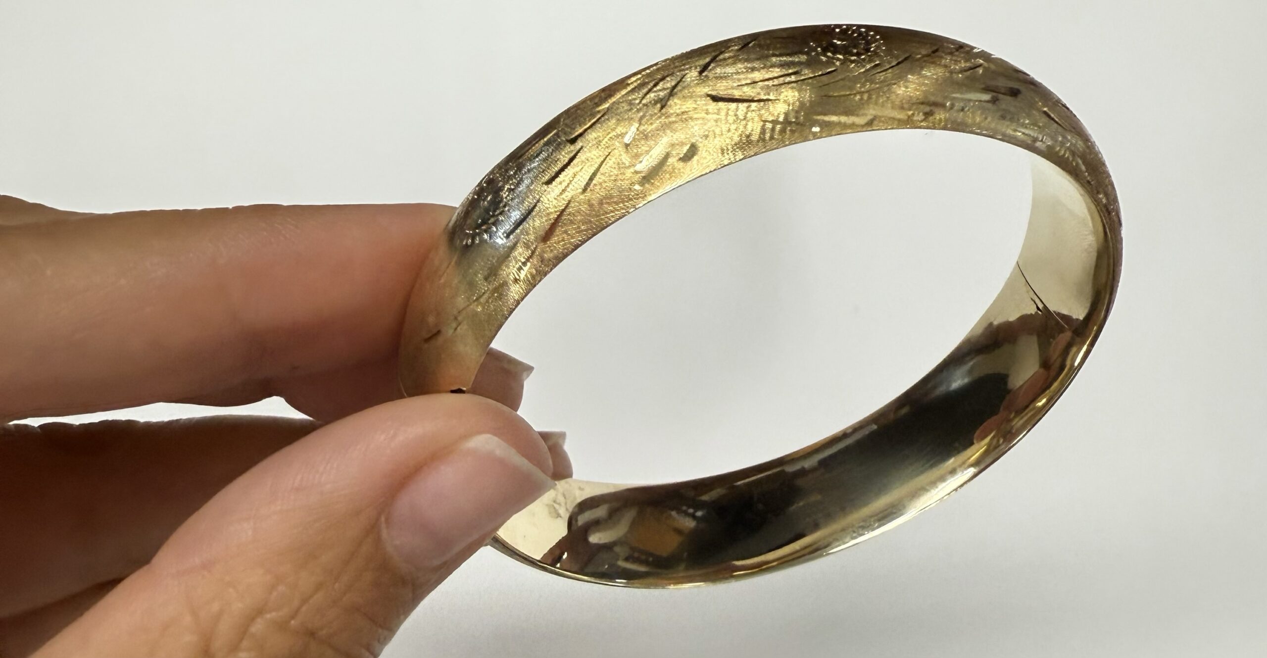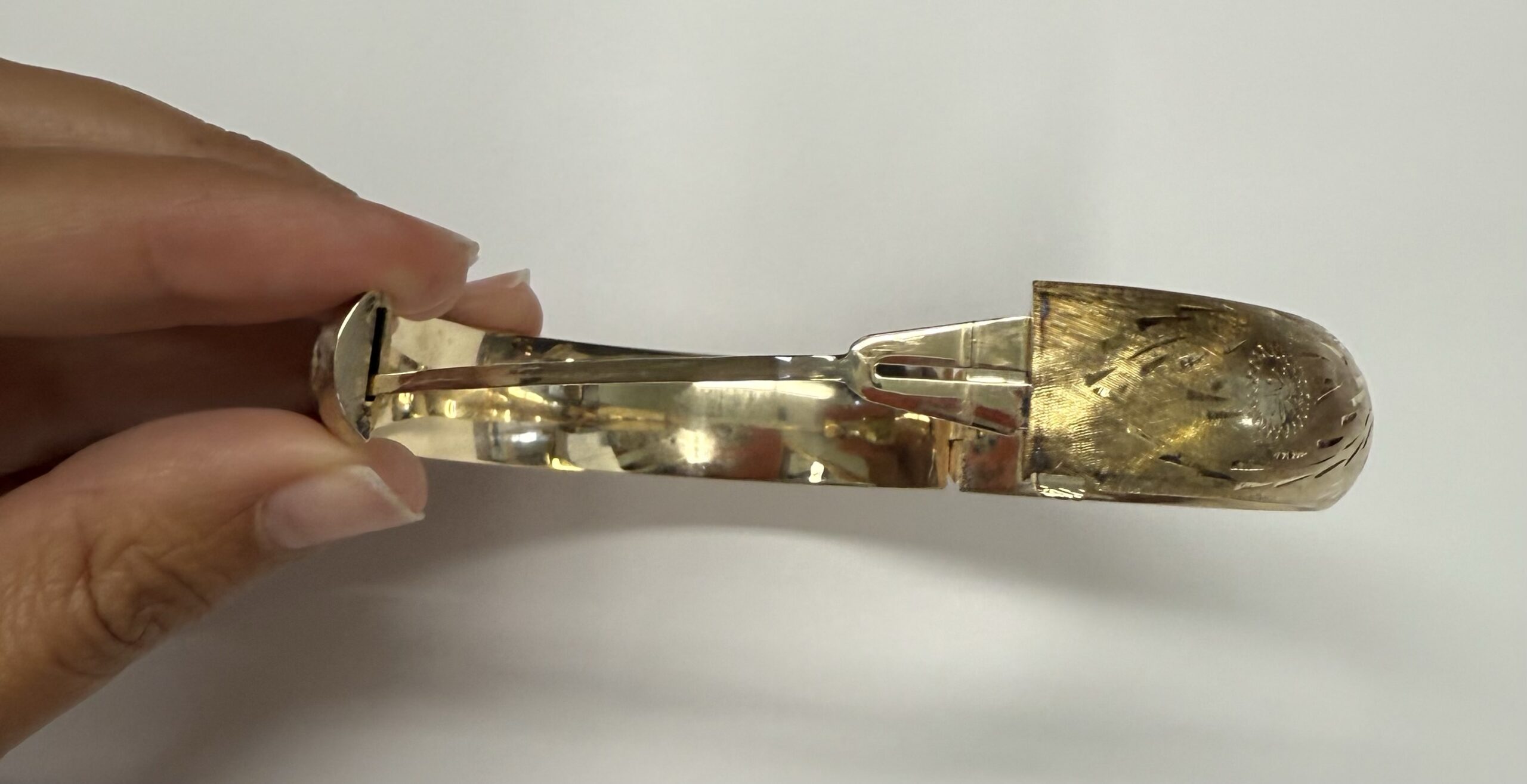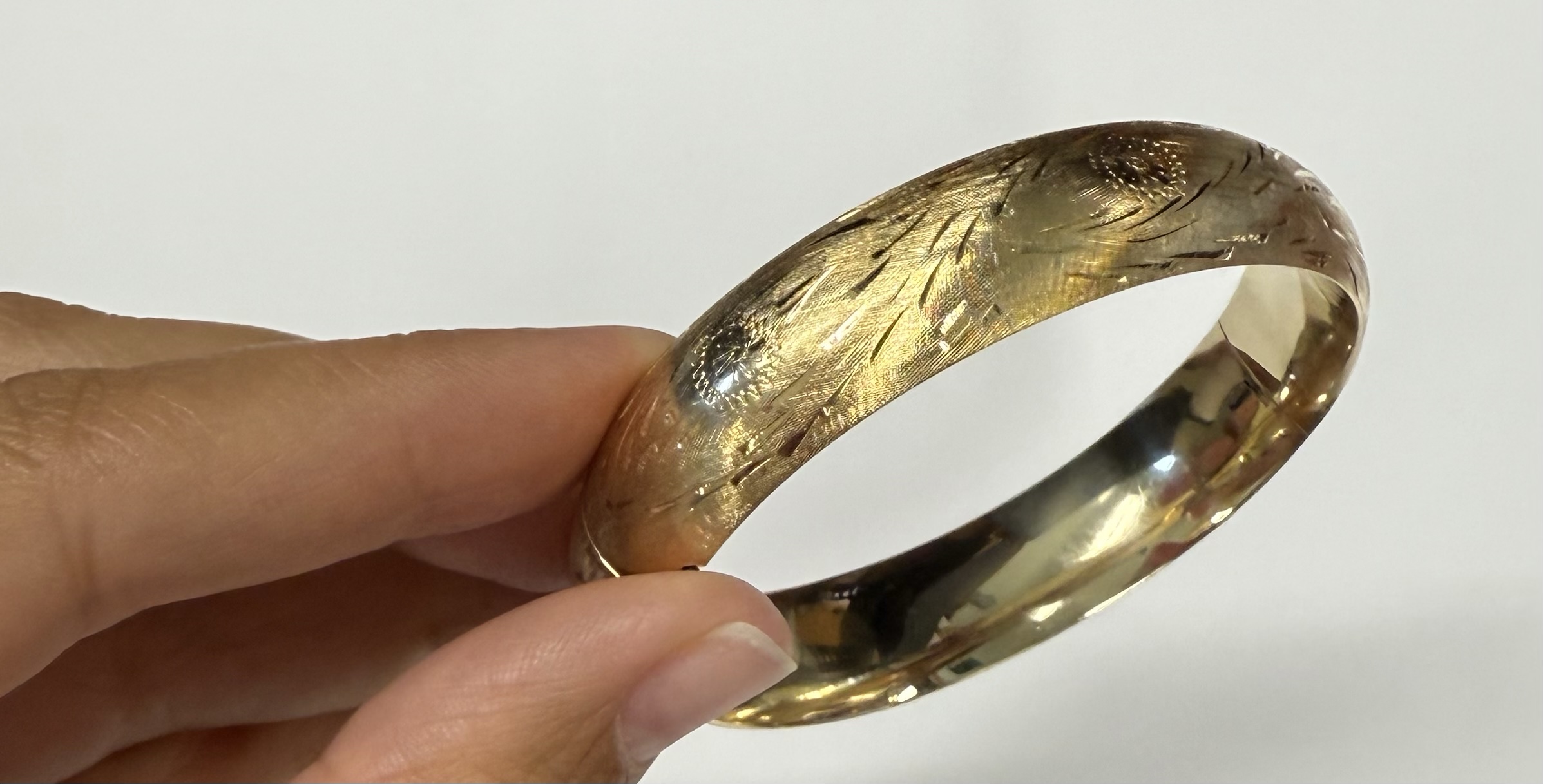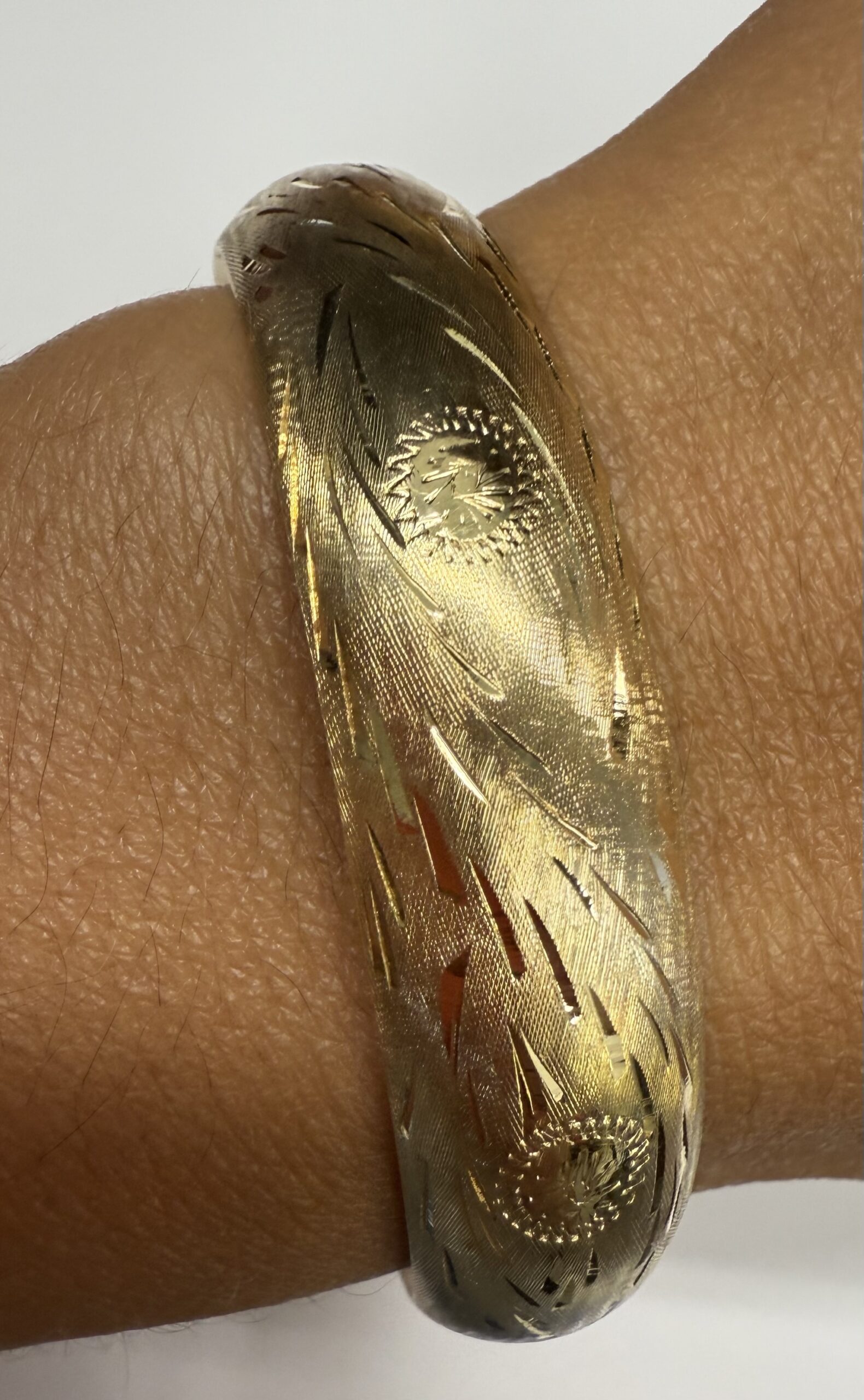Vintage 14k yellow gold oval shaped 13.57 mm engraved, hinged bangle bracelet, 8″ (around the outside), 19.0 grams @$1,995 (only one like this available!)