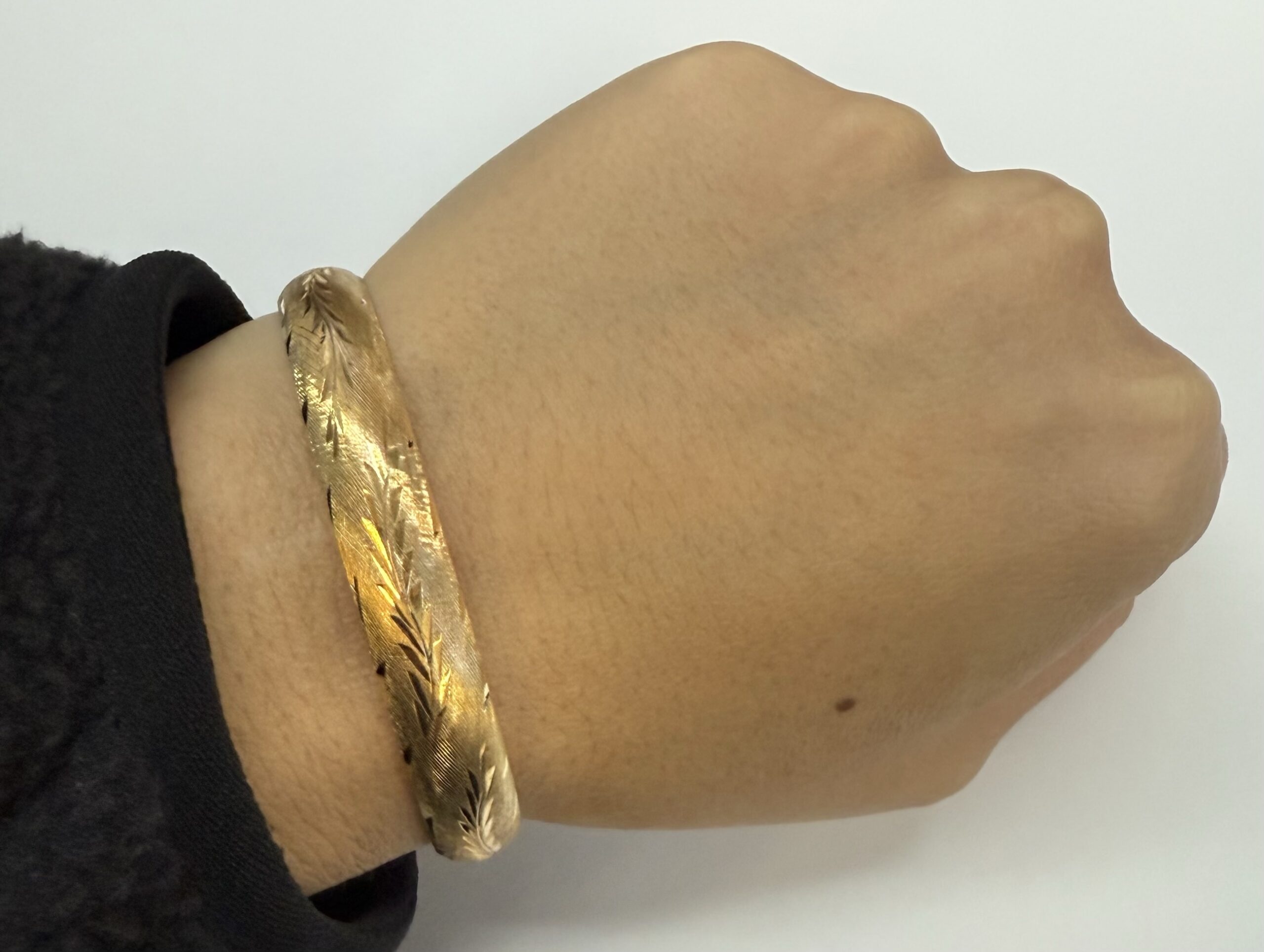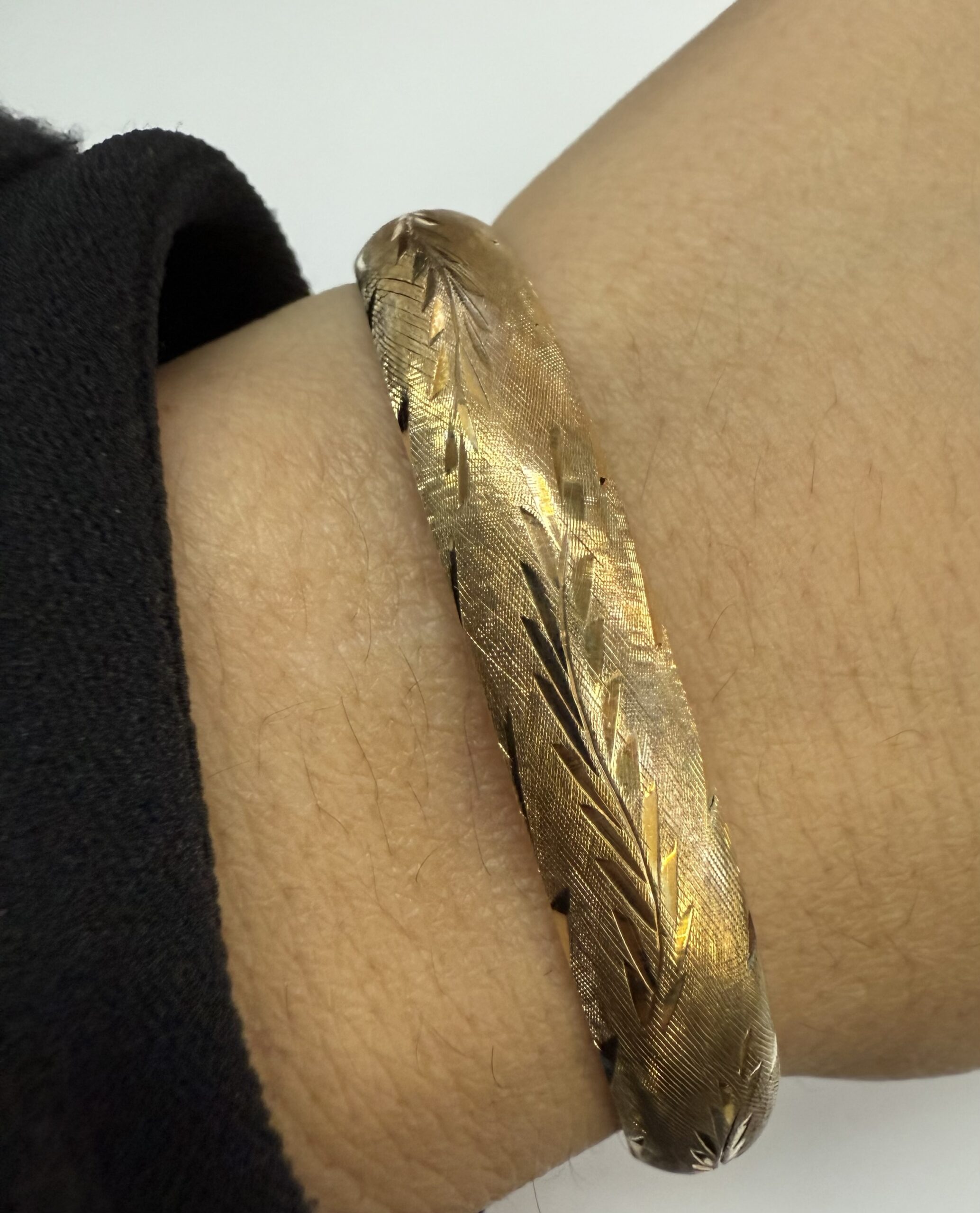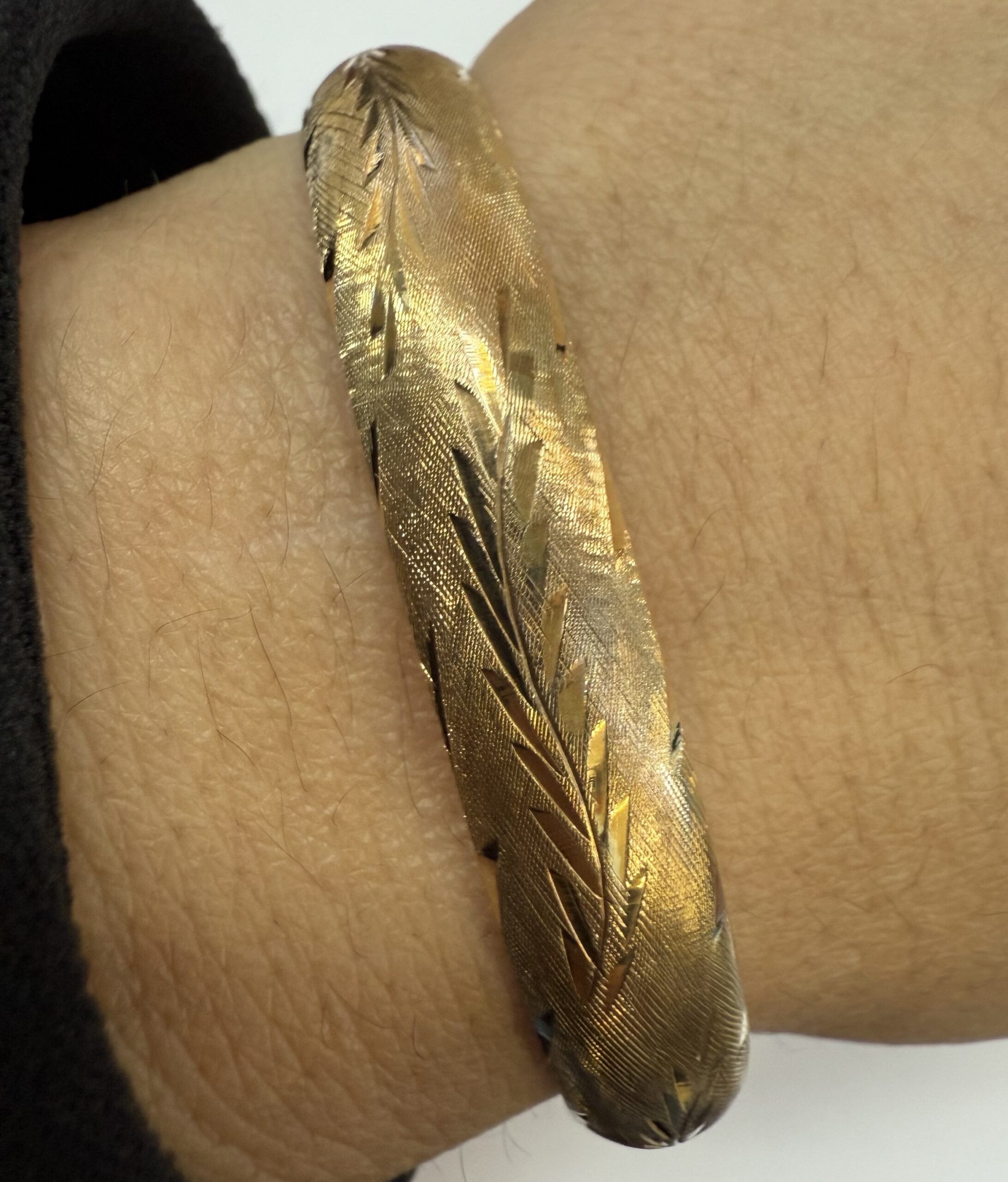 Vintage 14k yellow gold engraved hinged bangle bracelet. This bracelet measures 9.2 mm in width, 7 3/4″ in length around the outside, and it has an entire weight of 11.8 grams.