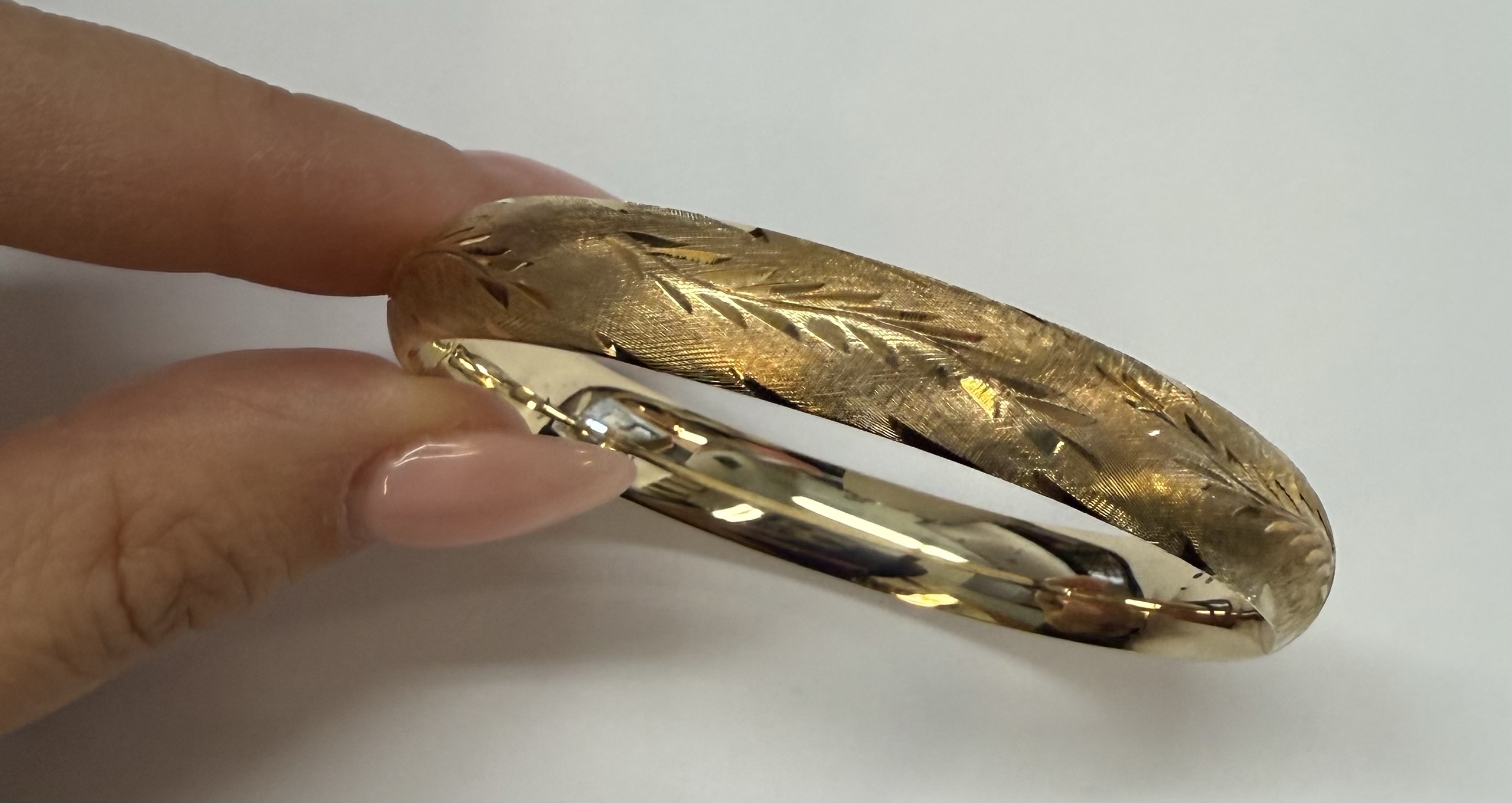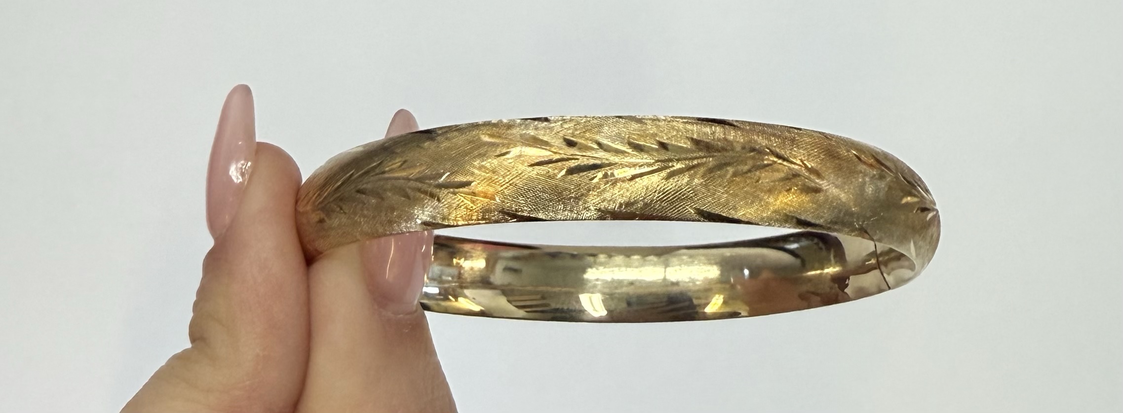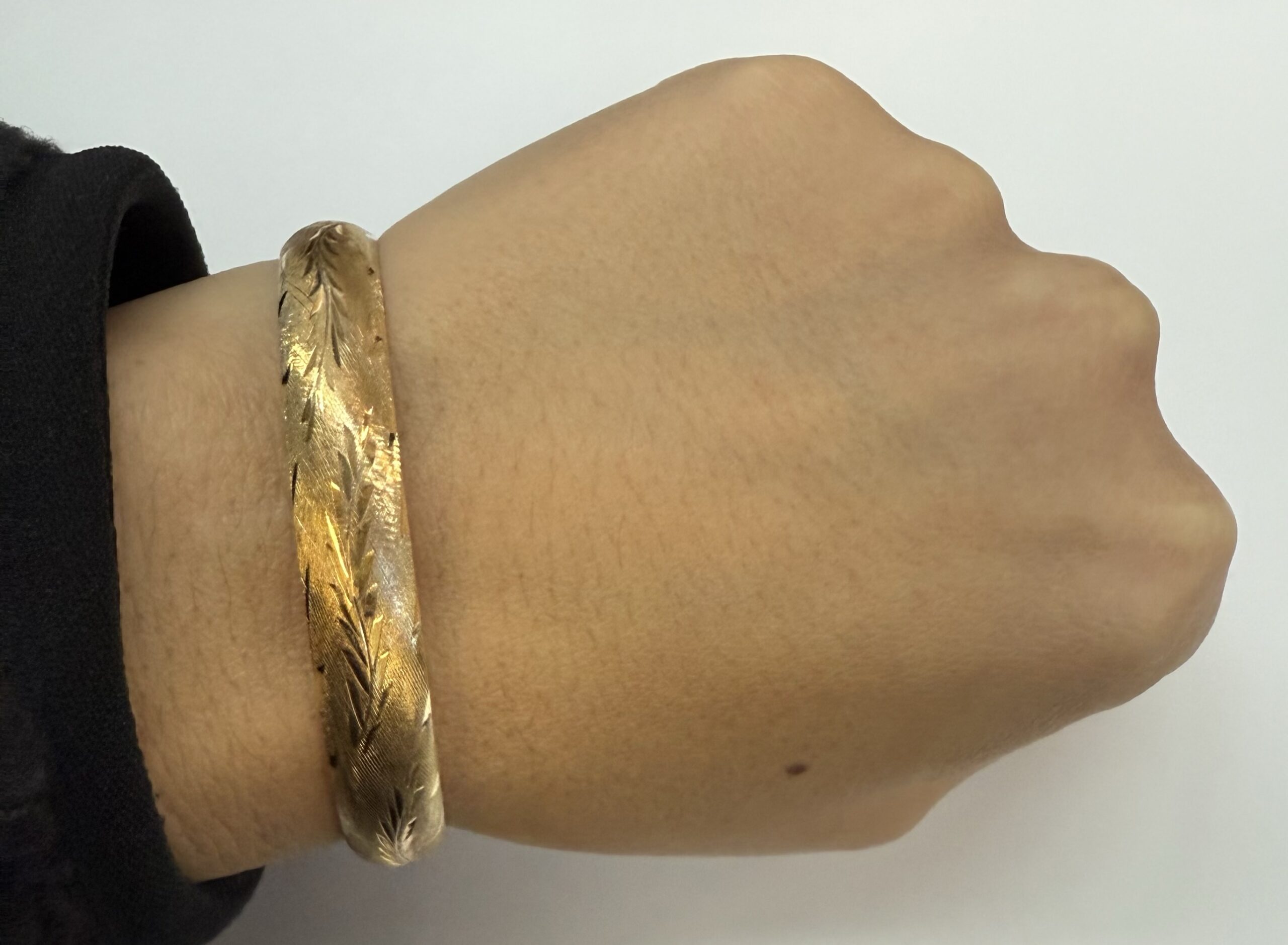Vintage 14k yellow gold engraved hinged bangle bracelet. This bracelet measures 9.2 mm in width, 7 3/4″ in length around the outside, and it has an entire weight of 11.8 grams.