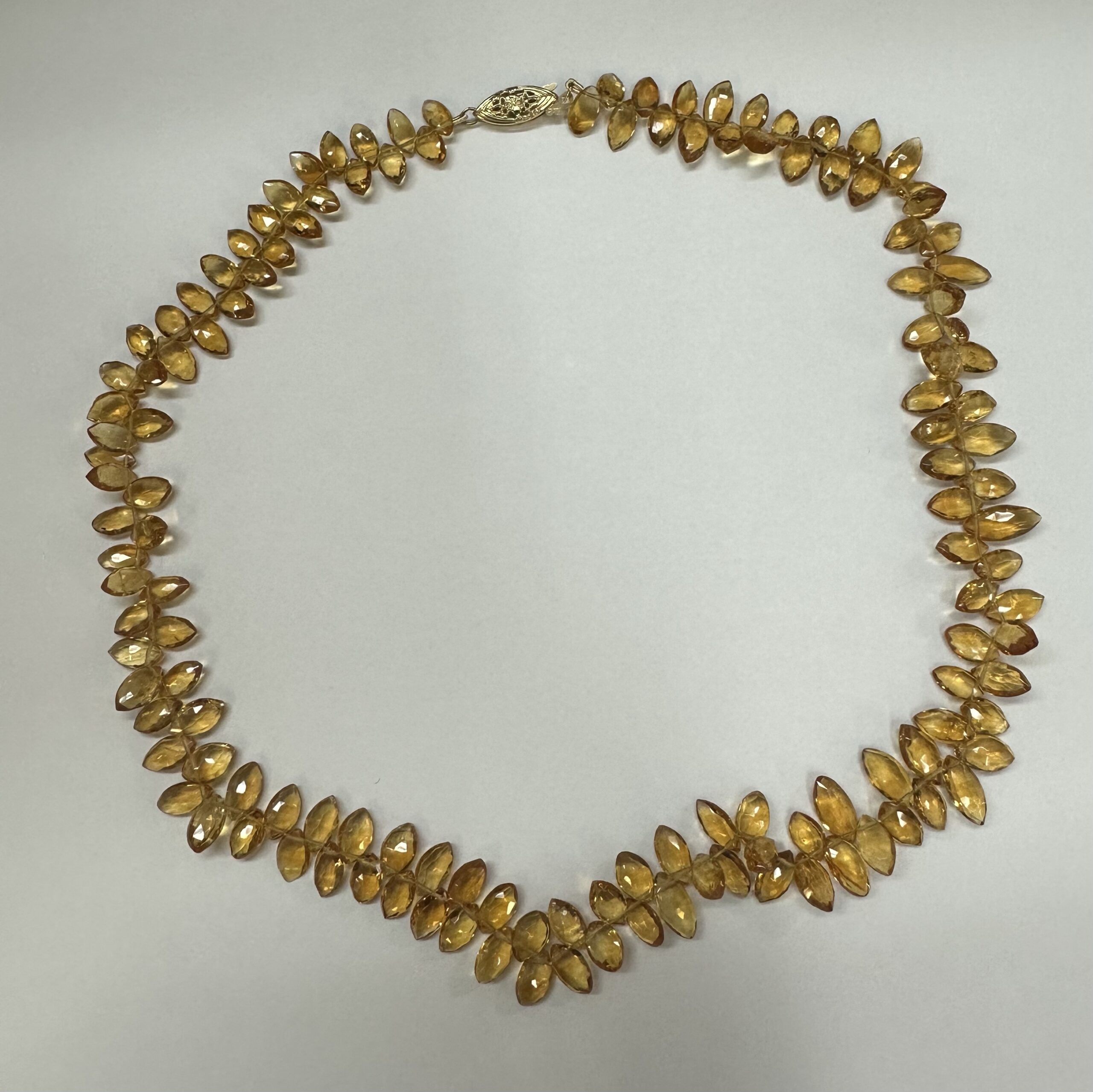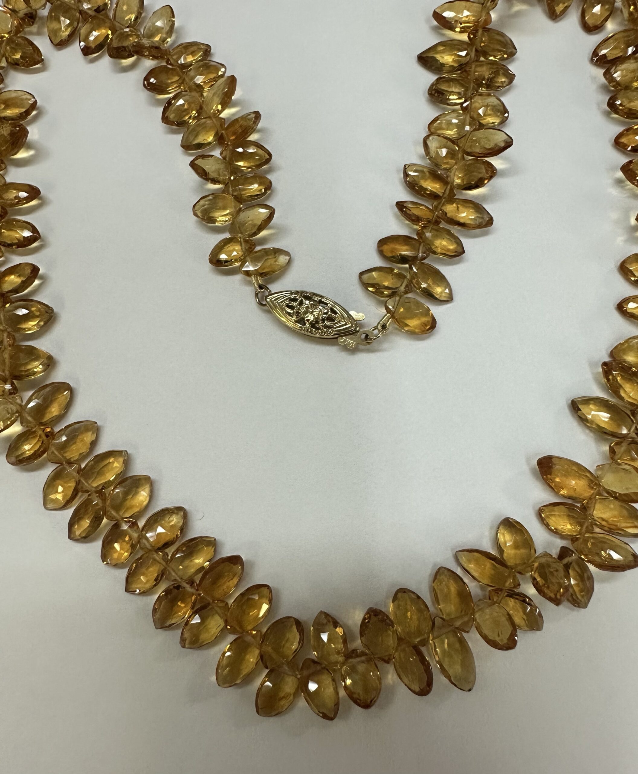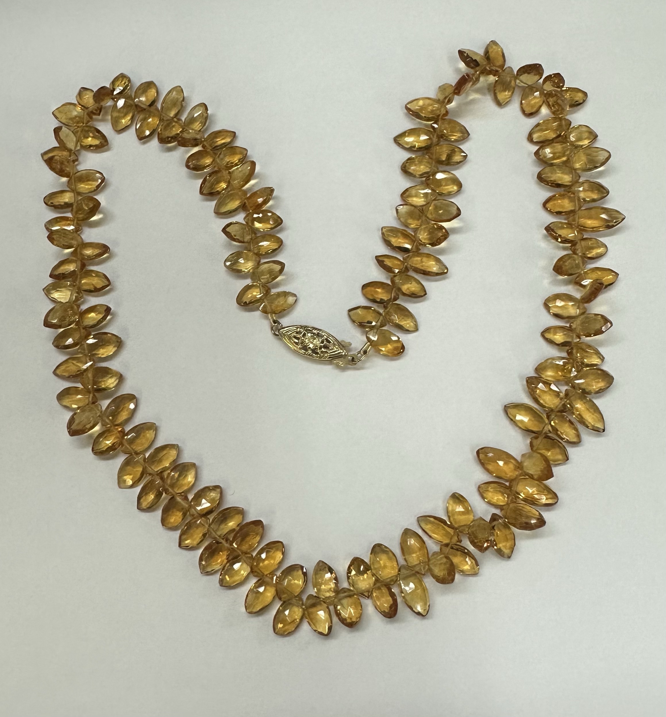 Vintage genuine marquise shaped, faceted Citrine (November birthstone) bead 16” strand terminated by a 14k yellow gold filigree clasp. Only one available.