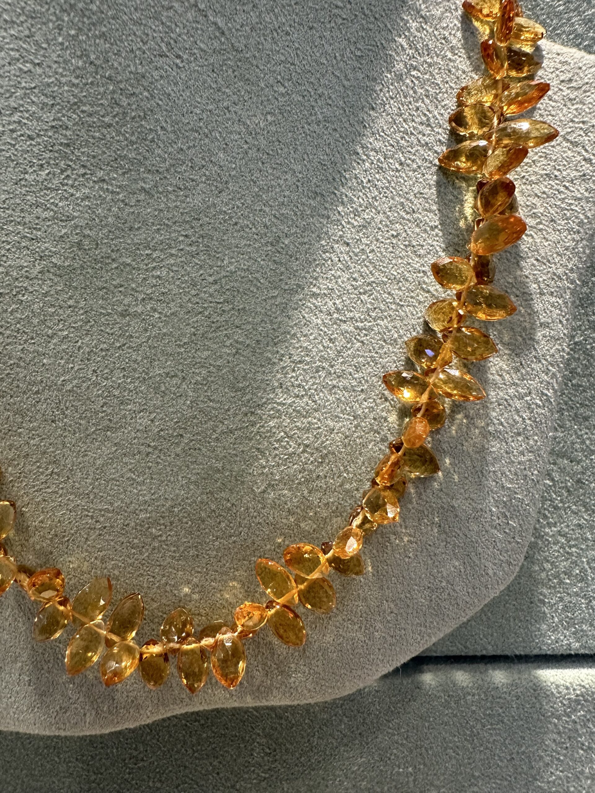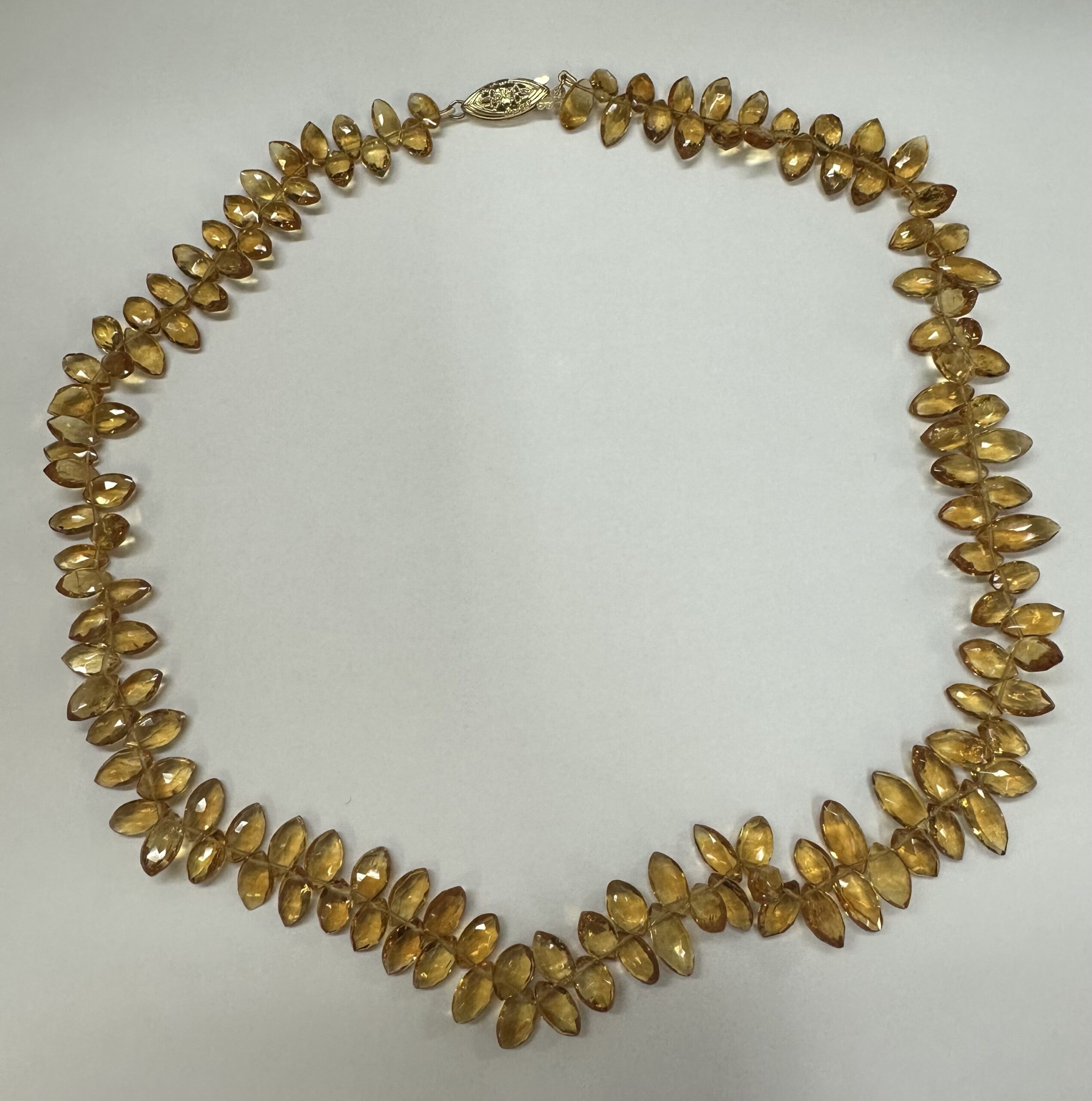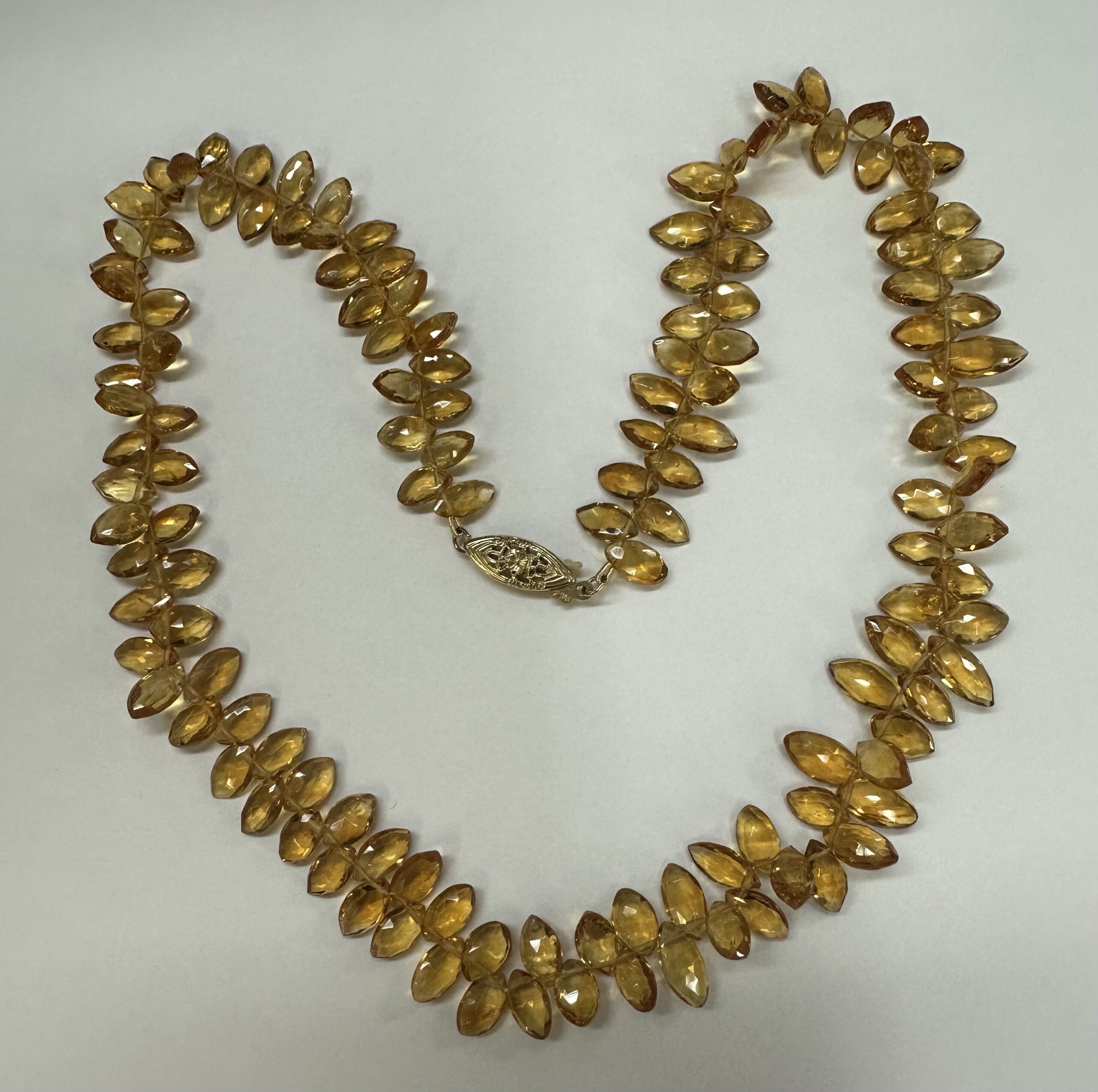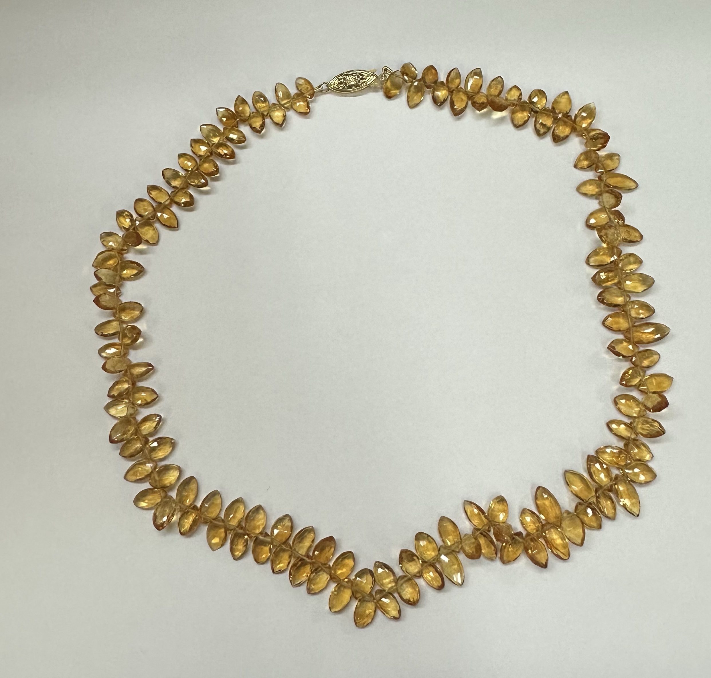 Vintage genuine marquise shaped, faceted Citrine (November birthstone) bead 16” strand terminated by a 14k yellow gold filigree clasp. Only one available.