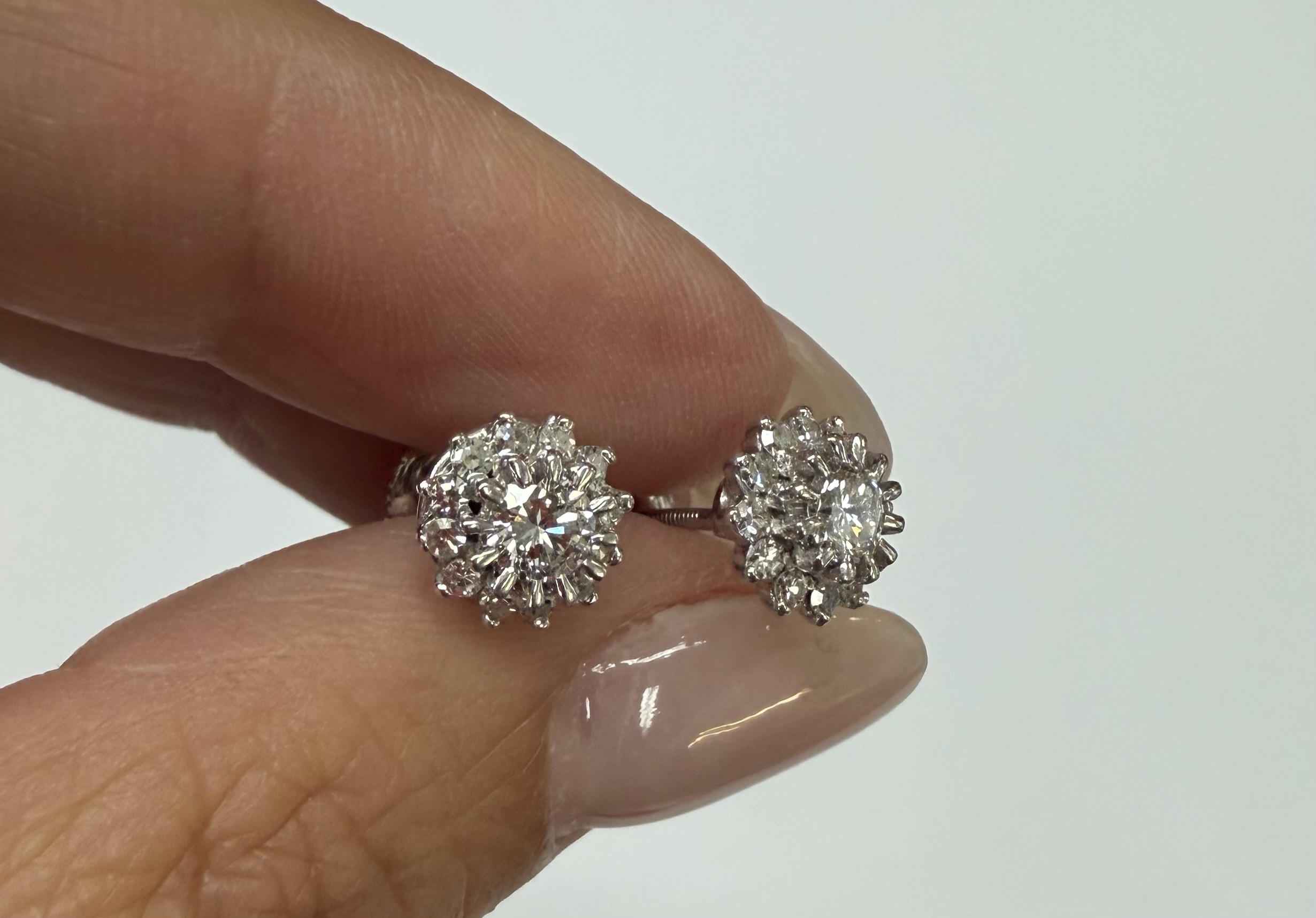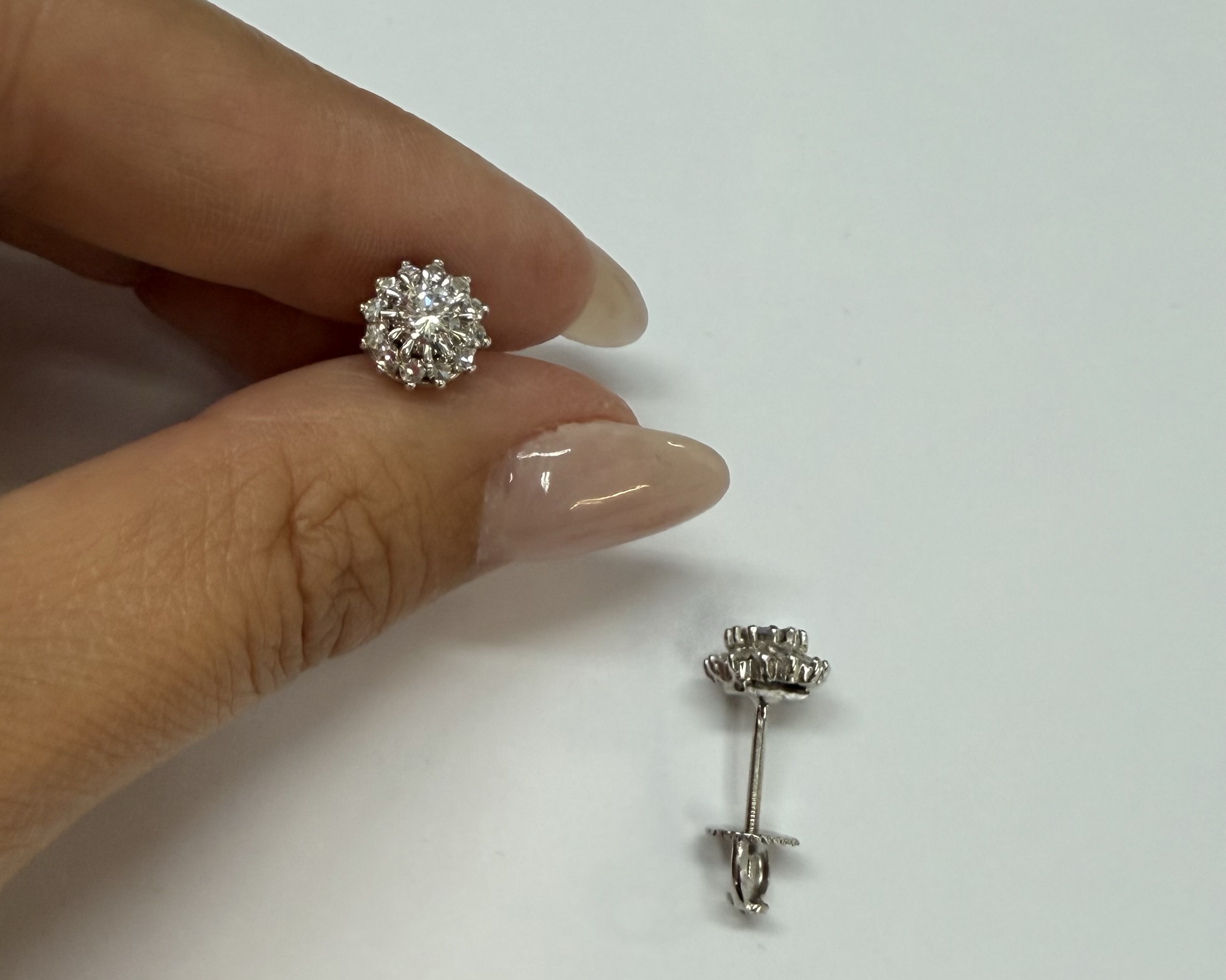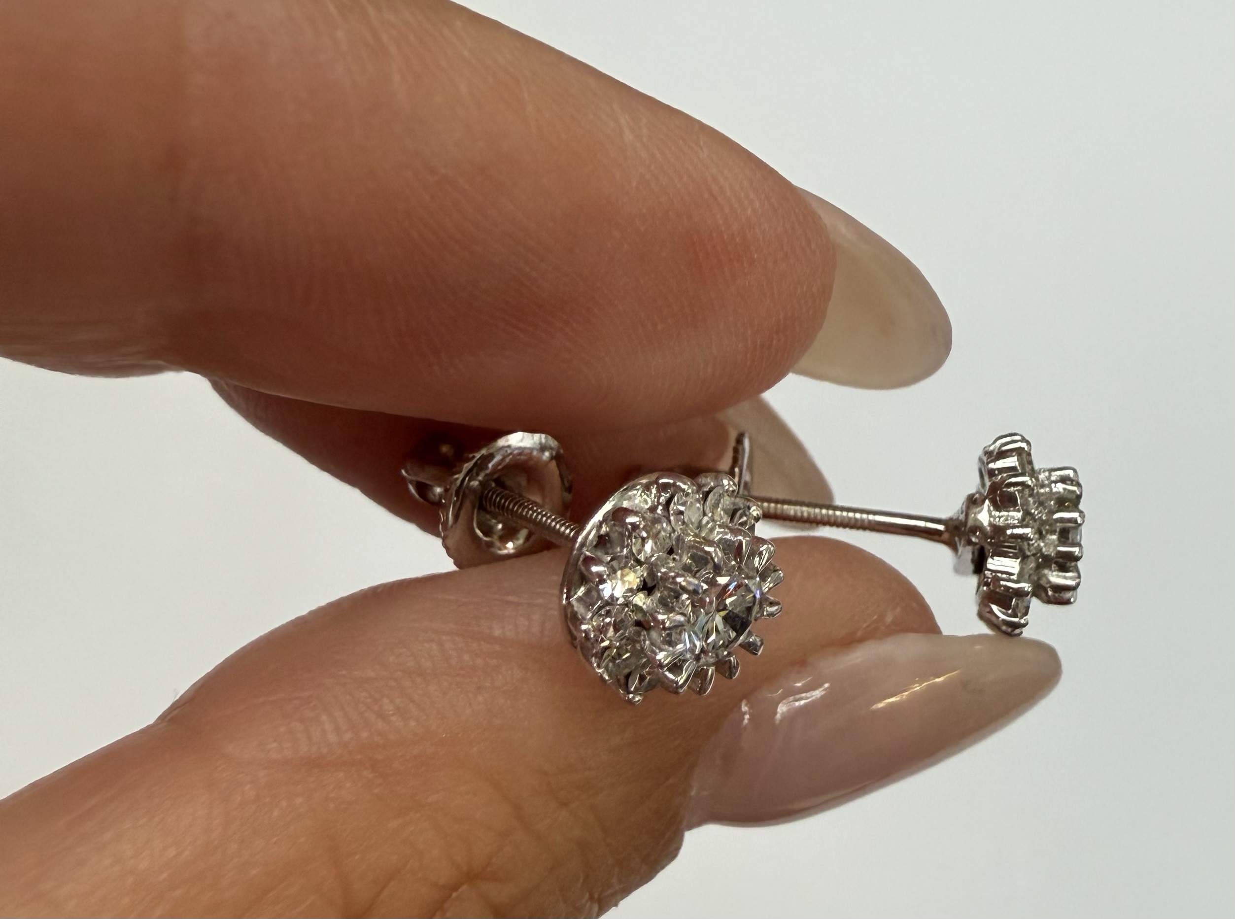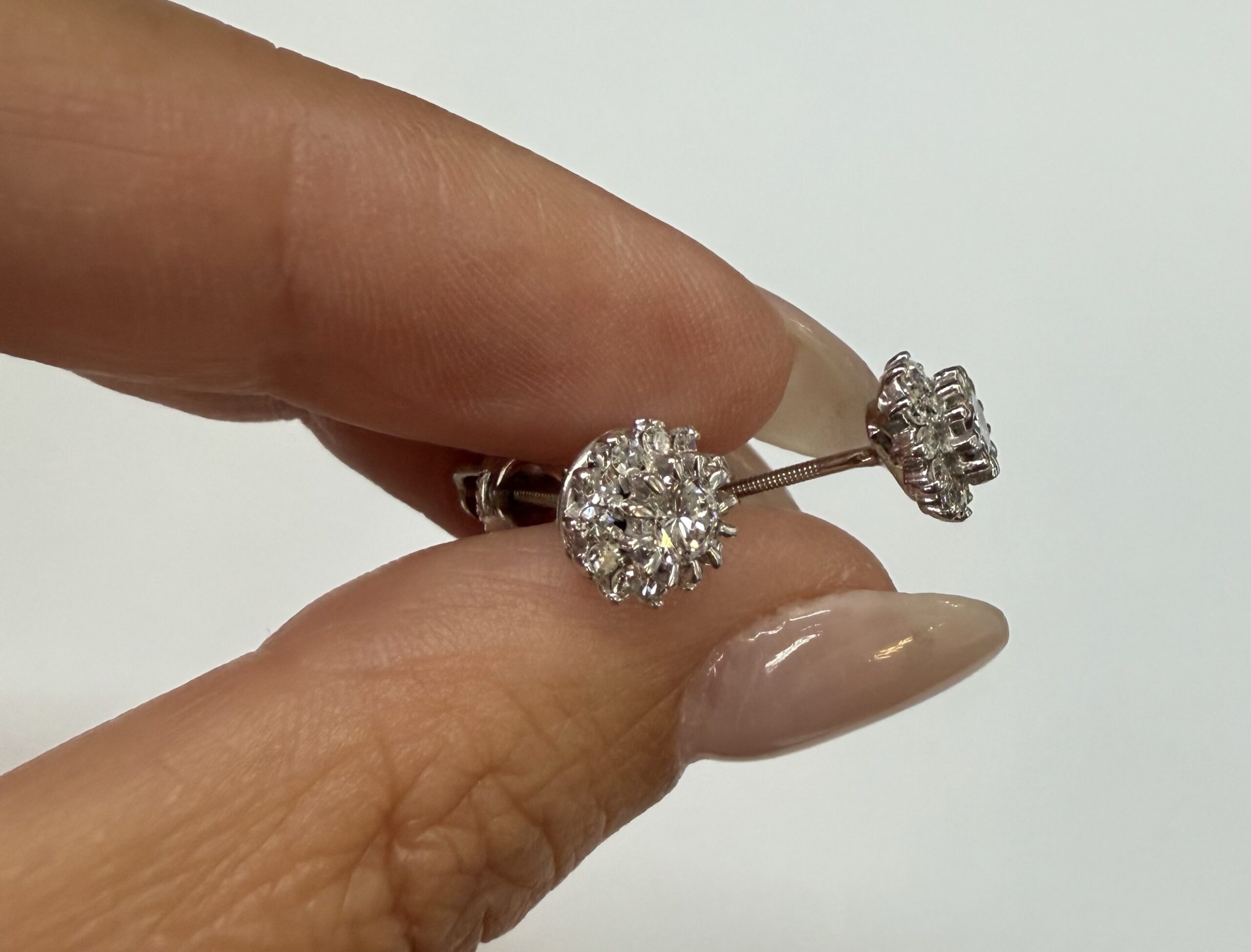 Vintage one-of-a-kind 18k white gold genuine 3/4 cttw Round Brilliant Cut diamond cluster style screw back stud earrings. The diamonds average