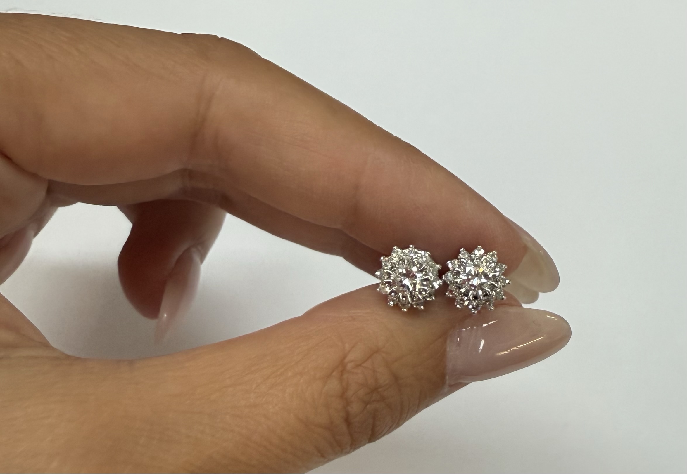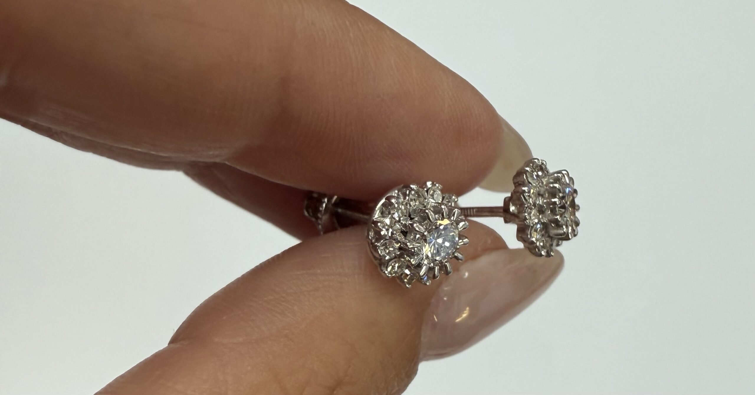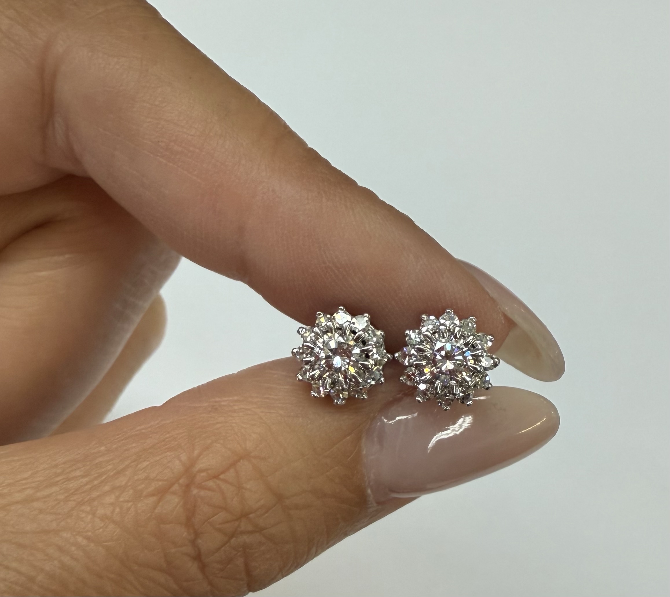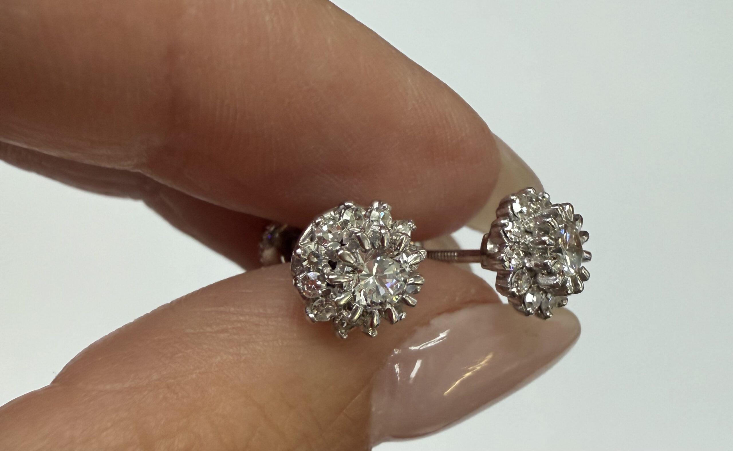 Vintage one-of-a-kind 18k white gold genuine 3/4 cttw Round Brilliant Cut diamond cluster style screw back stud earrings. The diamonds average