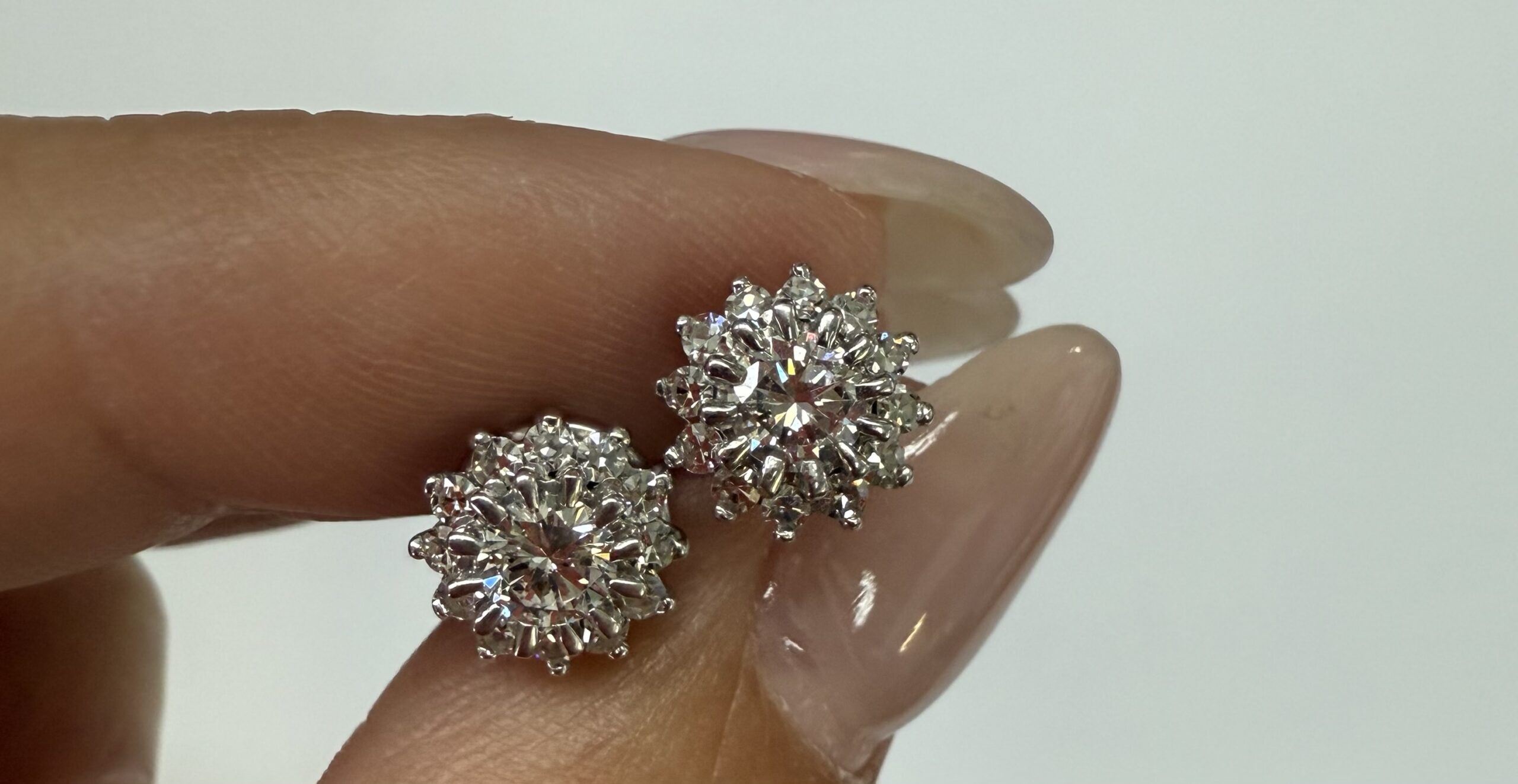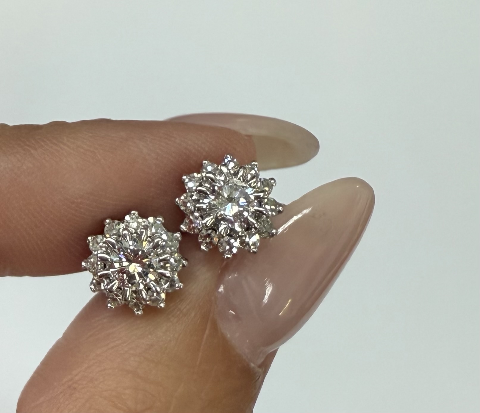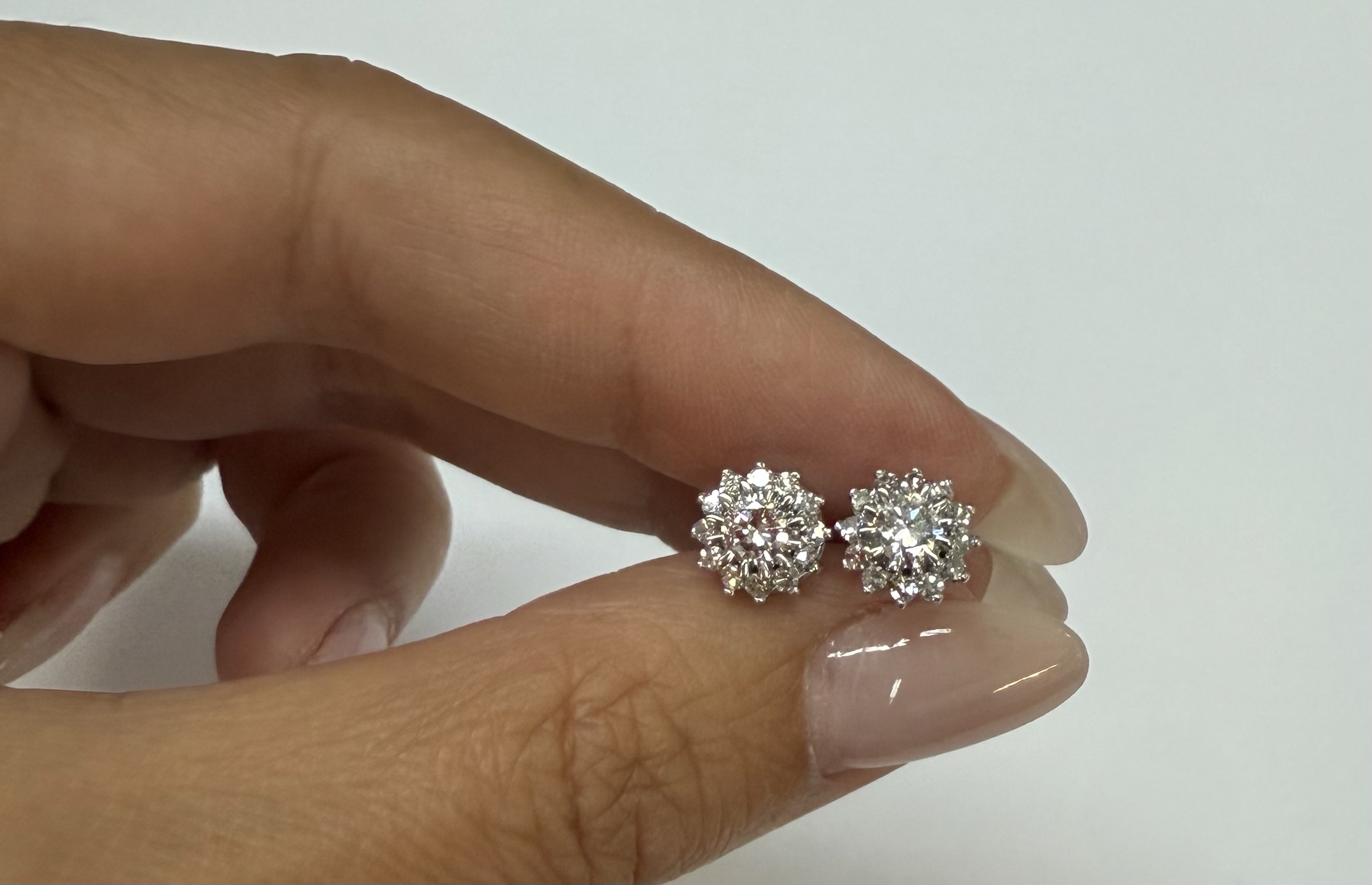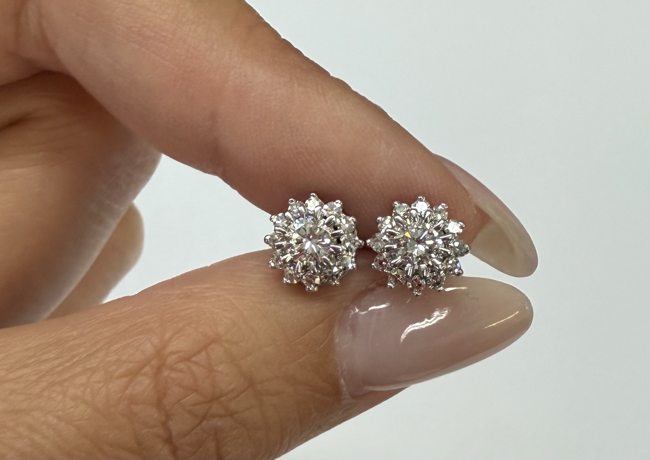 Vintage one-of-a-kind 18k white gold genuine 3/4 cttw Round Brilliant Cut diamond cluster style screw back stud earrings. The diamonds average